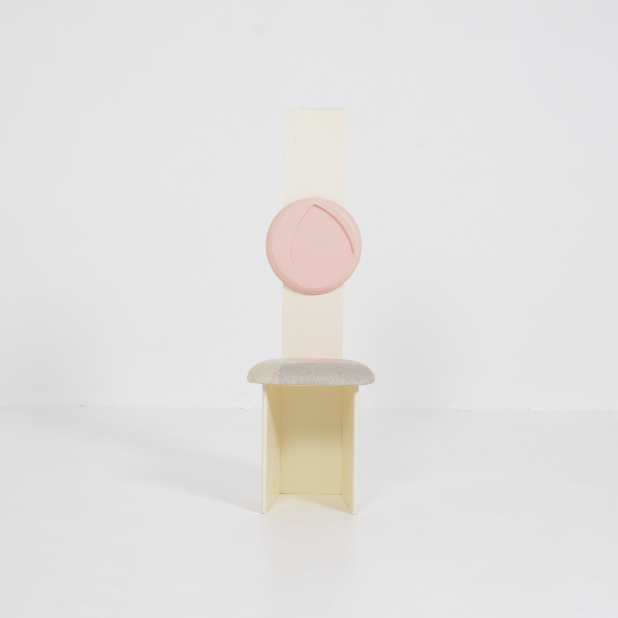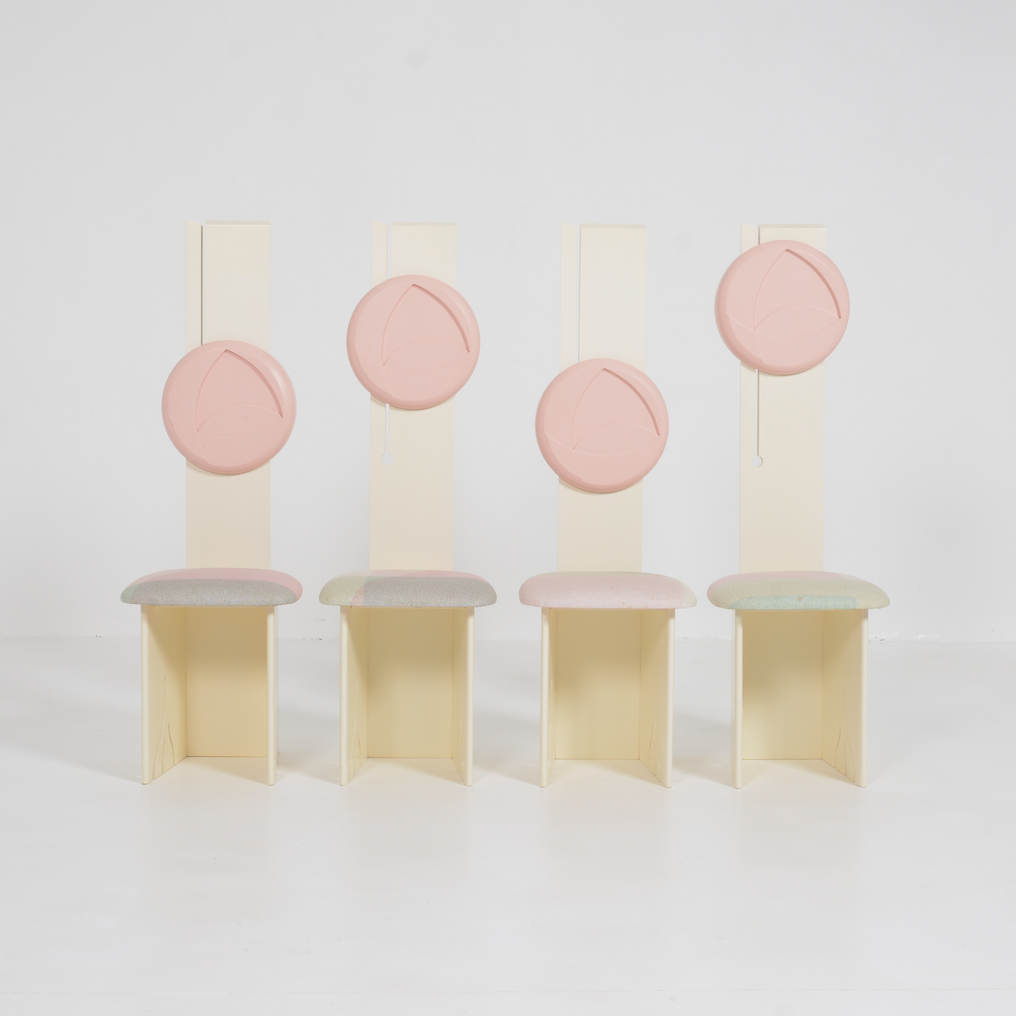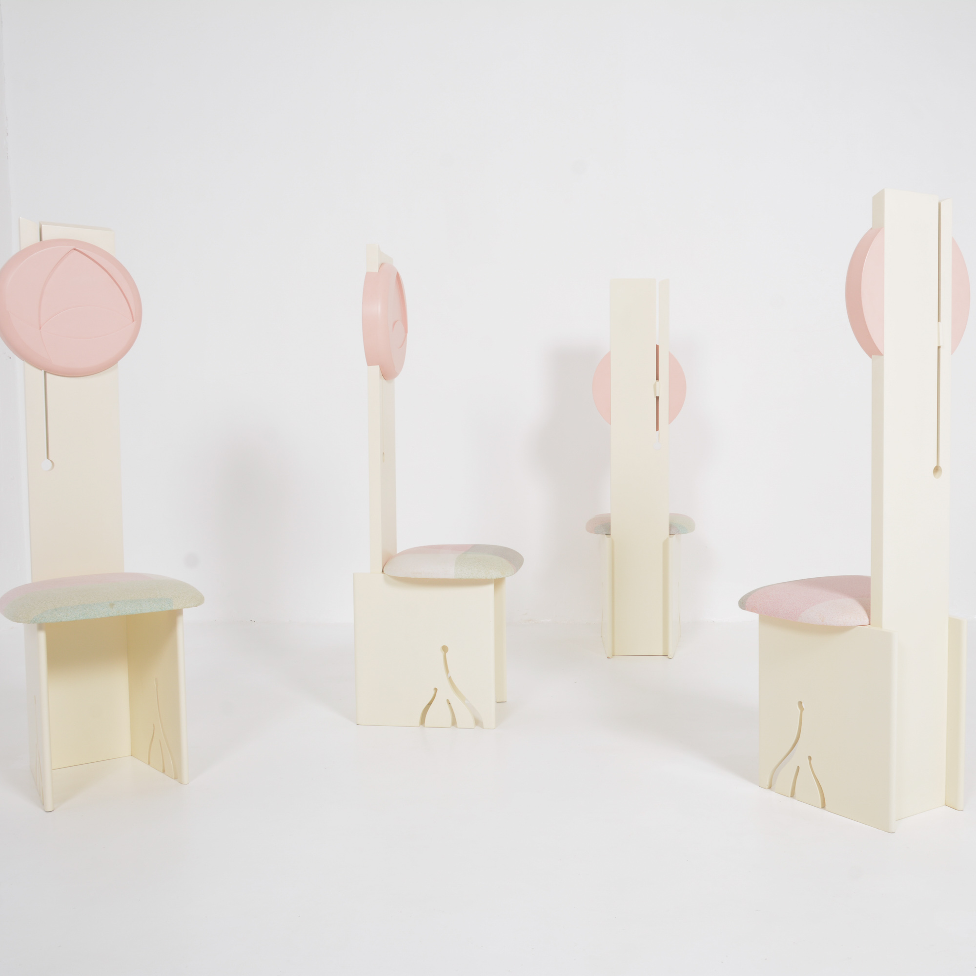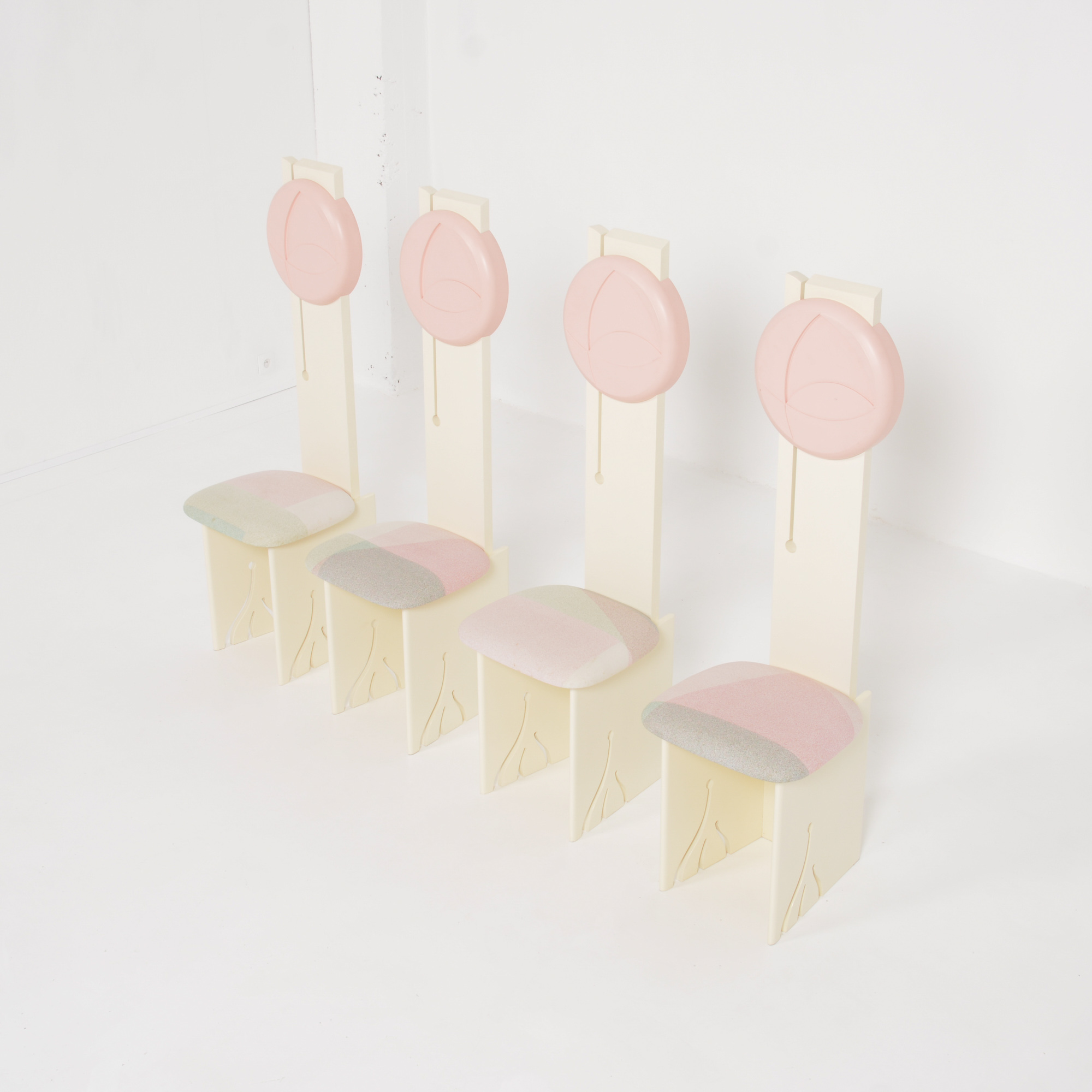 These amazing chairs are obviously inspired by the elegant furniture of Charles Rennie Mackintosh. The rose makes it complete. The abstracted rose on the backrest can be moved up and down. The chairs are in very good condition, the postmodern seat covers have some stains visible on the pictures. The chairs are made of lacquered wood and are very heavy.