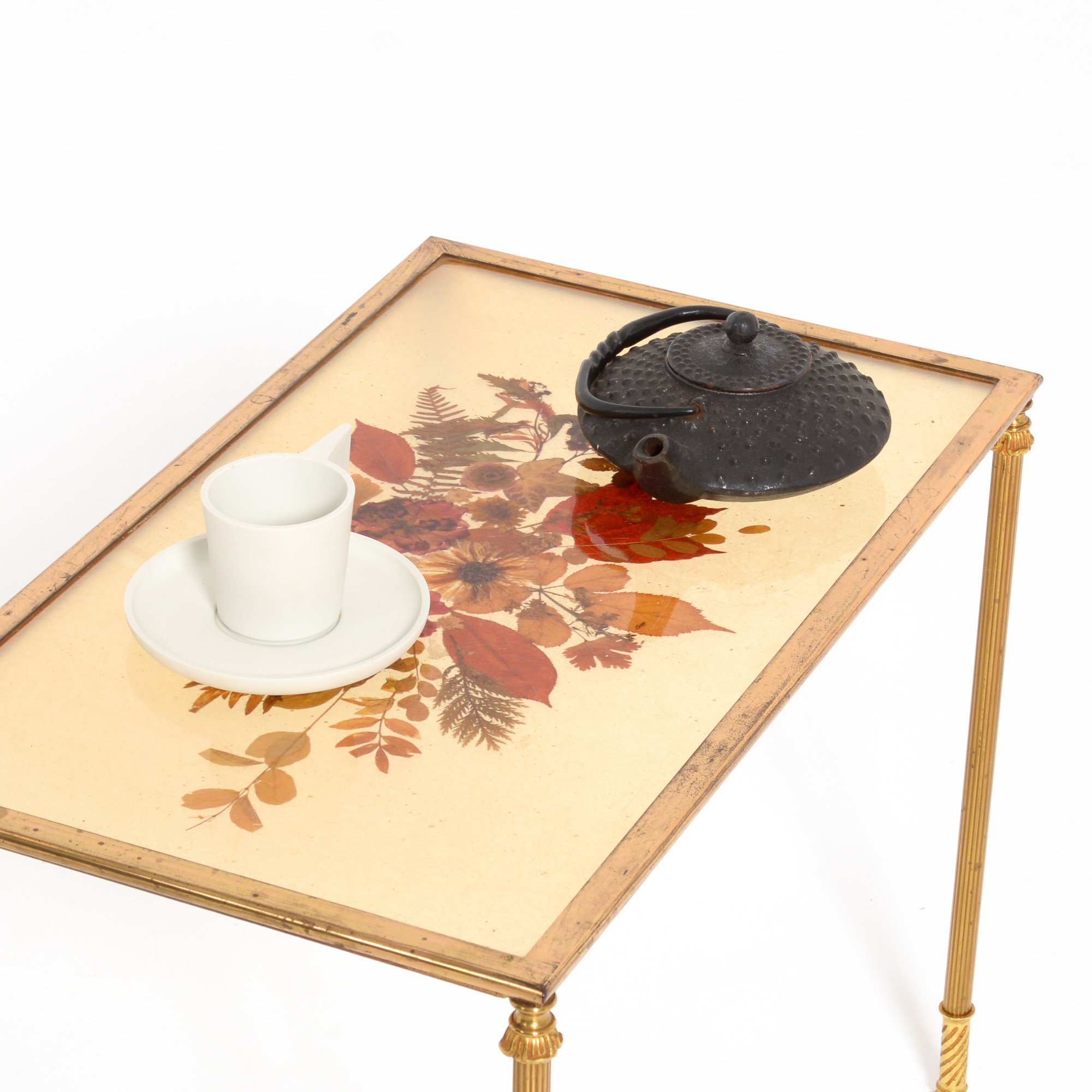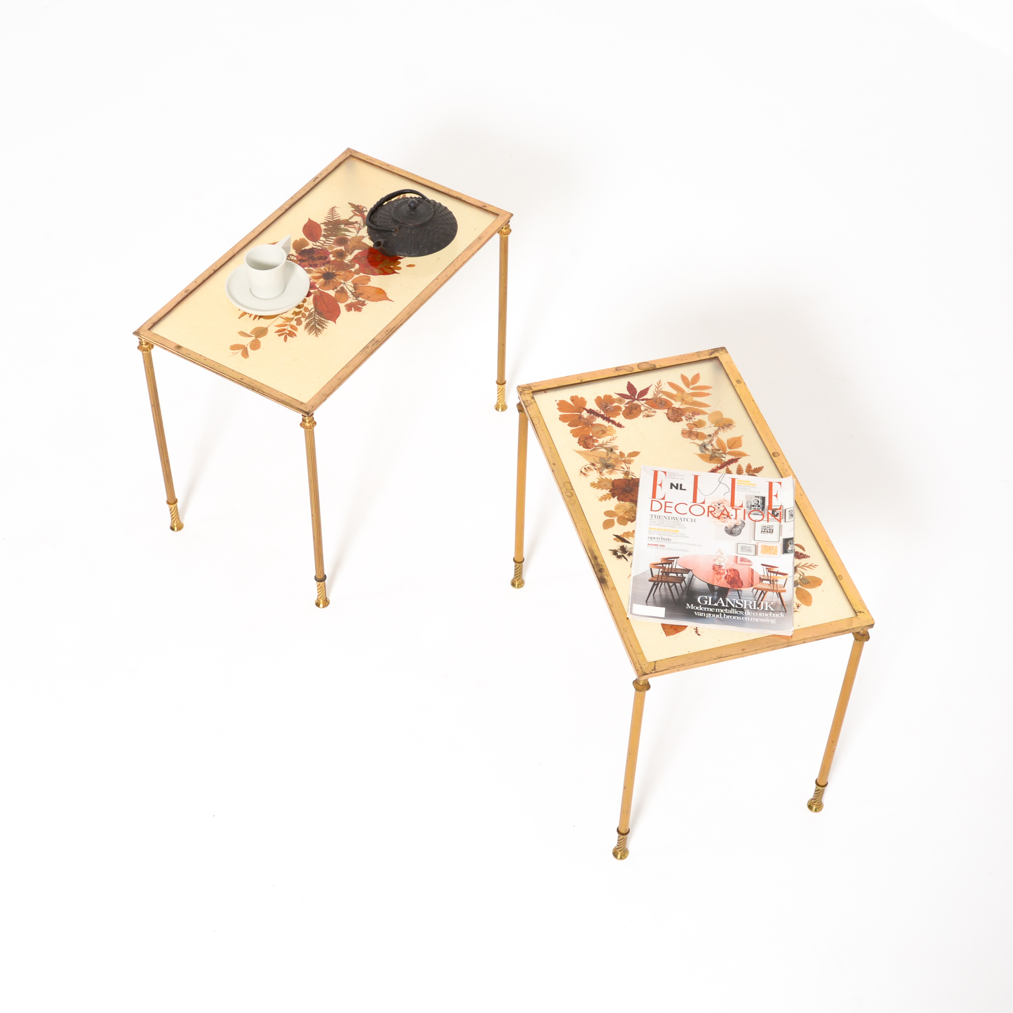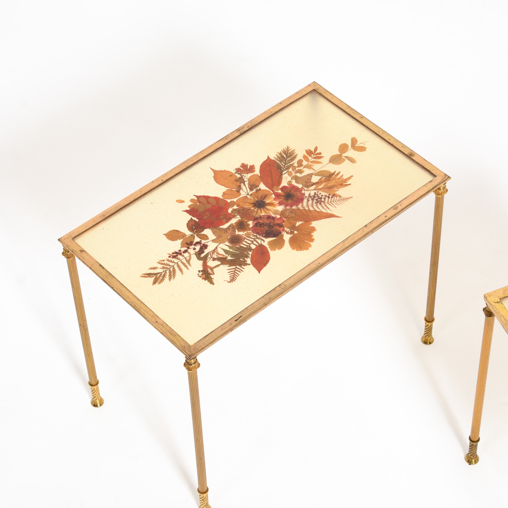 This decorative set of brass coffee tables can be dated in the 1960s. The resin table tops are filled with dried flowers in a creative pattern. The tables fit together but each top has a different design.