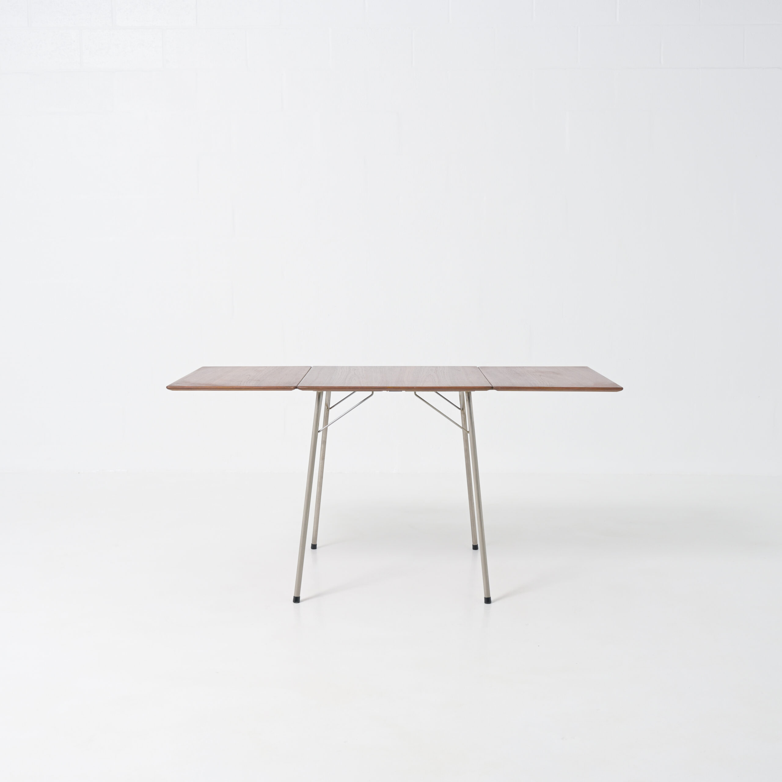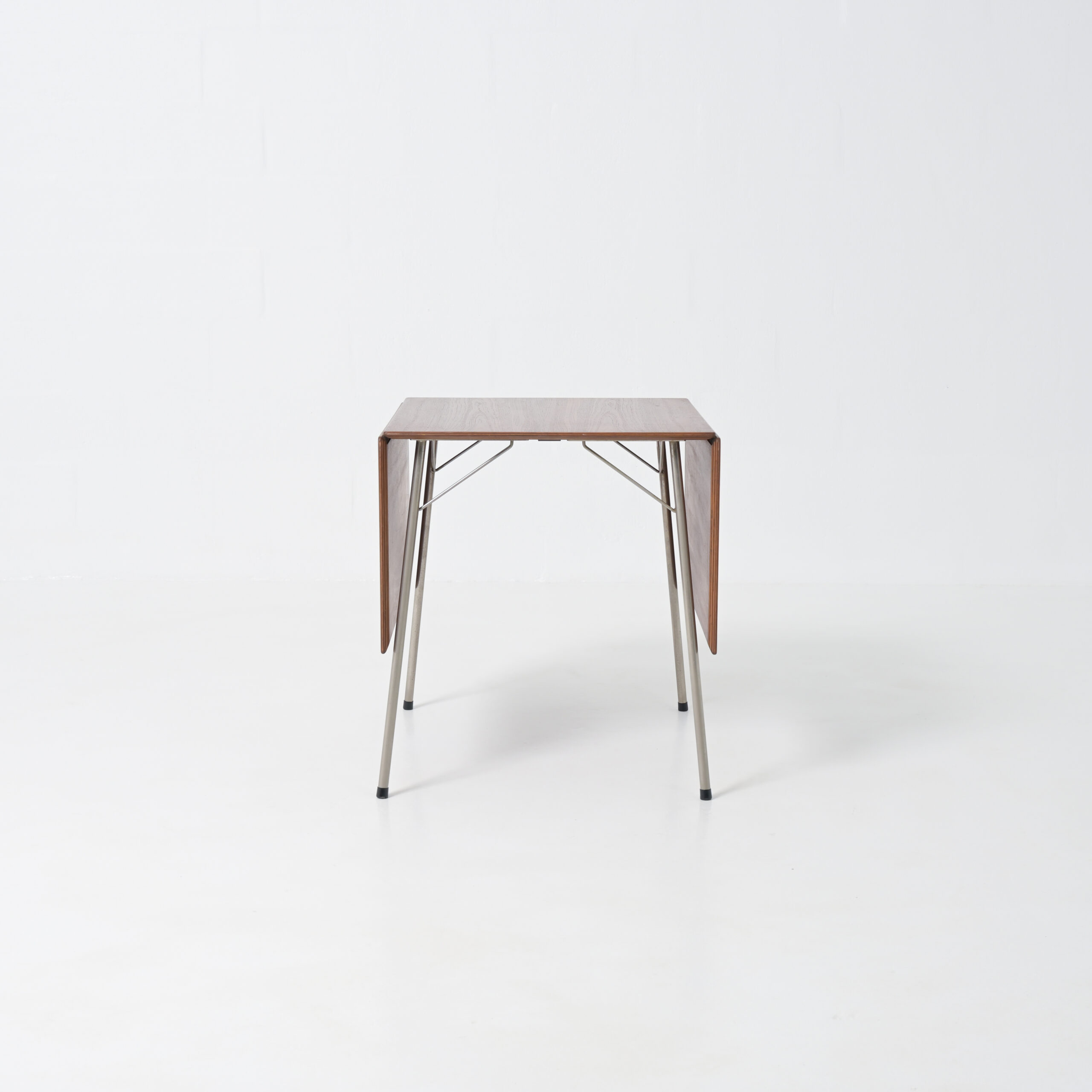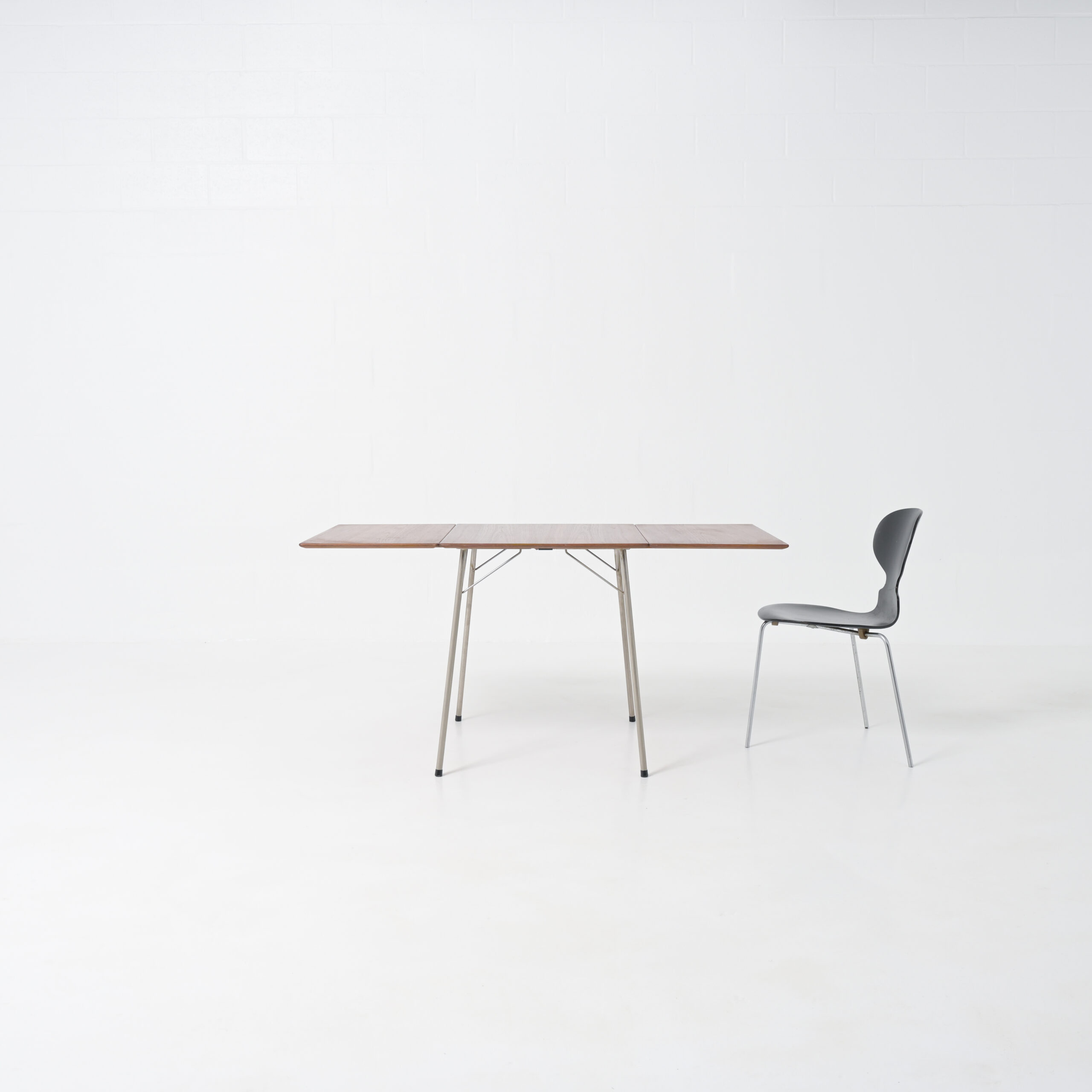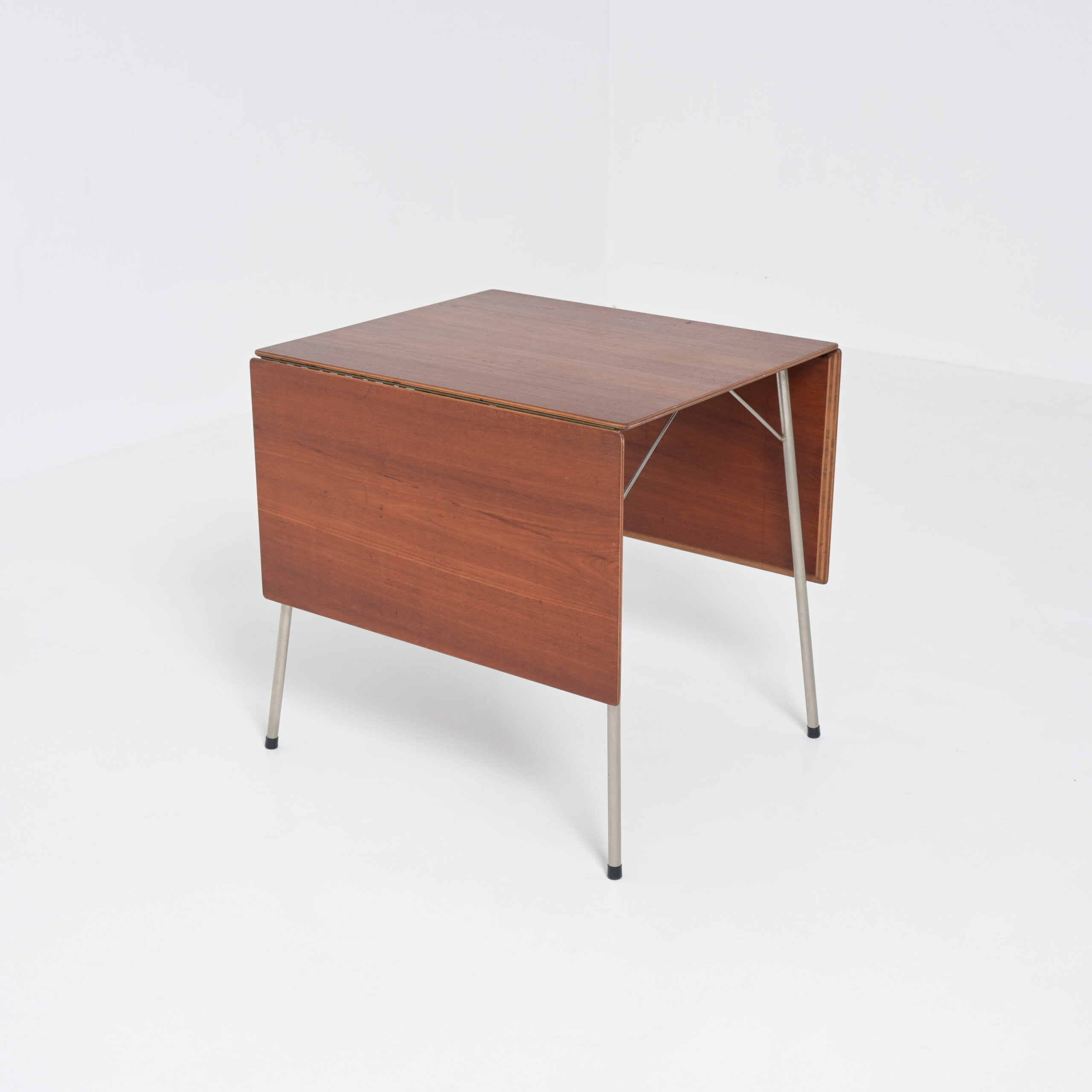 Nice small drop-leaf table model AJ3601 designed by Arne Jacobsen for Fritz Hansen, Denmark, 1952. Made to accompany his famous “ant” chairs also manufactured by Fritz Hansen in the early 1950s This table has a teak wooden foldable top and chrome-plated tubular metal legs. This rare table is very nice sized and easy to fold. When fully extended the table is 140 cm wide and 70 cm deep. With both leaves down it is 60 cm wide and 70 cm deep.