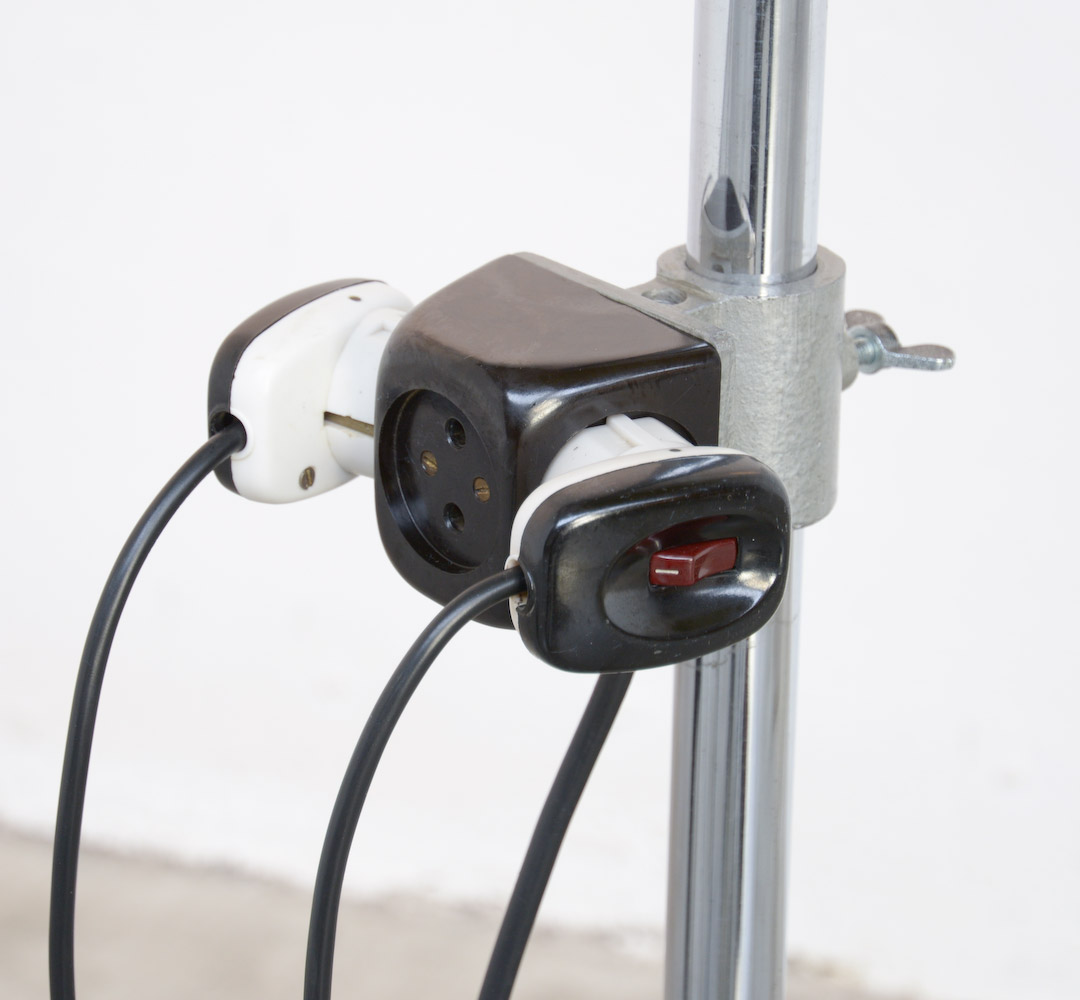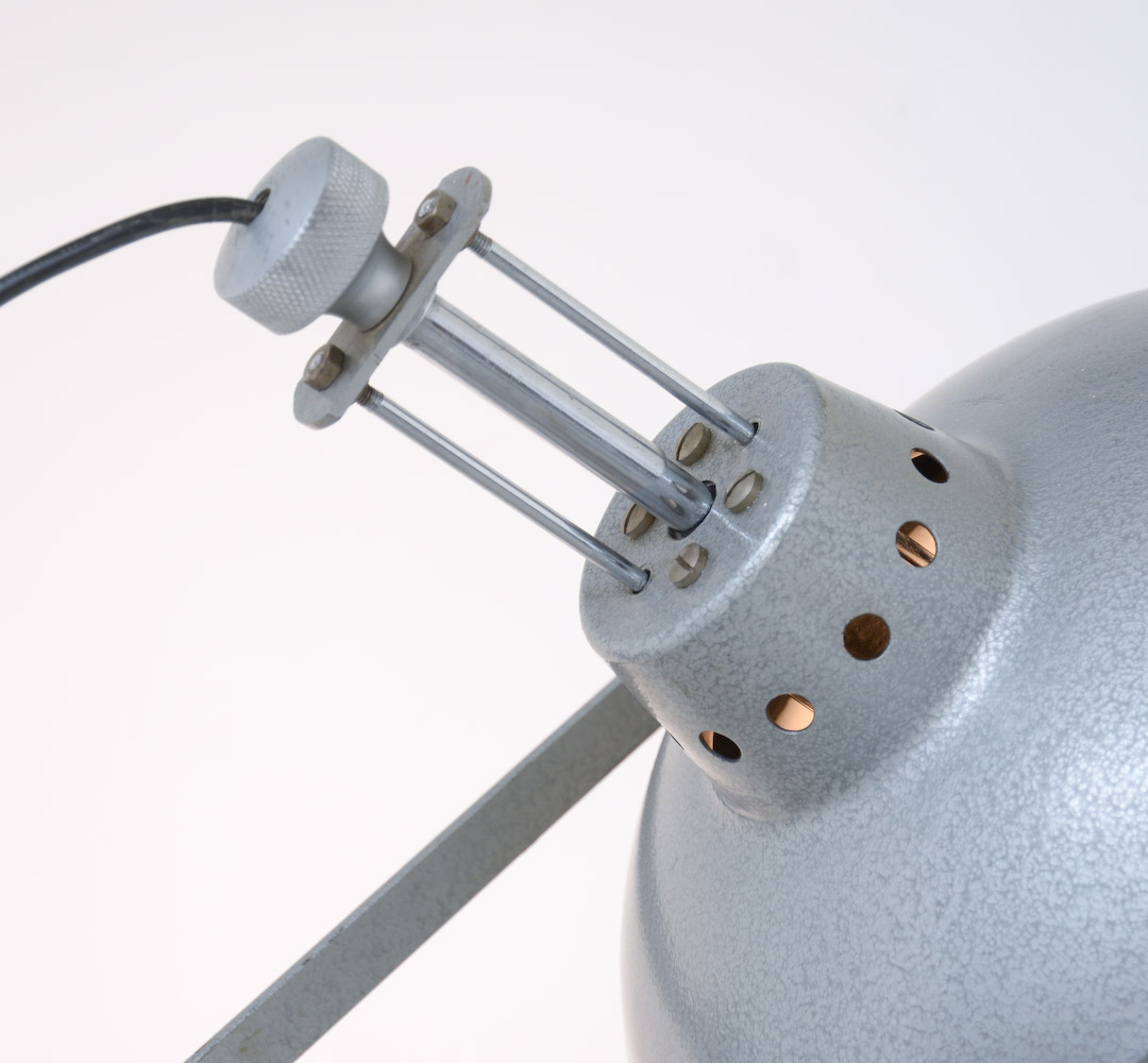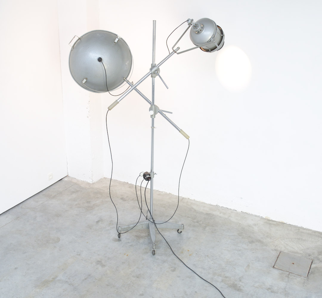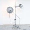 This impressive lamp is moveable on its 4 casters. The 2 lamps are turnable in the direction you prefer. There’s an extra bakelite socket on the stem.