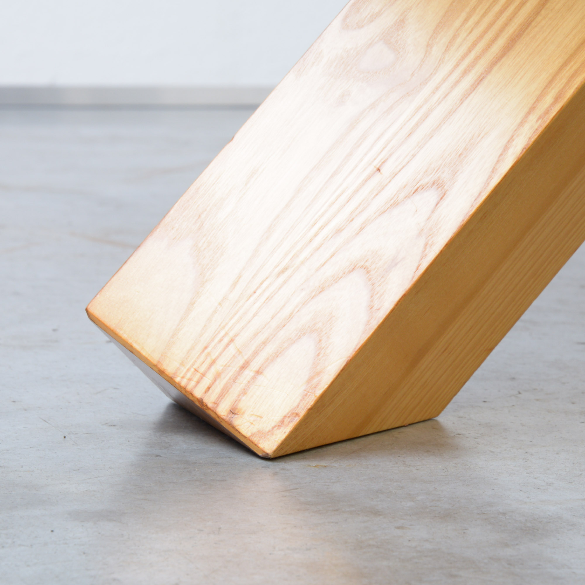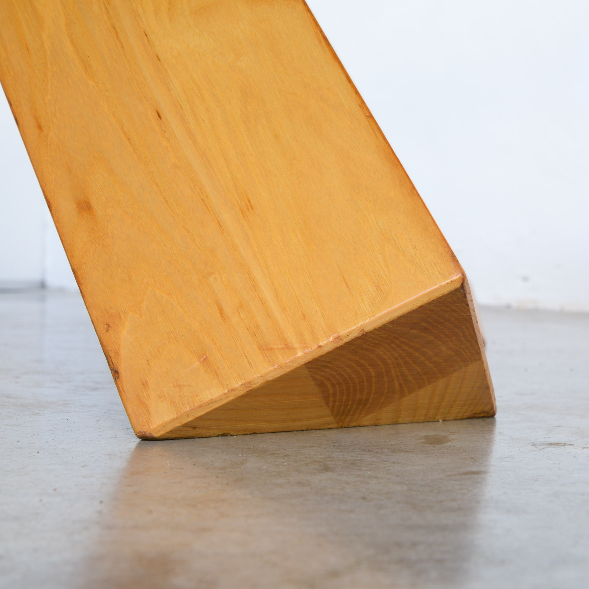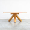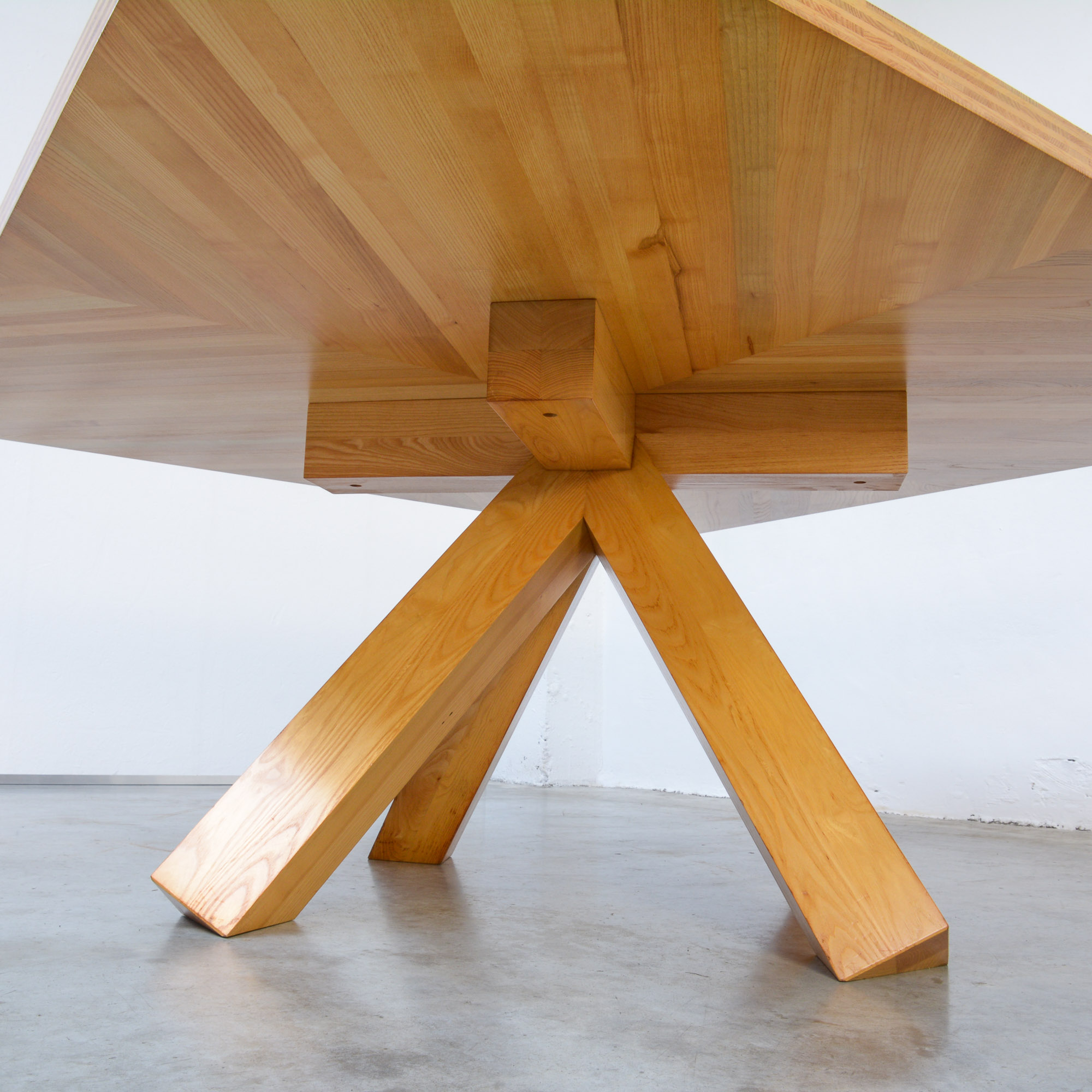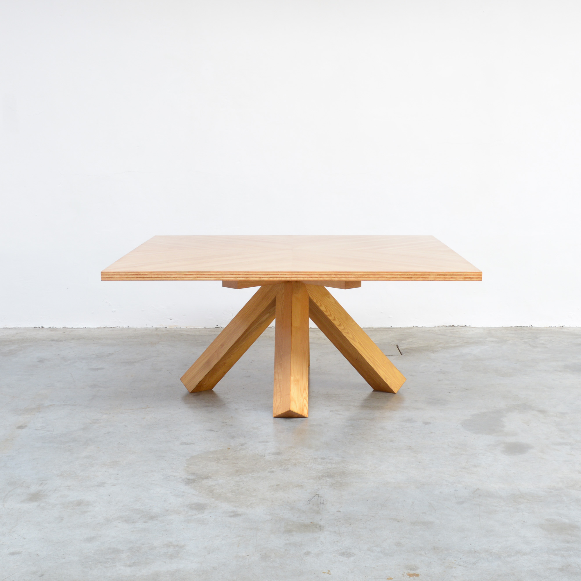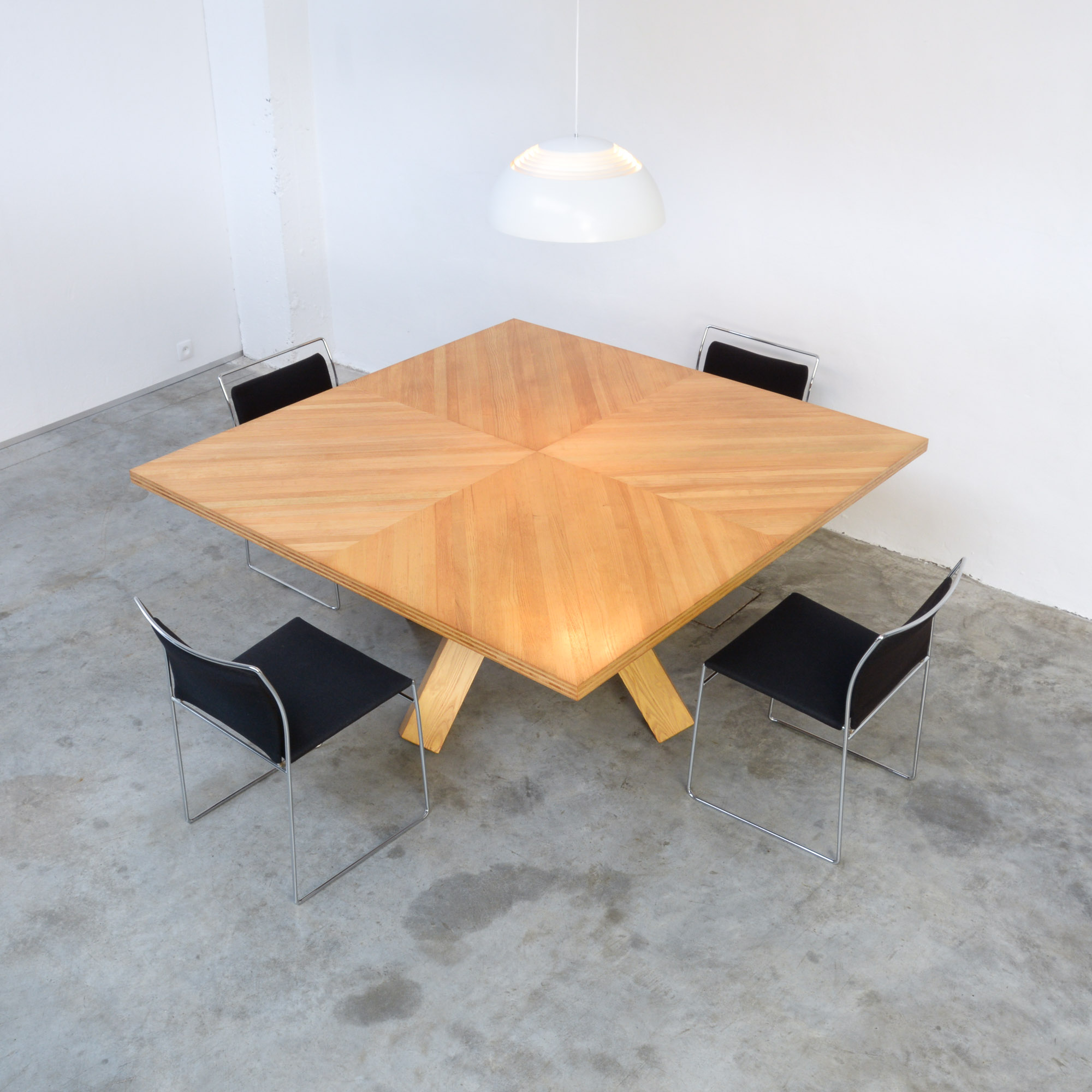 This impressive dining table La Corte was designed by Mario Bellini for Cassina in 1976. It features a sturdy fourpod base and a table top created with four square elements. The table is made of natural wood. It is an architectural piece of furniture that needs space, it can be seen as a residential monument.