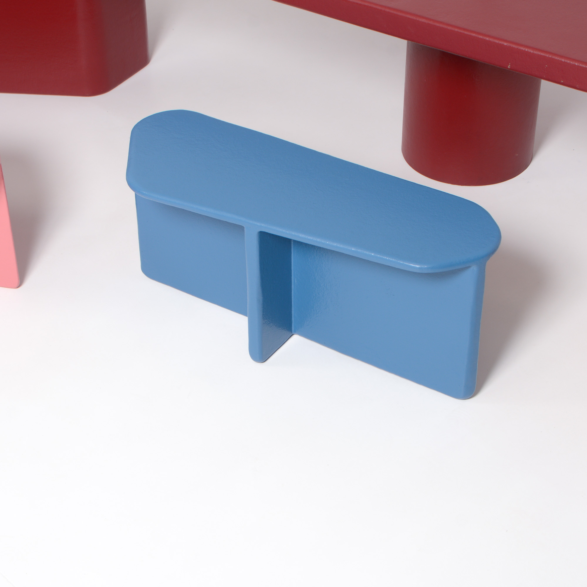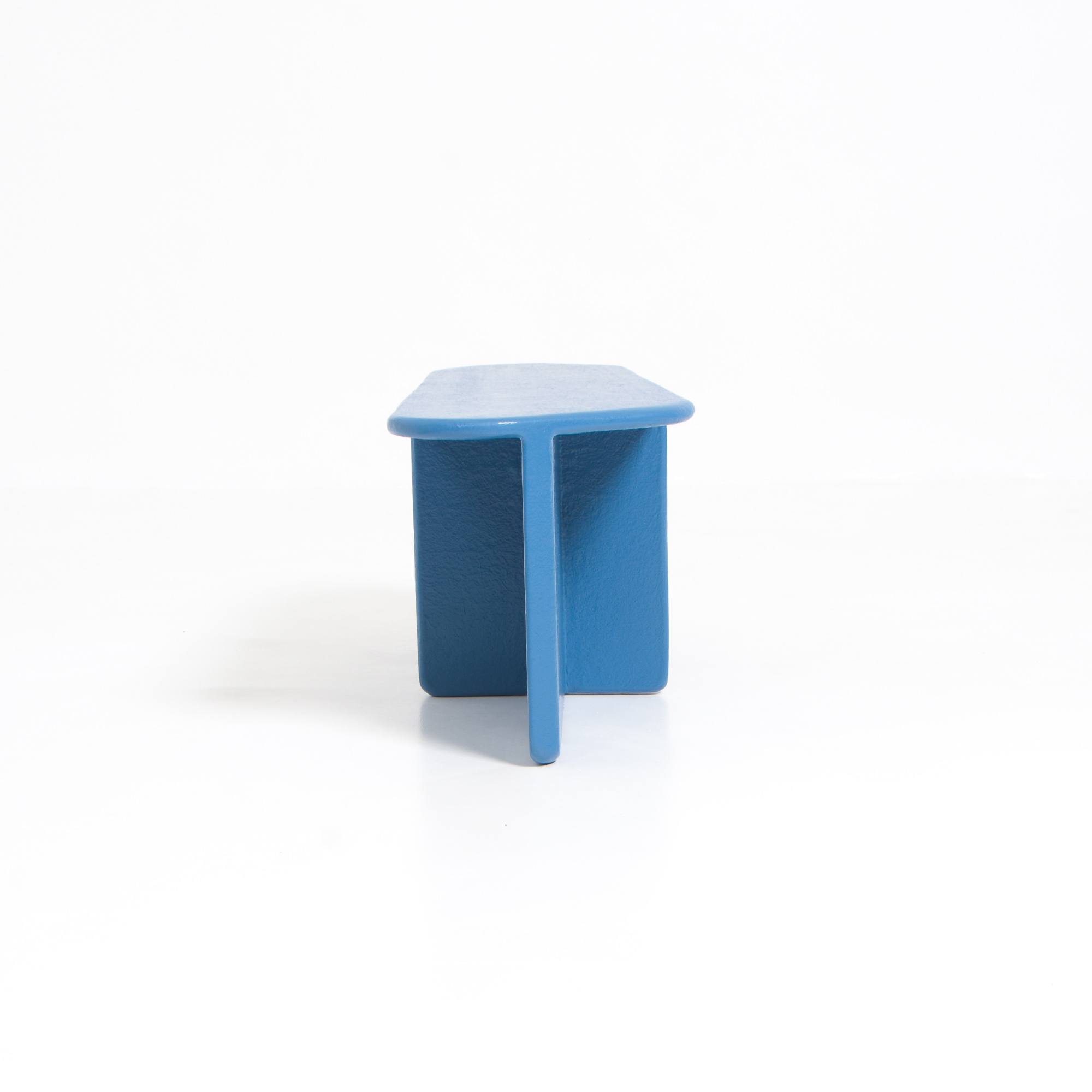 The bench is made of the leftovers of the poplar plywood sheets of the table and finished with polyester. In this way Fermetti wants to limit the loss of material that comes with the shape of the table.