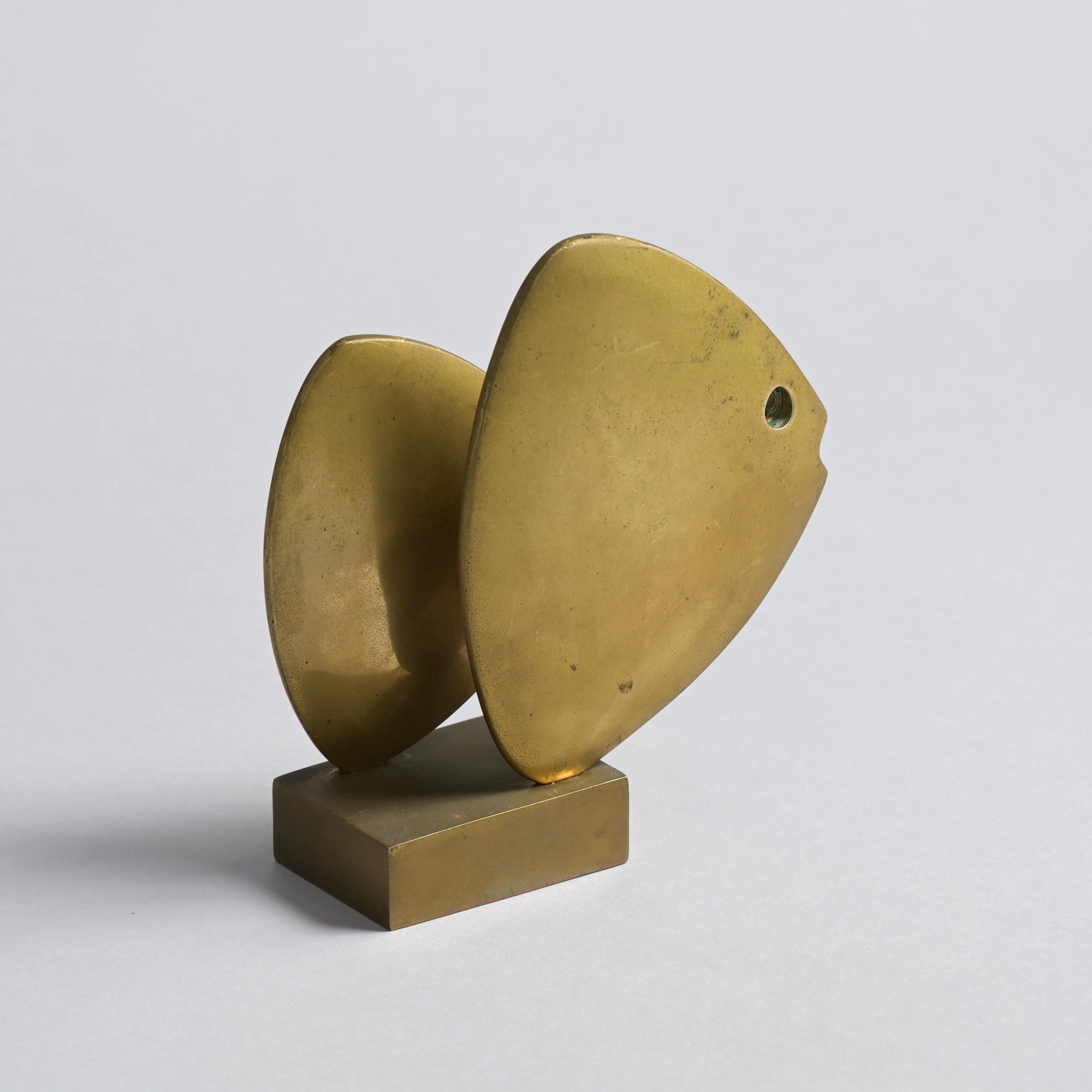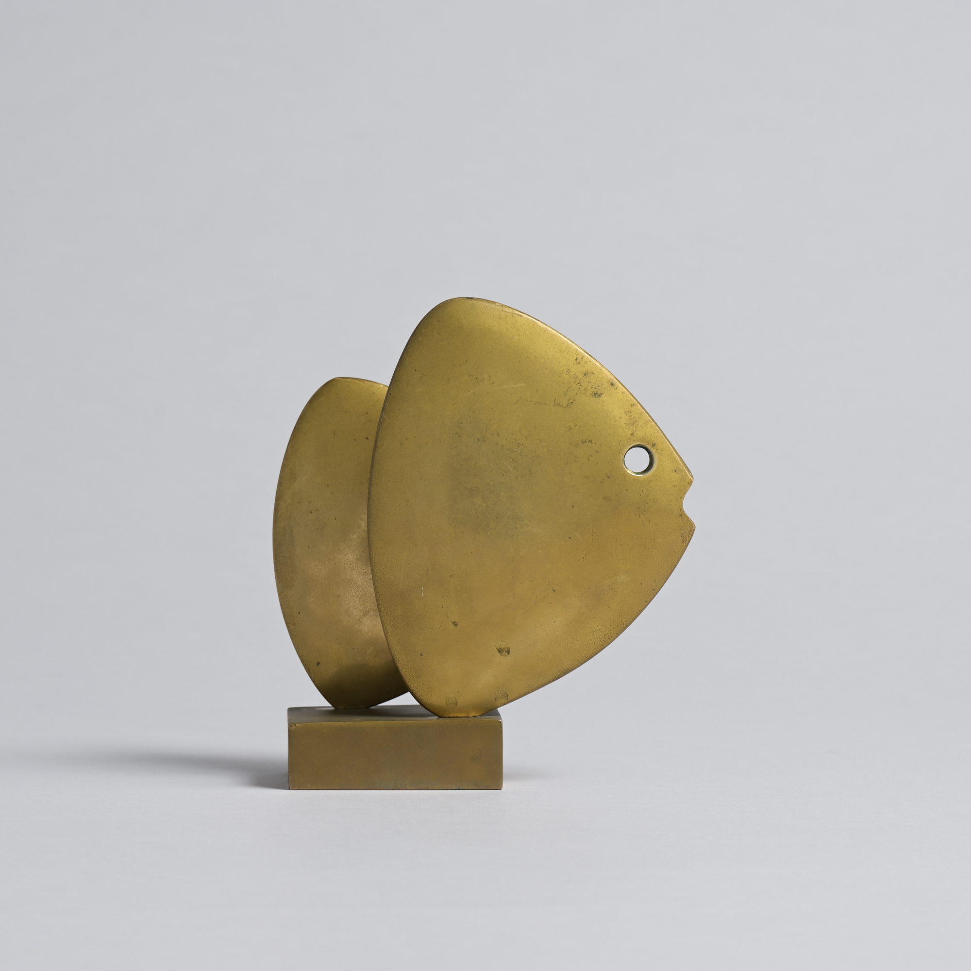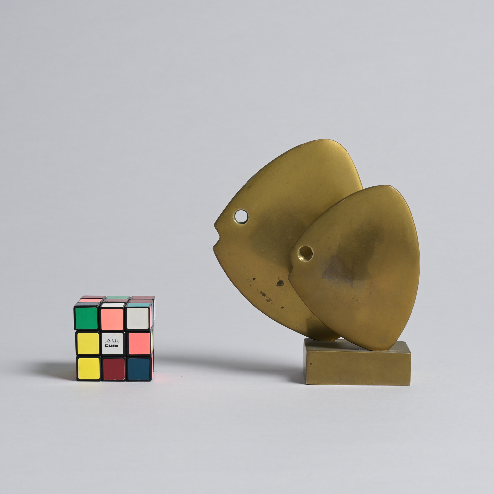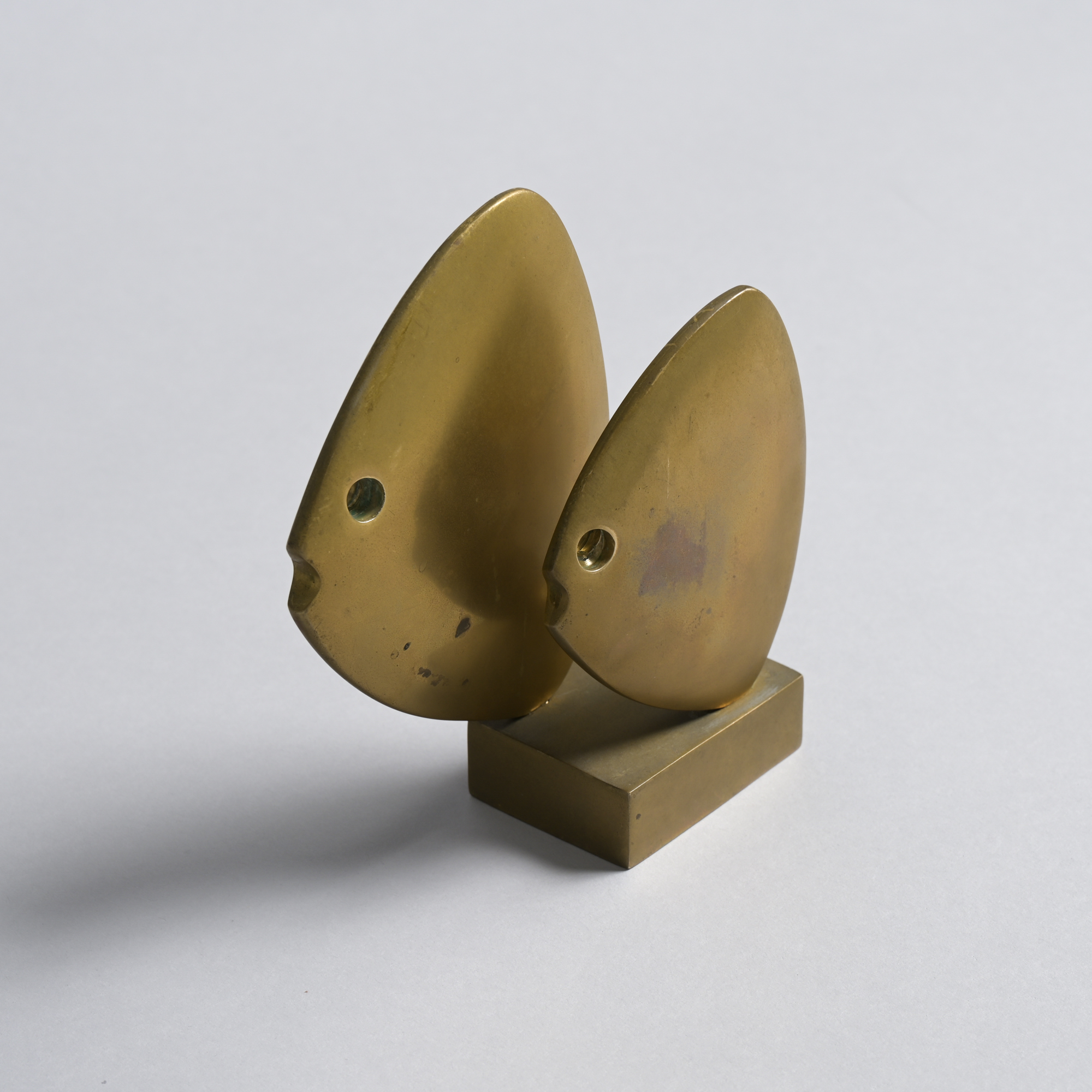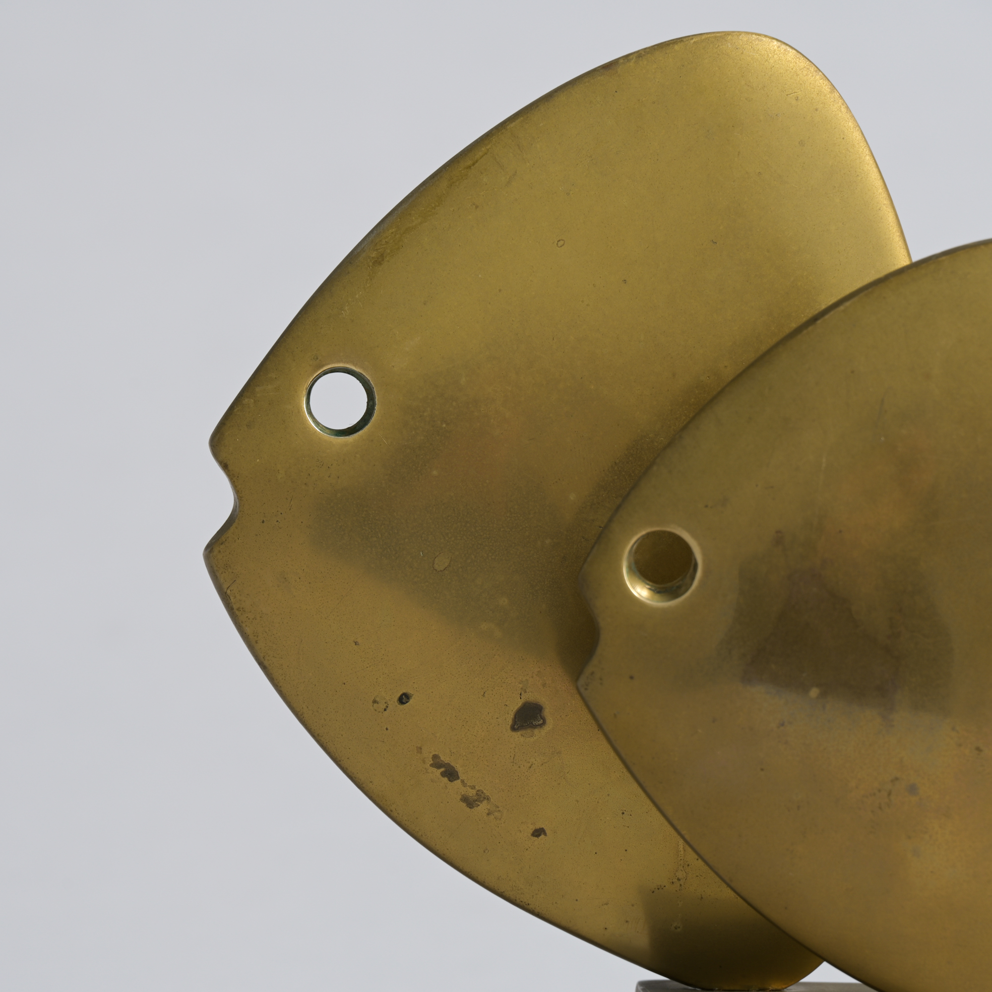 The sculpture features a minimalist depiction of two fish and is mounted on a brass base.