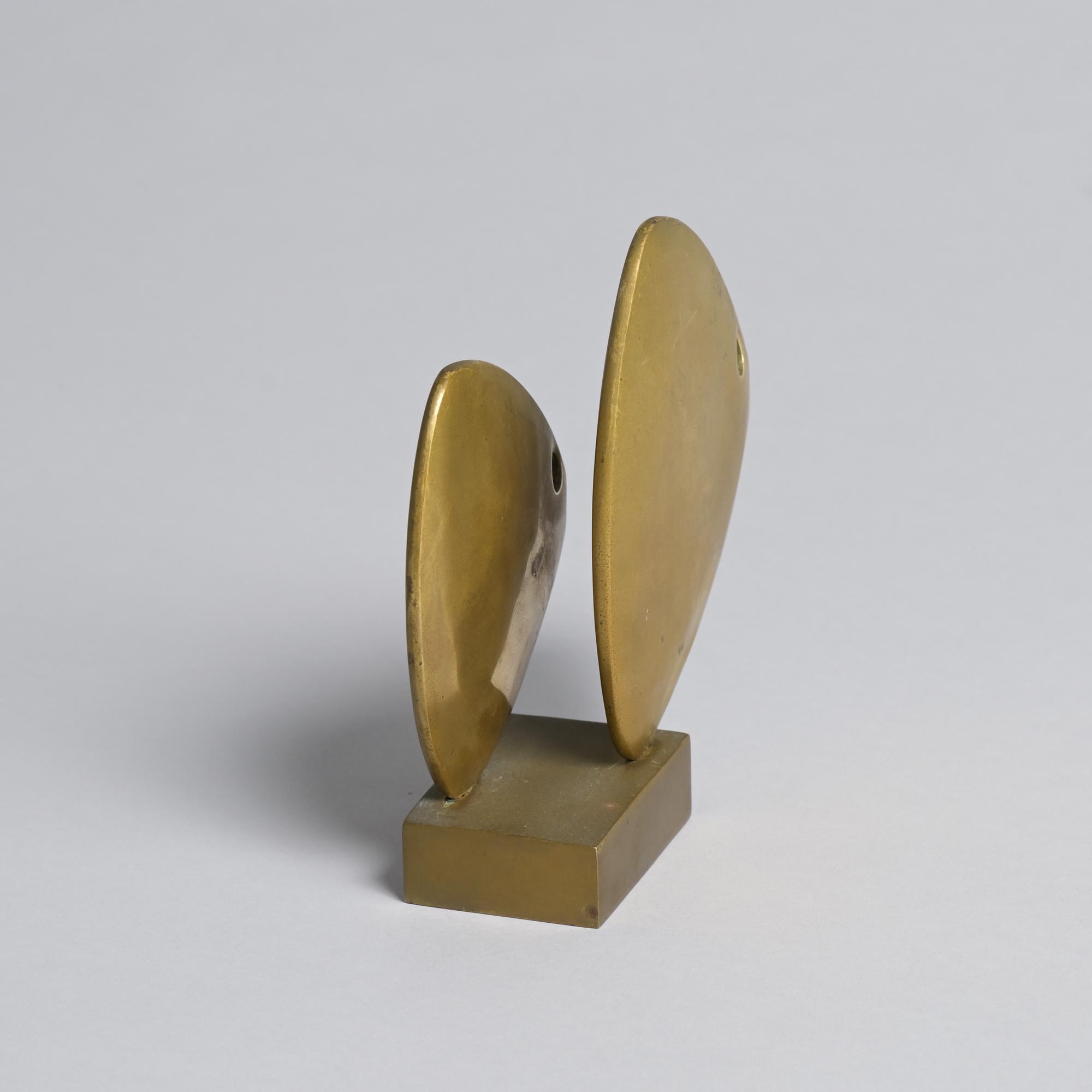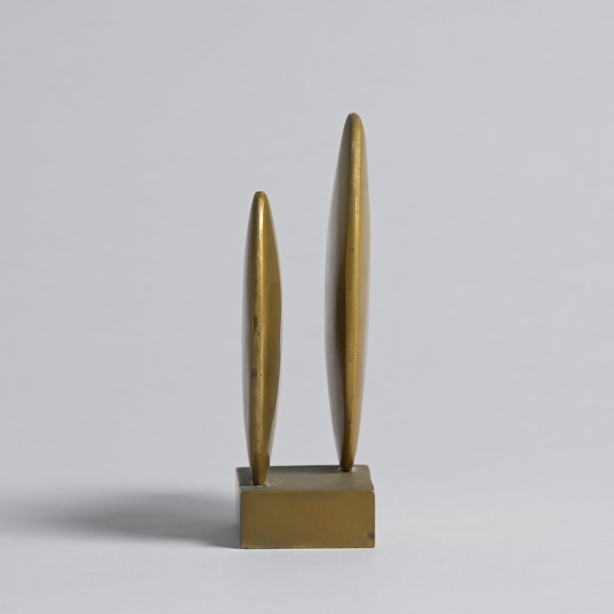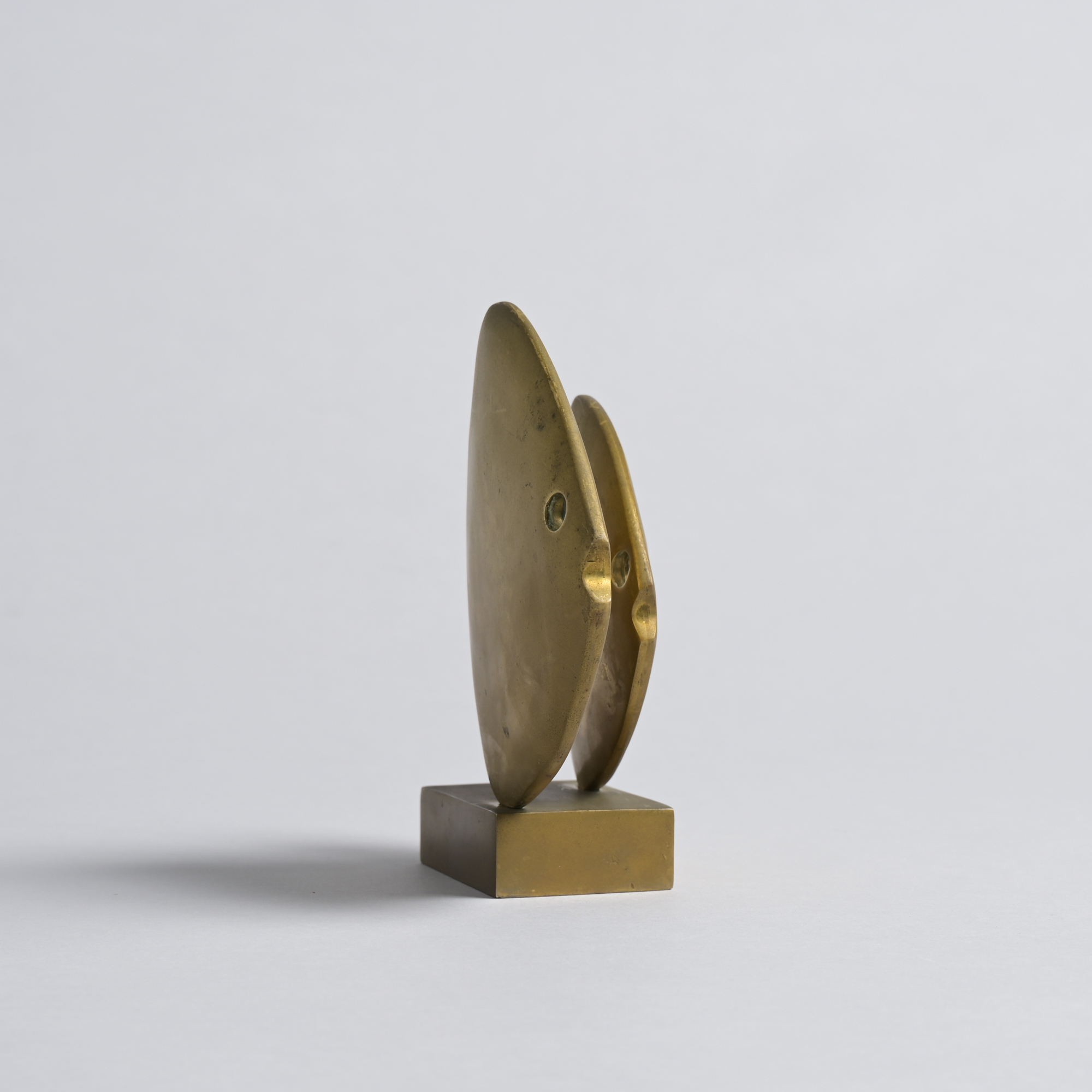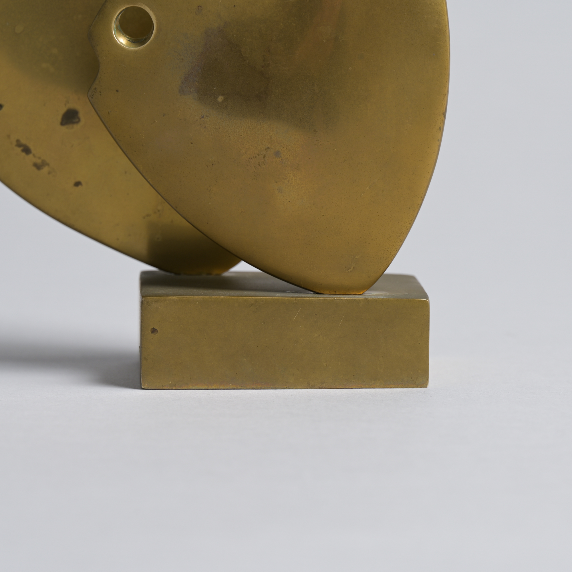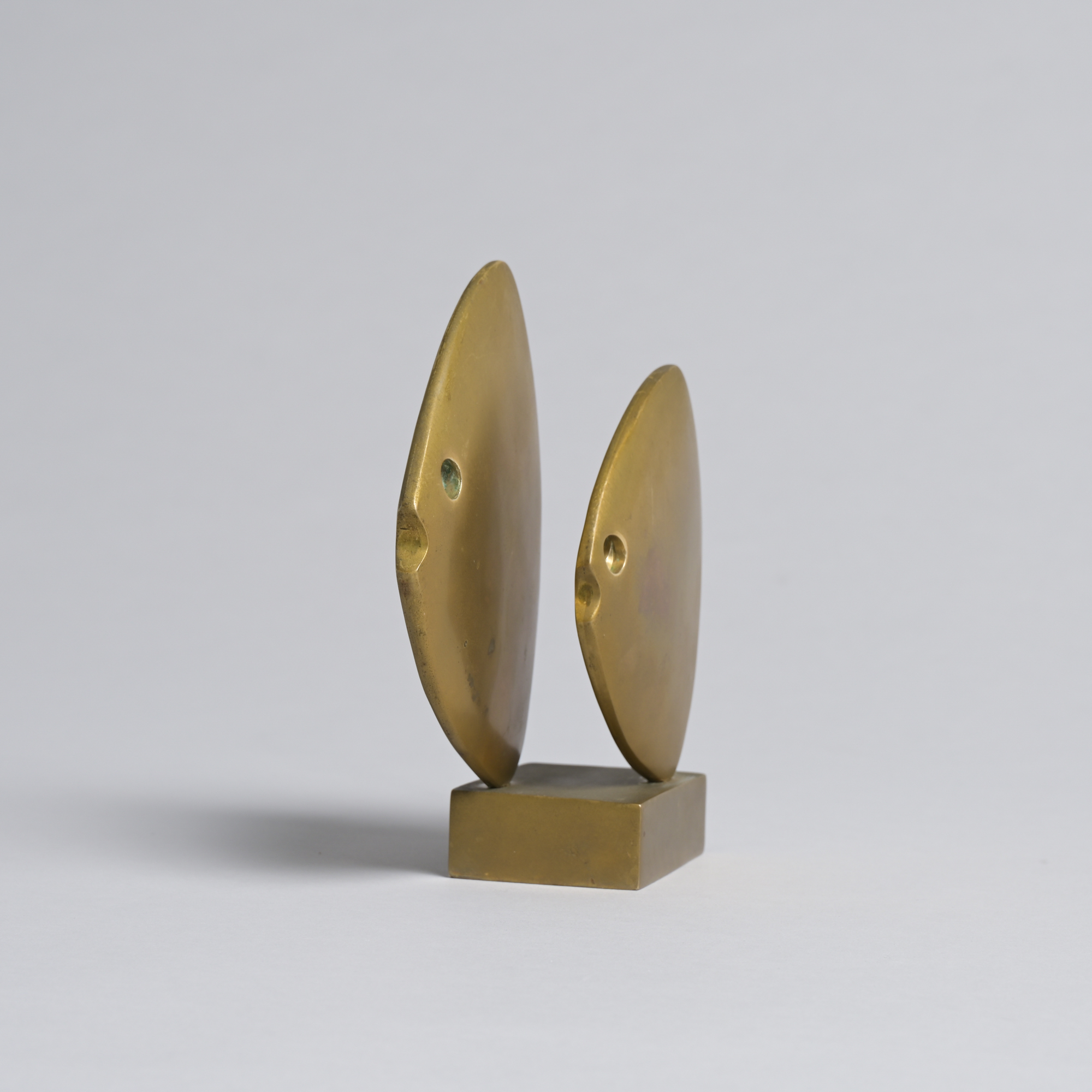 The sculpture features a minimalist depiction of two fish and is mounted on a brass base.