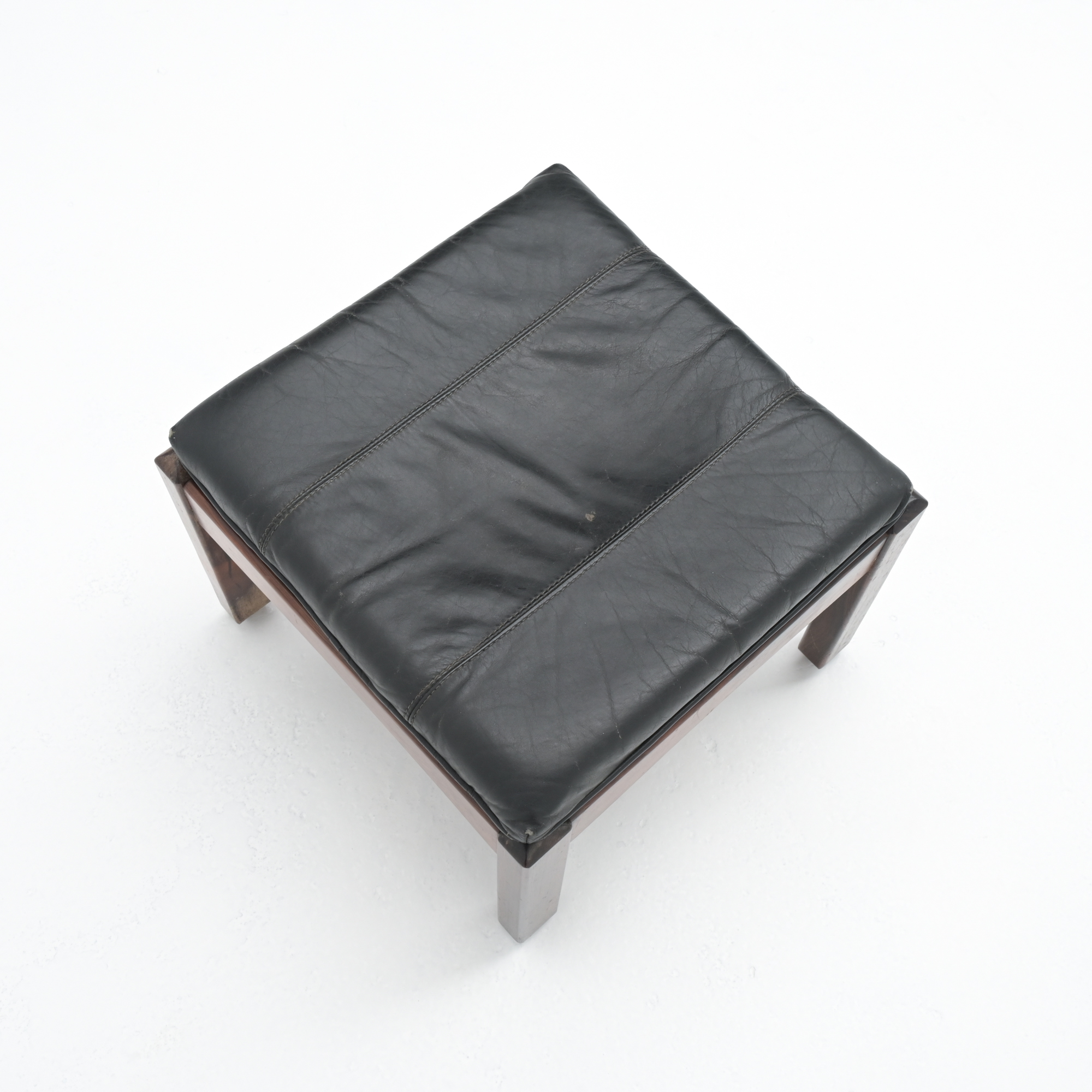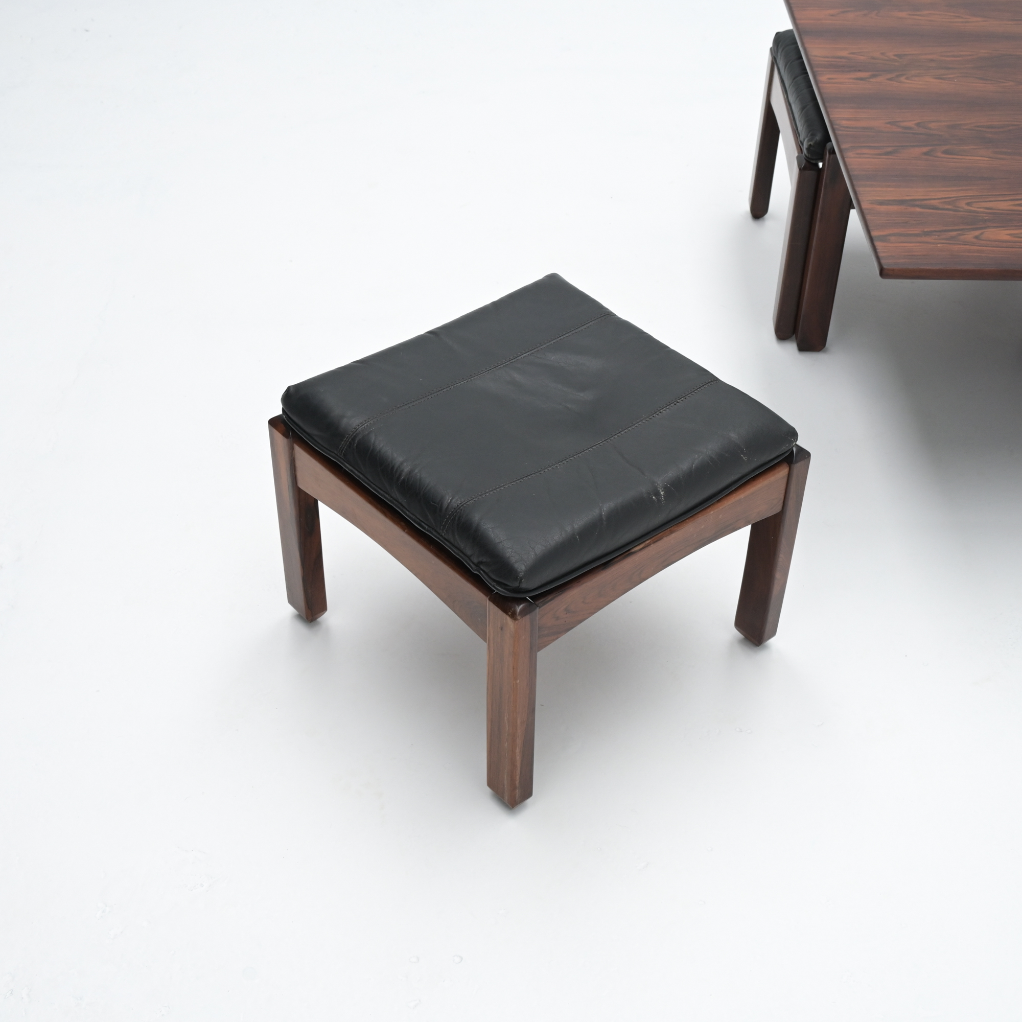 The coffee table is handmade of Jacaranda wood with a nice pattern on the table top. The 4 nesting stools are made of the same wood with natural leather singles and black leather cushions.