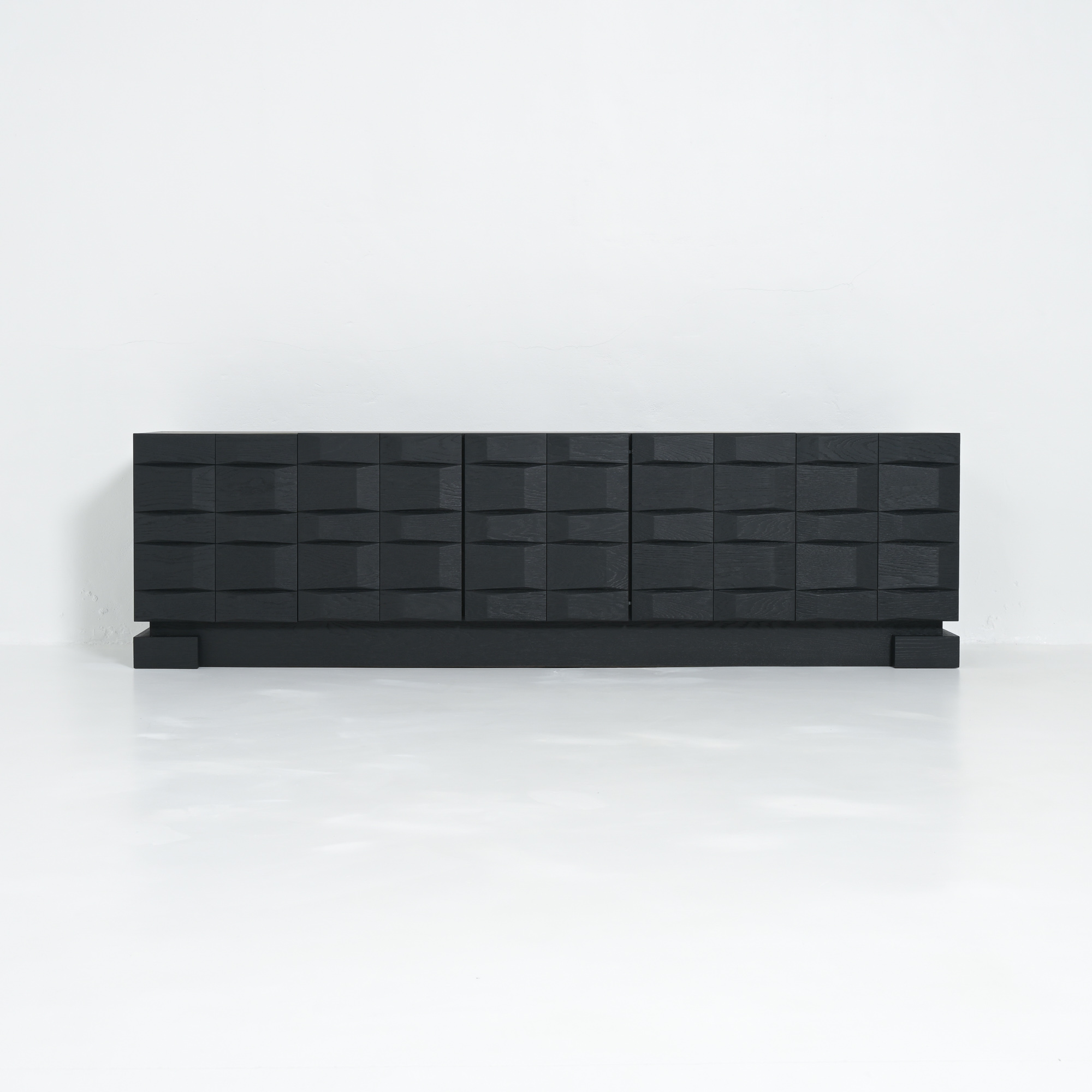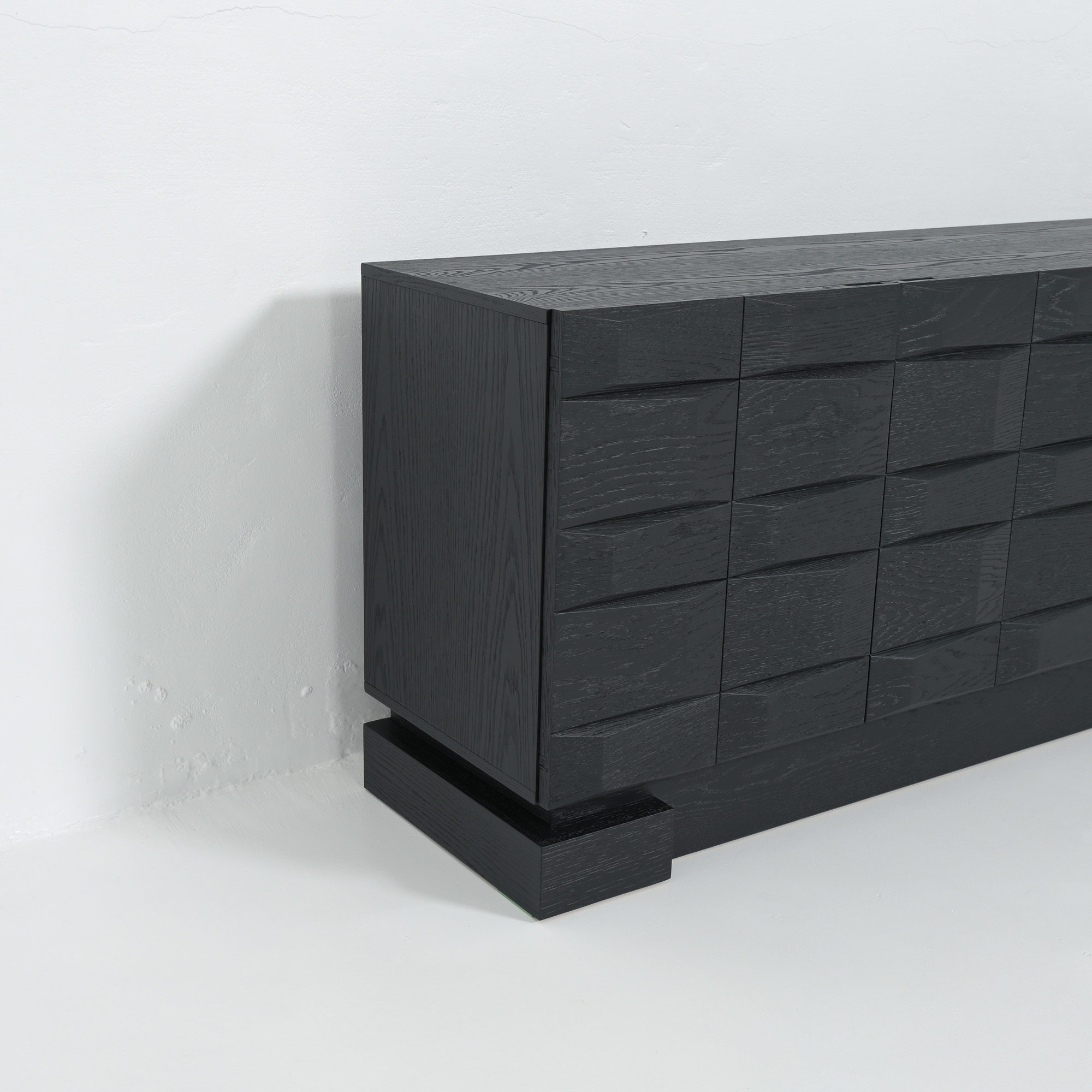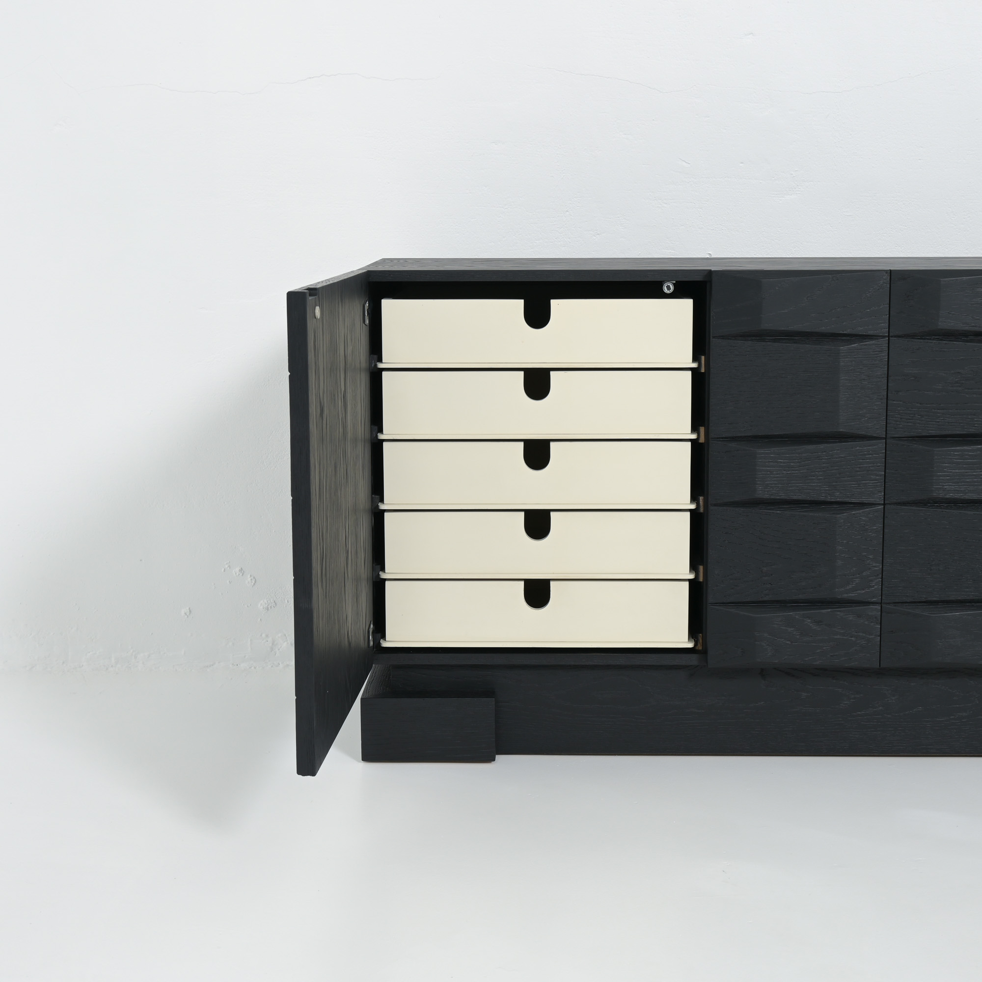 This sideboard was created and manufactured in Belgium in the 1970s. It is a high quality sideboard in black stained oak, with a beautiful visual texture. The sideboard shows a brutalist graphic pattern on its 5 doors and inside there is plenty of storage space by the shelves and the drawers.