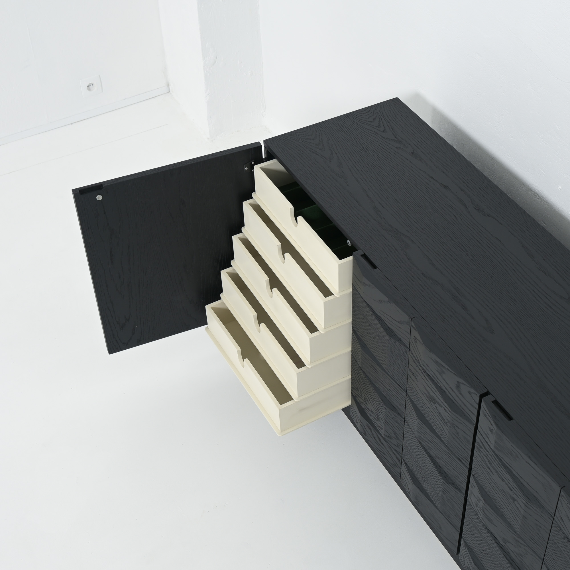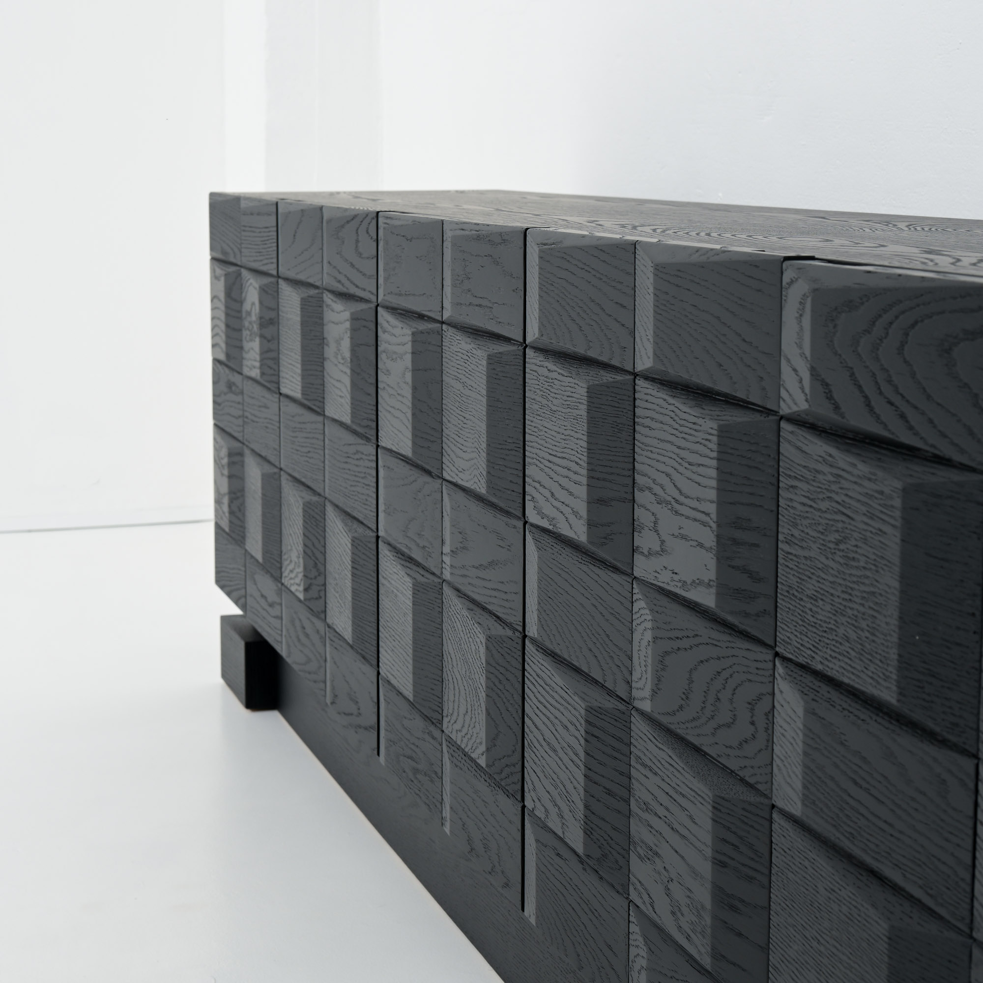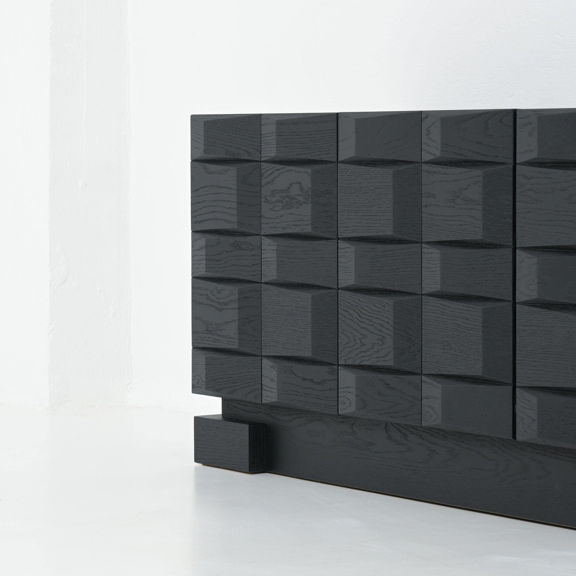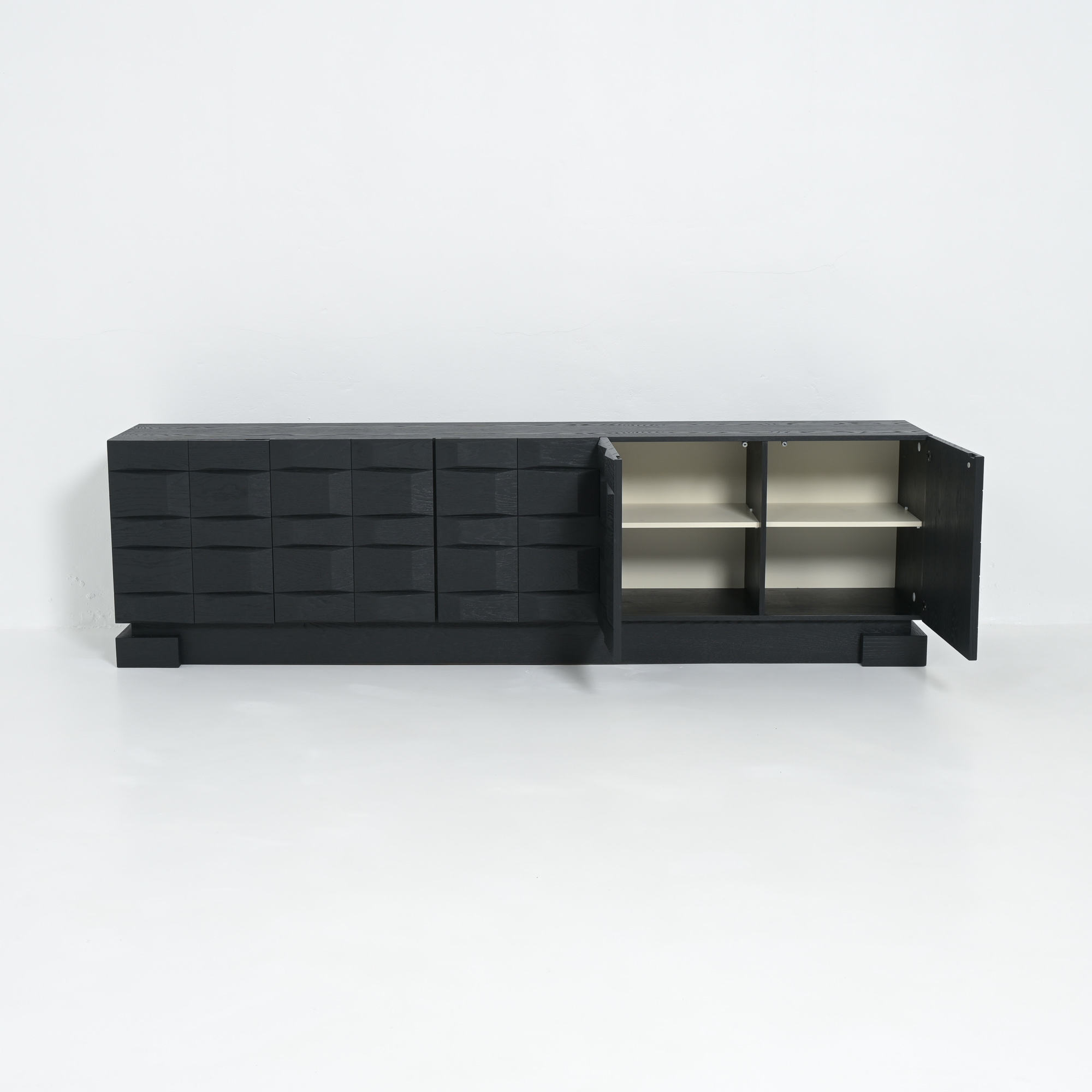 This sideboard was created and manufactured in Belgium in the 1970s. It is a high quality sideboard in black stained oak, with a beautiful visual texture. The sideboard shows a brutalist graphic pattern on its 5 doors and inside there is plenty of storage space by the shelves and the drawers.