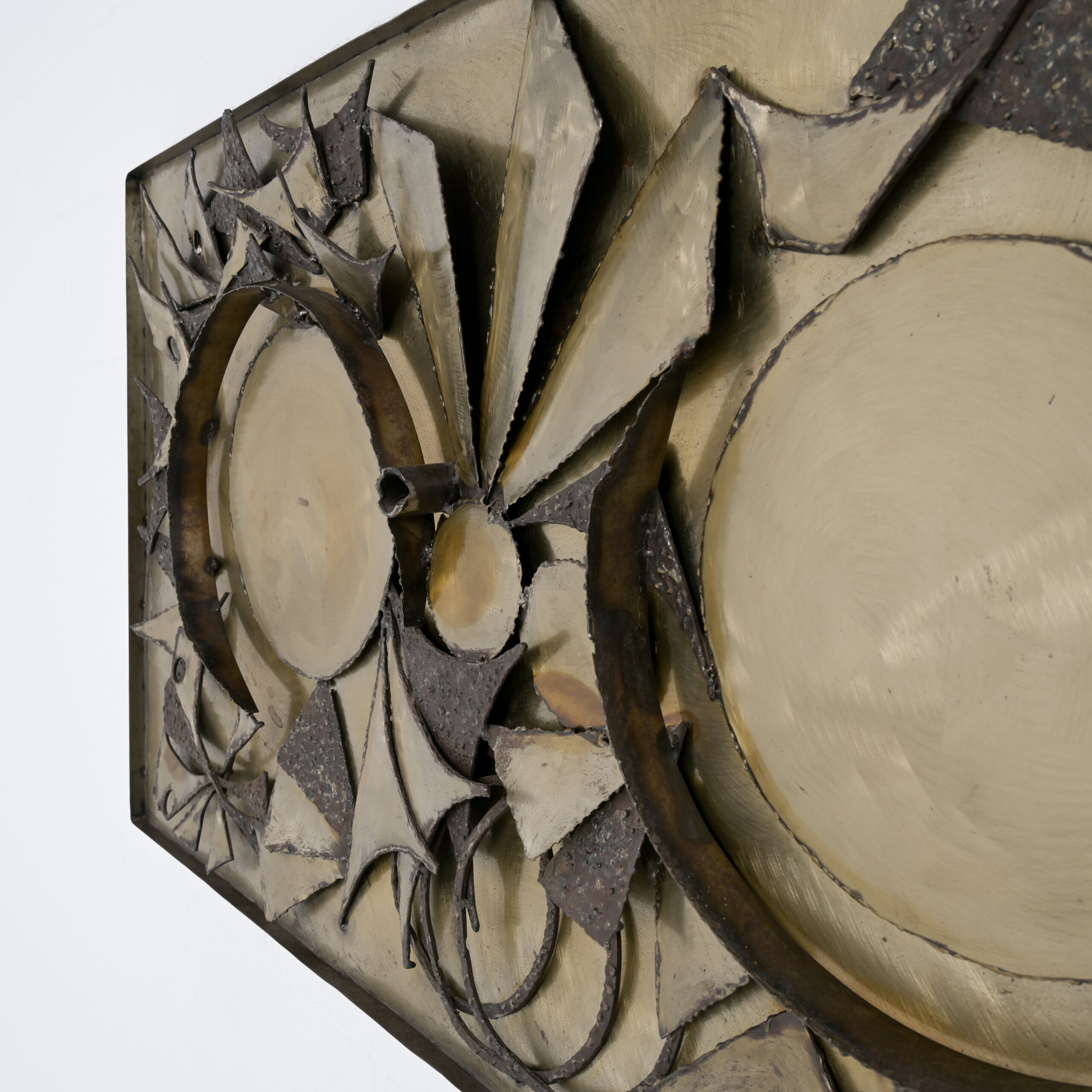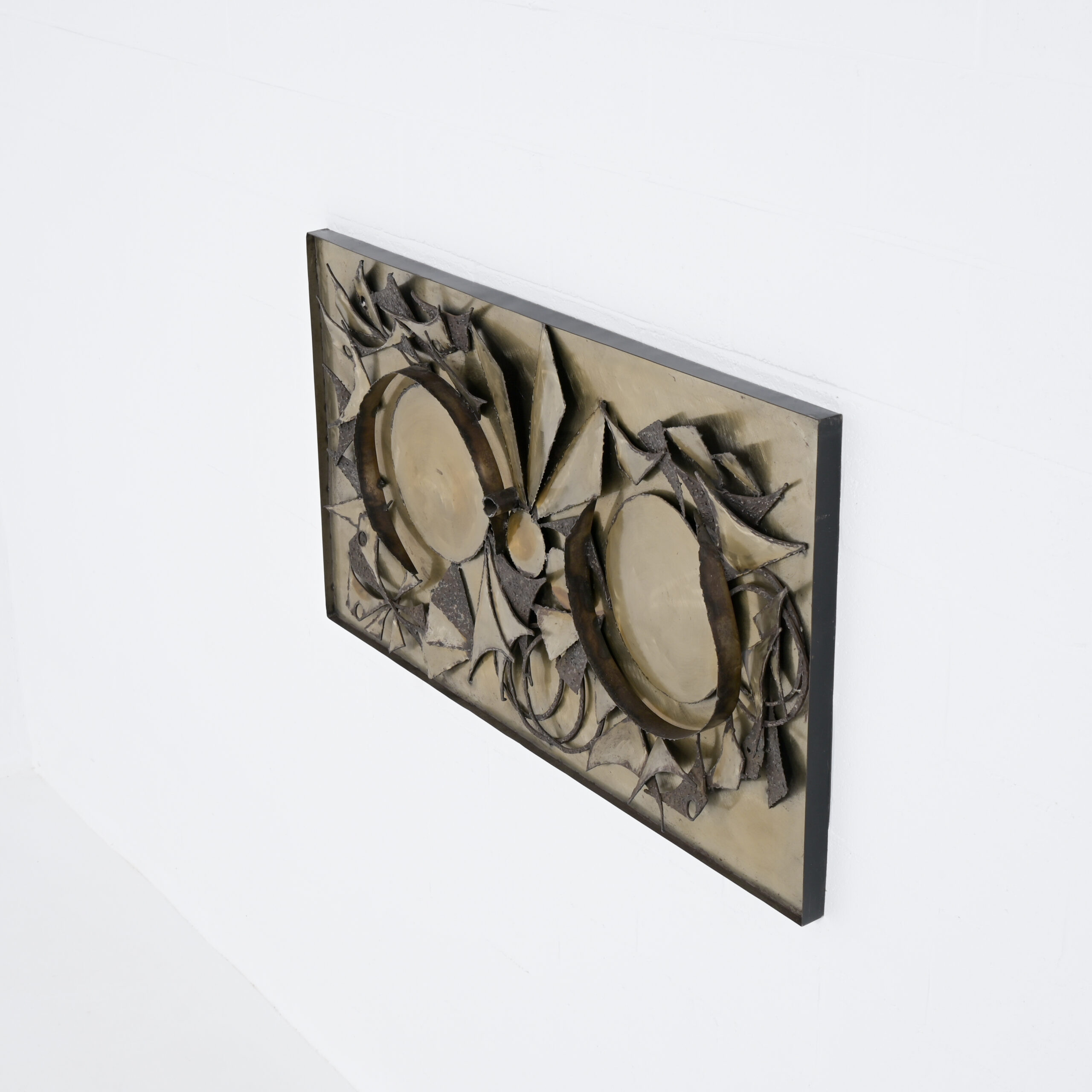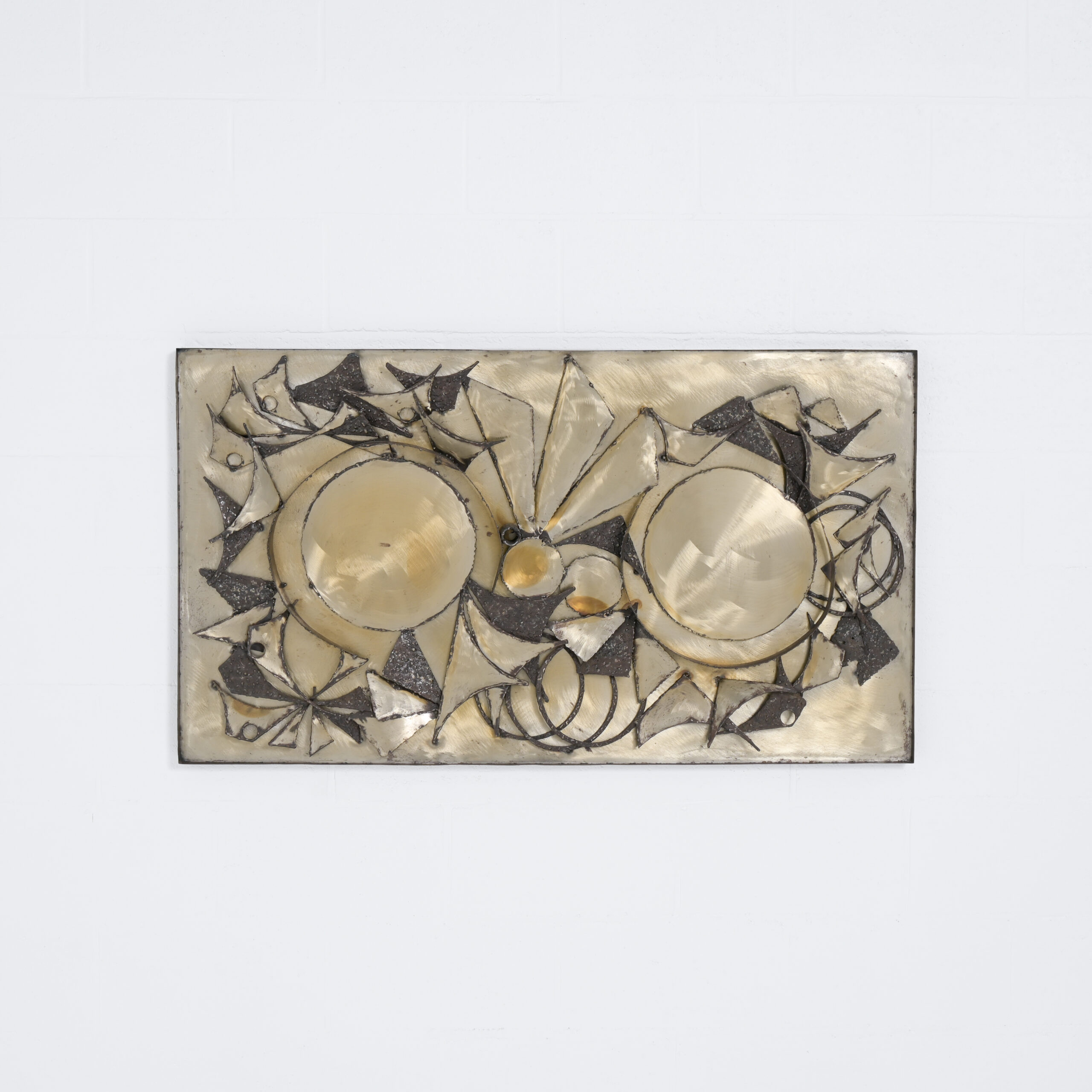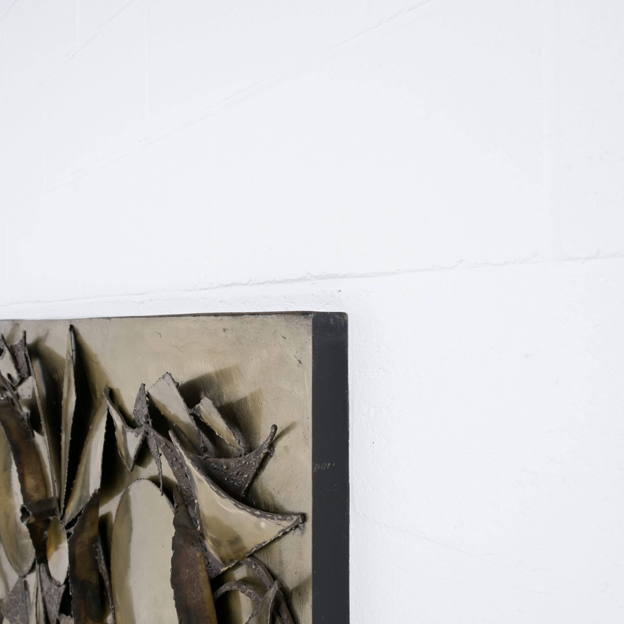 This brutalist wall sculpture is made by the Danish artist Henrik Horst in the 1970s. The geometric construction is made of patinated metal.