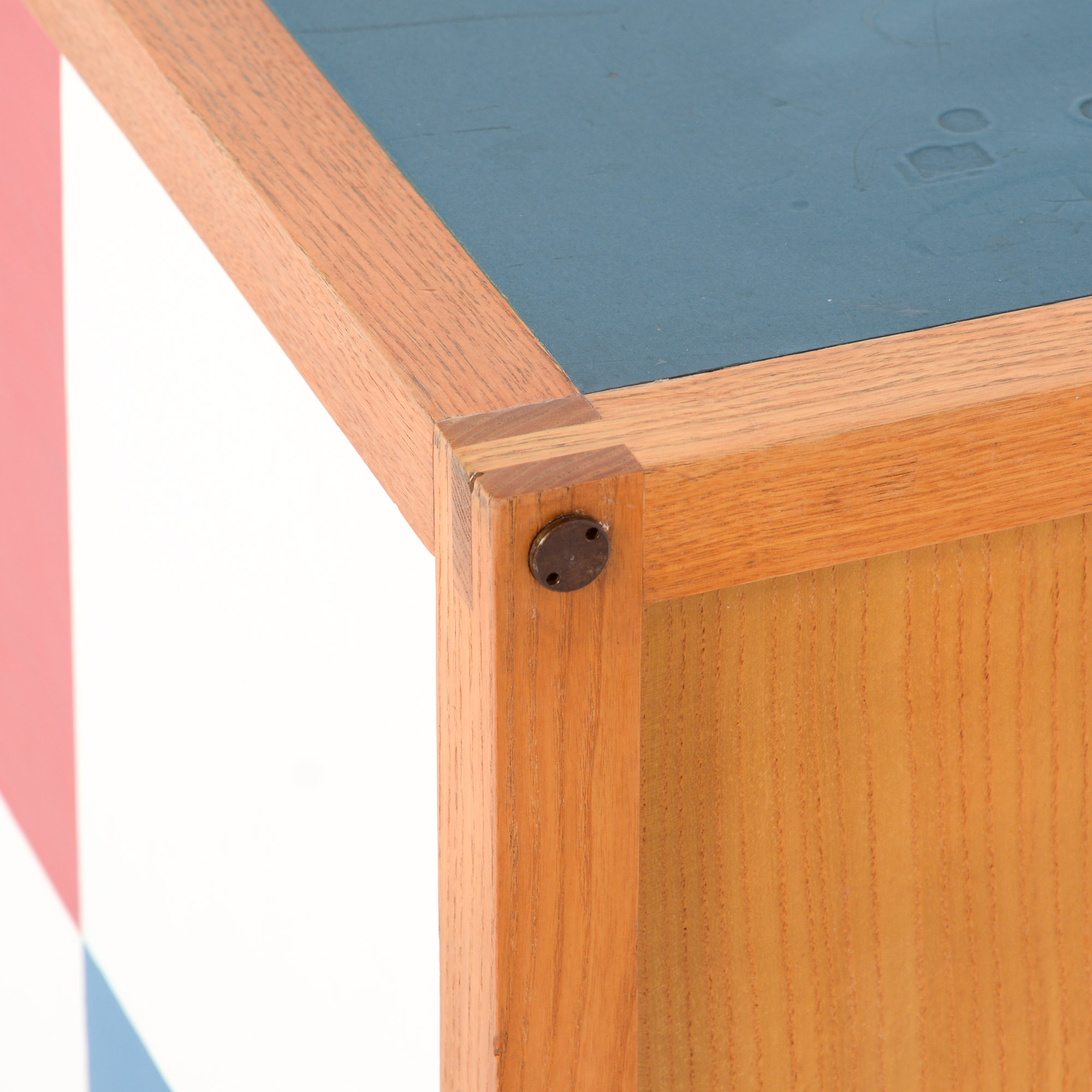 This cabinet is made of ash wood with a blue linoleum top. The two colorful sliding doors are an like an abstract painting.
