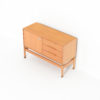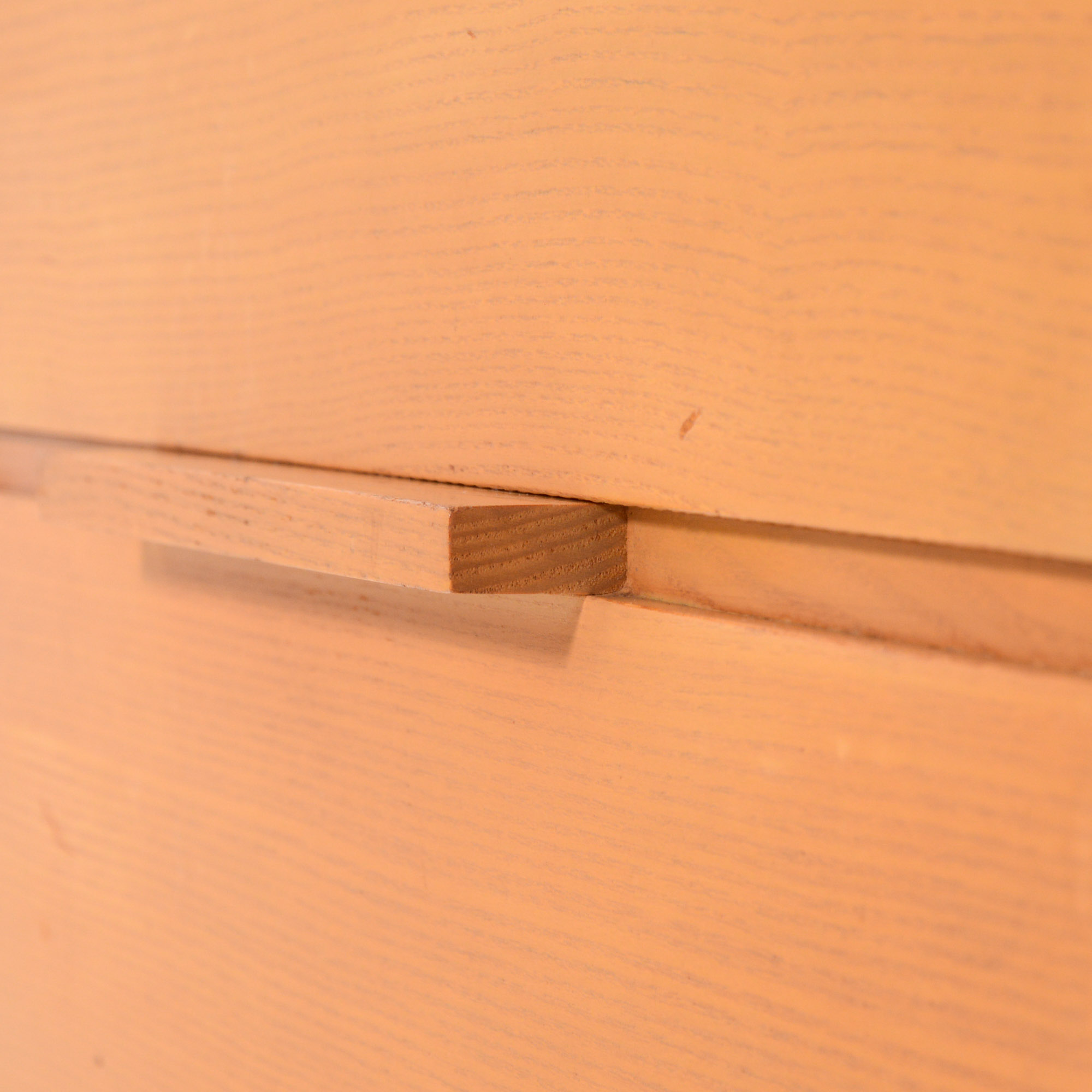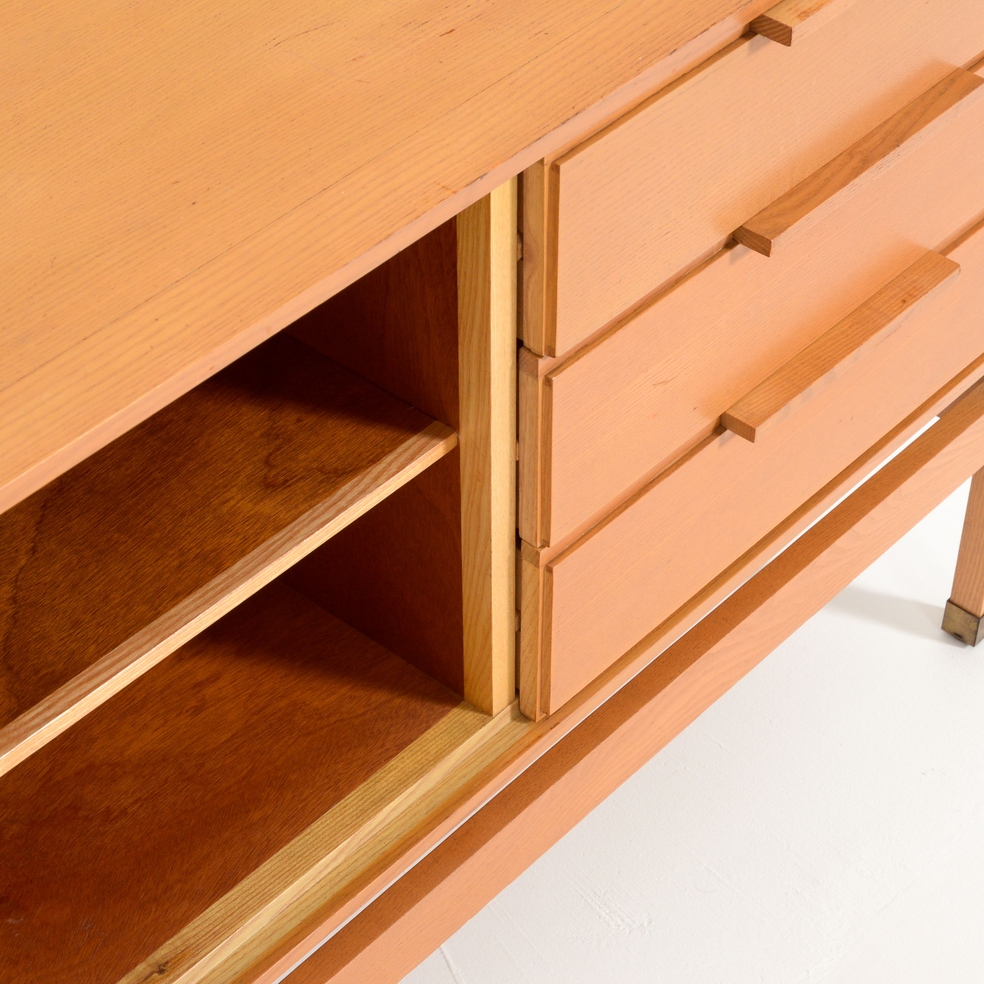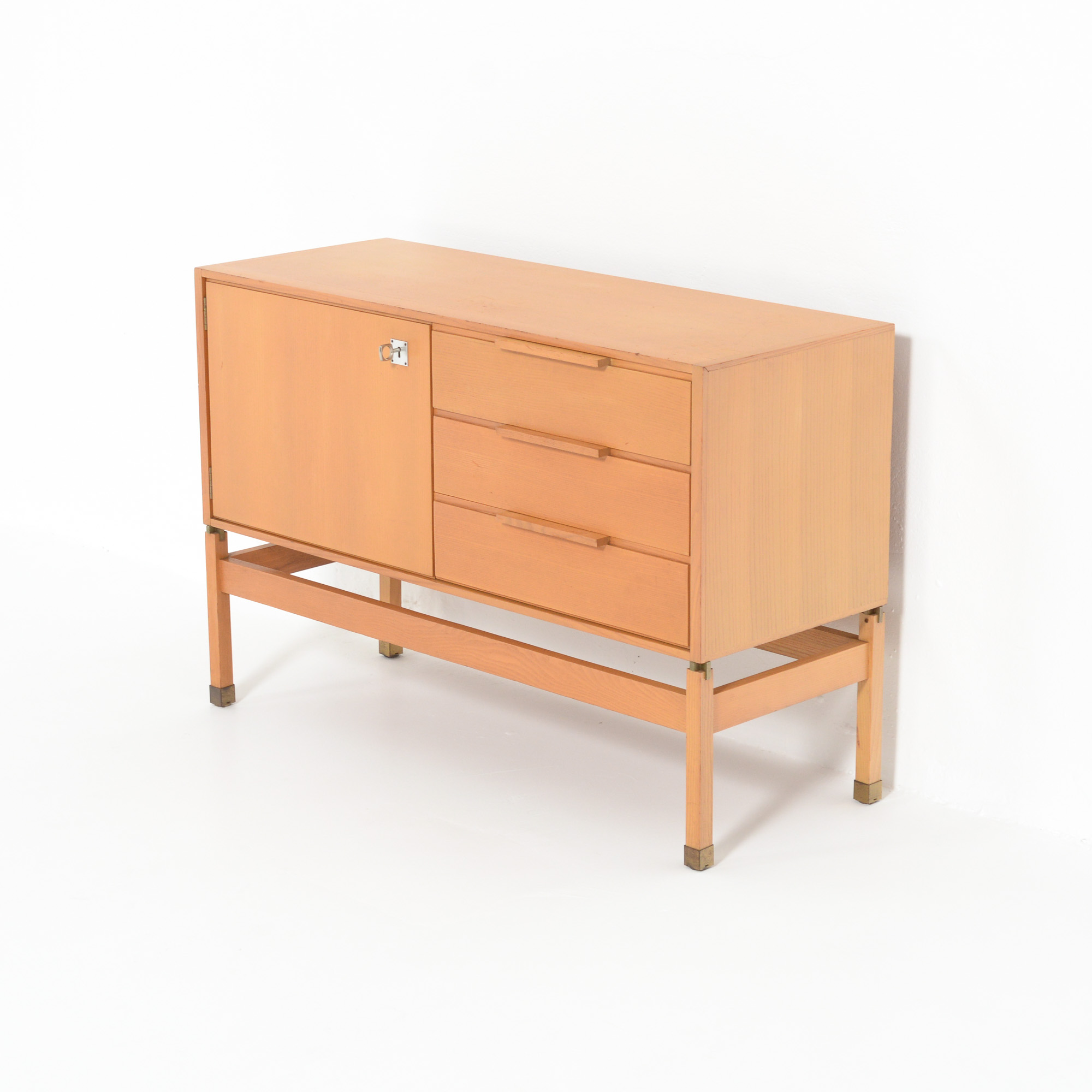 This low cabinet is made of ash wood covered with a transparent beige varnish. The base is very nice detailed with metal parts. Take a look at the detail pictures! This cabinet is in good condition with signs of age and use.