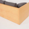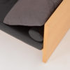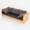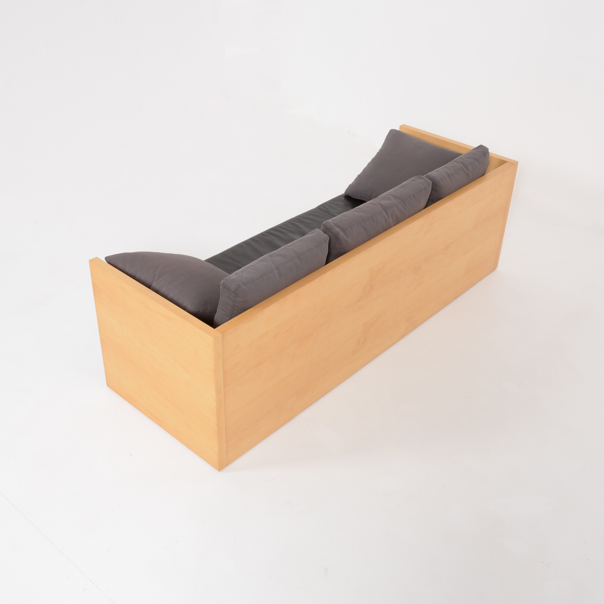This sofa is made of wood veneer. The seat and roller cushions are in black leather and the other cushions are in textile.