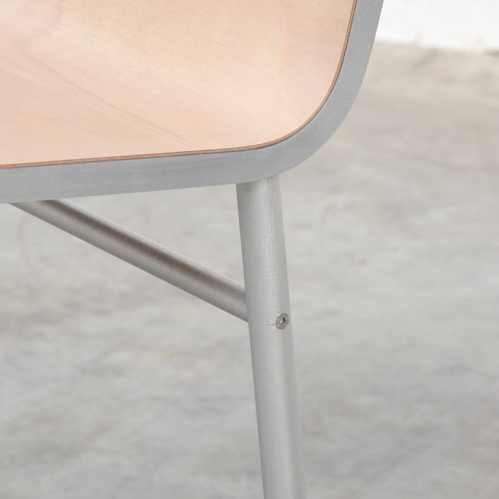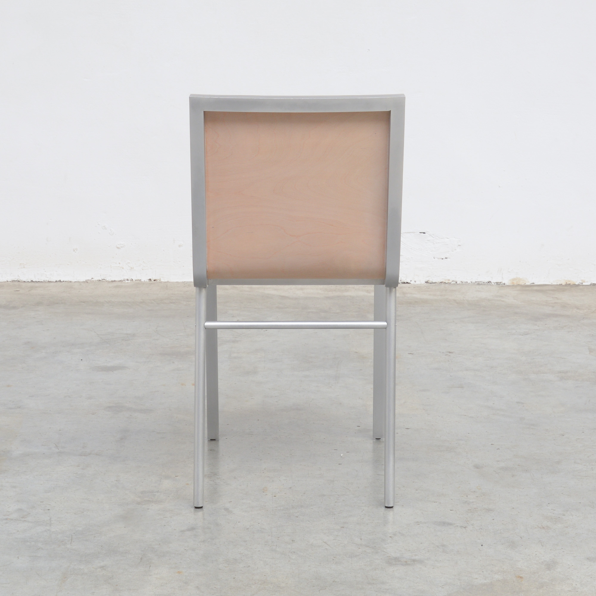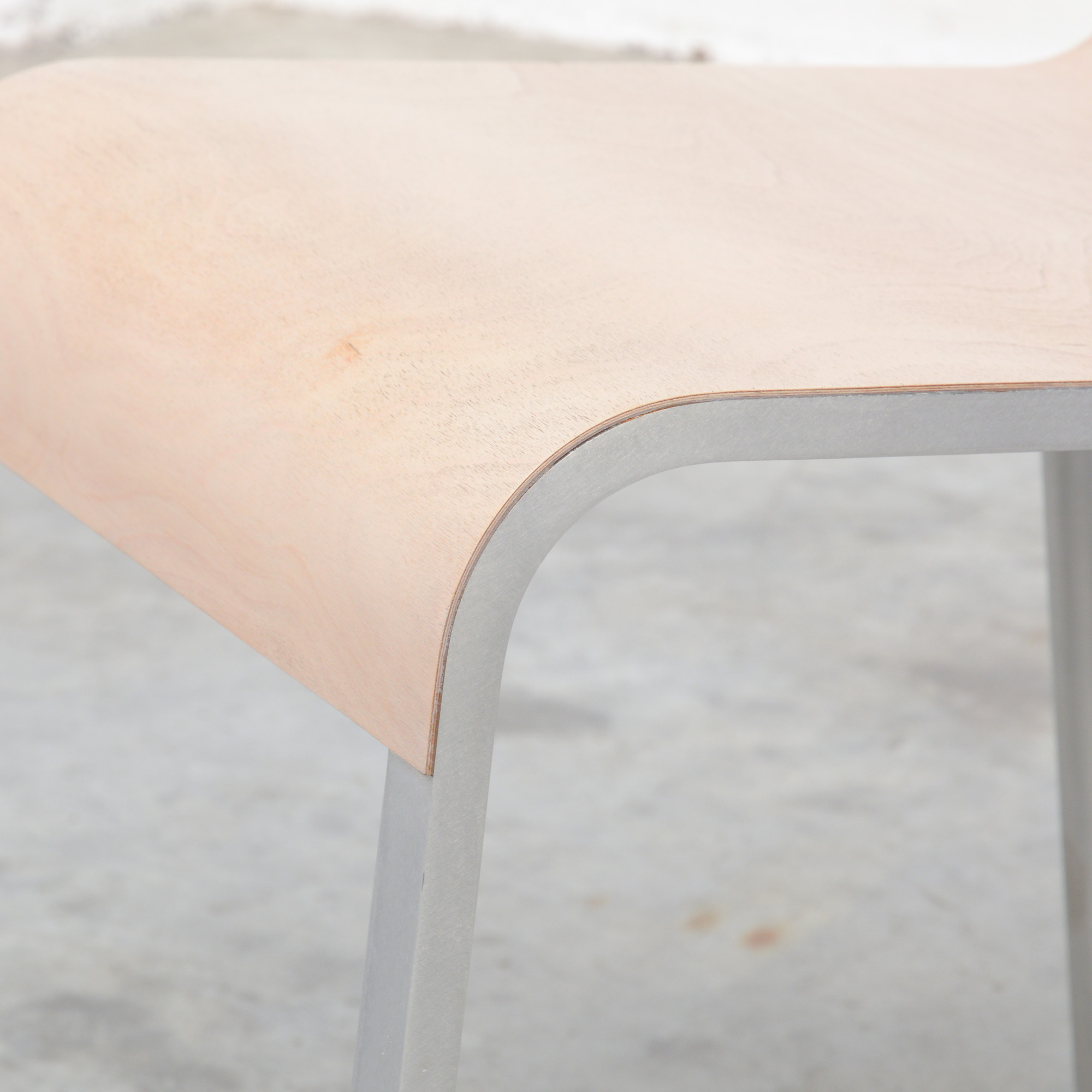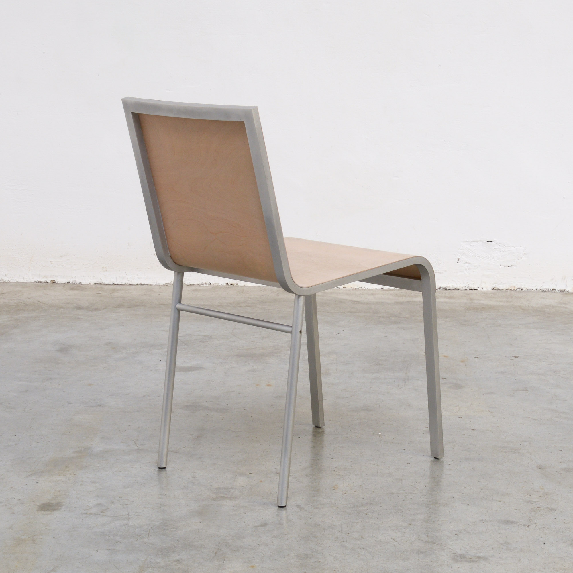 The frame is made of aluminum and the back and the seat are made of beech plywood, varnished on request of the client. This chair was only made in 4 copies, 2 are already sold.