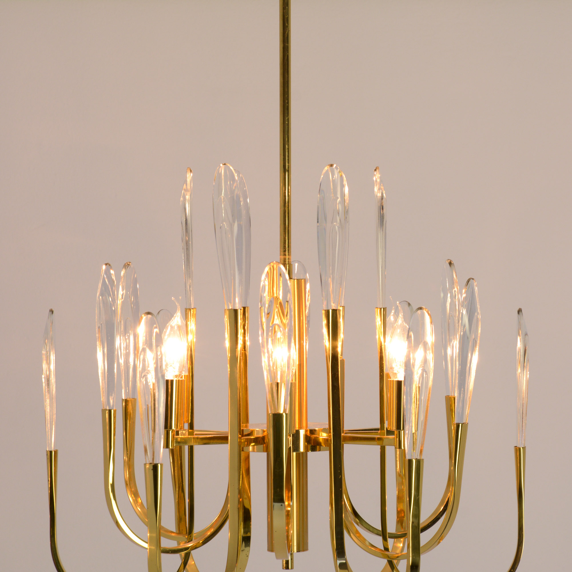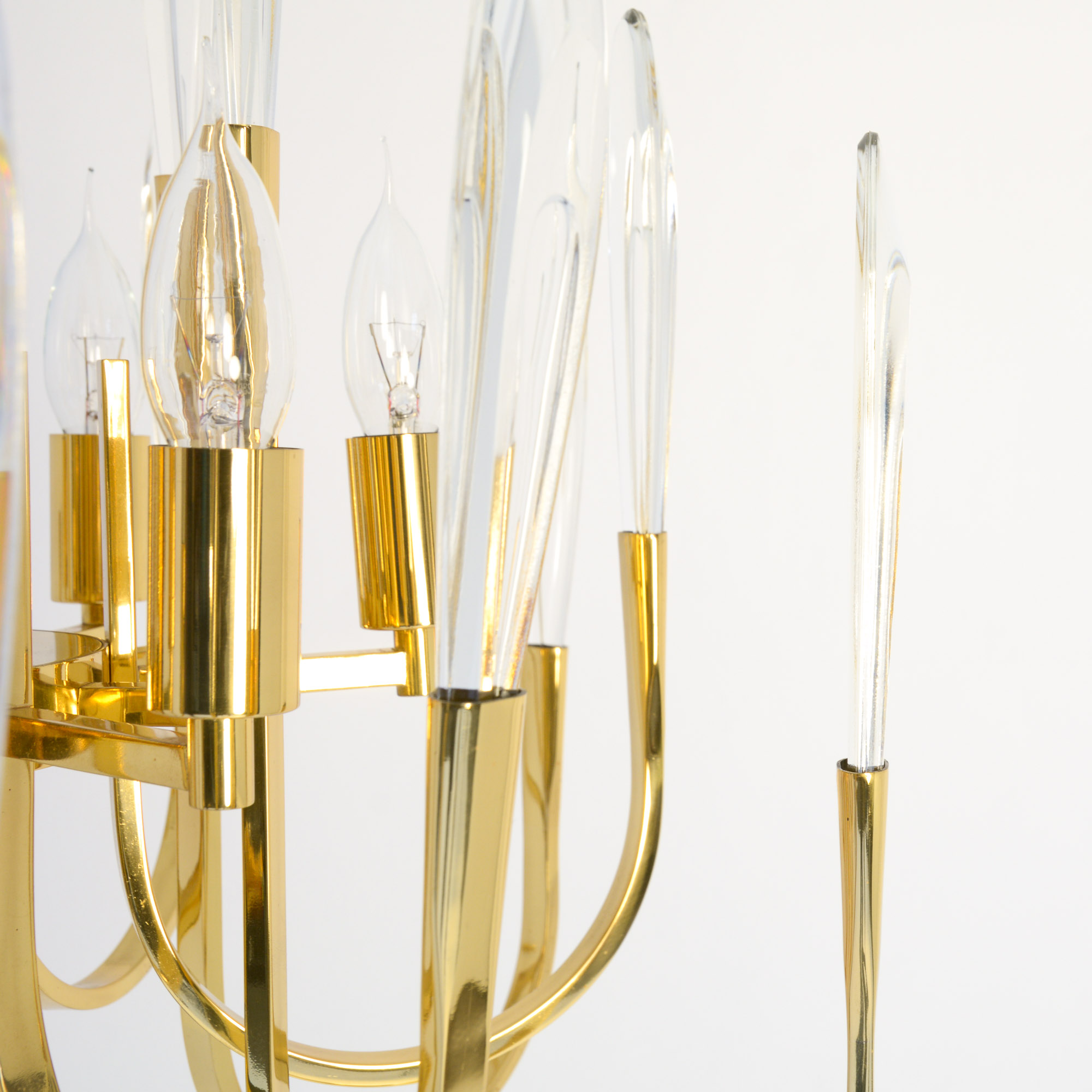This high quality made chandelier in brass is finished with crystal glass leaves that create a fairylike effect.