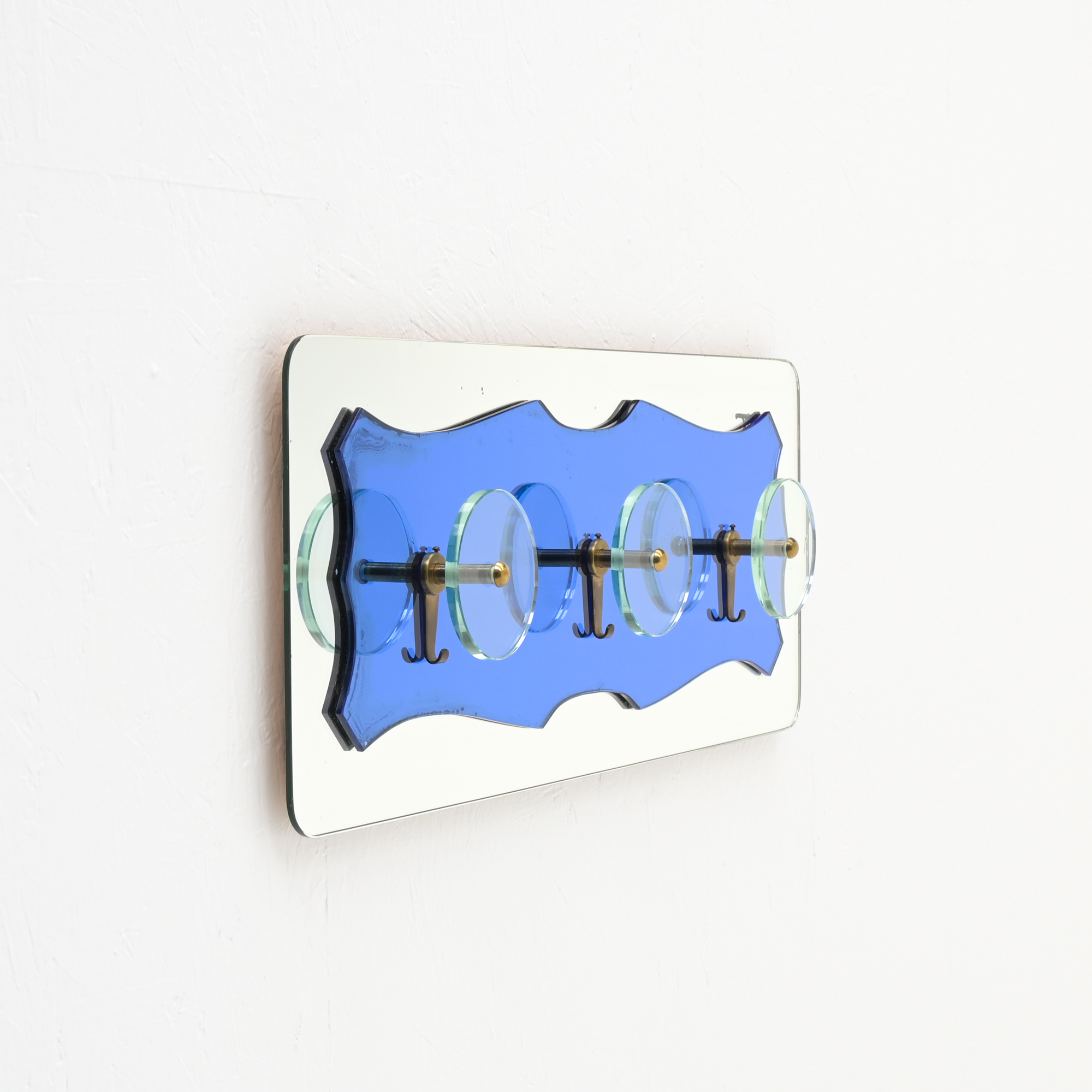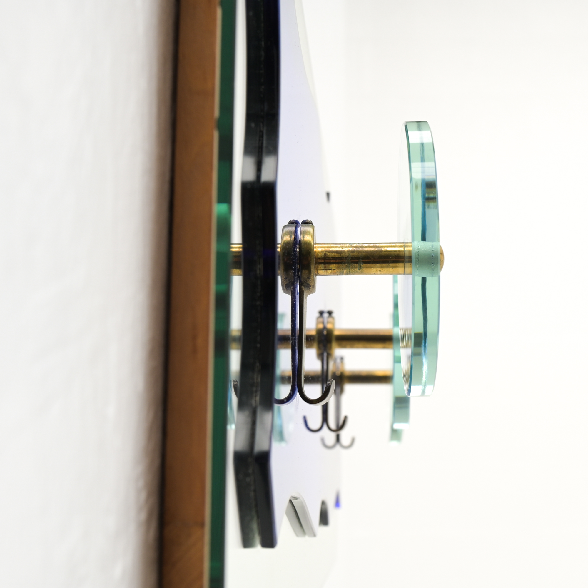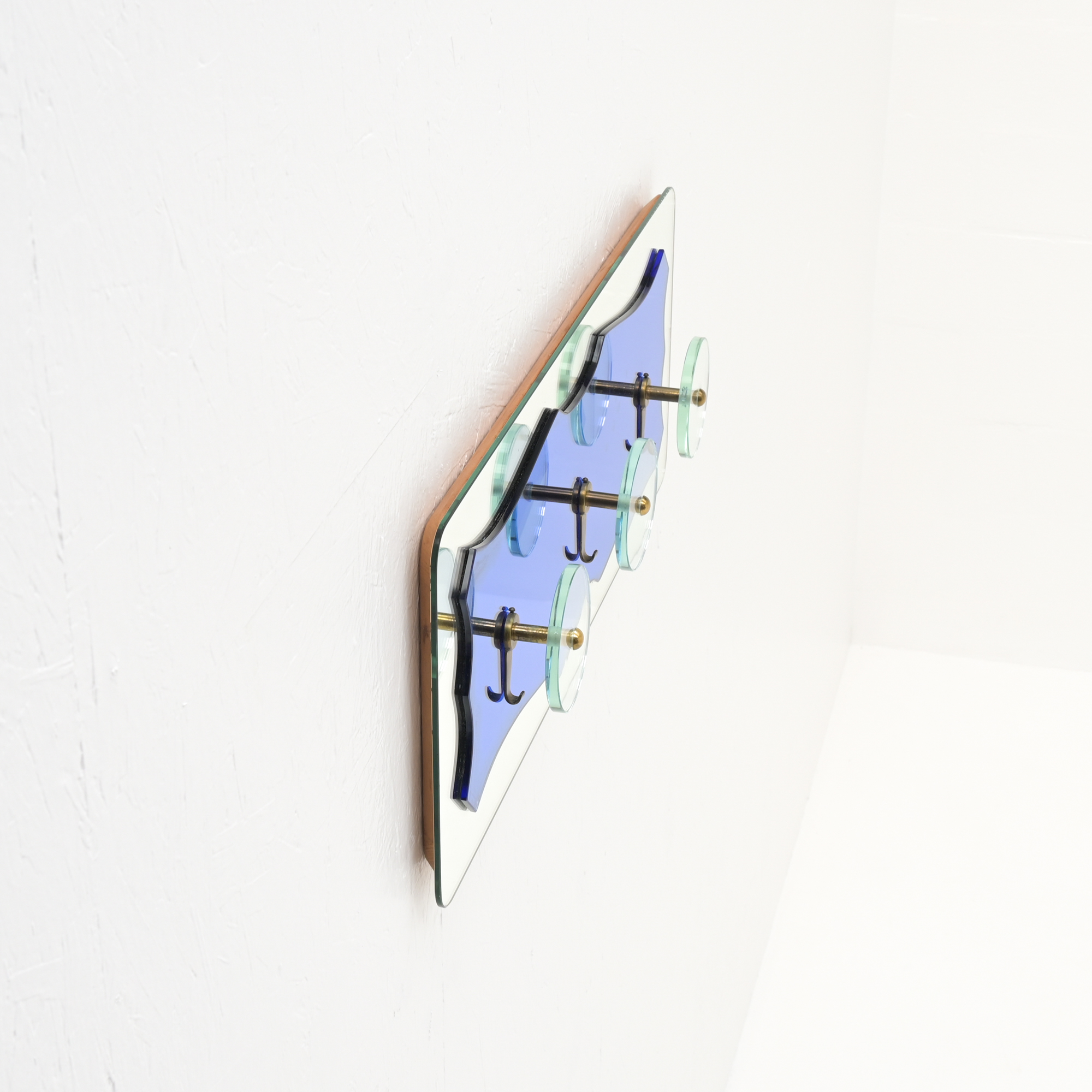 The coat rack features a mirror in two finishes, with elemental ornament. The coat hangers feature translucent glass and brass .