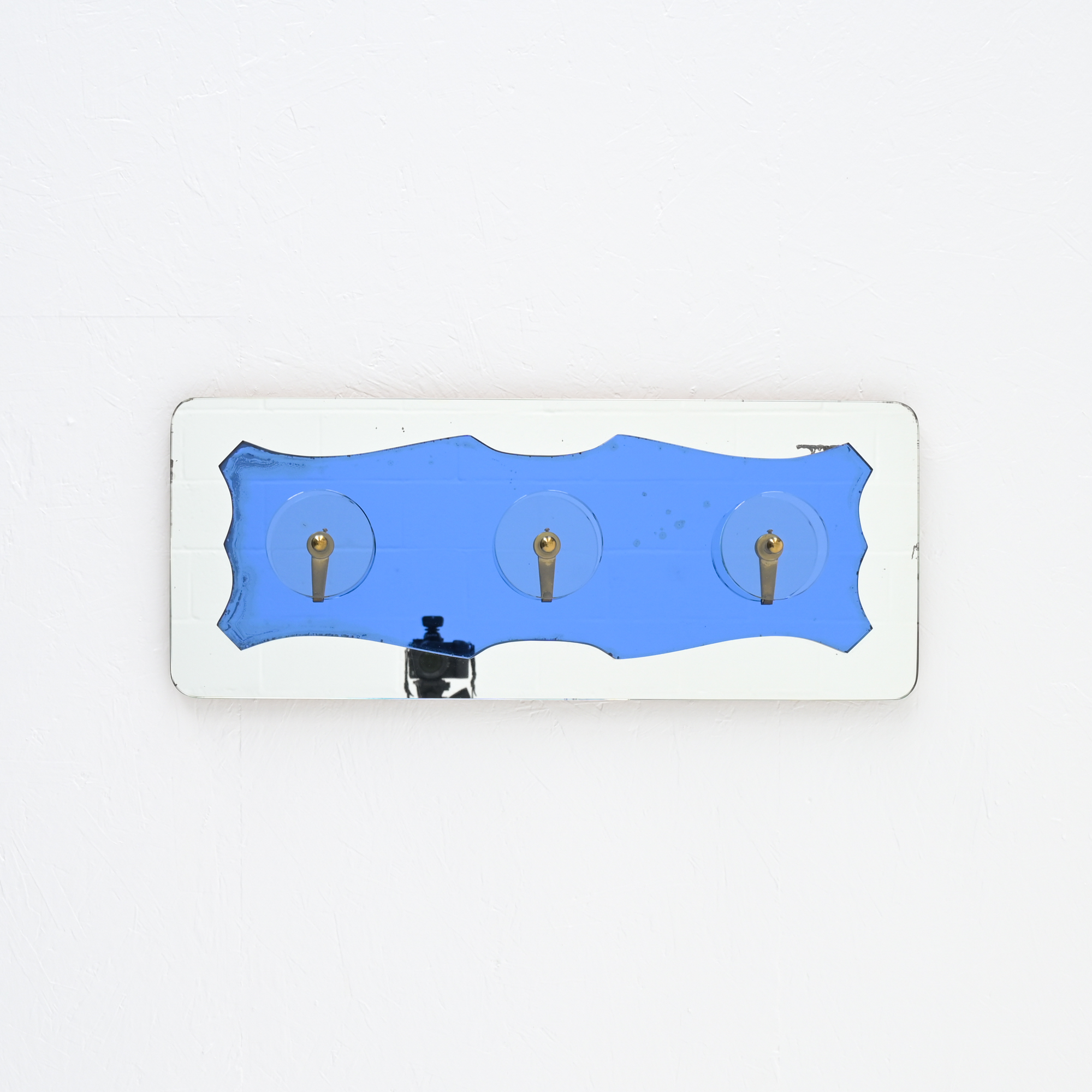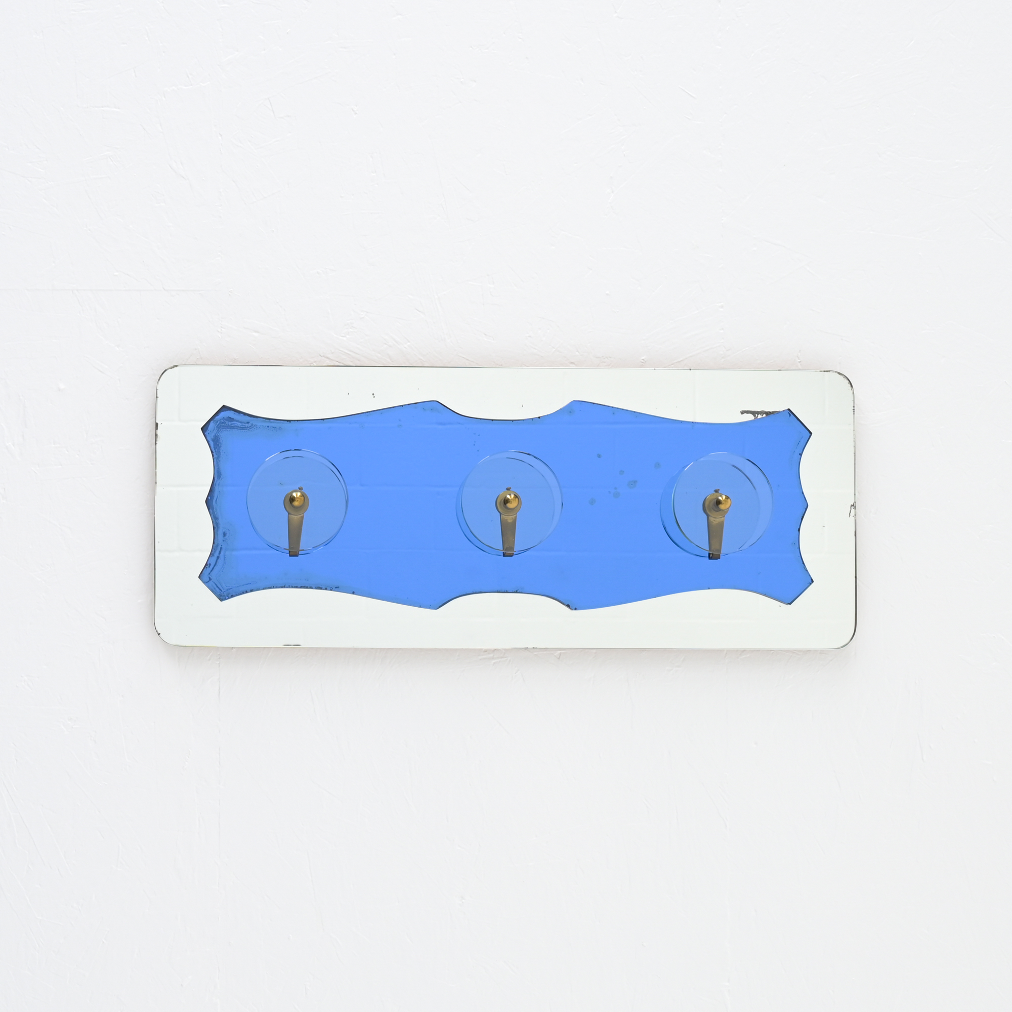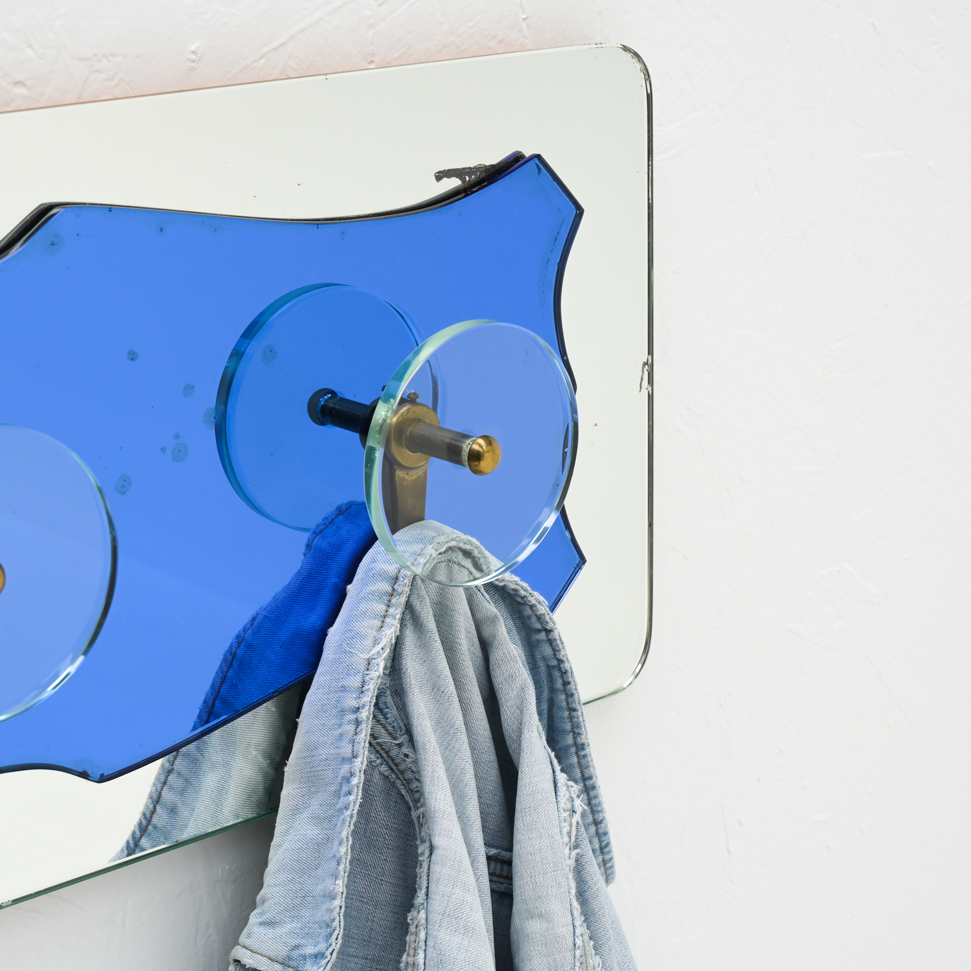 The coat rack features a mirror in two finishes, with elemental ornament. The coat hangers feature translucent glass and brass .