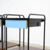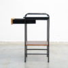 This side table with the elegant black lacquered metal frame has a blue formica top, a metal drawer with the same blue formica front and a layer in wood veneer.