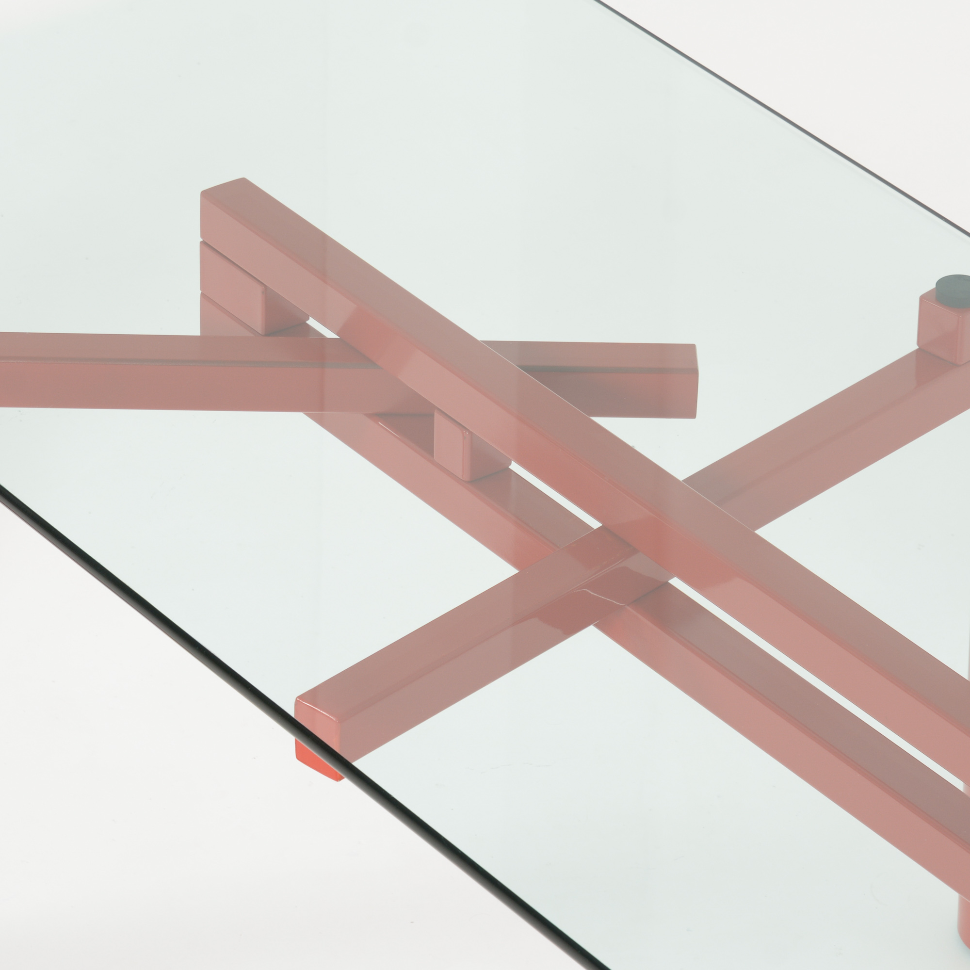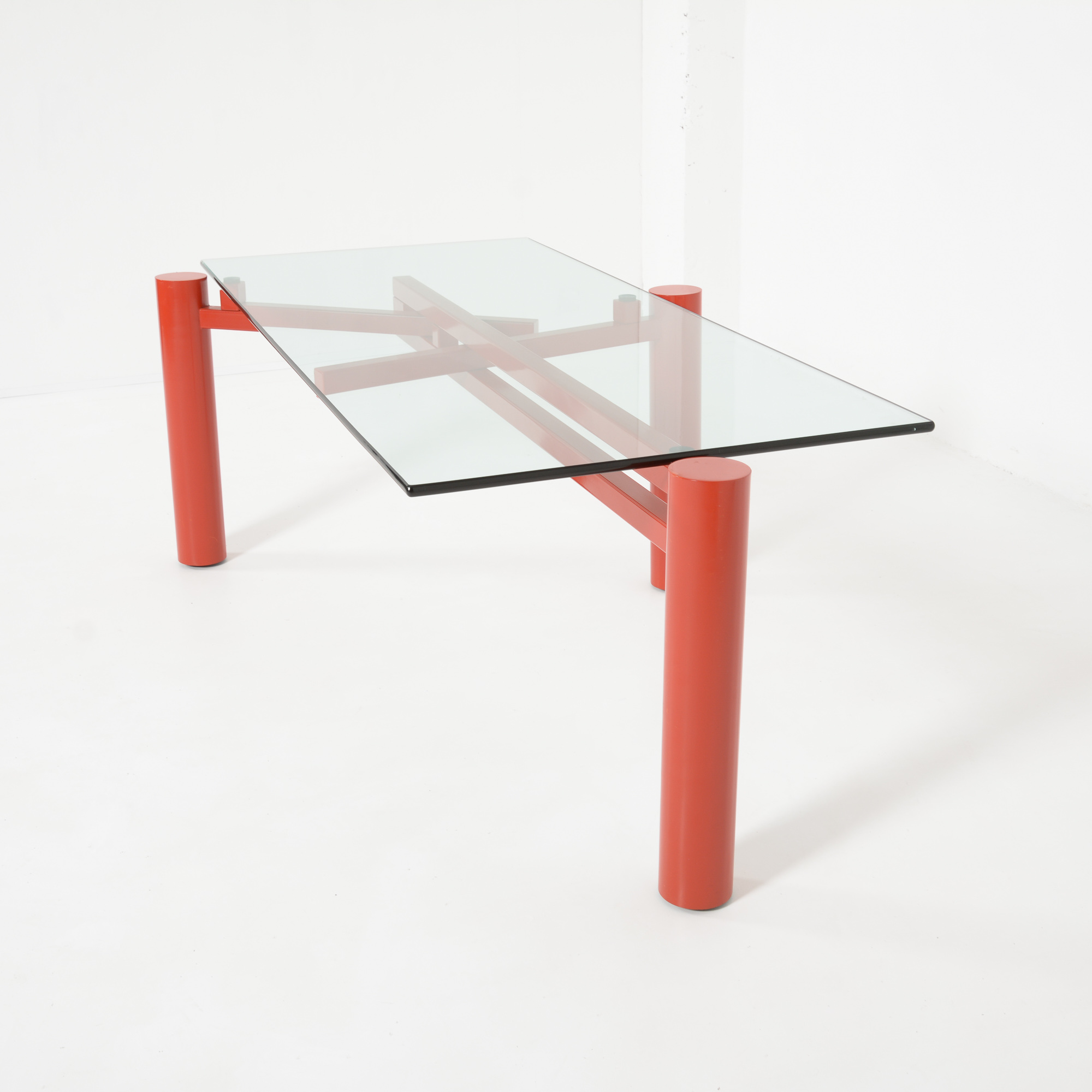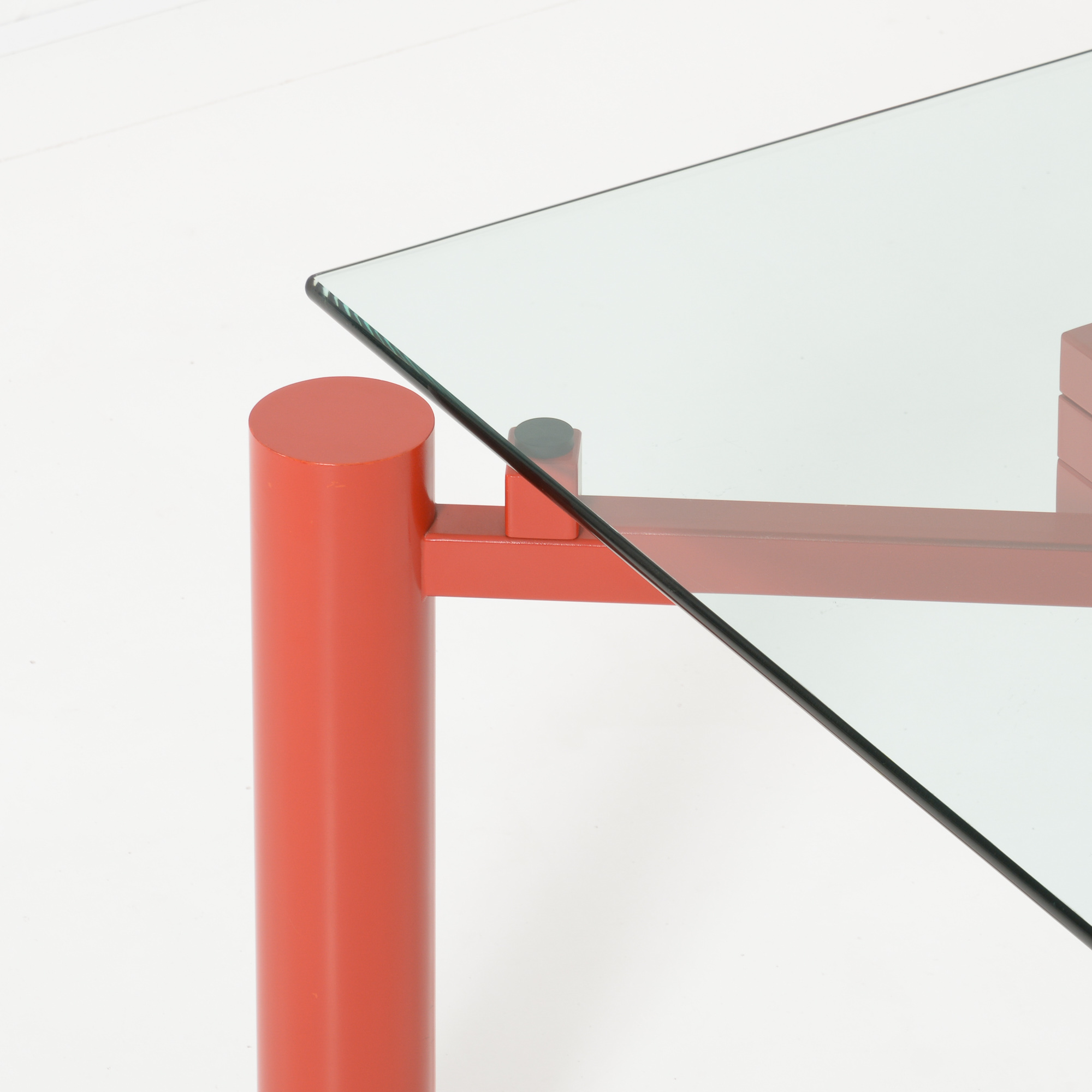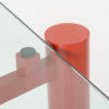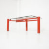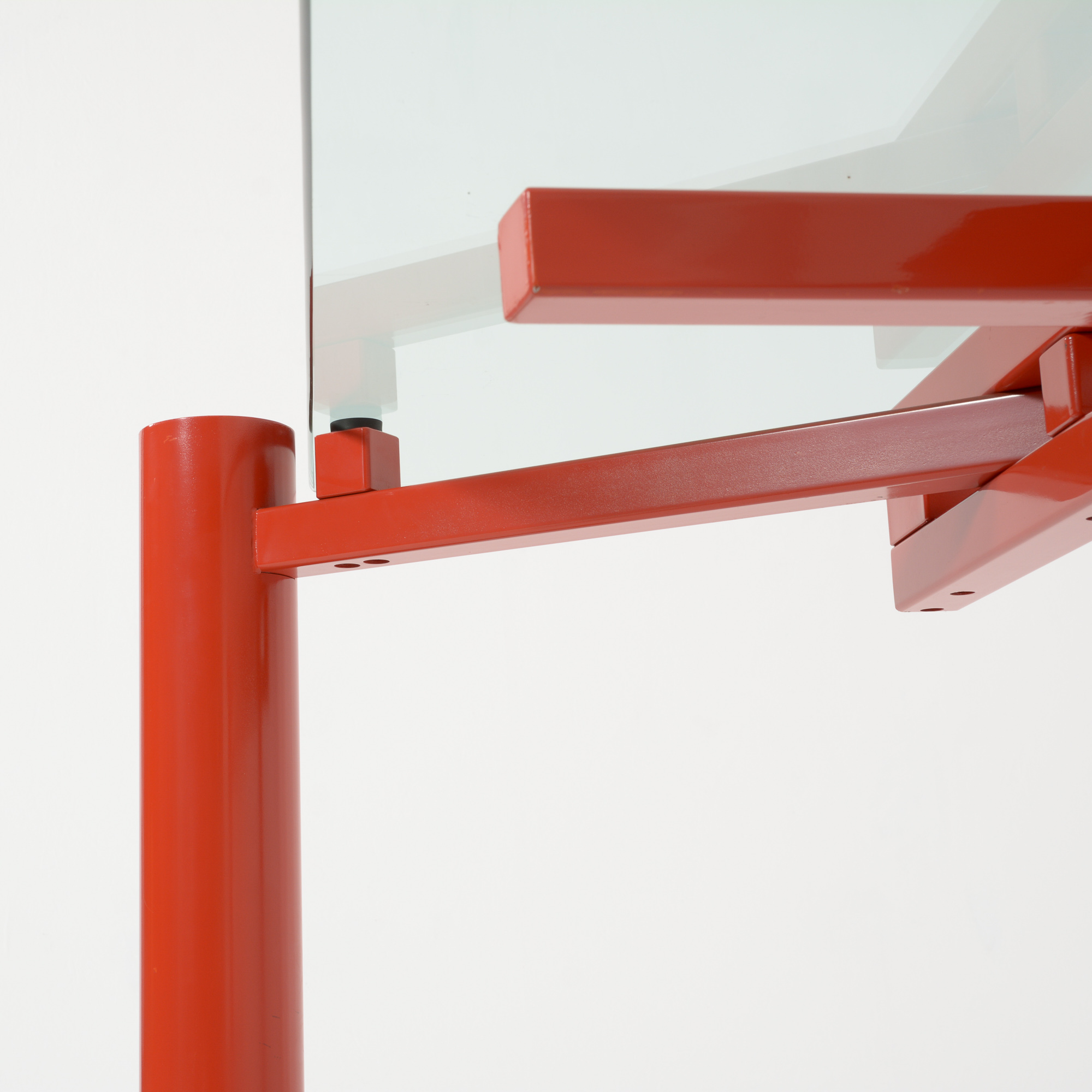 The heavy red-orange metal base consists of 3 legs that can be placed in different positions so that the rectangular glass top can be changed into a square or circular glass, stone or wooden top.