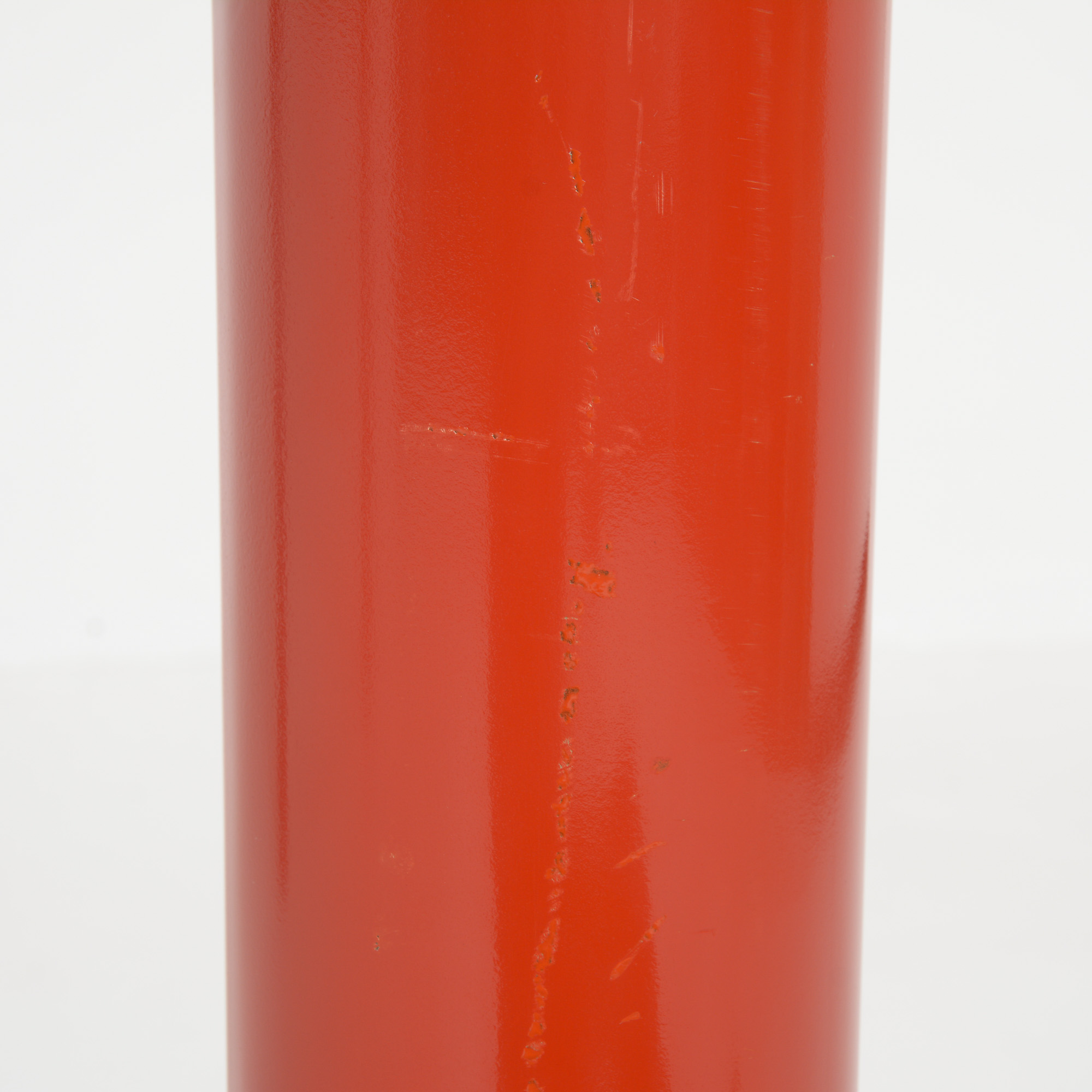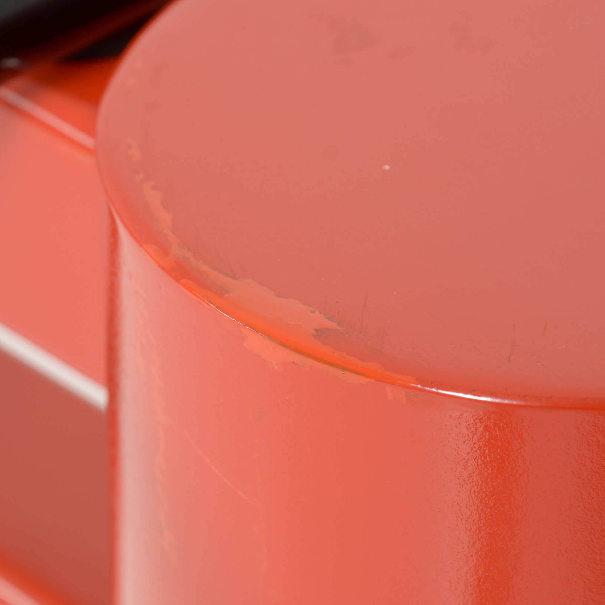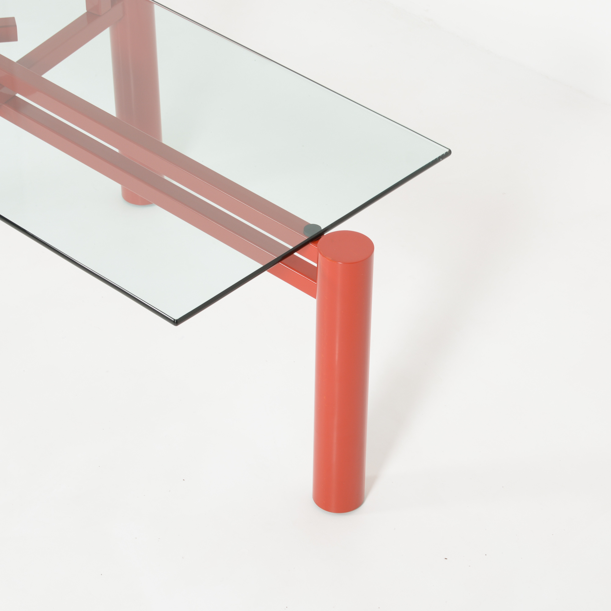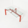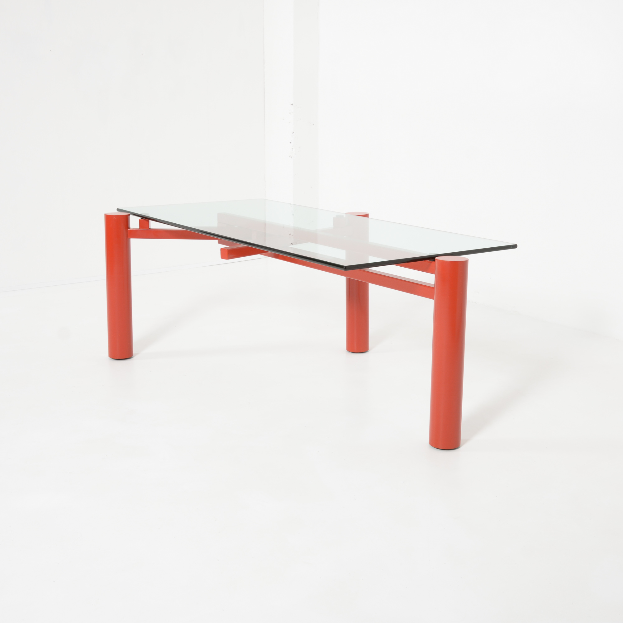 The heavy red-orange metal base consists of 3 legs that can be placed in different positions so that the rectangular glass top can be changed into a square or circular glass, stone or wooden top.