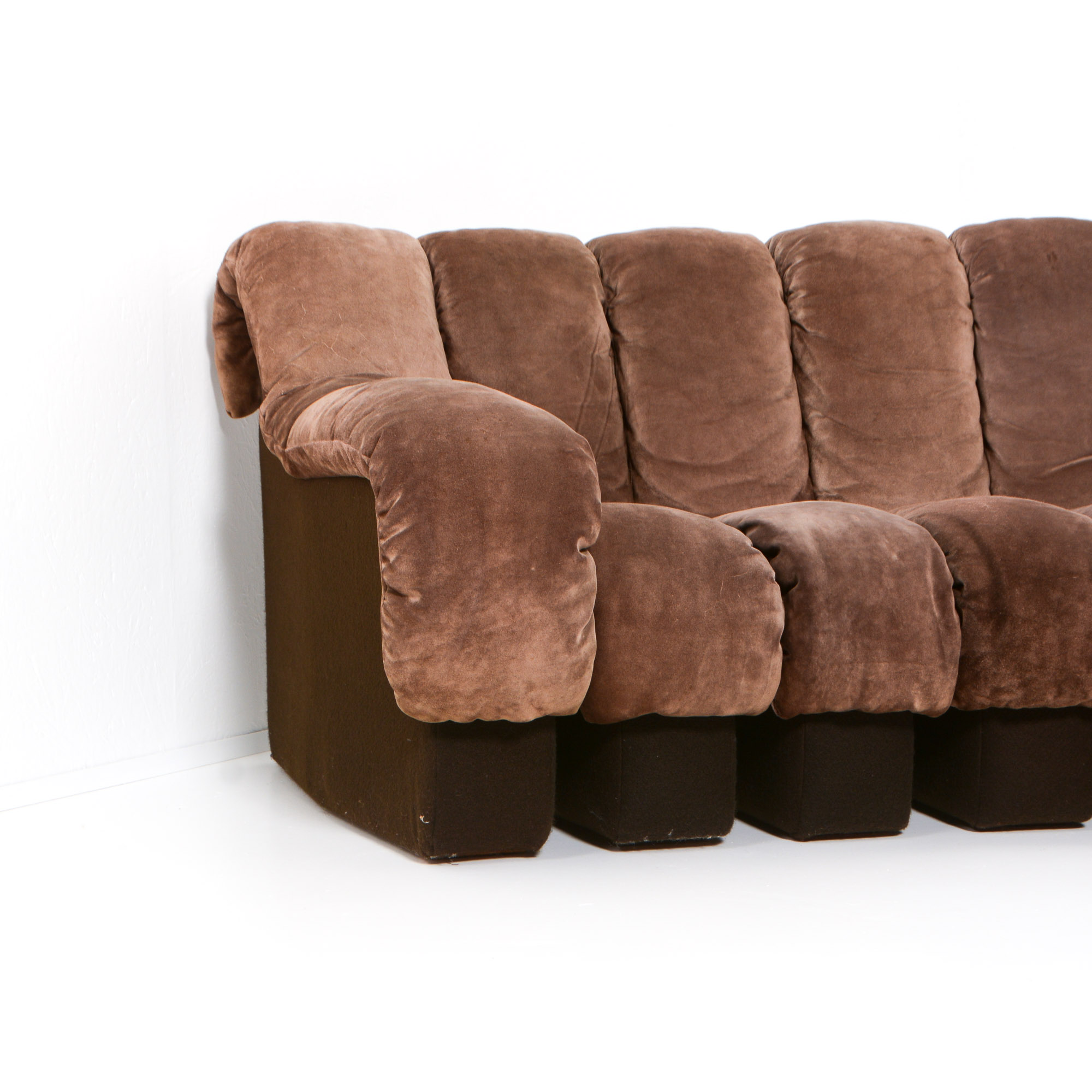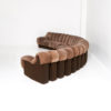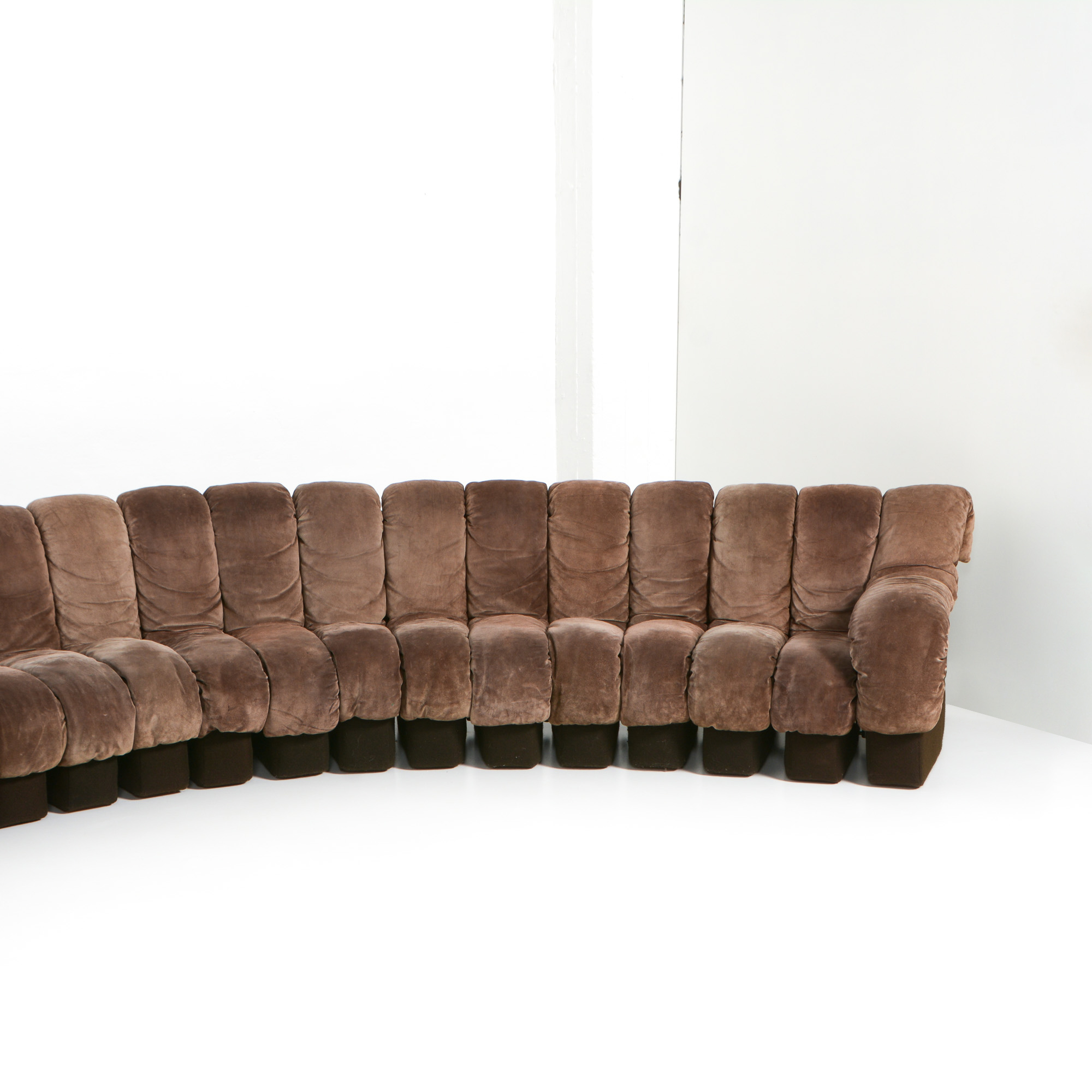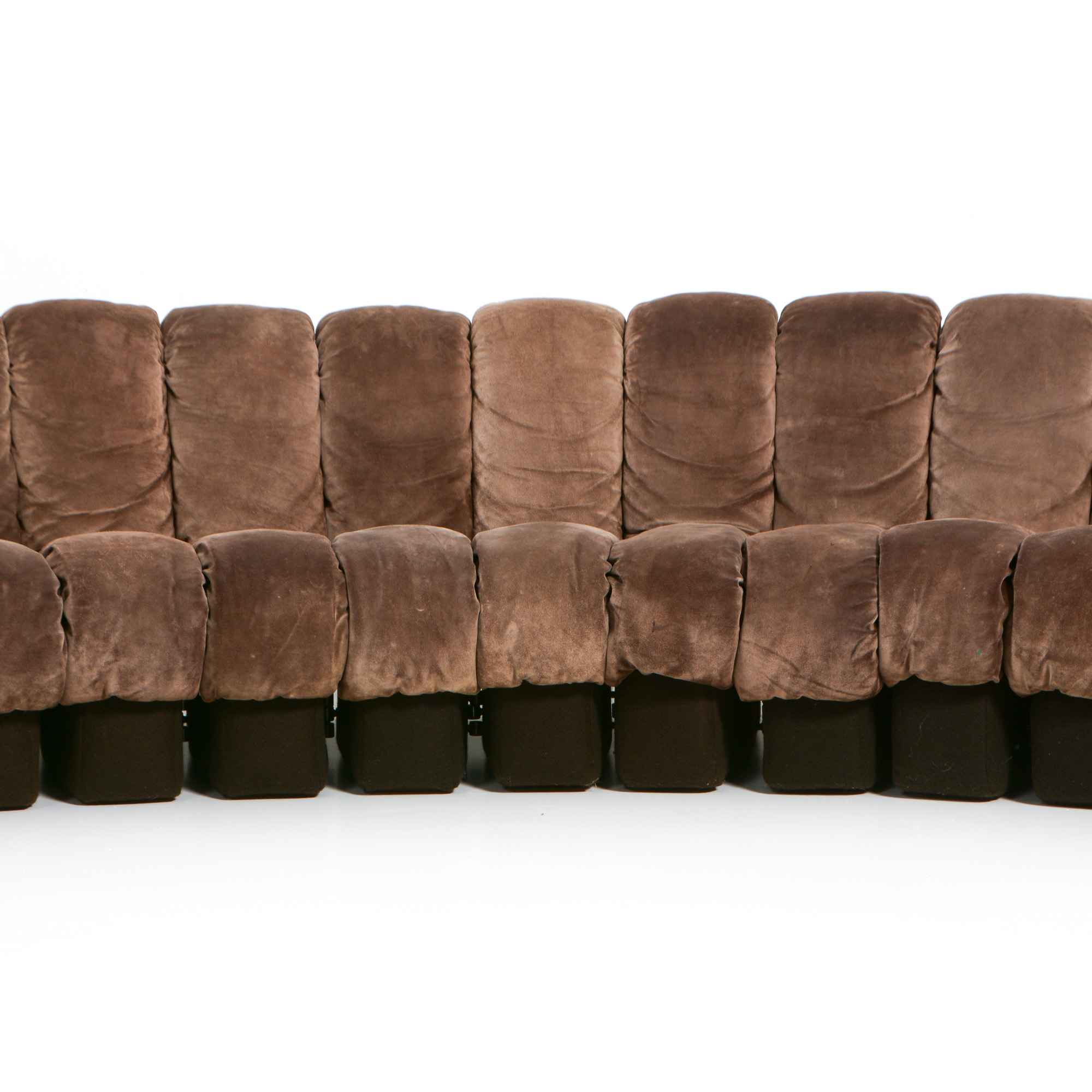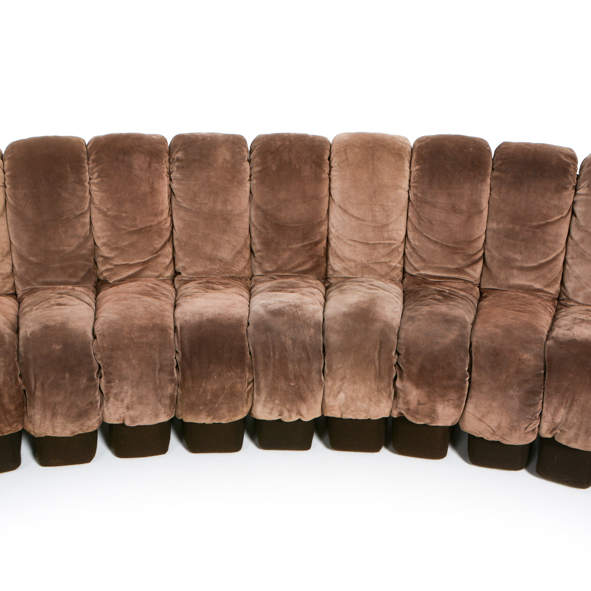 De Sede ‘Non Stop’ sectional sofa containing 21 seating pieces and two armrests in brown daim leather. Any number of pieces can be zipped together ensuring an endless shape suitable for every room and occasion. A design by Ueli bergere, Elenora Peduzzi-Riva, Heinz Ulrich and Klaus Vogt at De Sede, Switzerland.