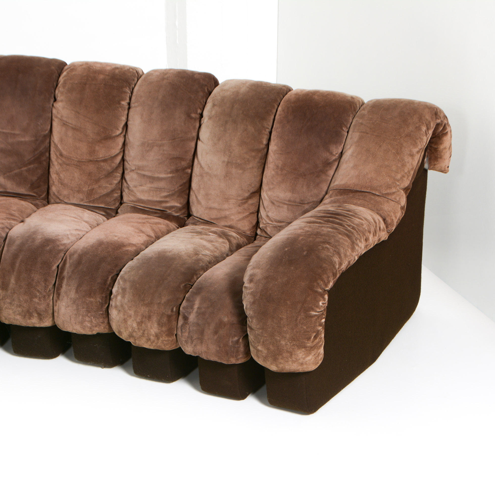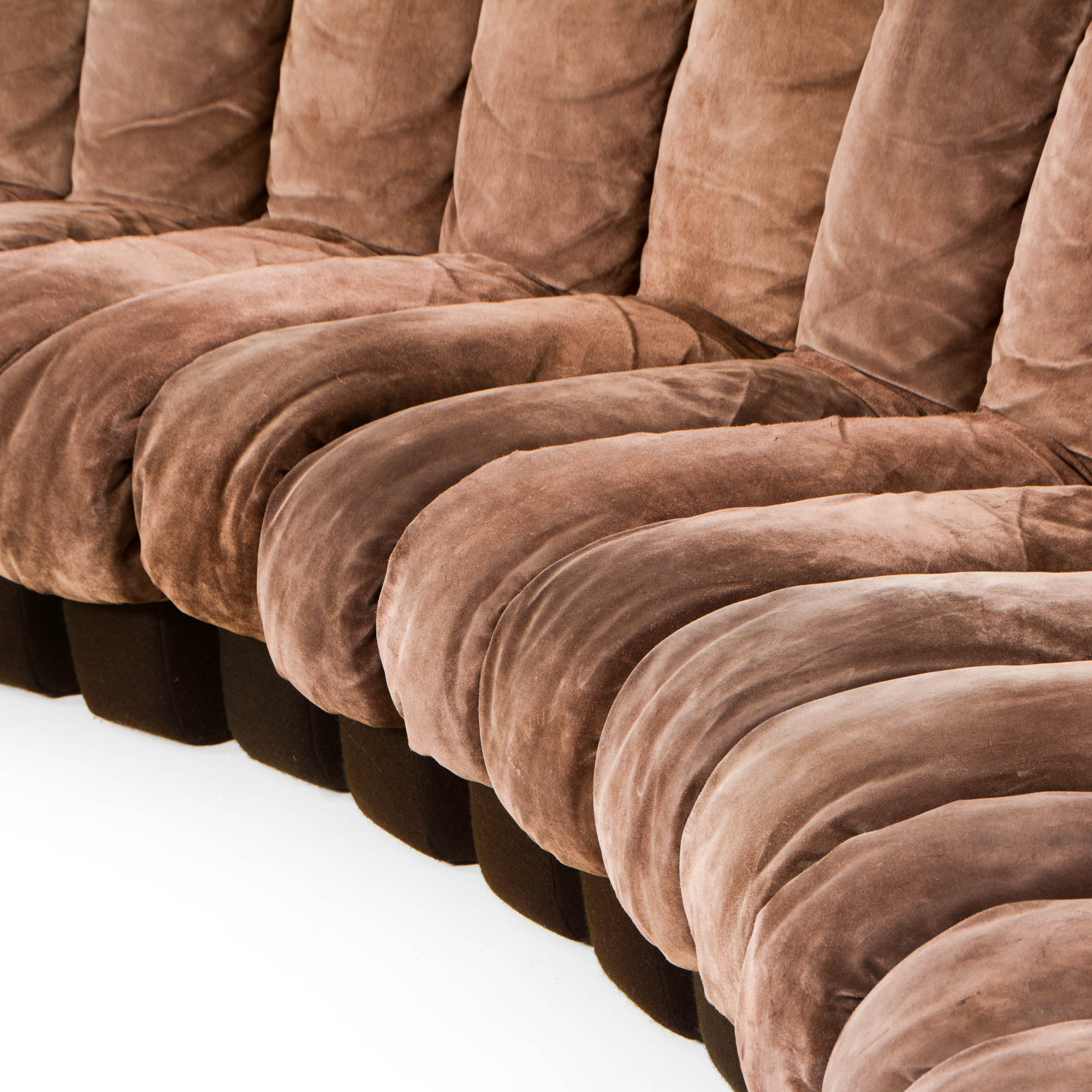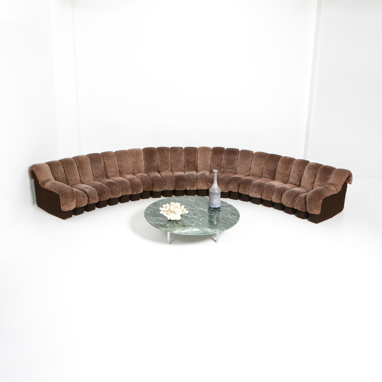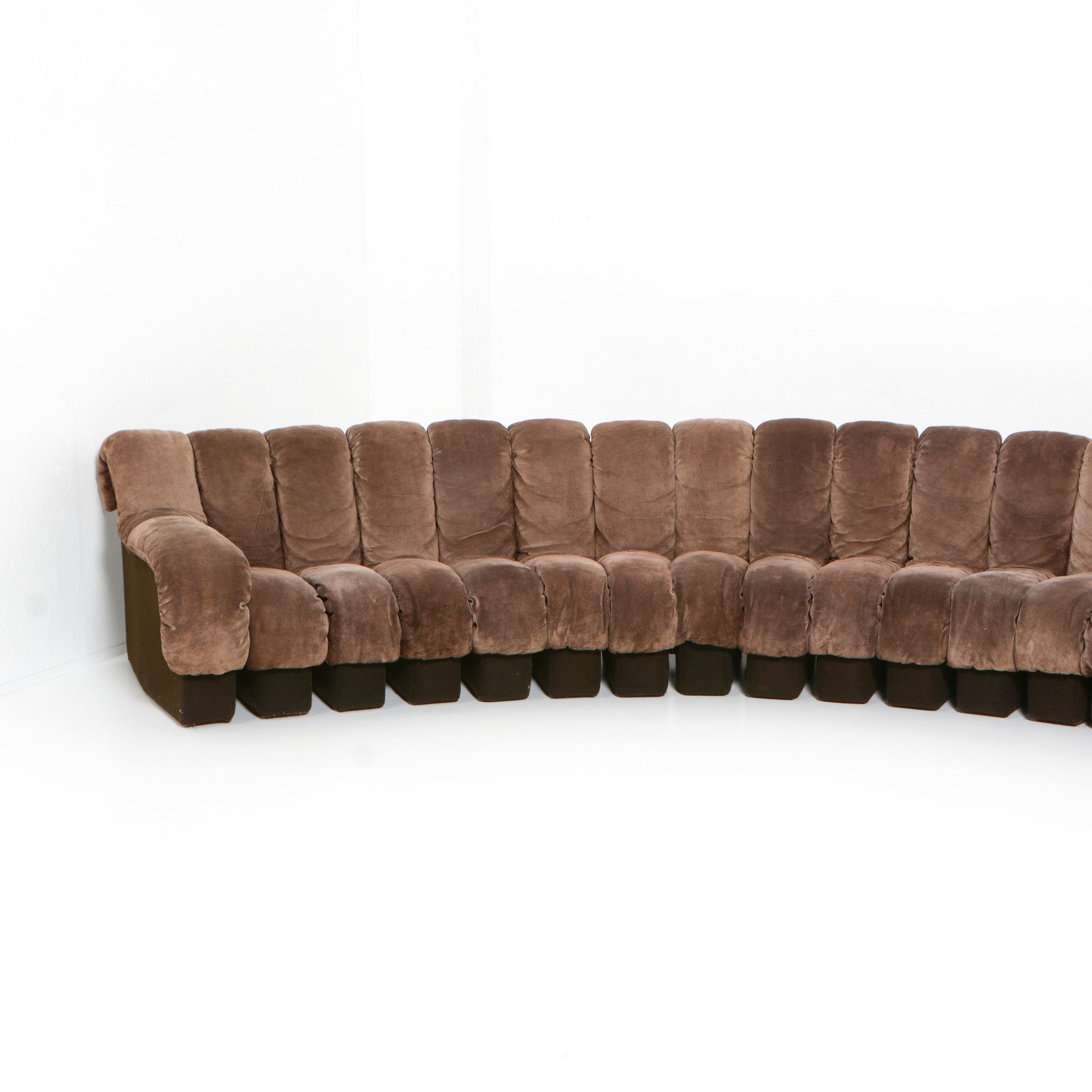 De Sede ‘Non Stop’ sectional sofa containing 21 seating pieces and two armrests in brown daim leather. Any number of pieces can be zipped together ensuring an endless shape suitable for every room and occasion. A design by Ueli bergere, Elenora Peduzzi-Riva, Heinz Ulrich and Klaus Vogt at De Sede, Switzerland.