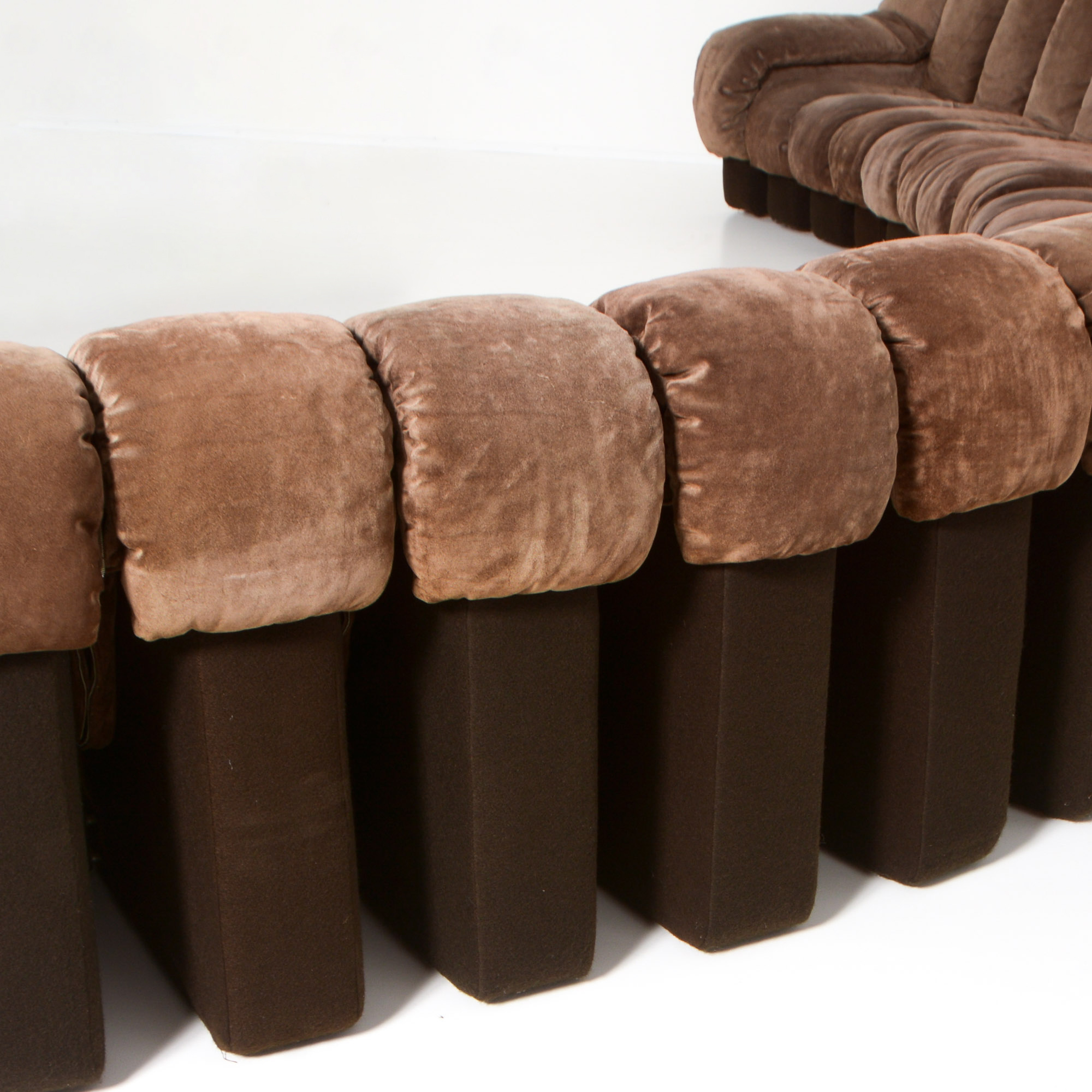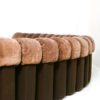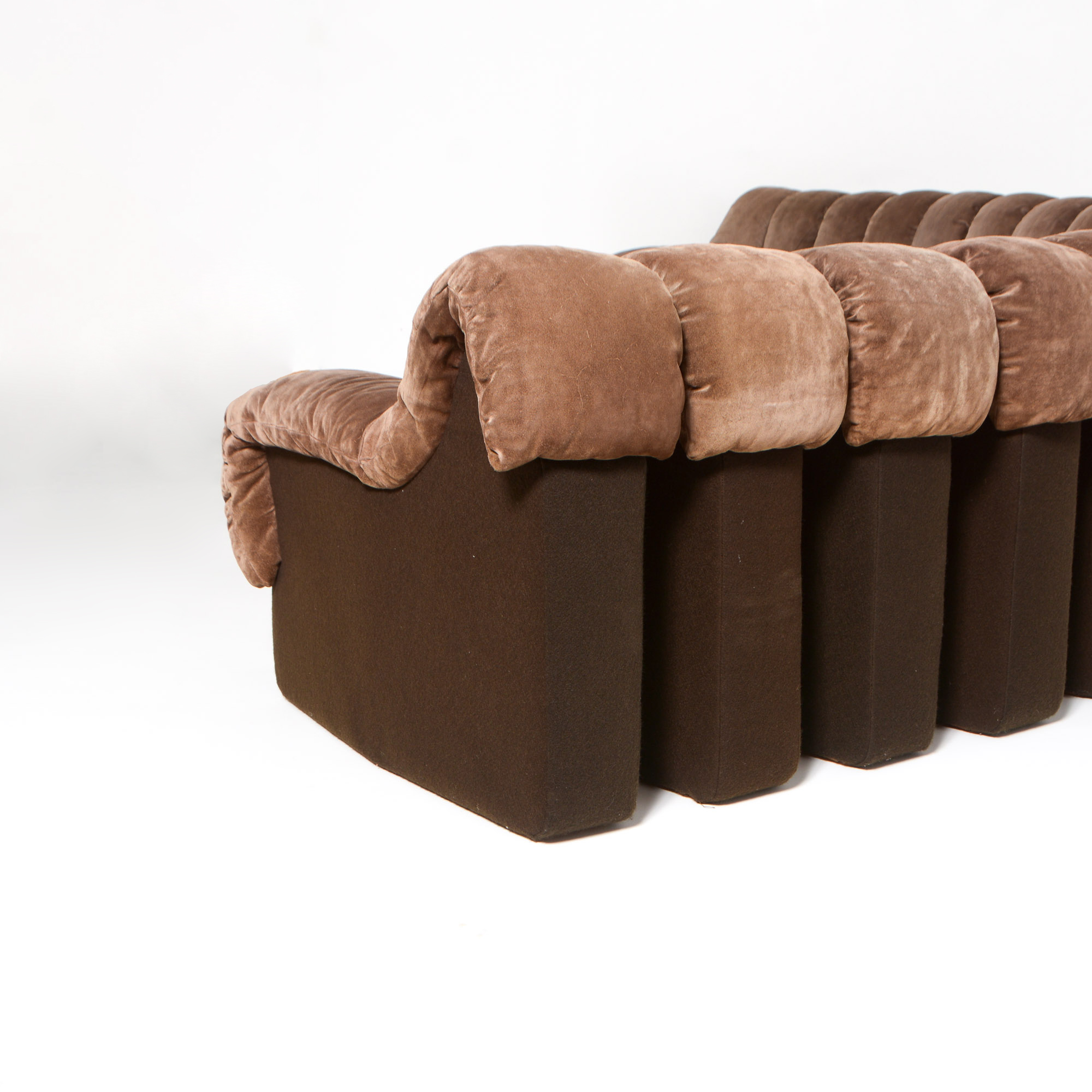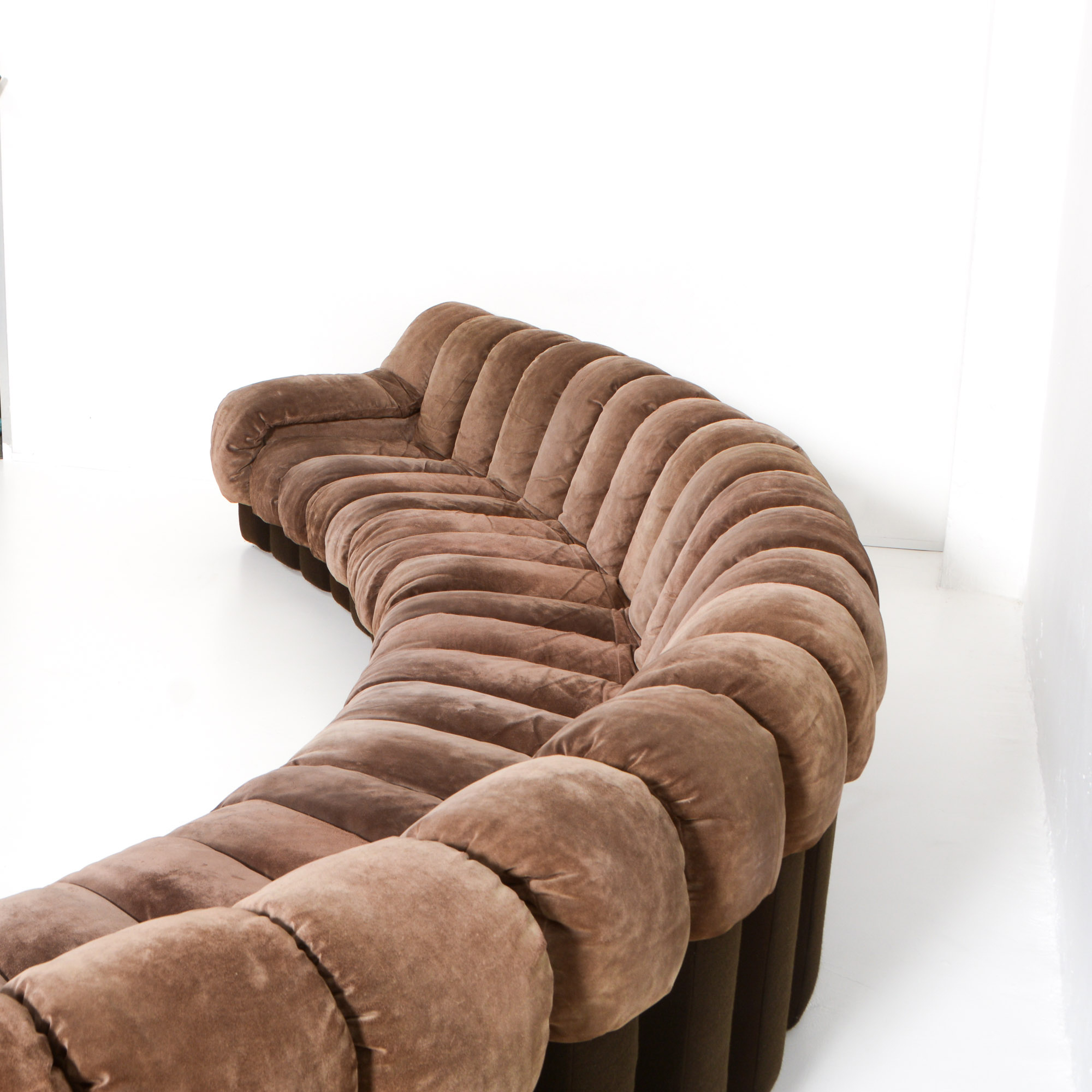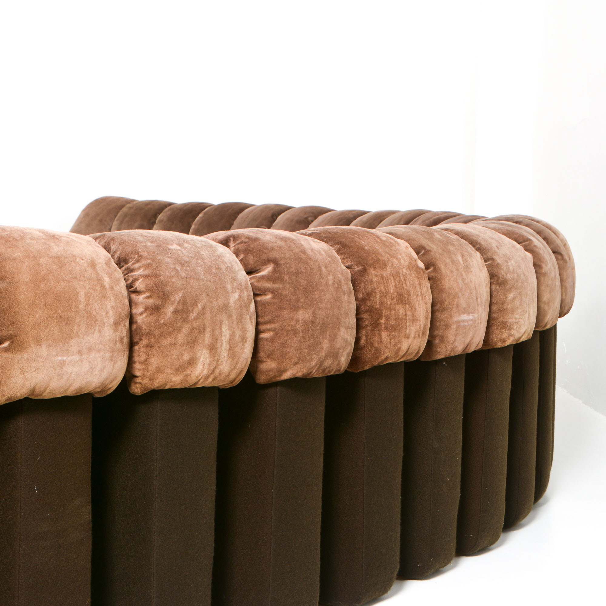 De Sede ‘Non Stop’ sectional sofa containing 21 seating pieces and two armrests in brown daim leather. Any number of pieces can be zipped together ensuring an endless shape suitable for every room and occasion. A design by Ueli bergere, Elenora Peduzzi-Riva, Heinz Ulrich and Klaus Vogt at De Sede, Switzerland.