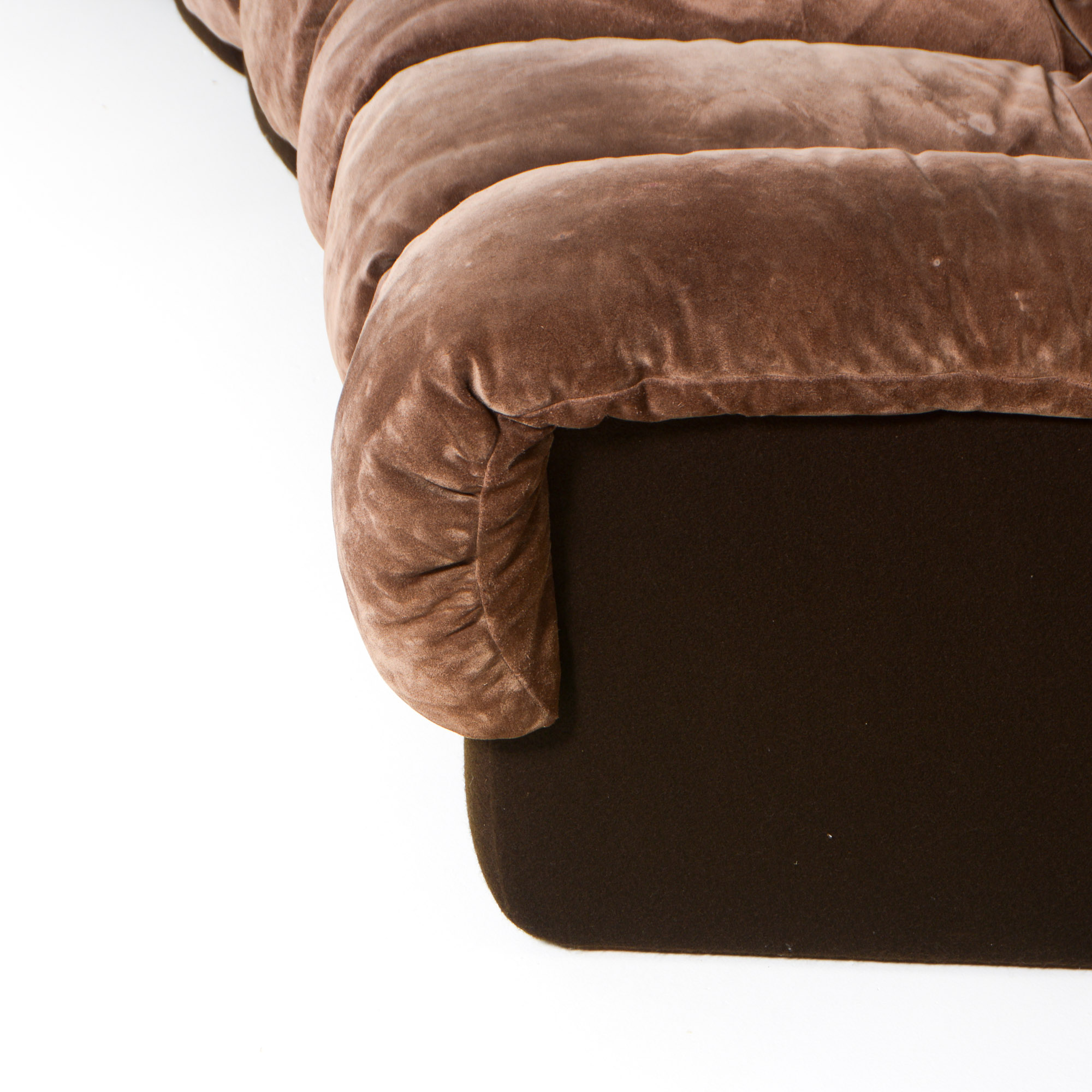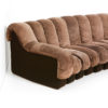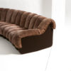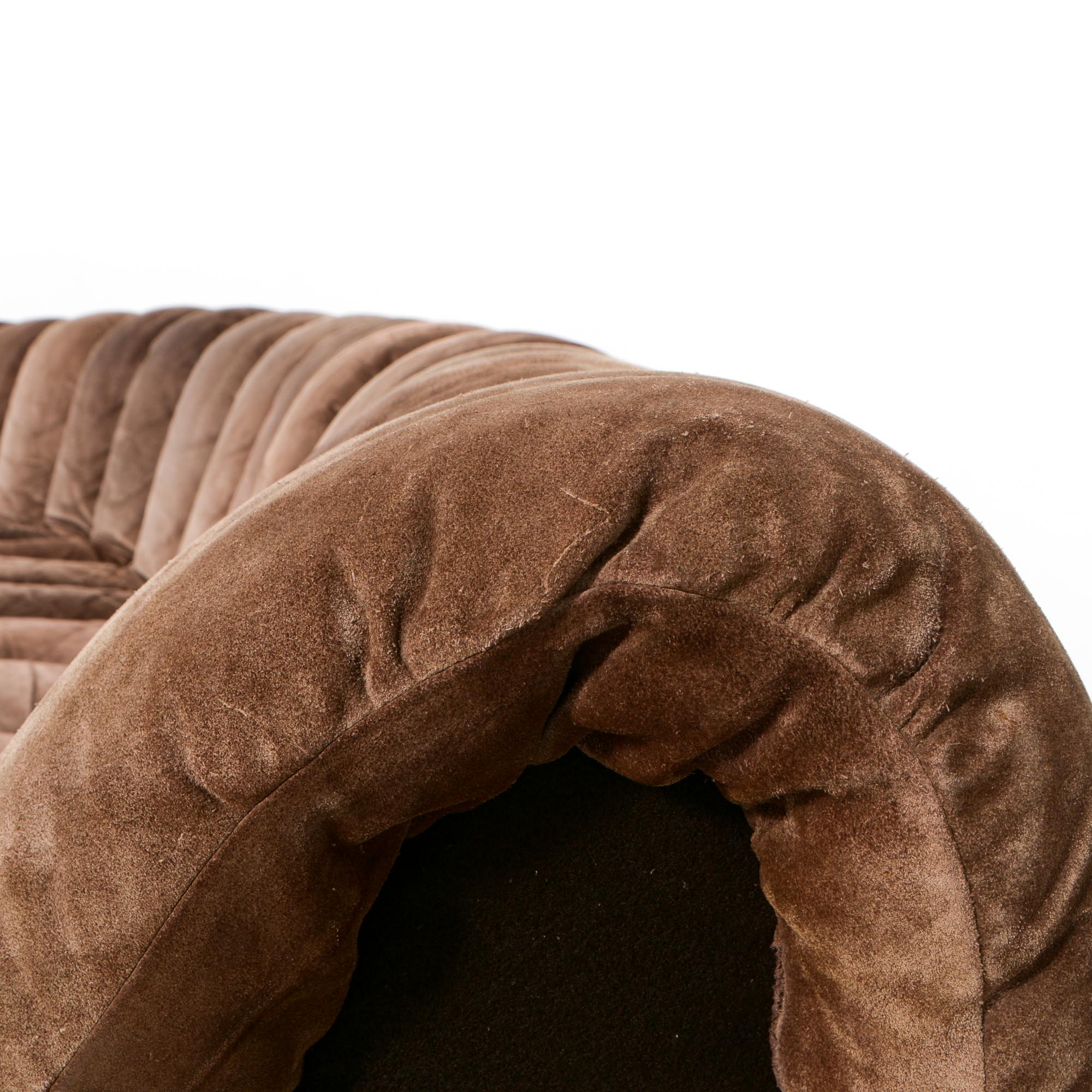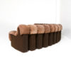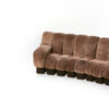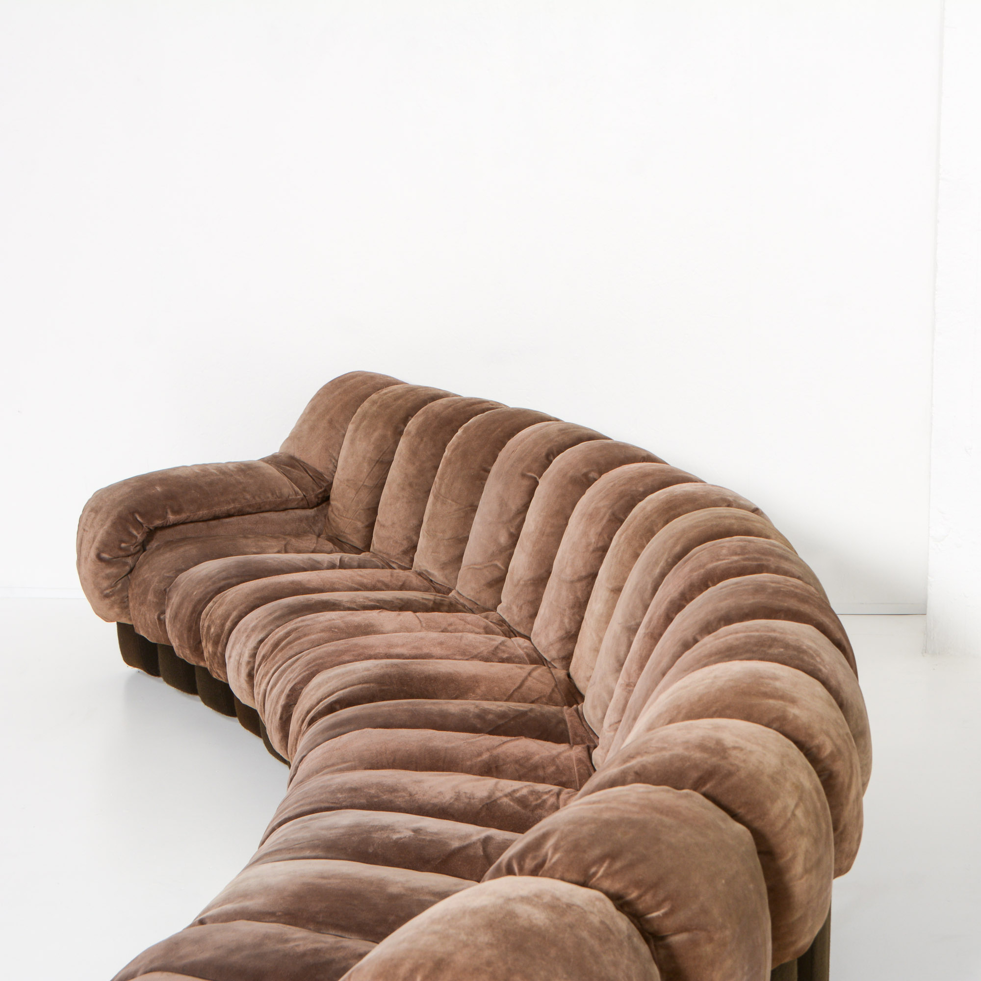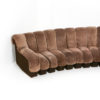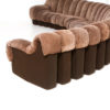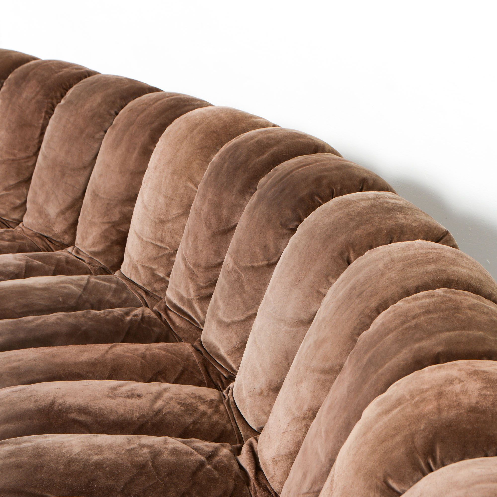 De Sede ‘Non Stop’ sectional sofa containing 21 seating pieces and two armrests in brown daim leather. Any number of pieces can be zipped together ensuring an endless shape suitable for every room and occasion. A design by Ueli bergere, Elenora Peduzzi-Riva, Heinz Ulrich and Klaus Vogt at De Sede, Switzerland.