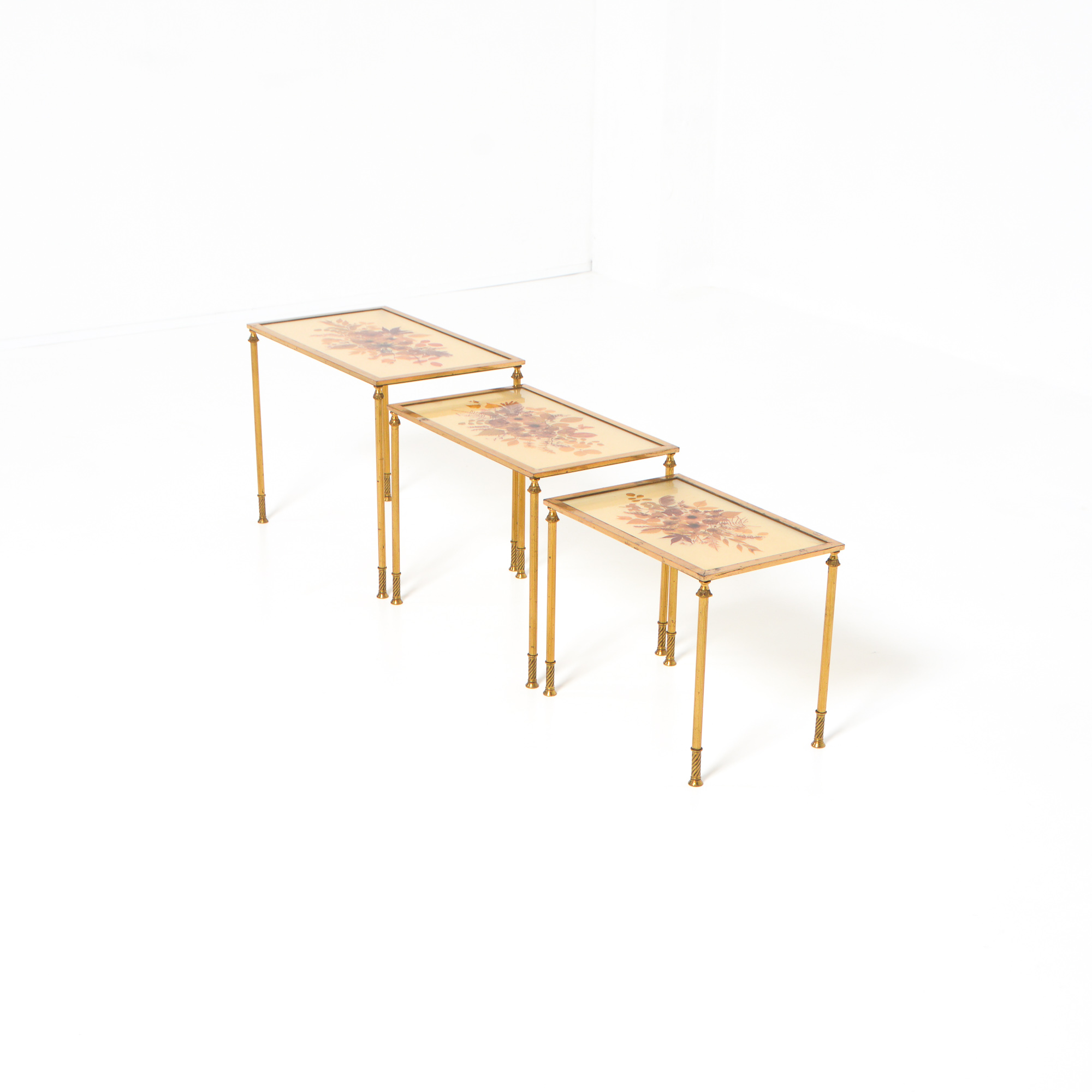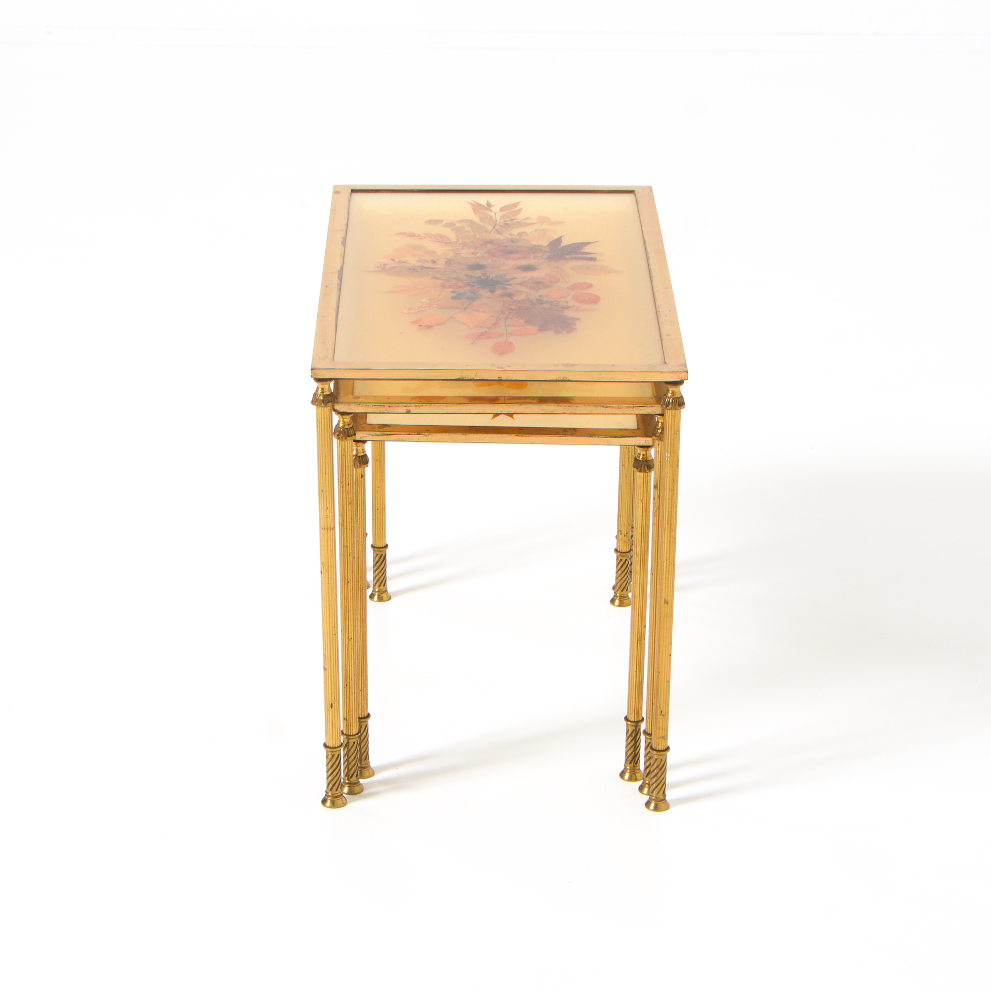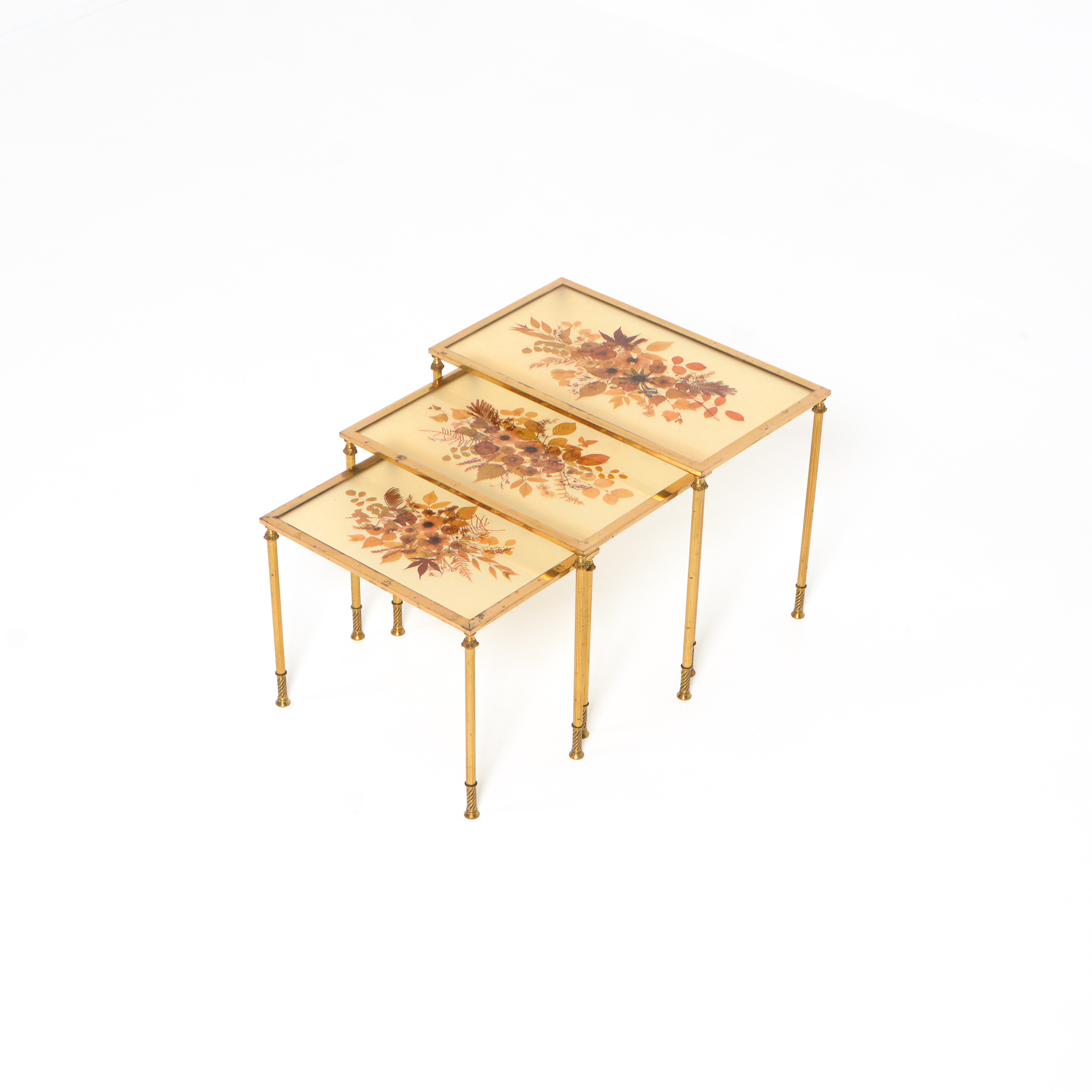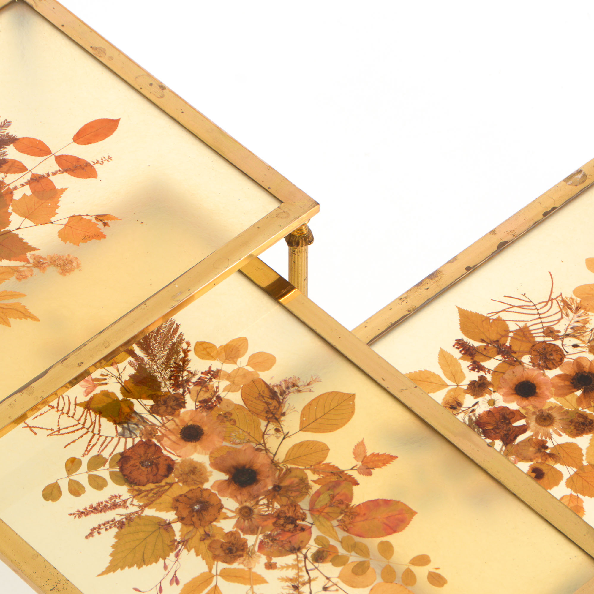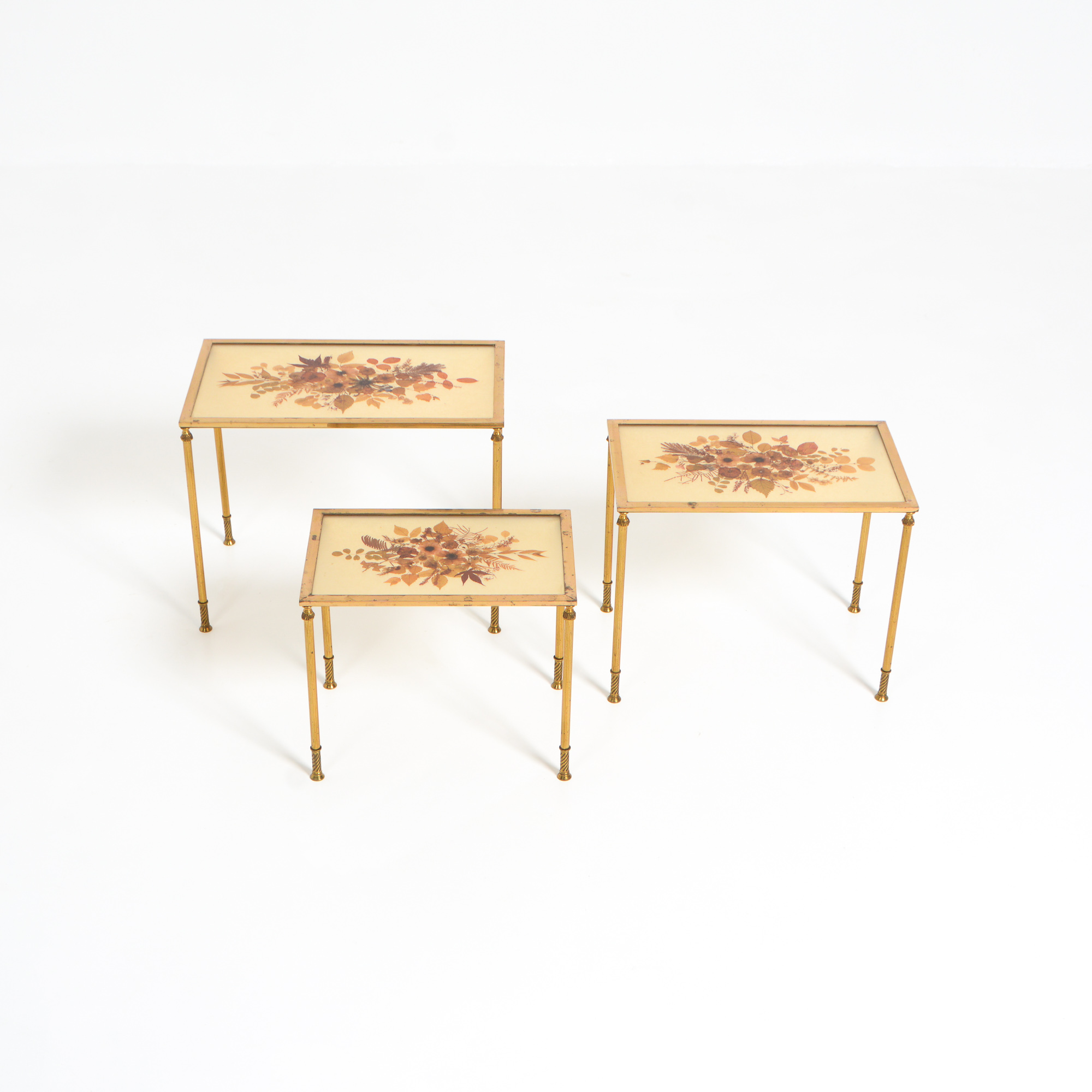 This decorative set of 3 brass nesting tables can be dated in the 1960s. The resin table tops are filled with dried flowers in a creative pattern.