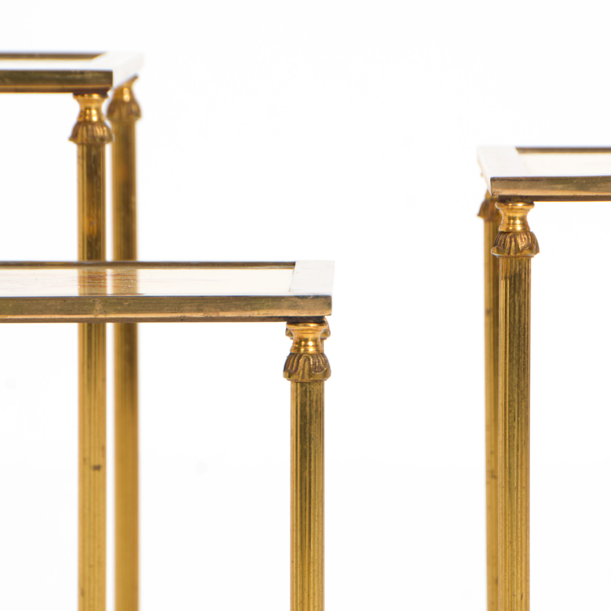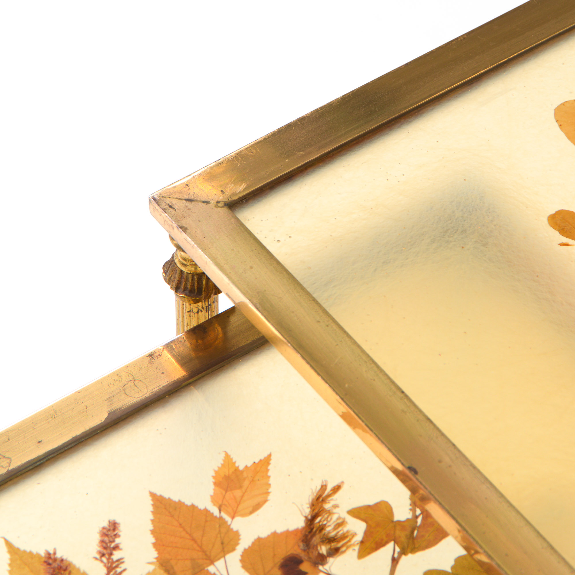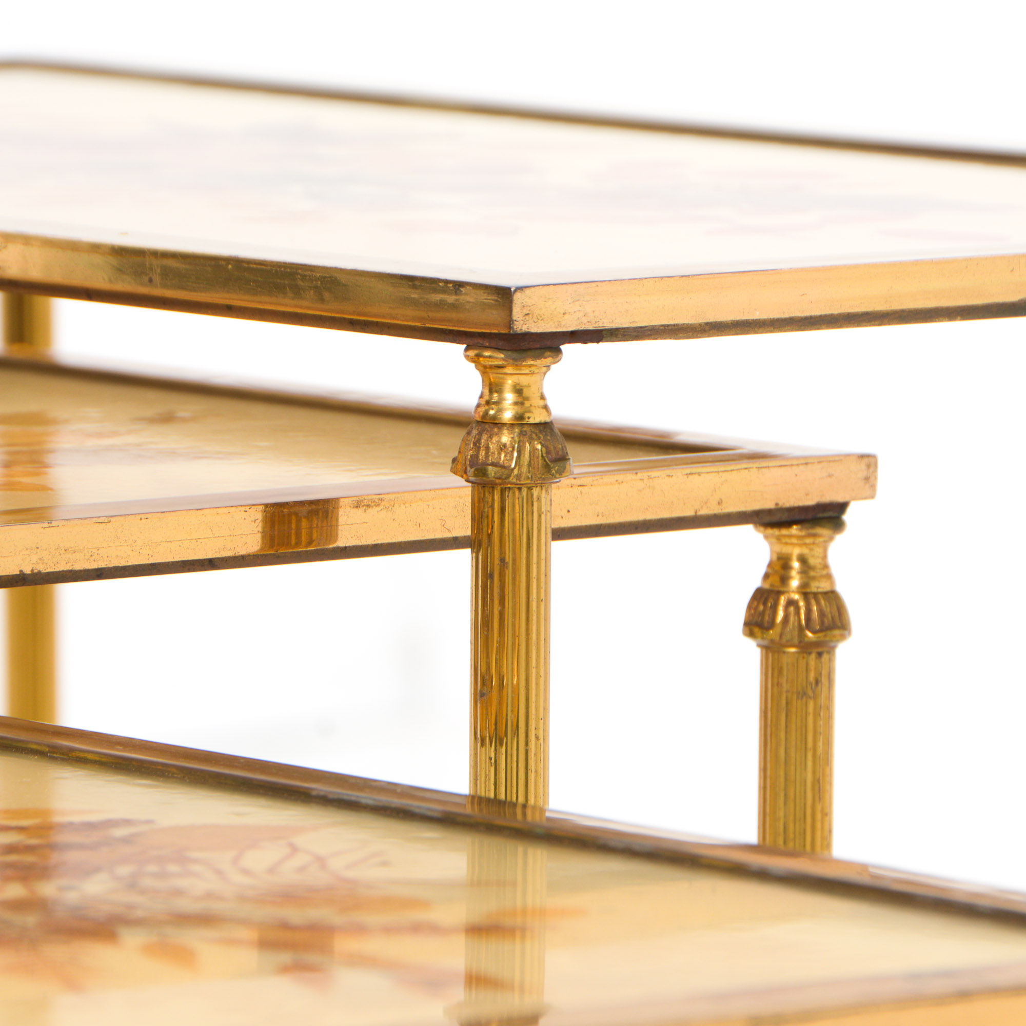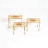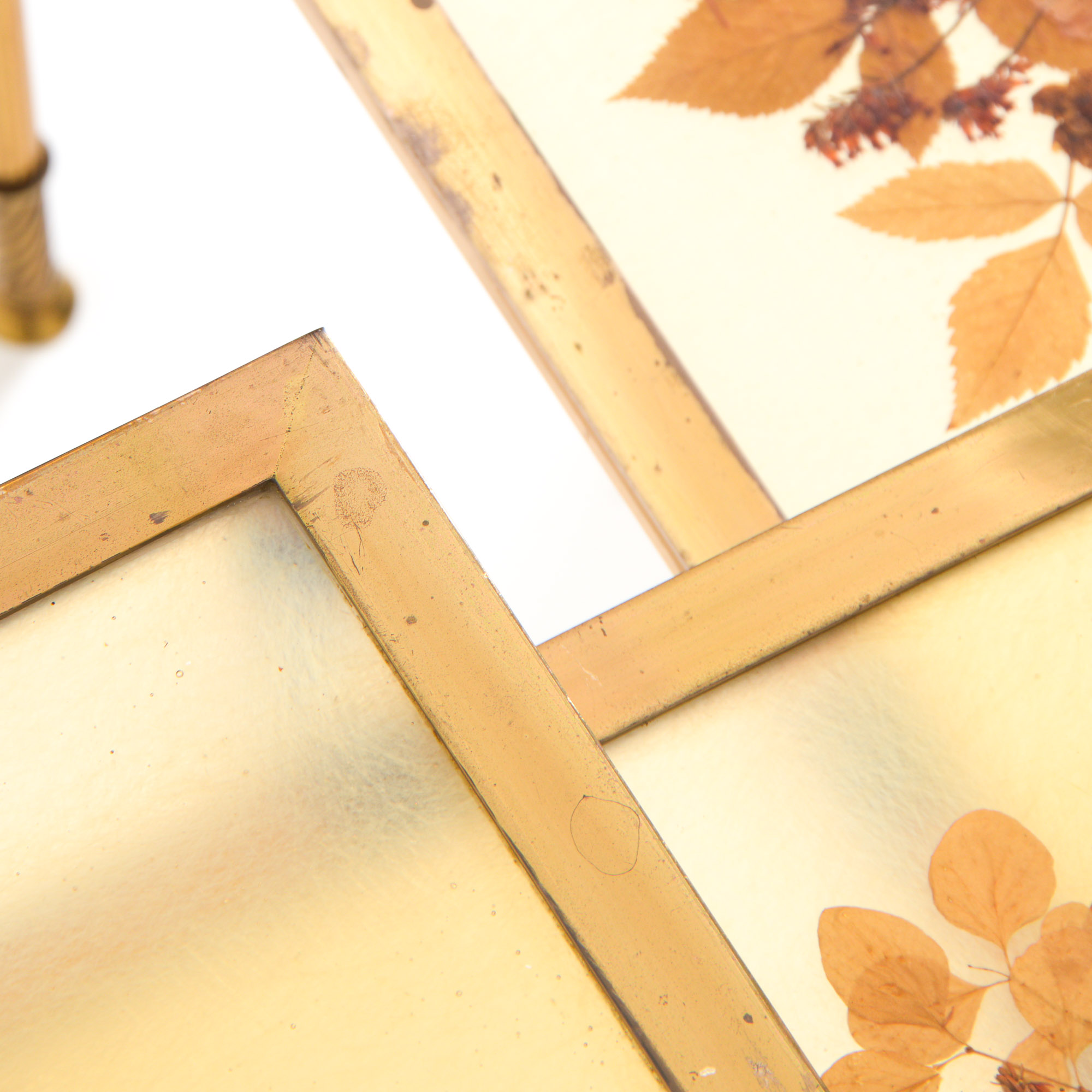 This decorative set of 3 brass nesting tables can be dated in the 1960s. The resin table tops are filled with dried flowers in a creative pattern.