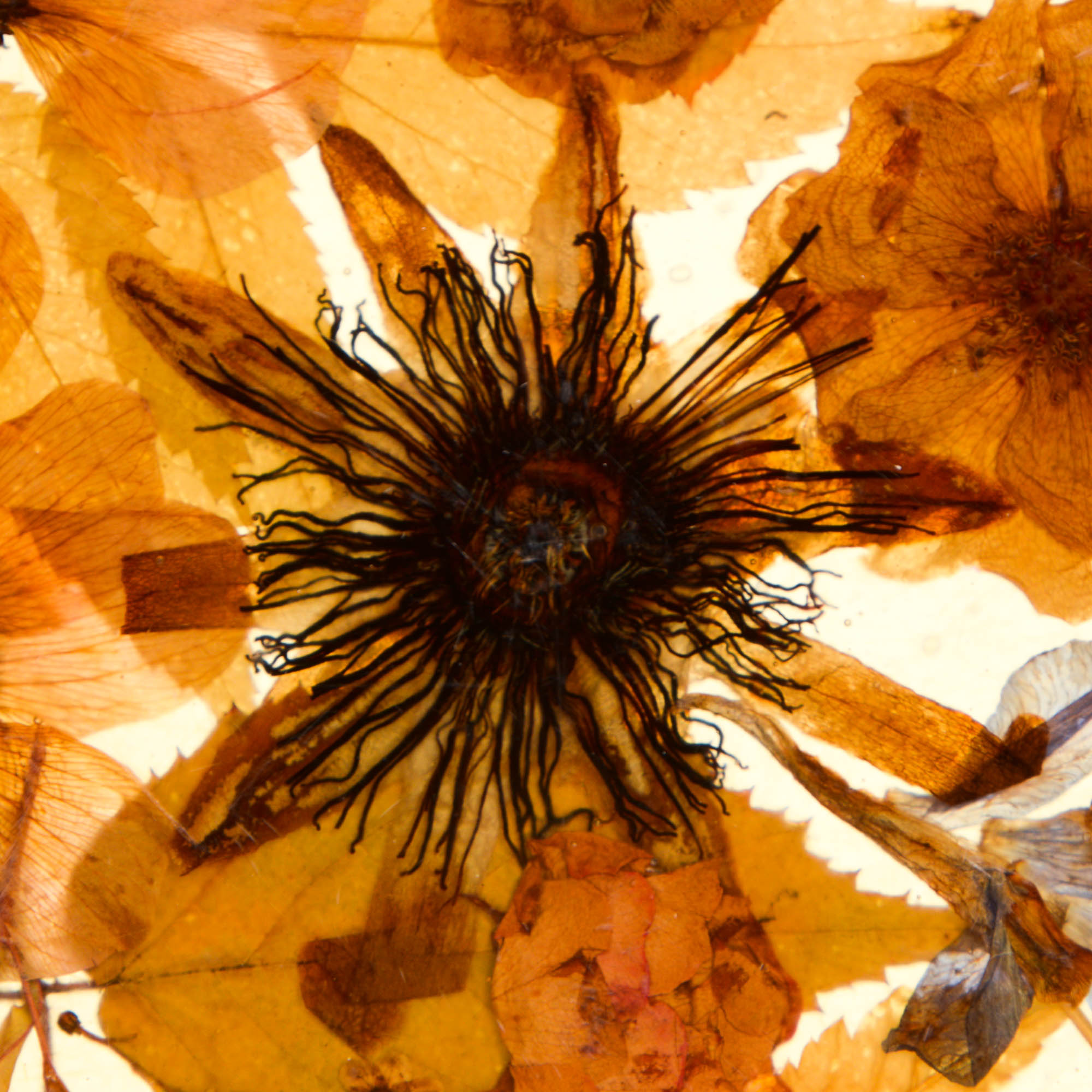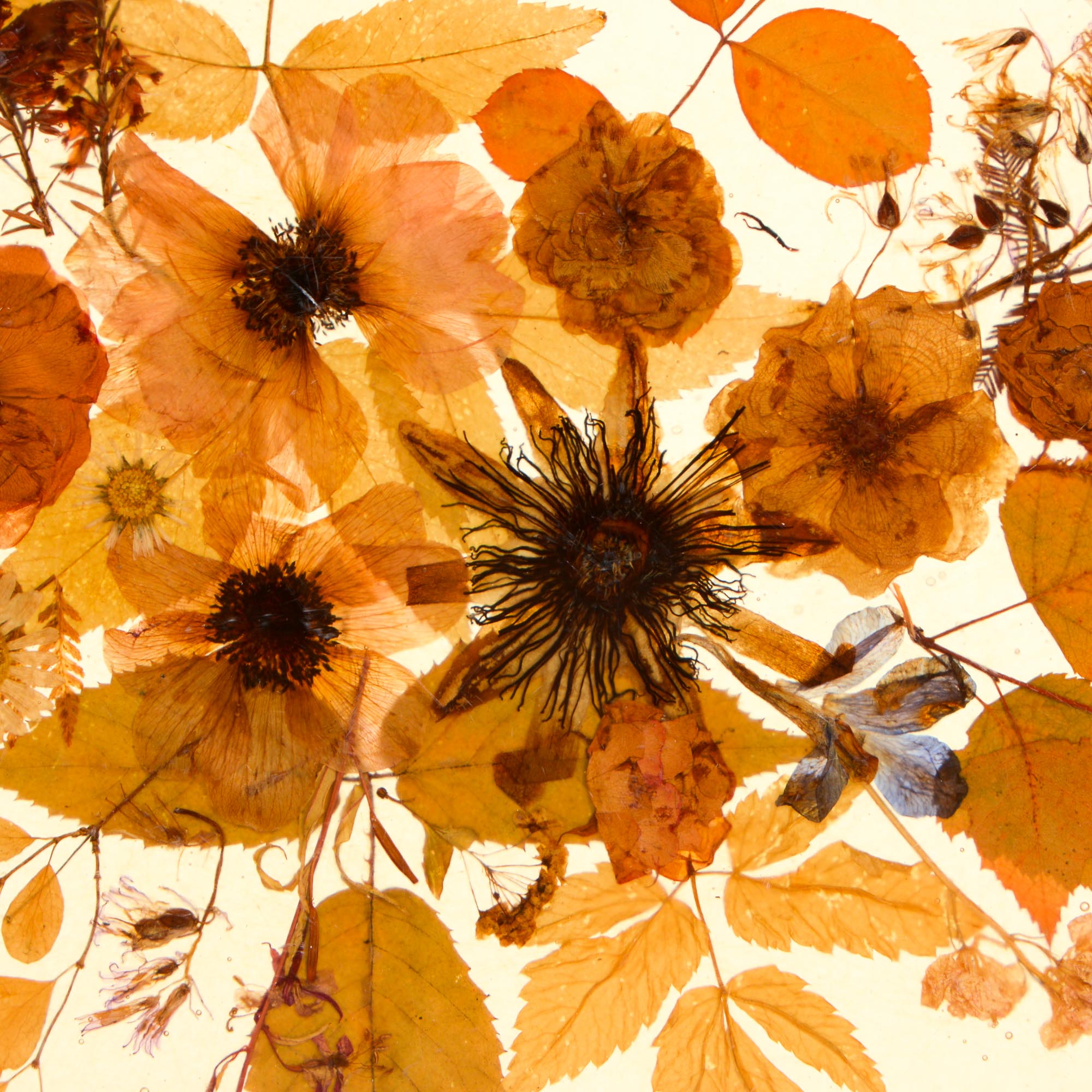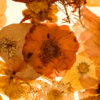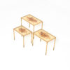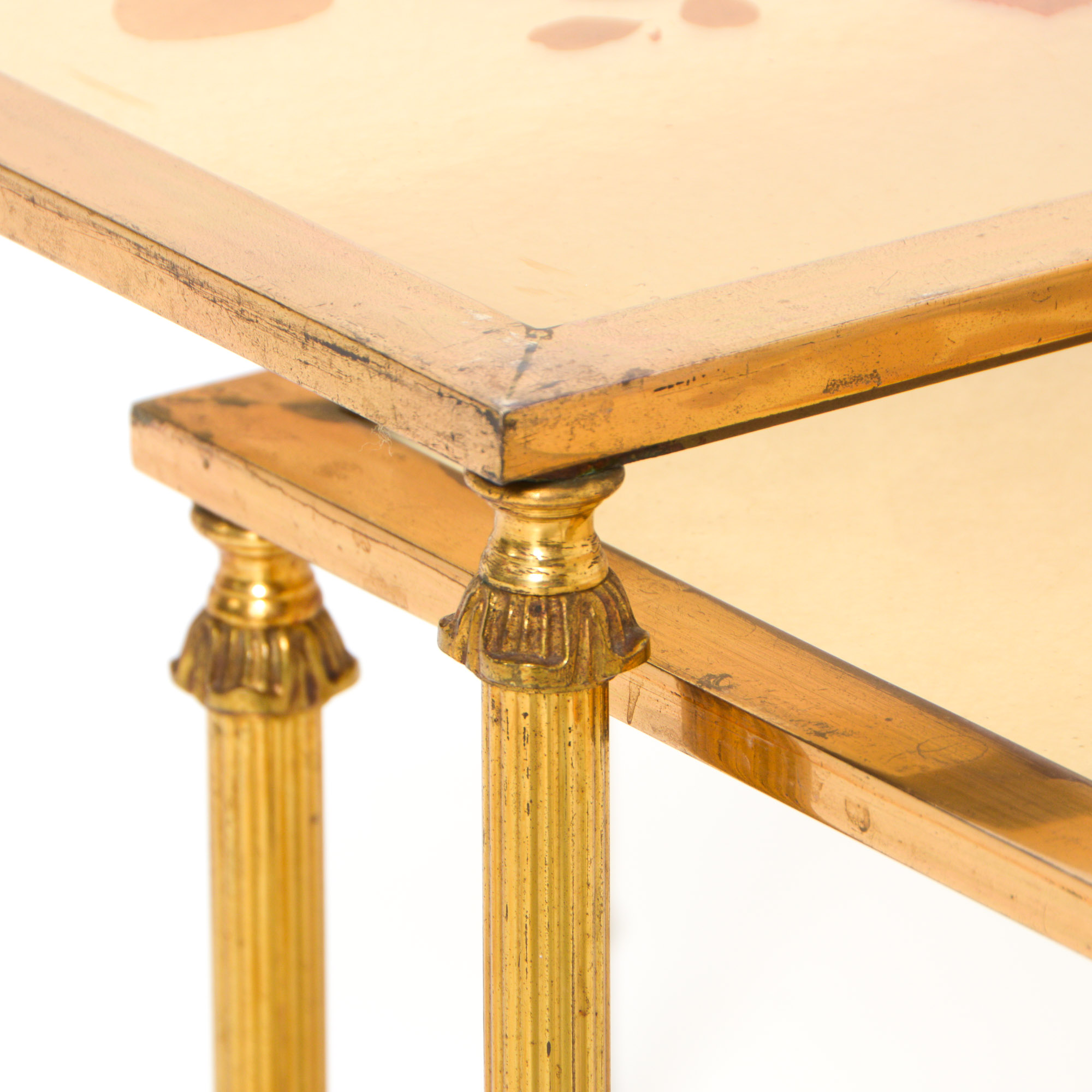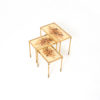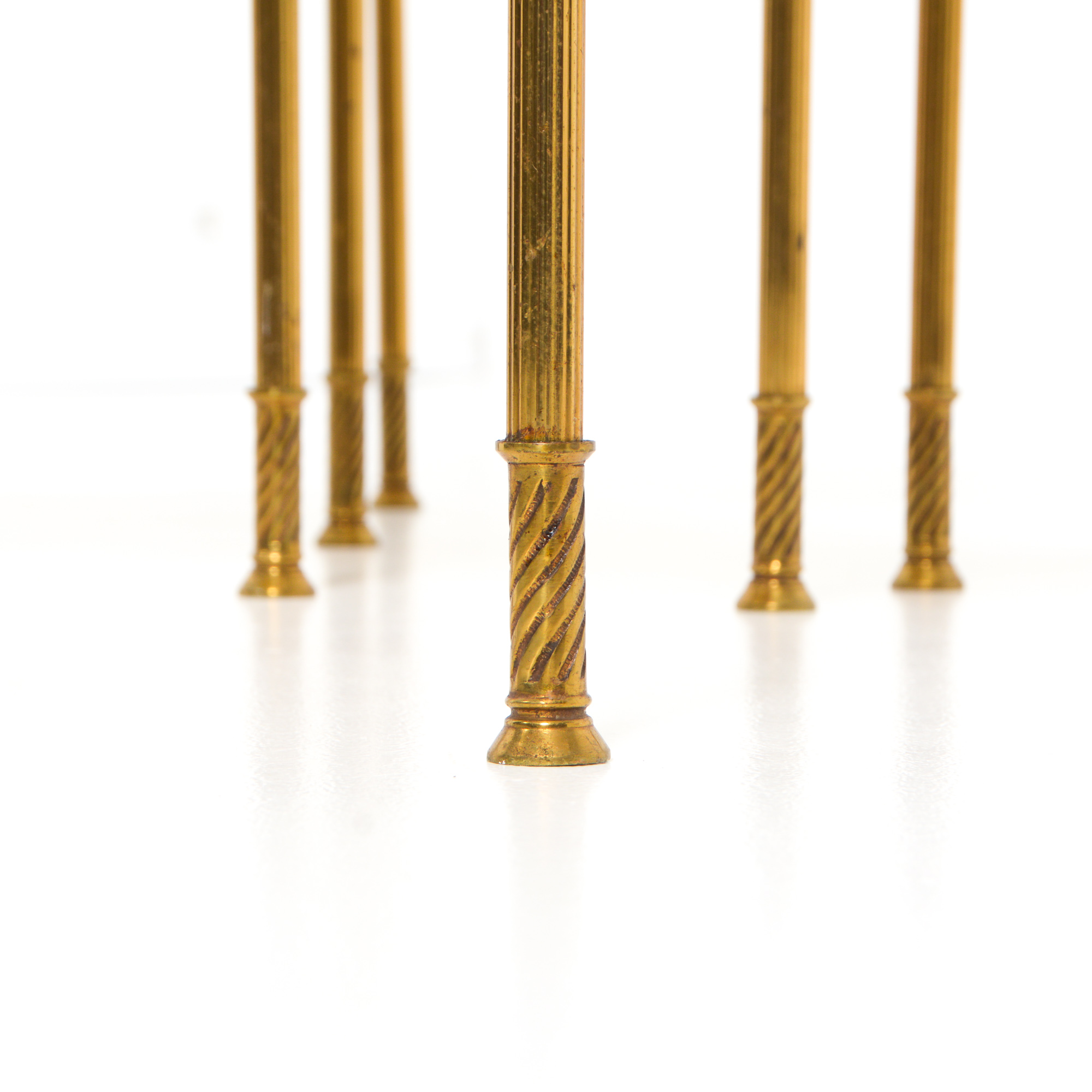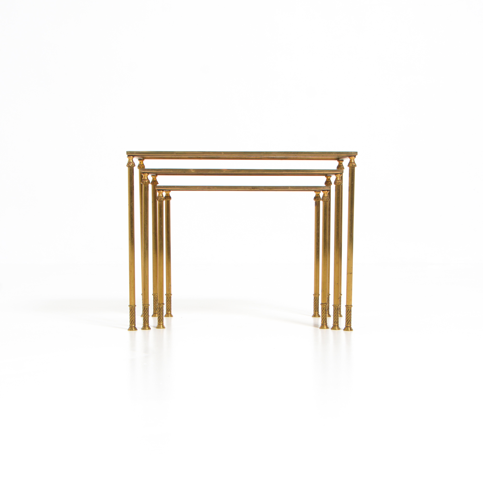 This decorative set of 3 brass nesting tables can be dated in the 1960s. The resin table tops are filled with dried flowers in a creative pattern.