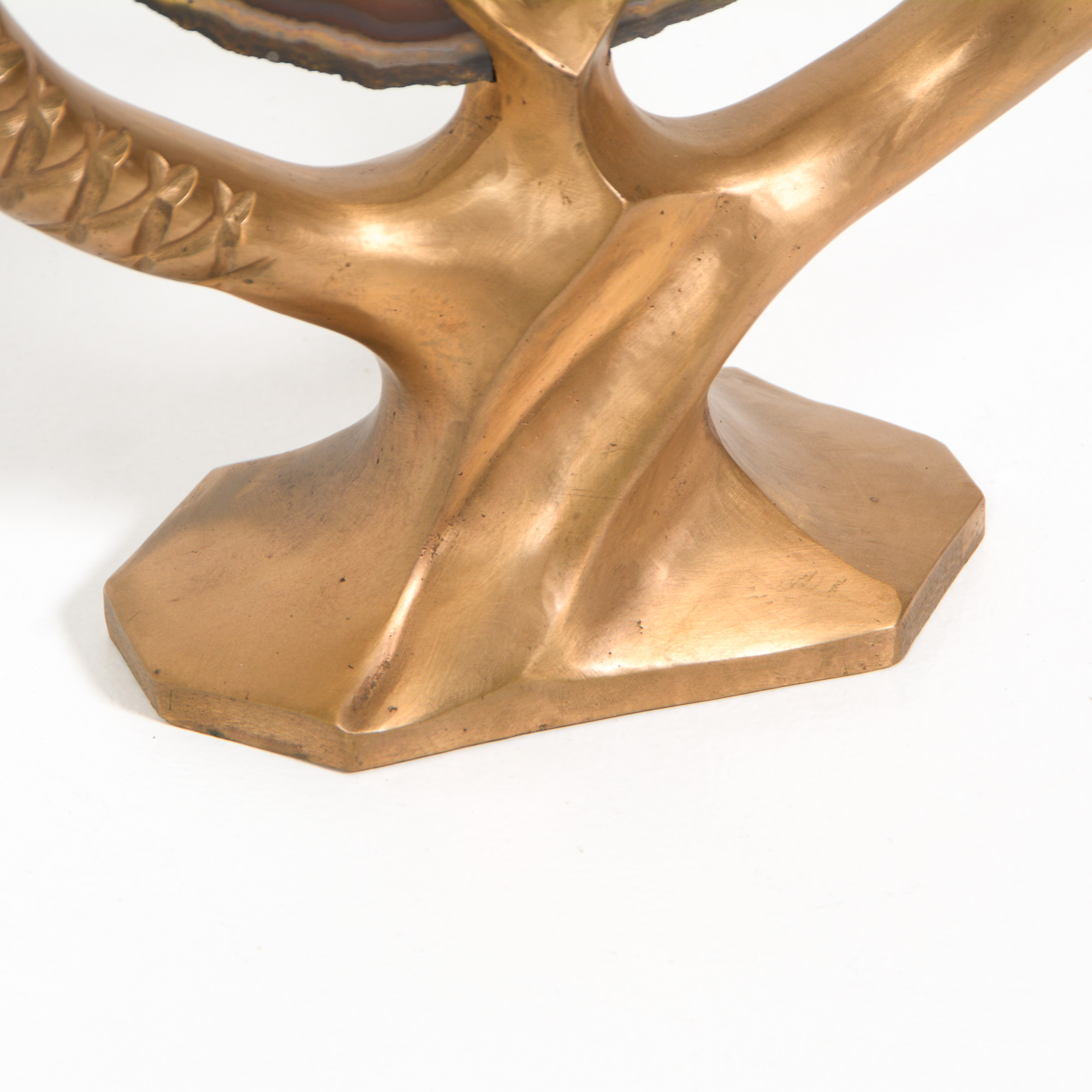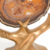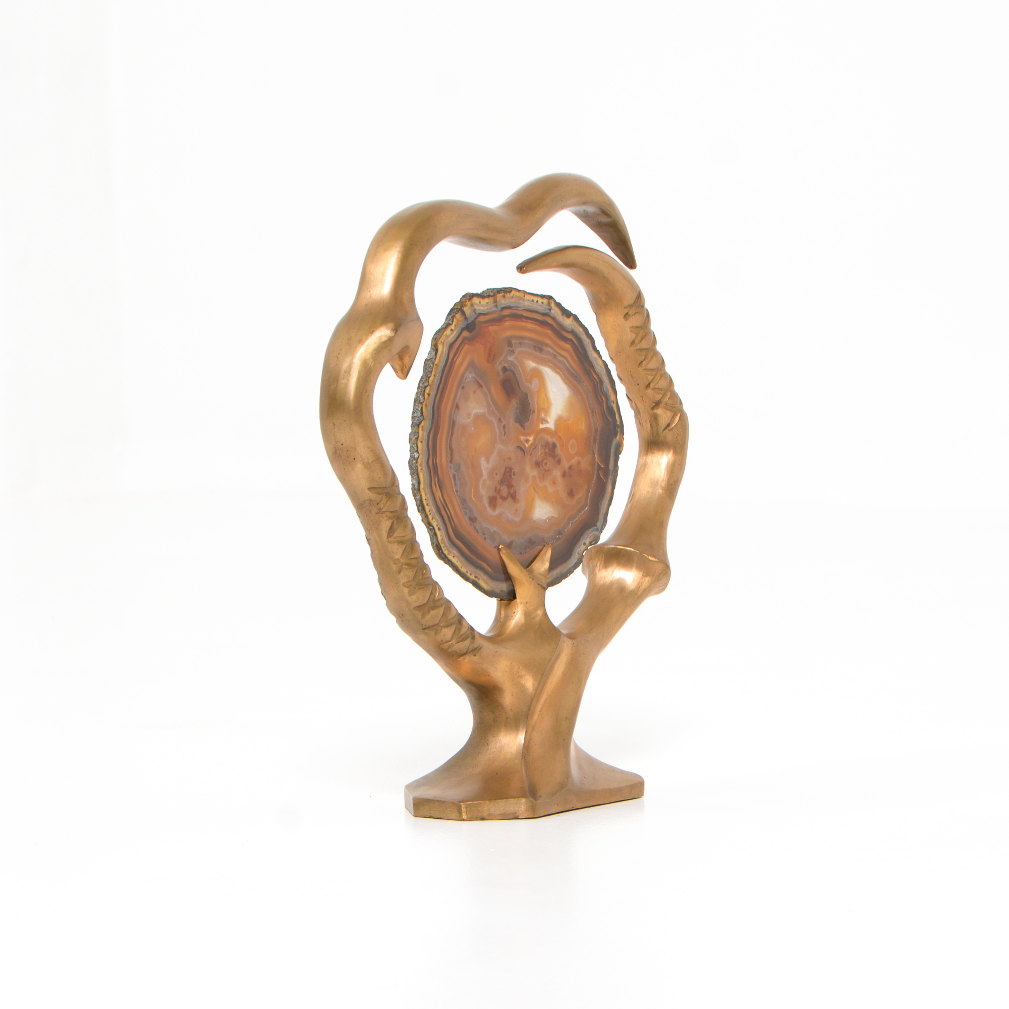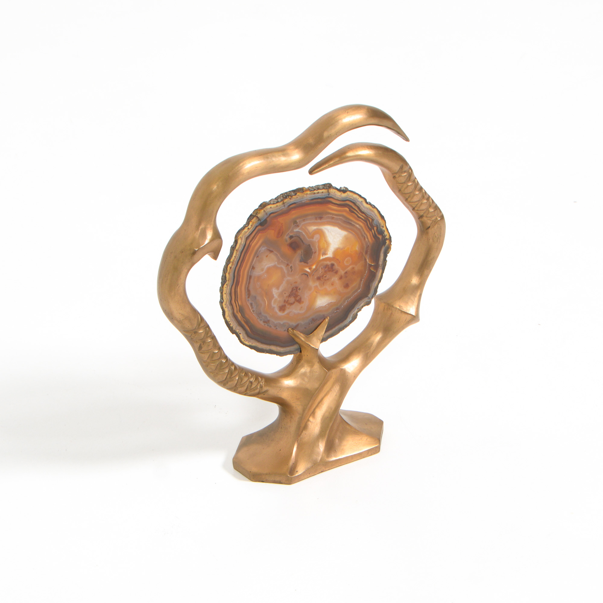 The bronze organic shaped sculpture holds the beautiful agate stone slice.