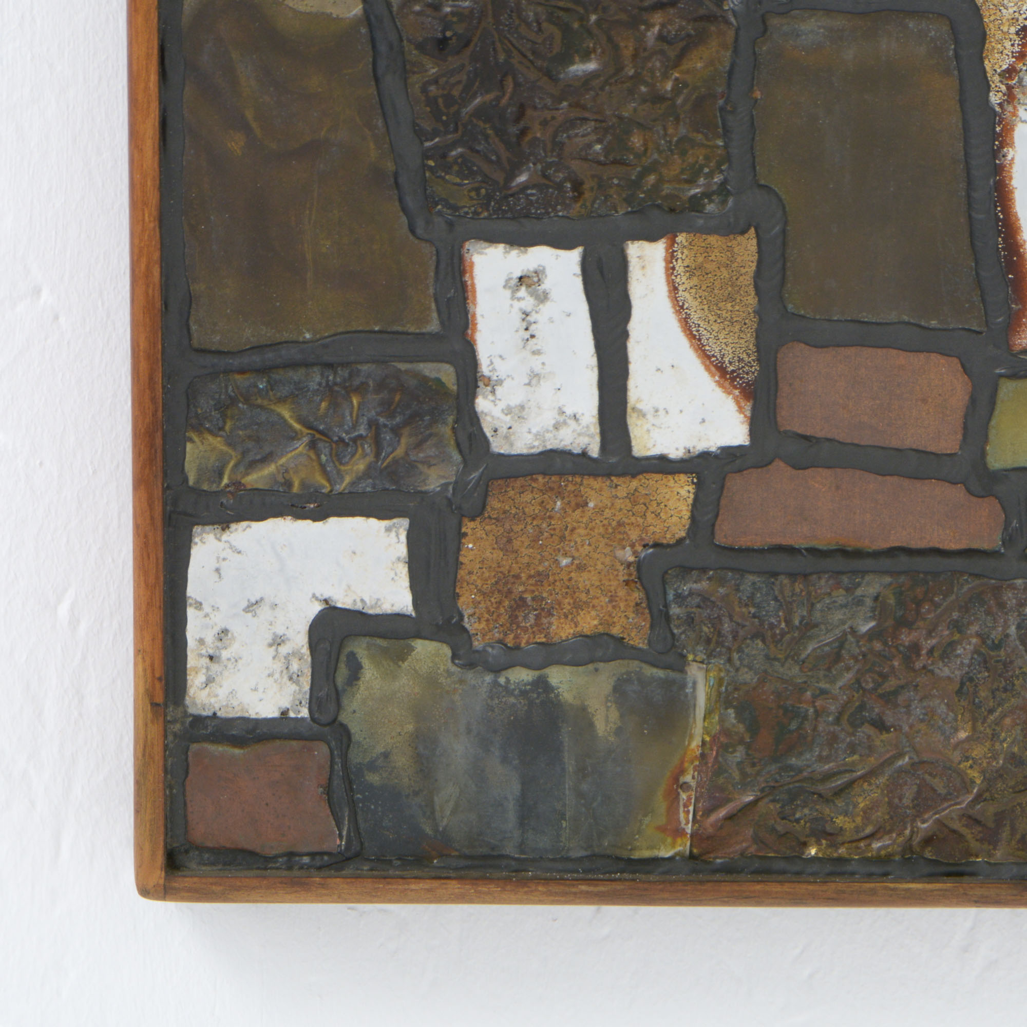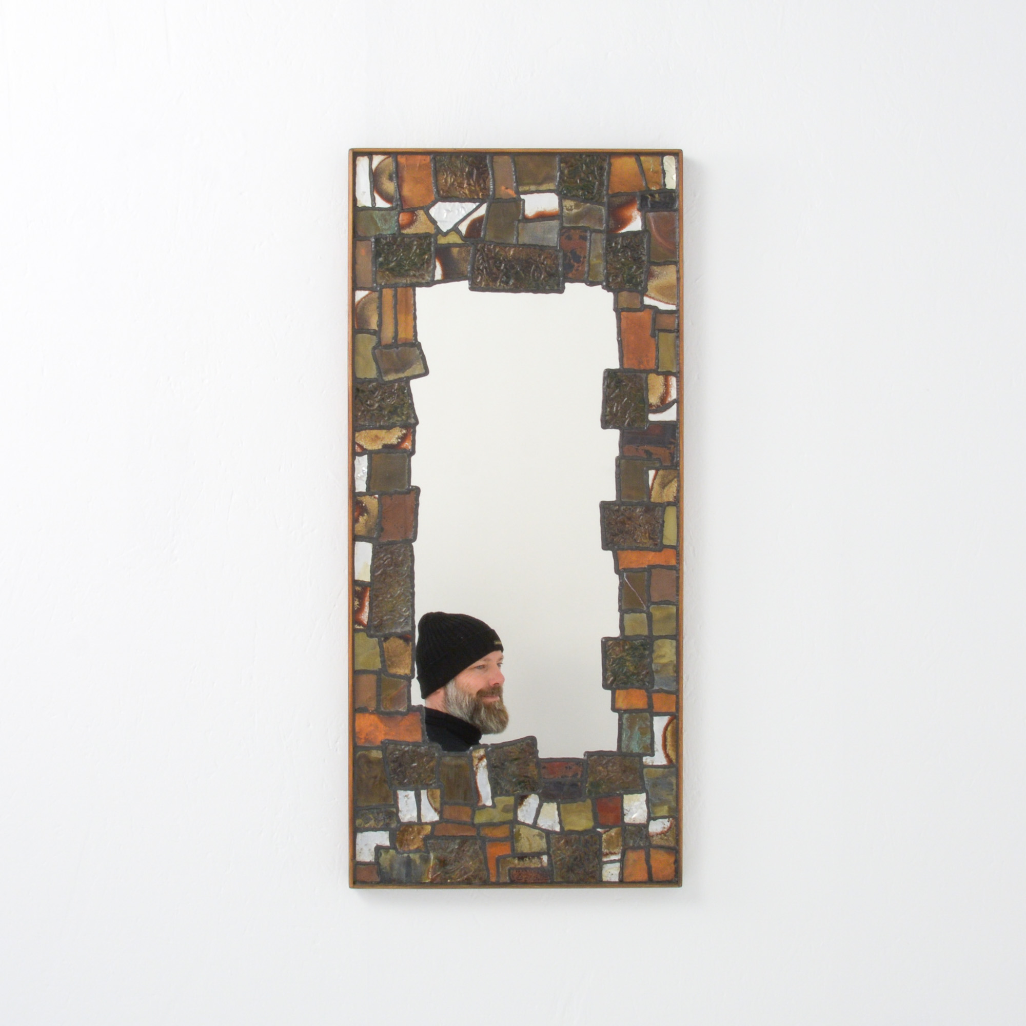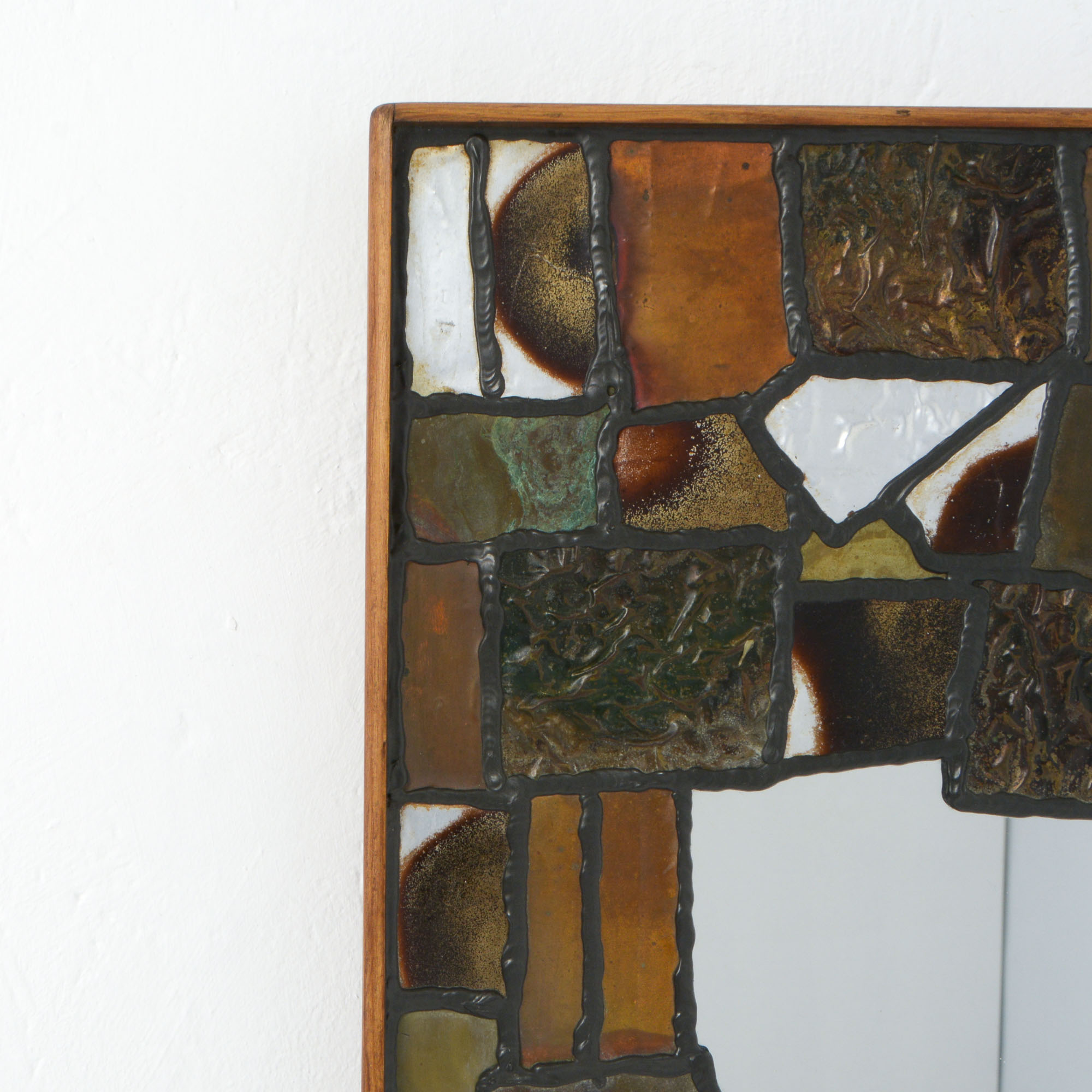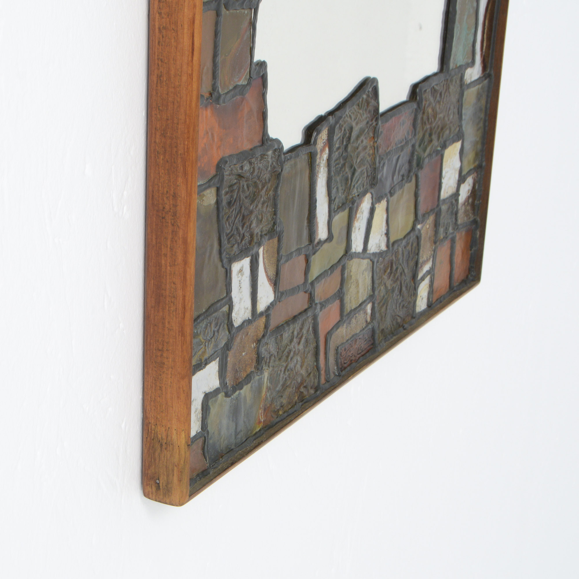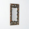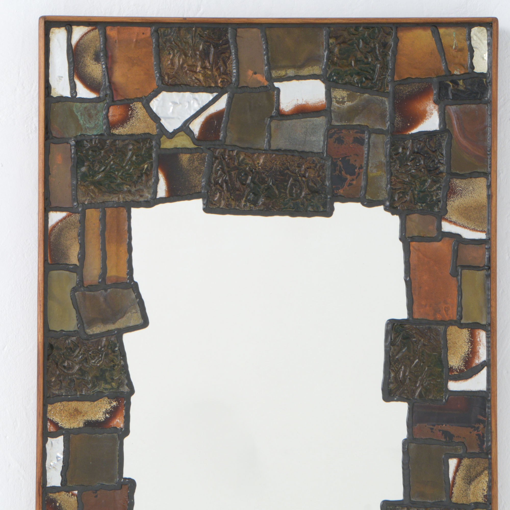 This mirror is an expressive design with patchwork of different types of metal. All the pieces of metal are held together with lead strips such as stained glass.