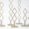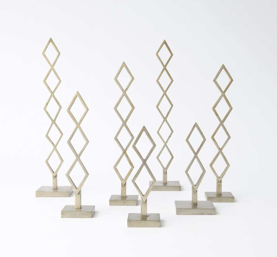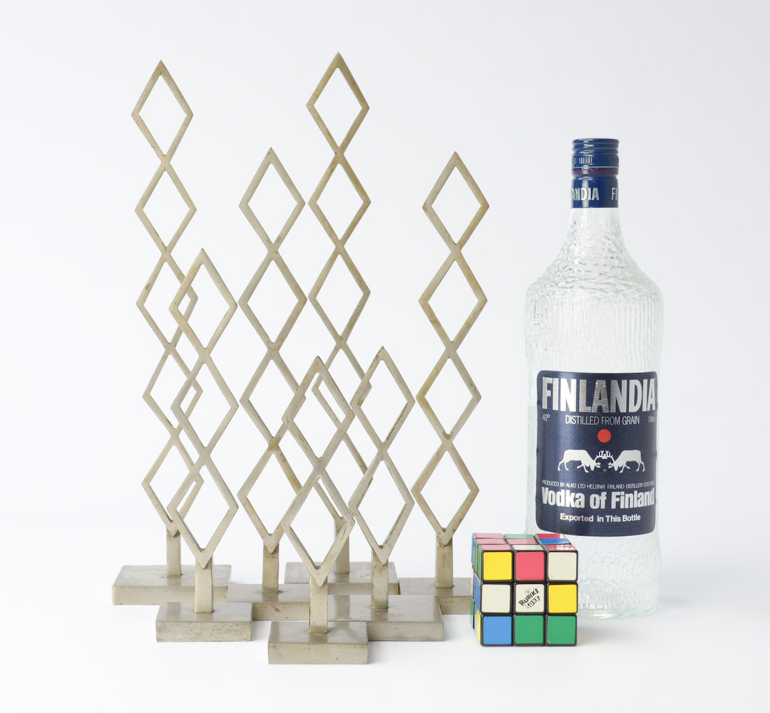 This decorative set of 7 metal geometric sculptures can be dated in the 1970s. They are handmade.