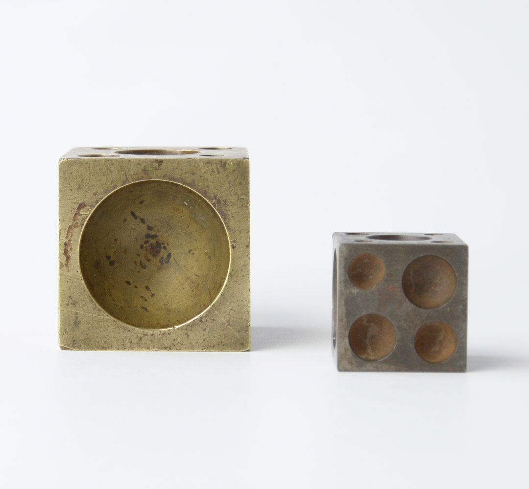 This pair of vintage cubes were originally used by a jewelry maker. The big one is made of brass, the other is made of metal.