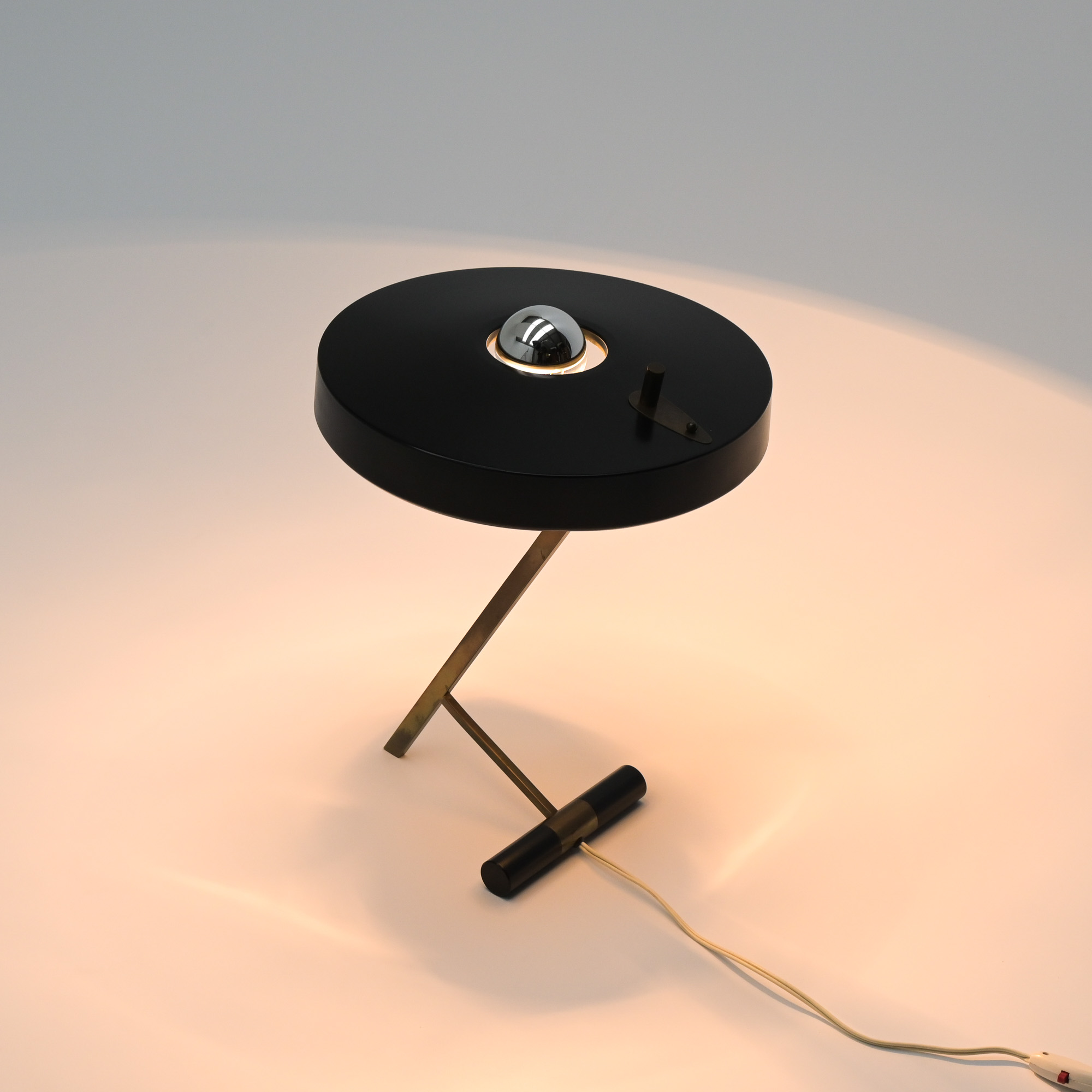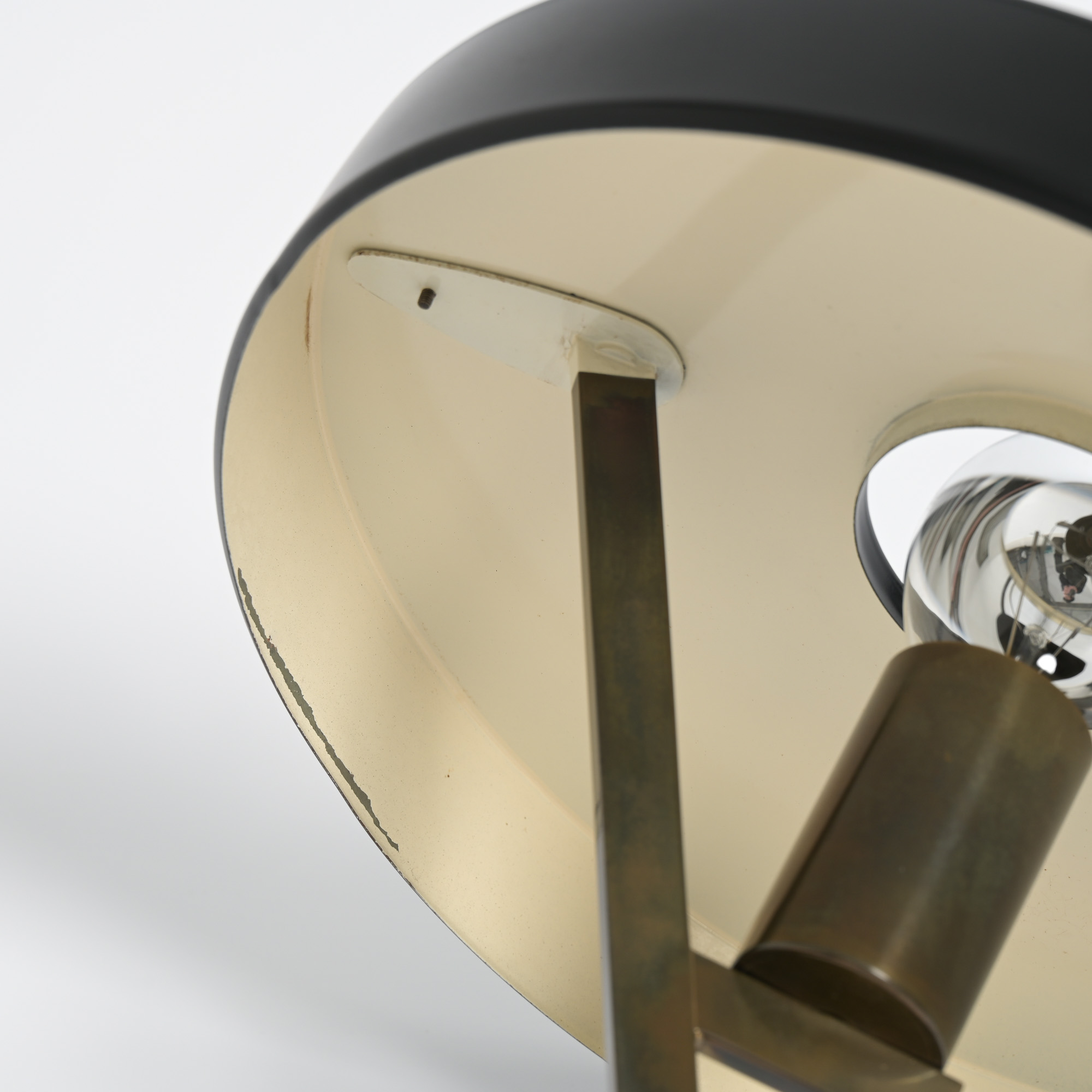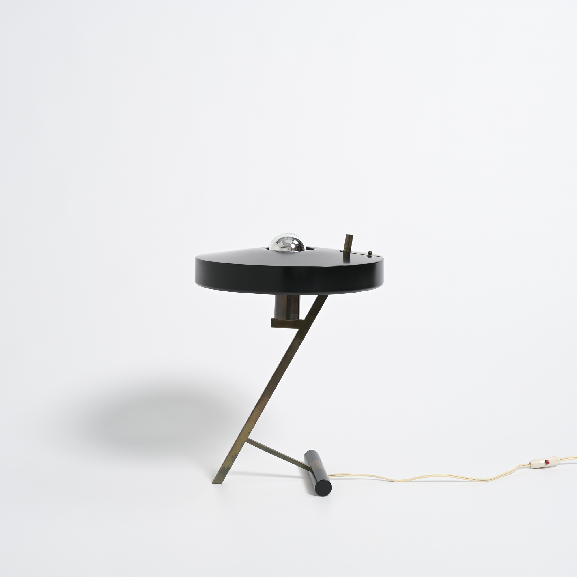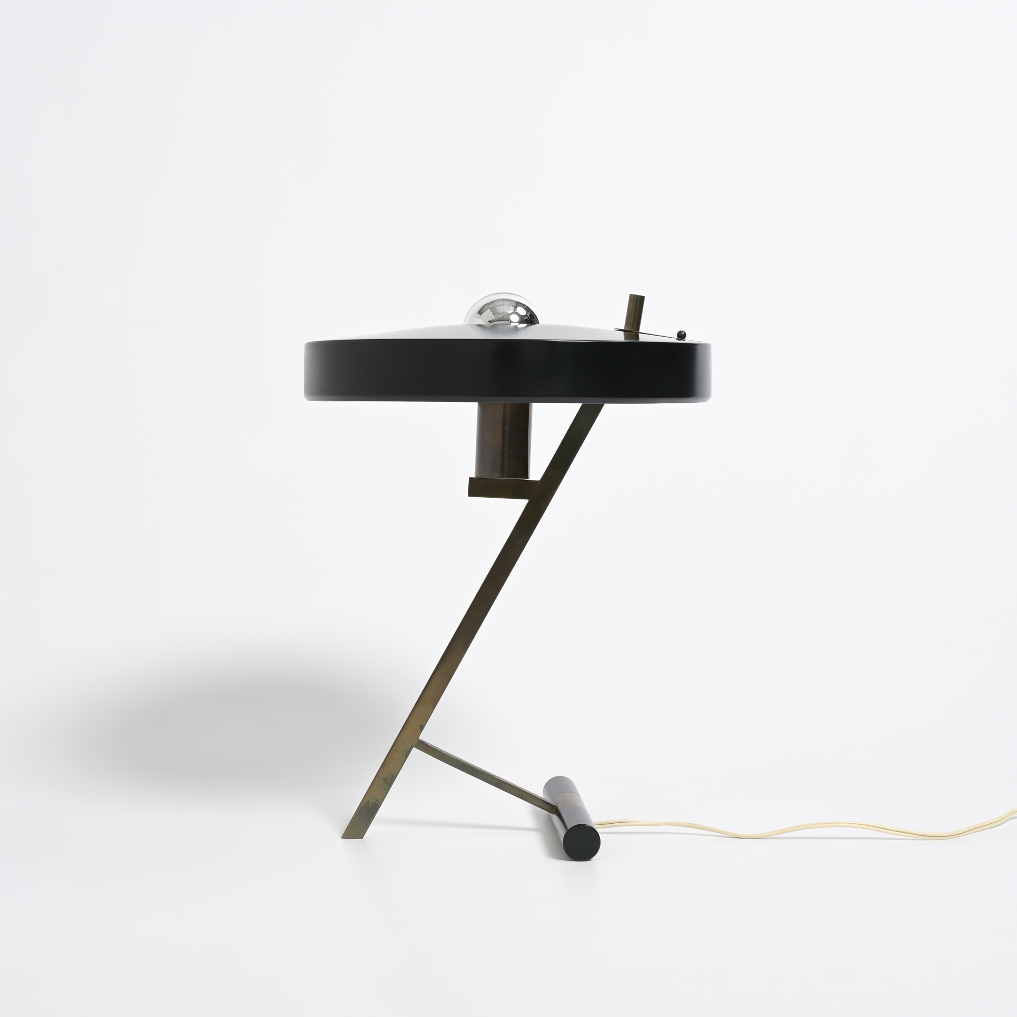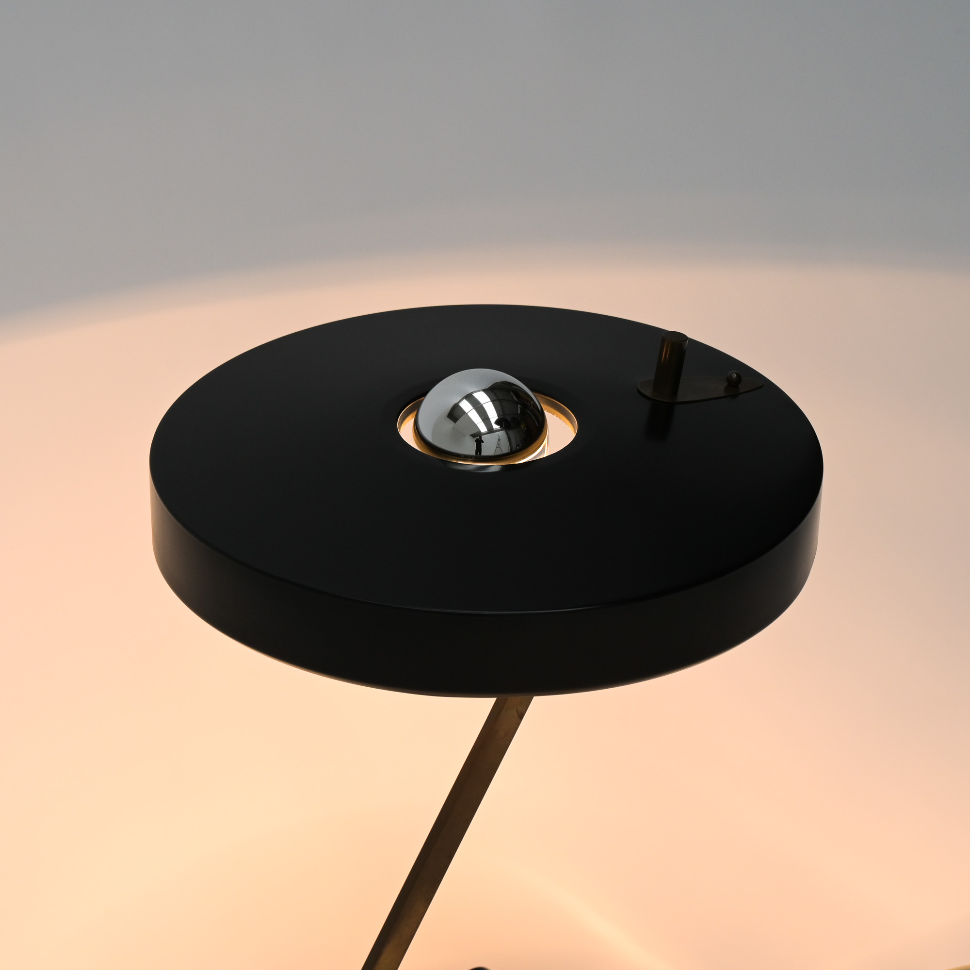 This iconic desk lamp was designed by Louis Christiaan Kalff for Philips Eindhoven in 1955. It has a black shade and a brass frame.