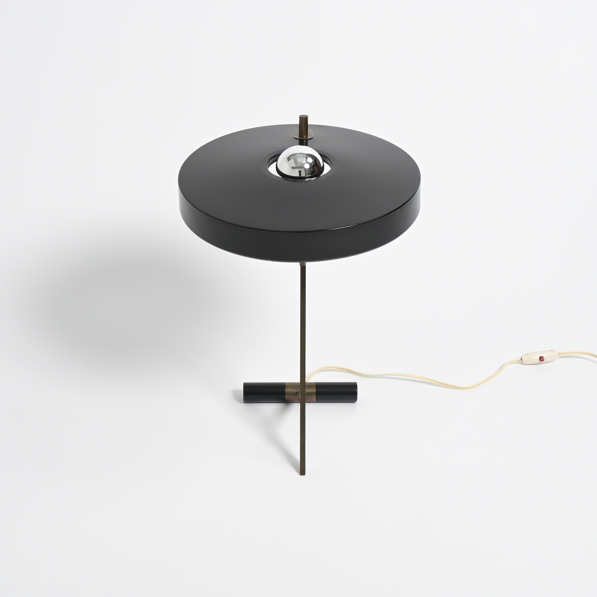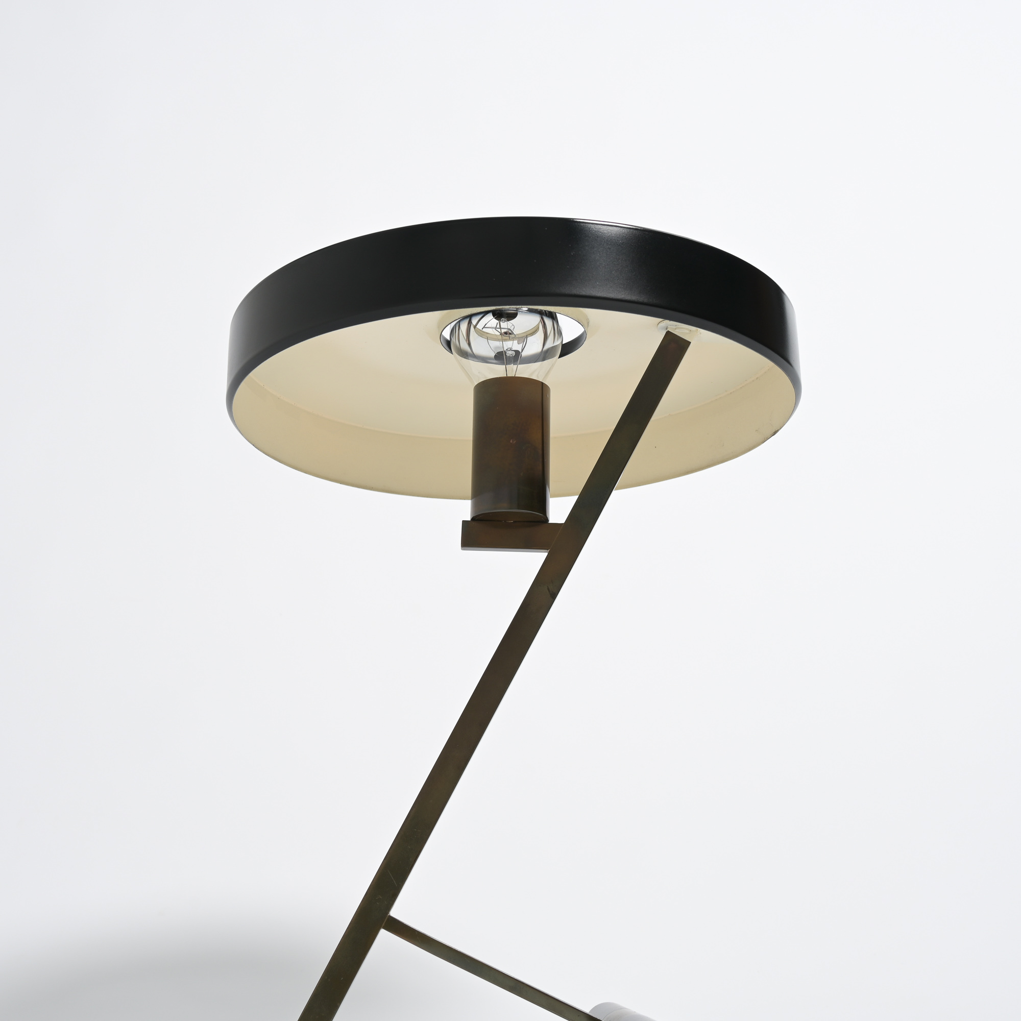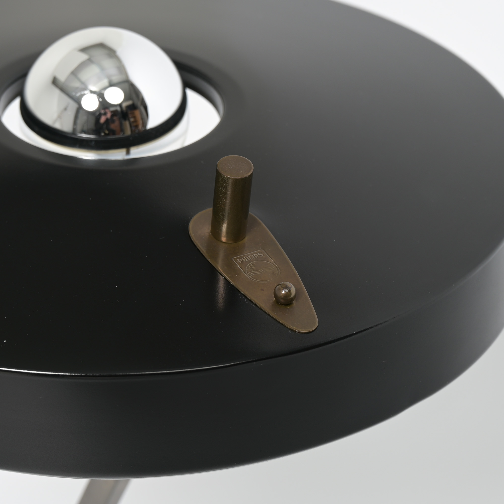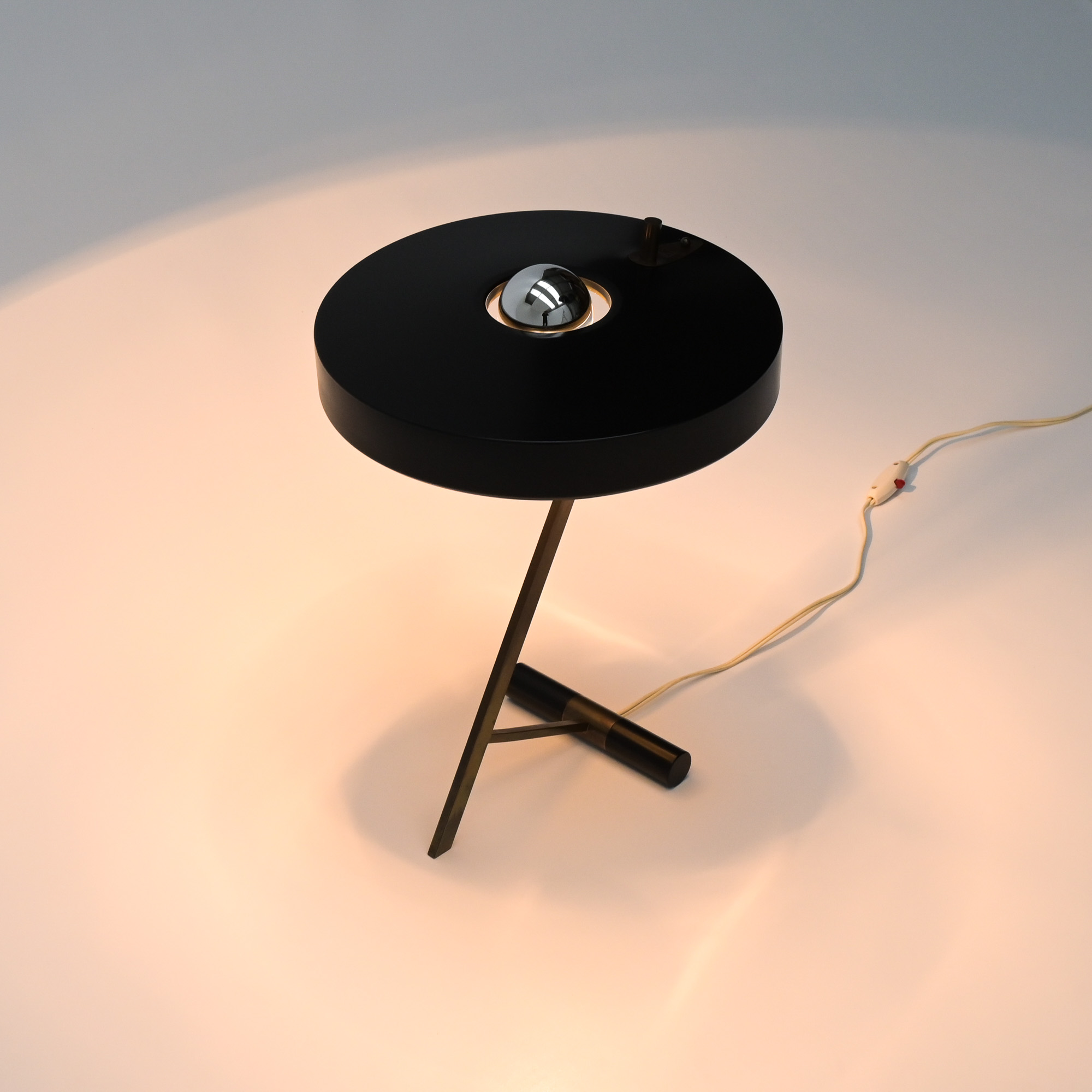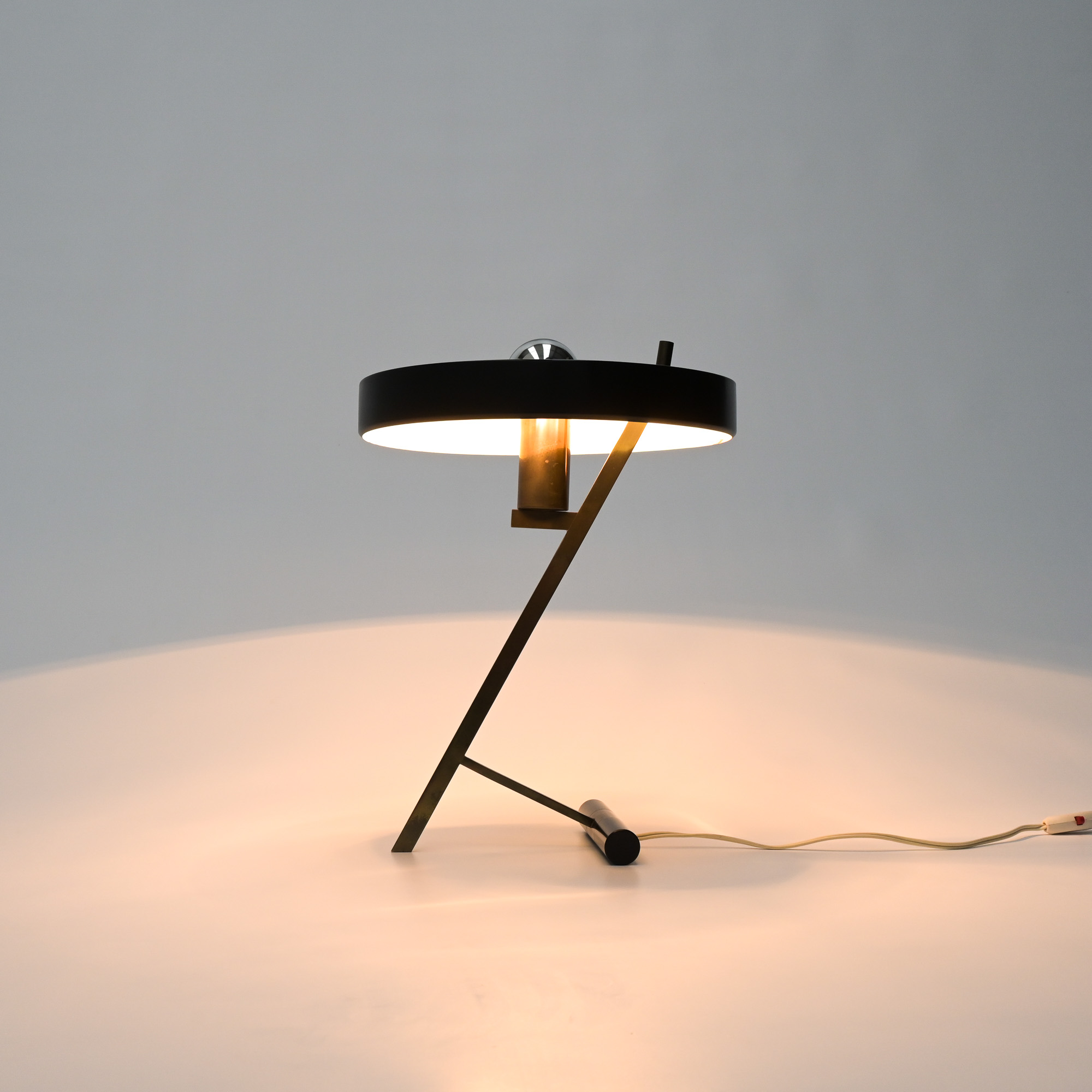 This iconic desk lamp was designed by Louis Christiaan Kalff for Philips Eindhoven in 1955. It has a black shade and a brass frame.