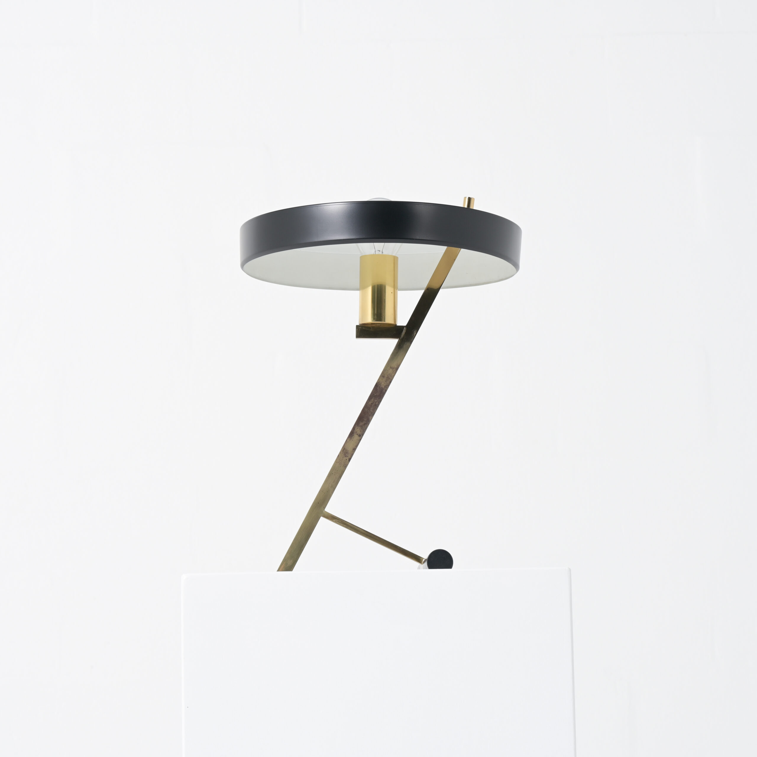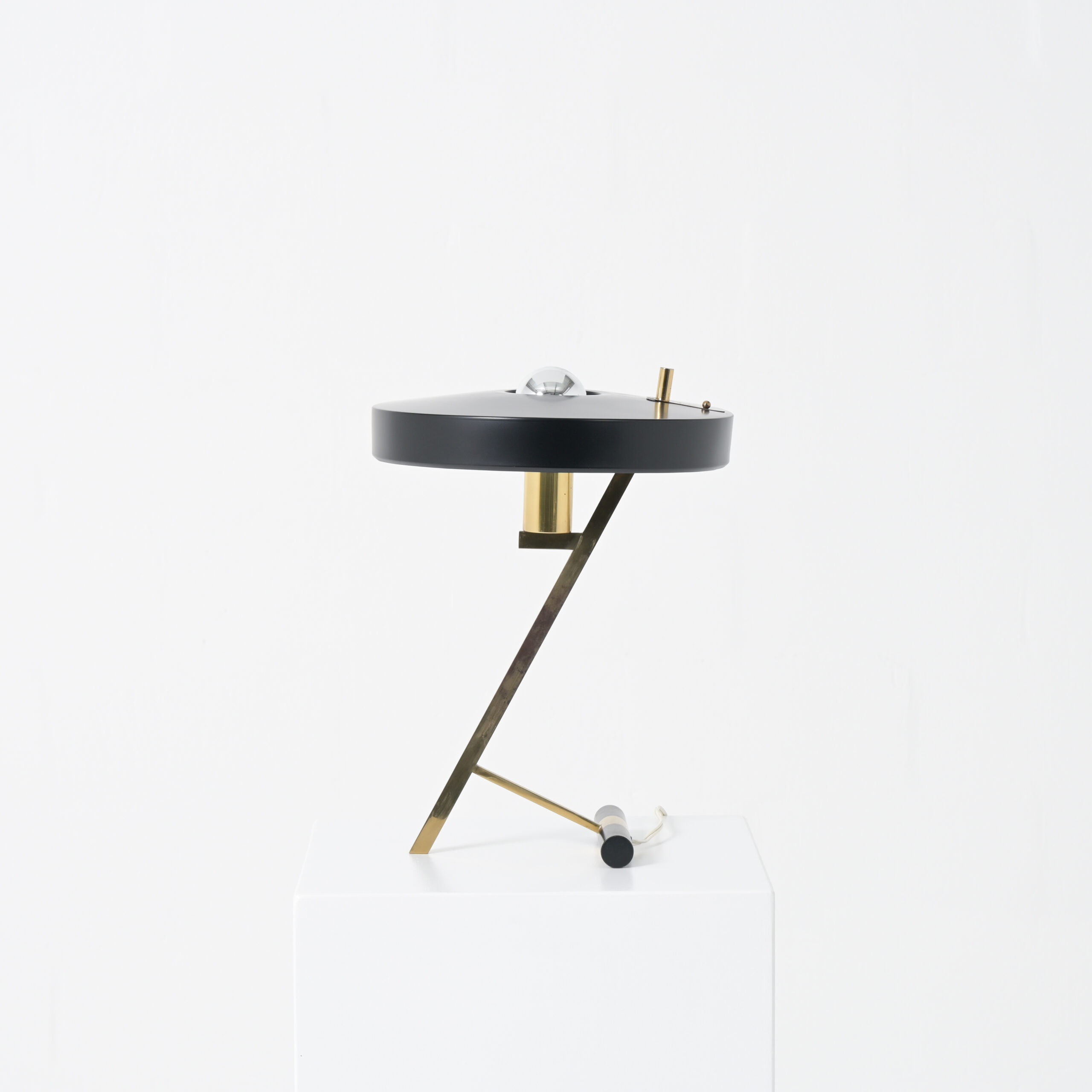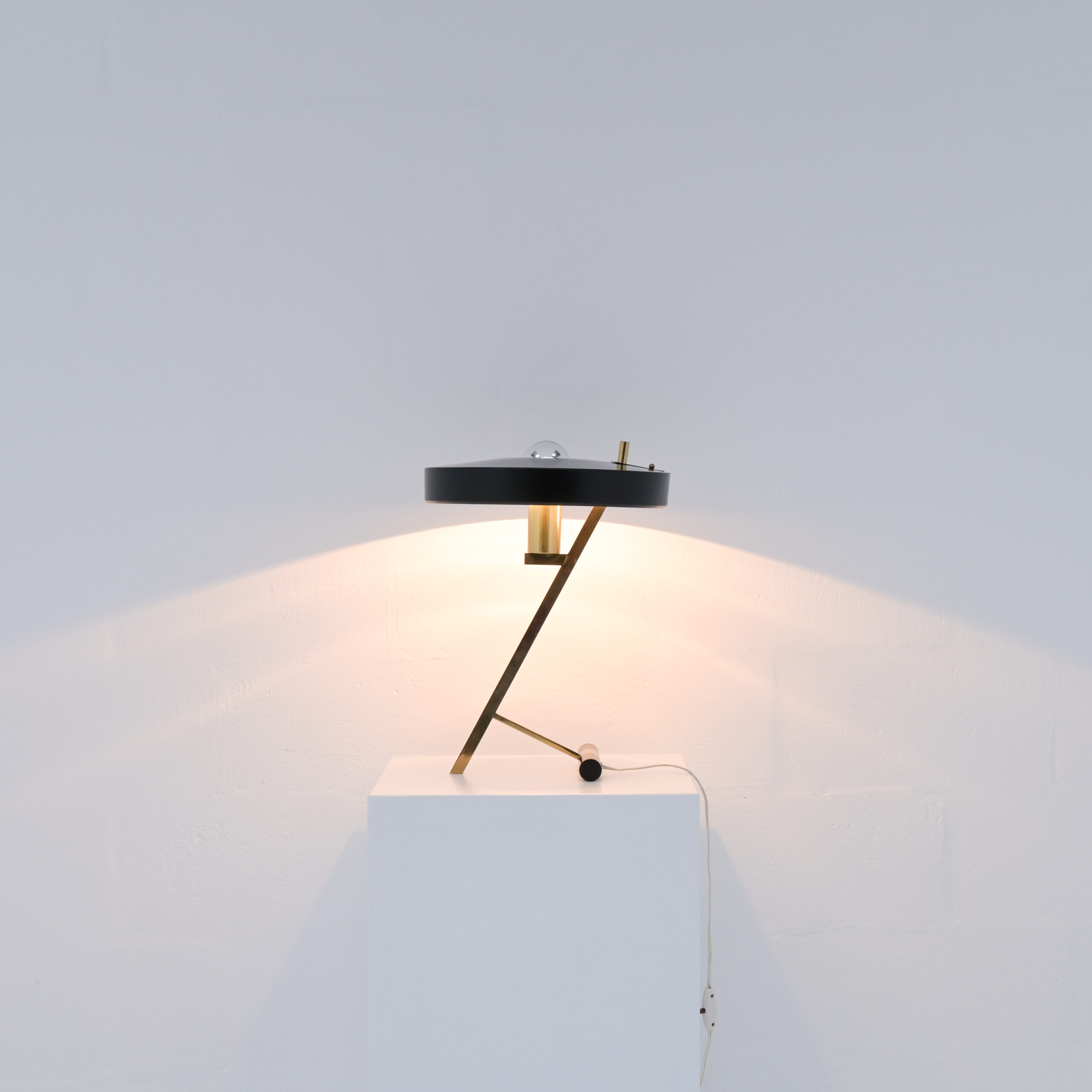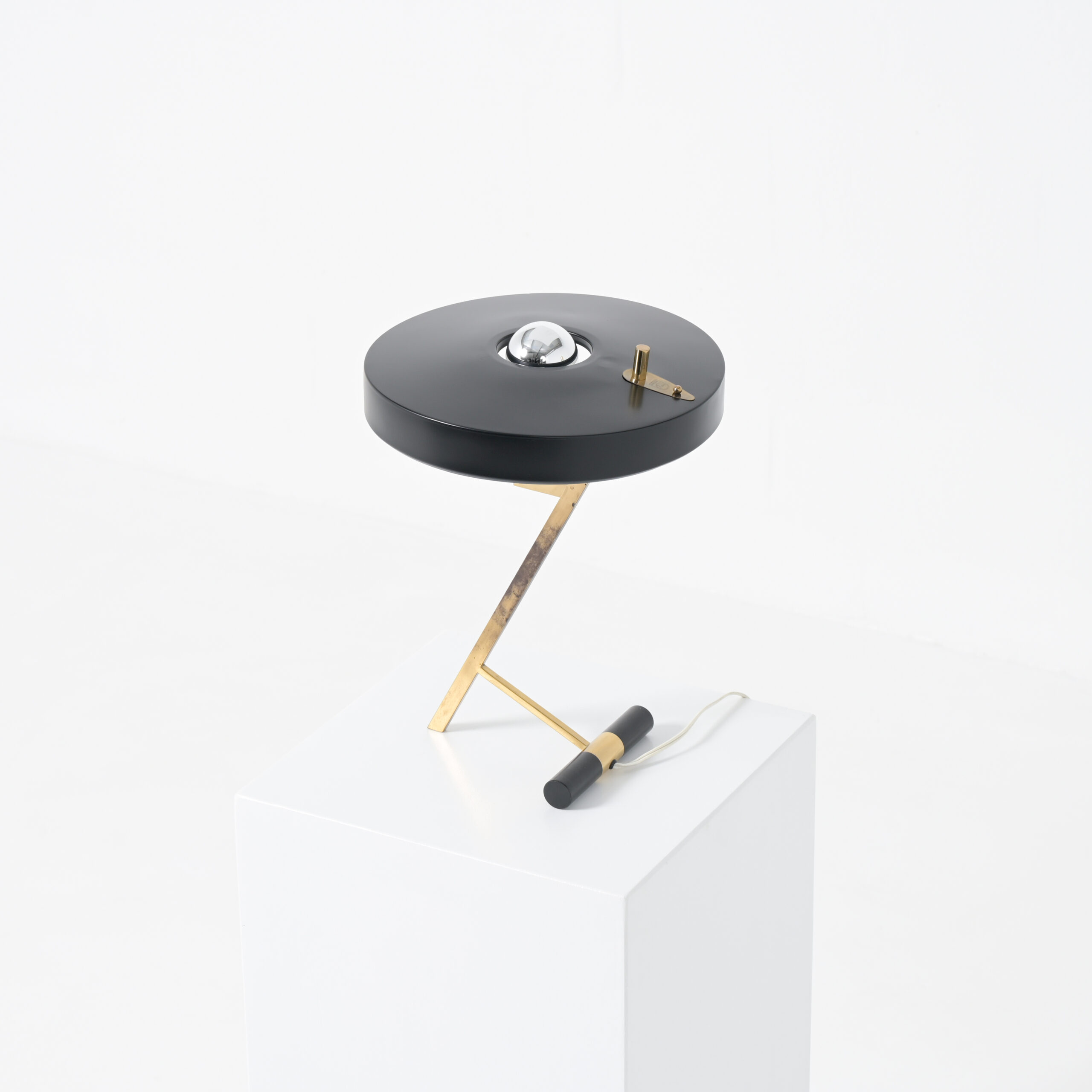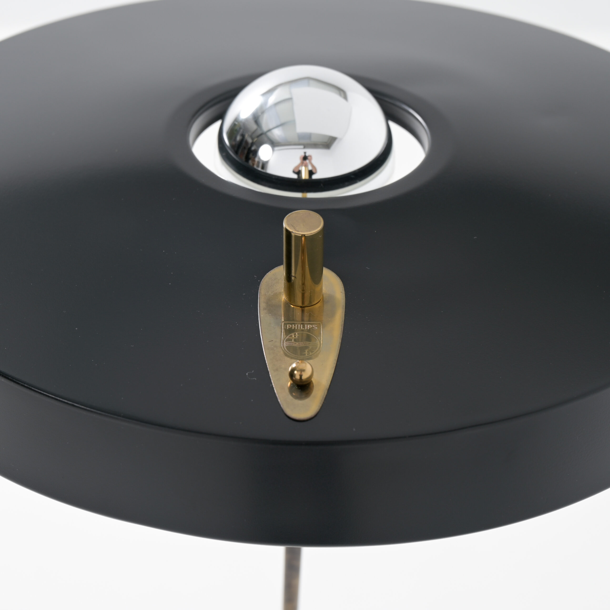 This iconic desk lamp was designed by Louis Christiaan Kalff for Philips Eindhoven in 1955. It has a black shade and a brass frame.
