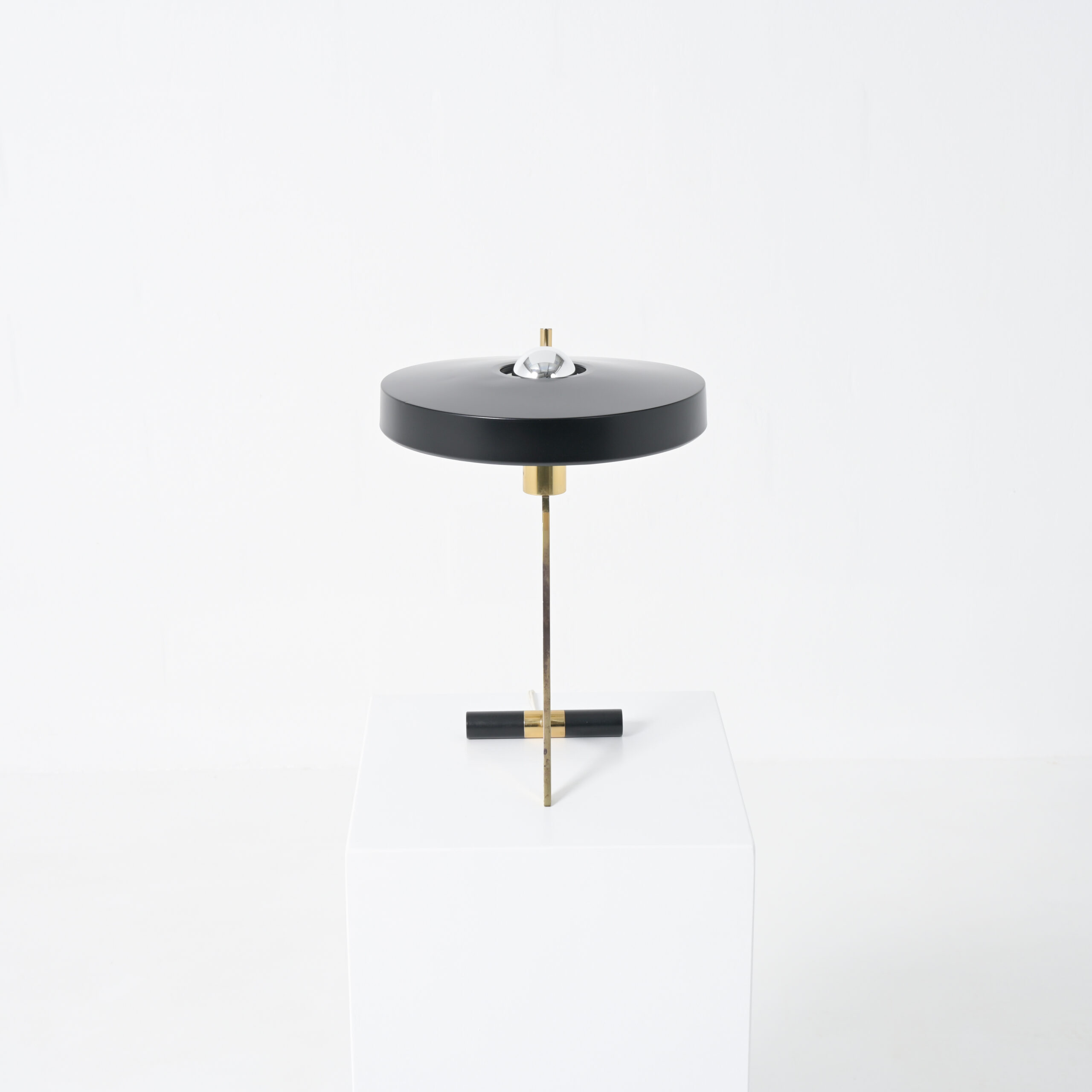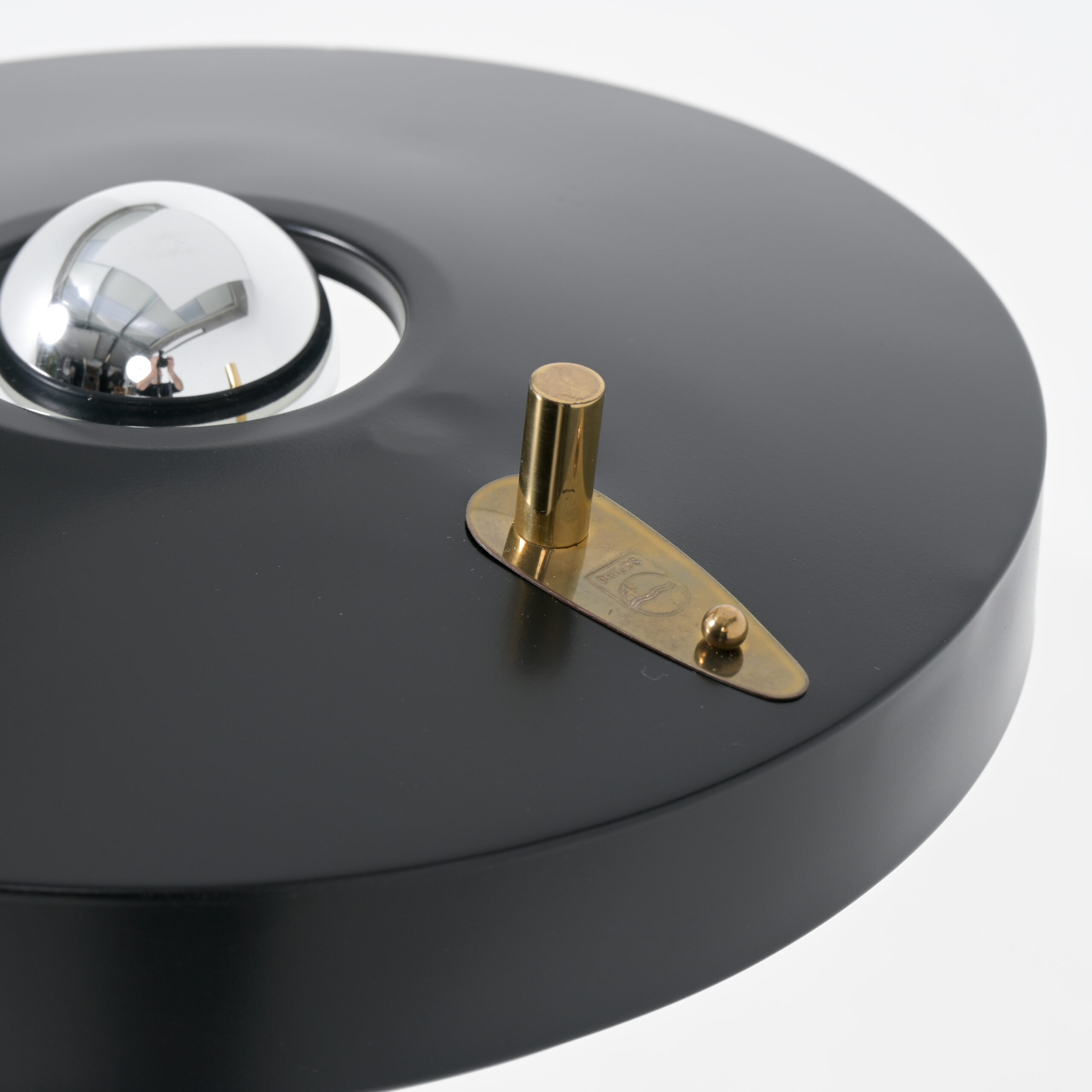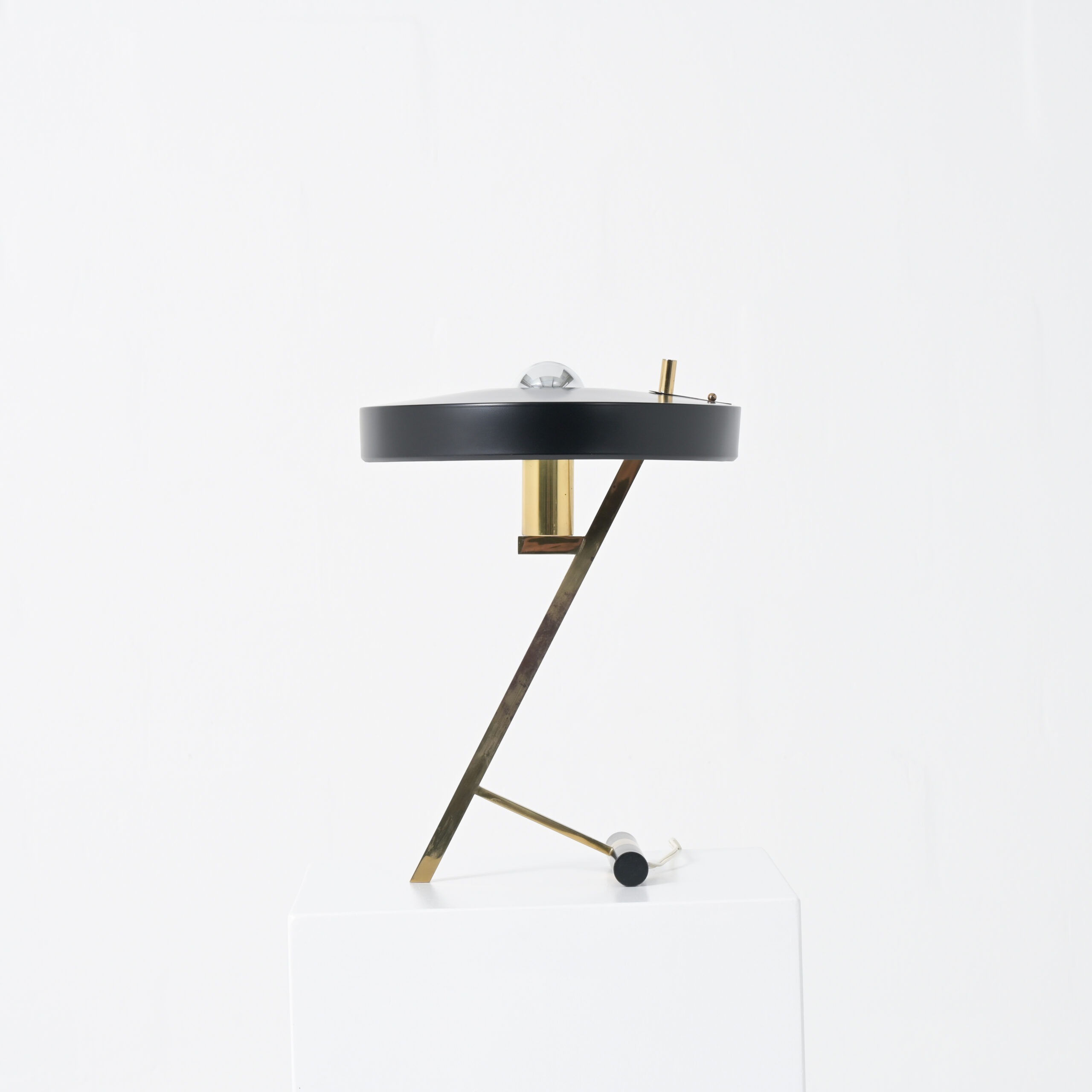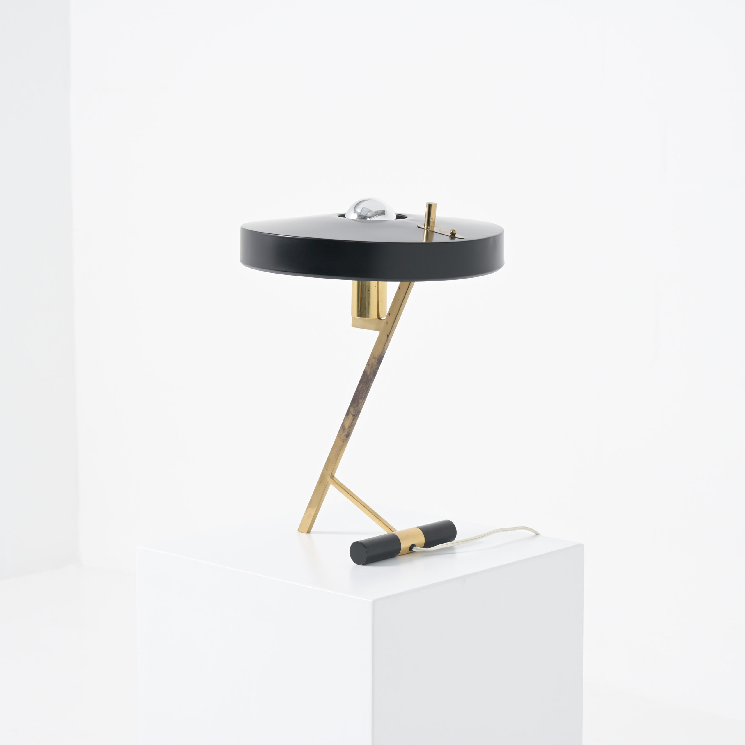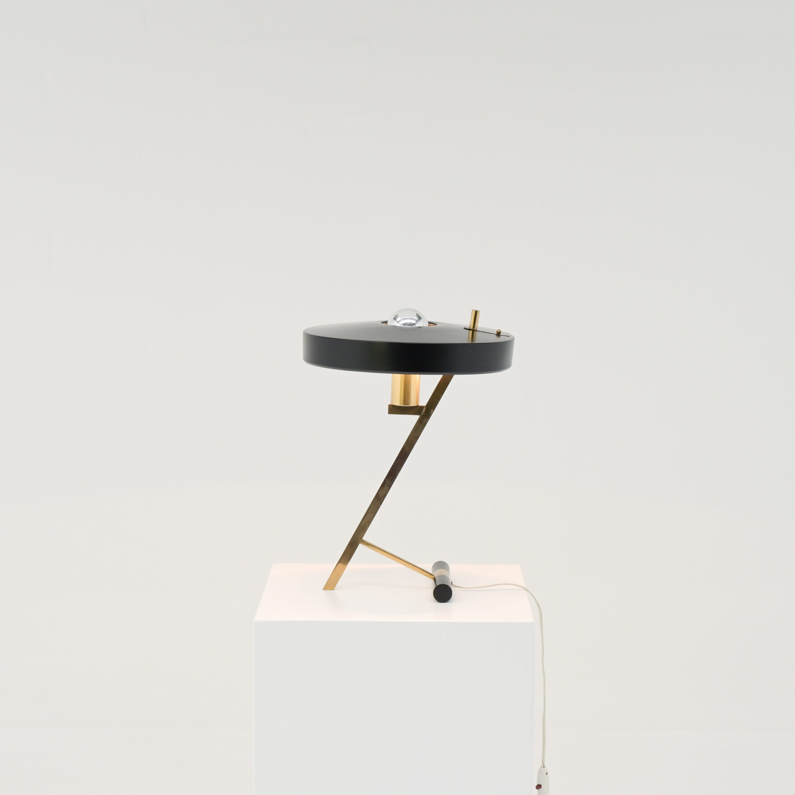 This iconic desk lamp was designed by Louis Christiaan Kalff for Philips Eindhoven in 1955. It has a black shade and a brass frame.