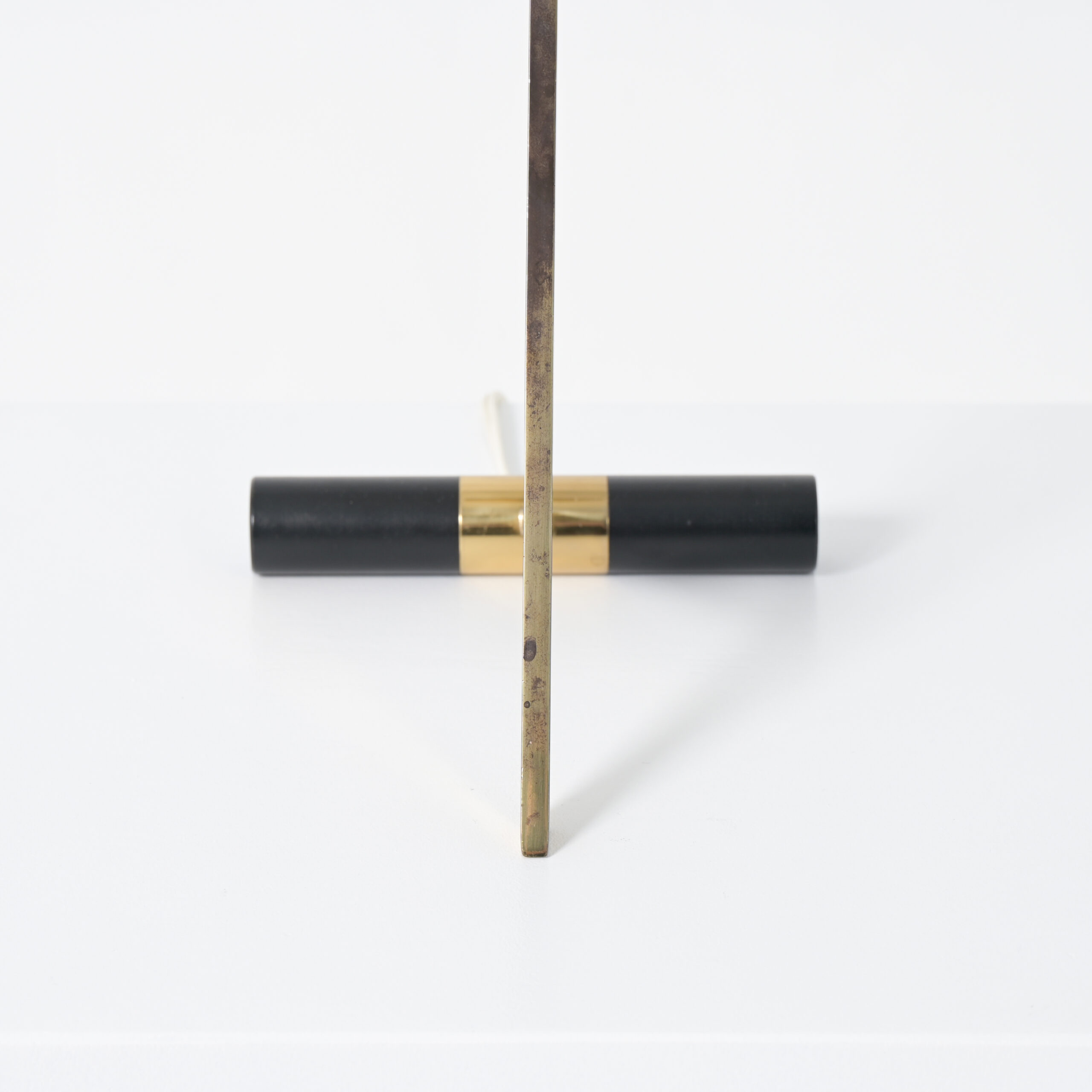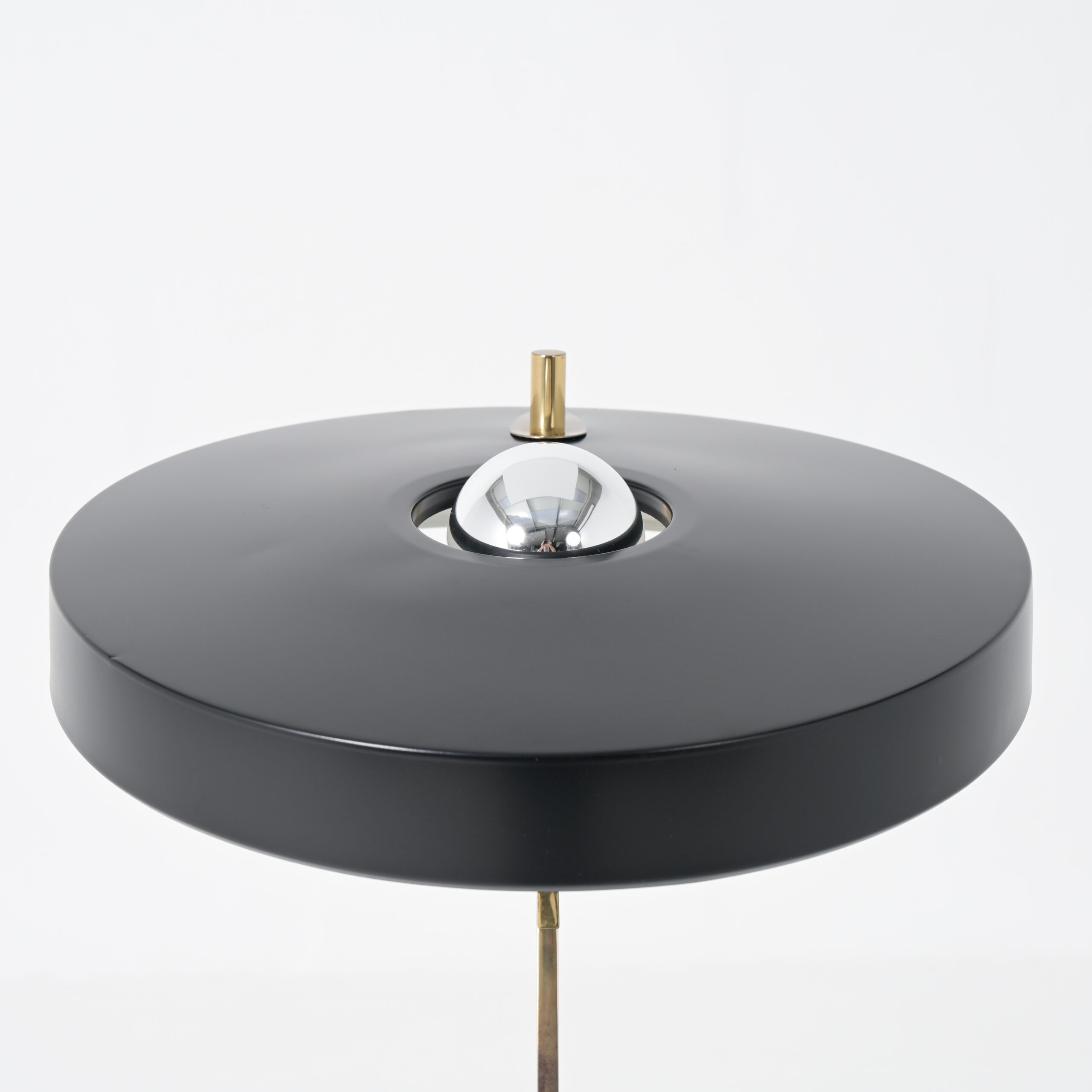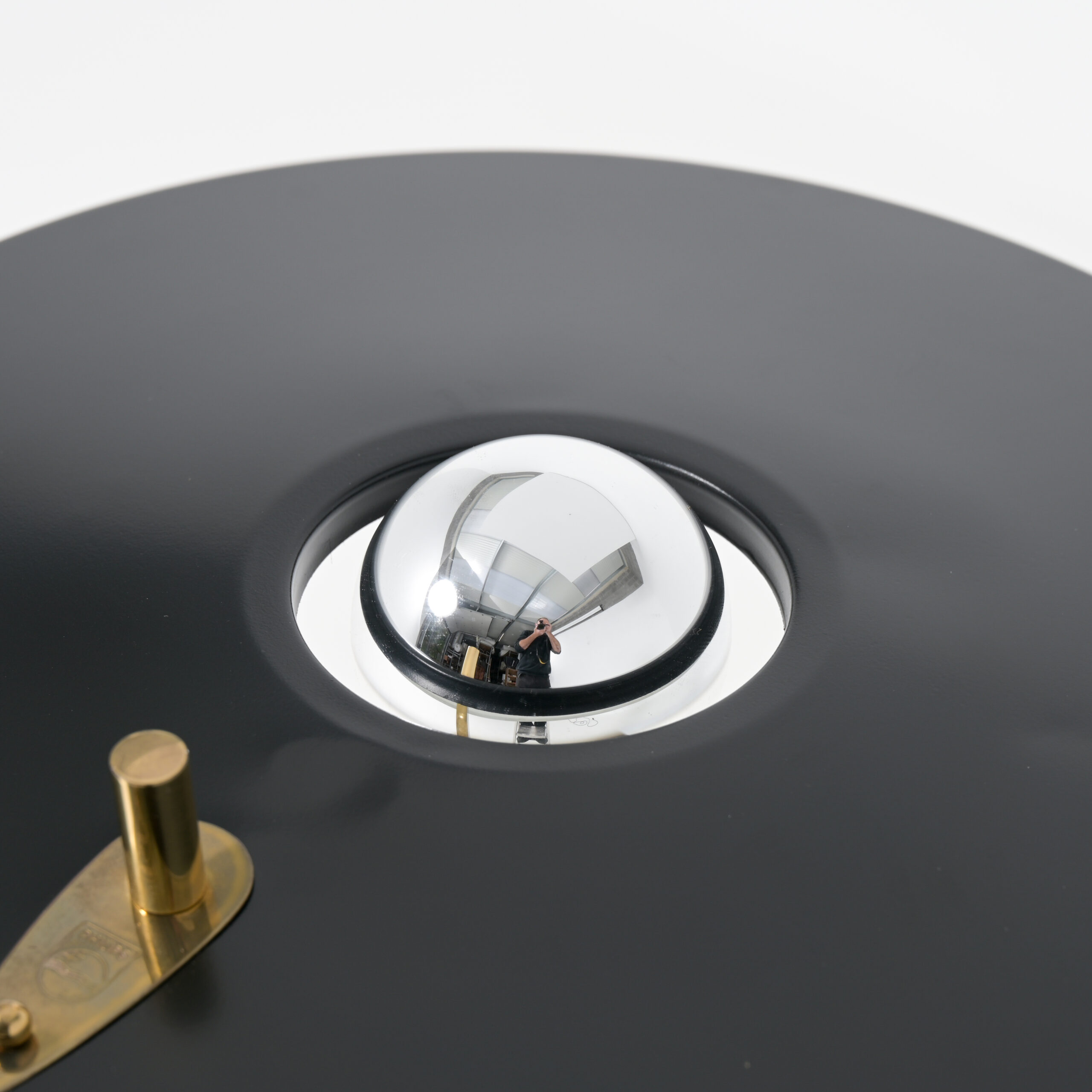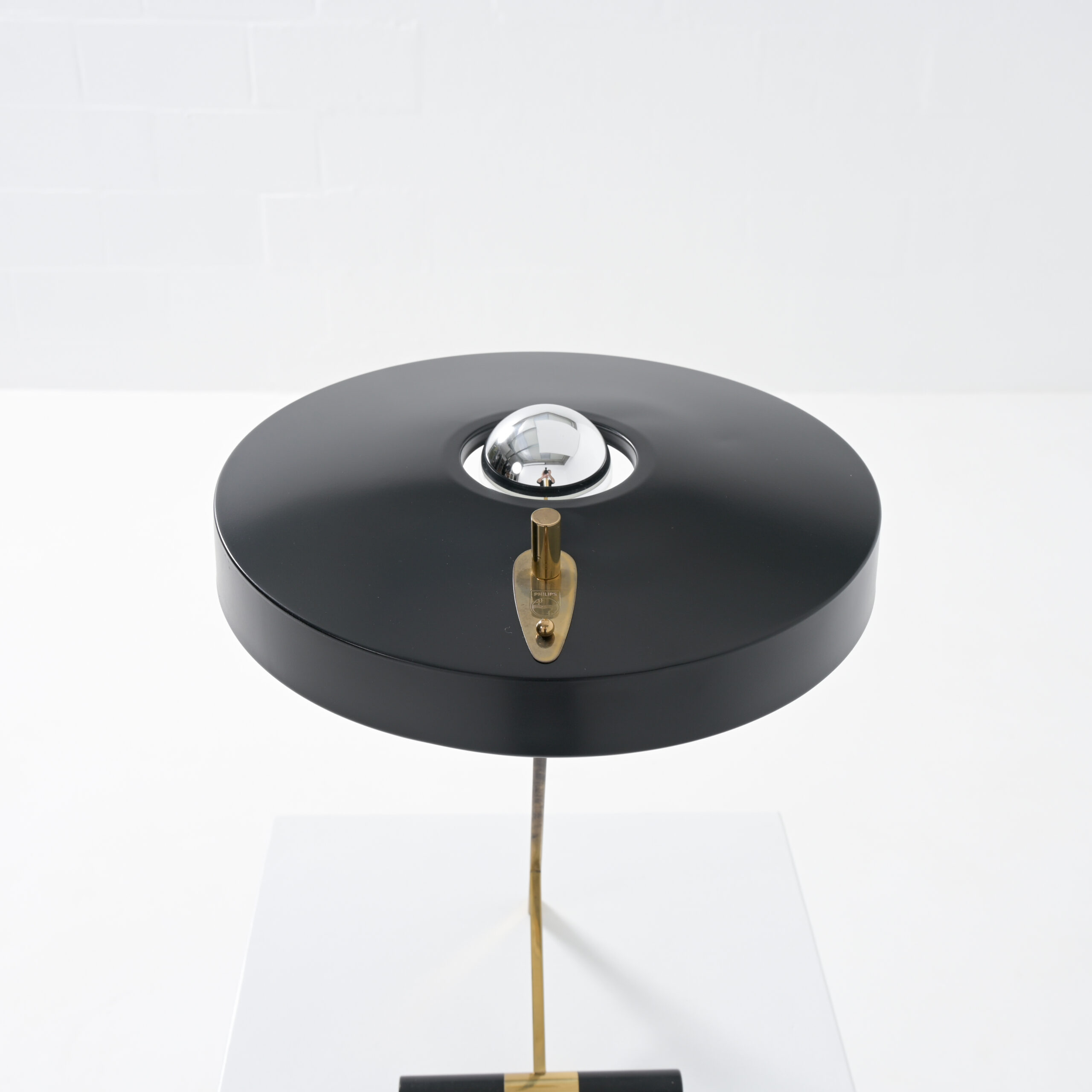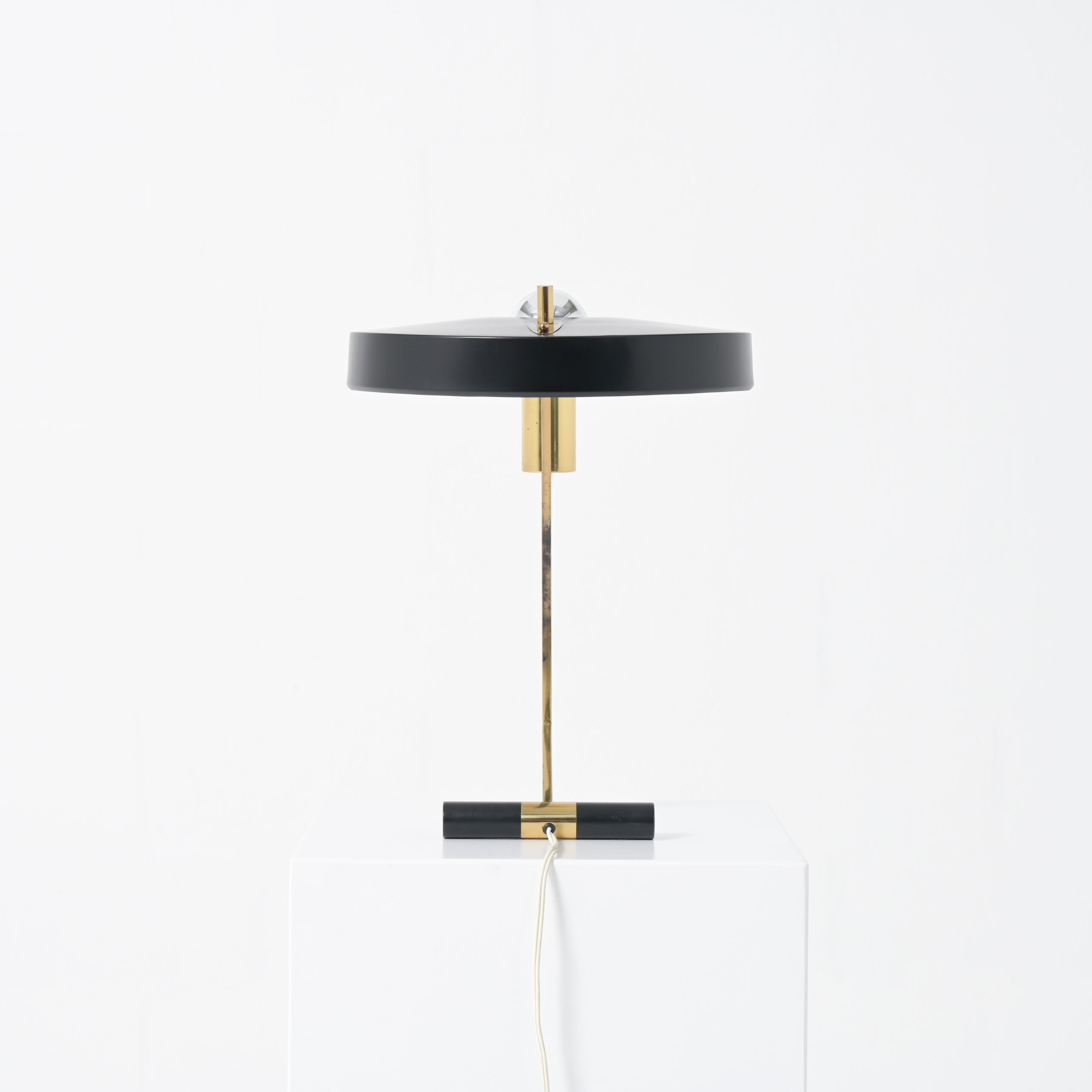 This iconic desk lamp was designed by Louis Christiaan Kalff for Philips Eindhoven in 1955. It has a black shade and a brass frame.