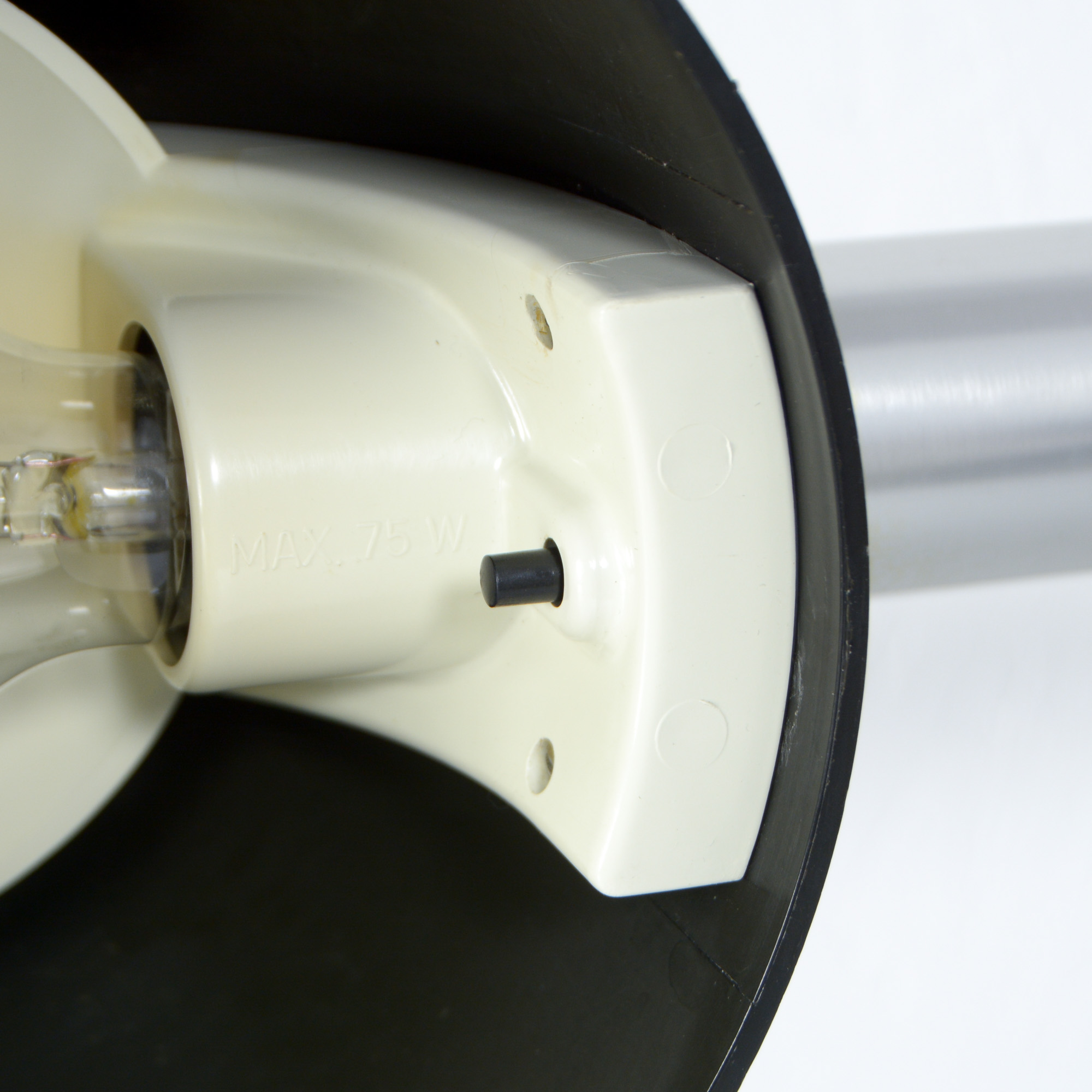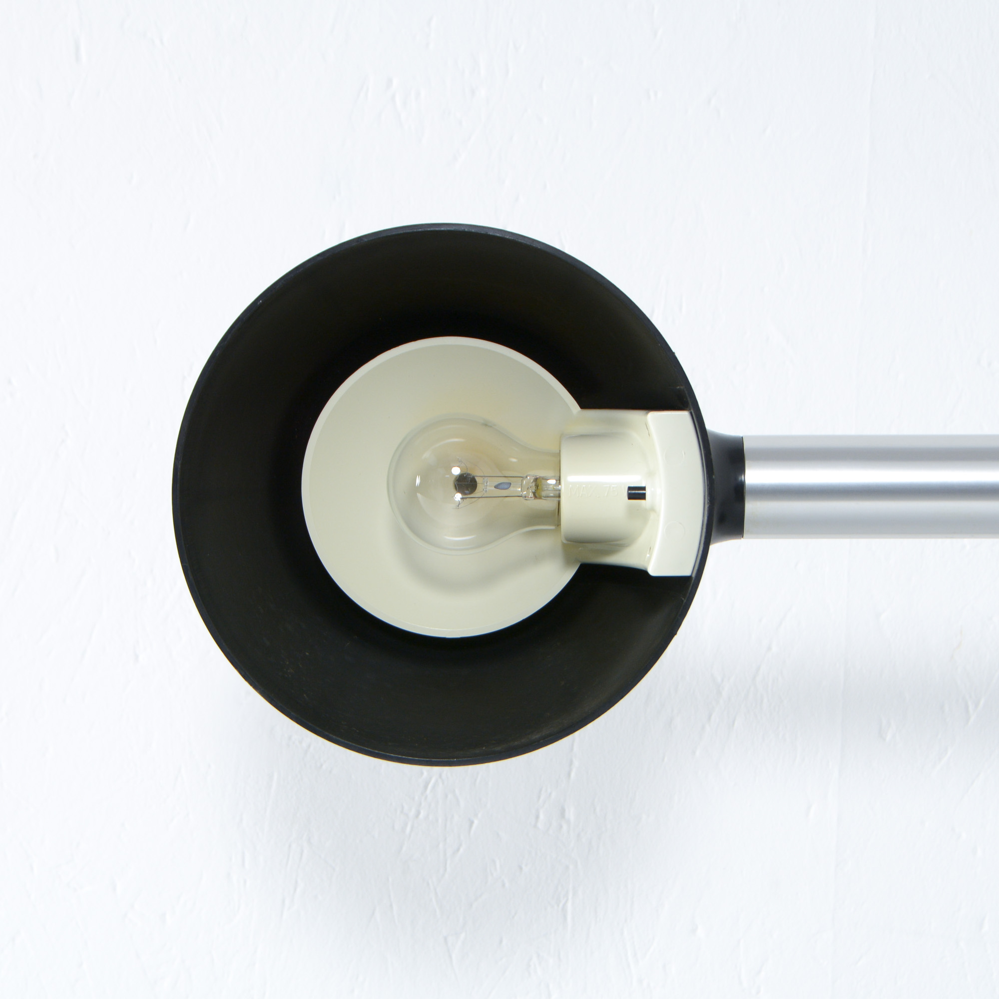 This great lamp is made of brushed aluminum tubes, fixed with a black plastic node. The shade is also made of black plastic.
