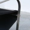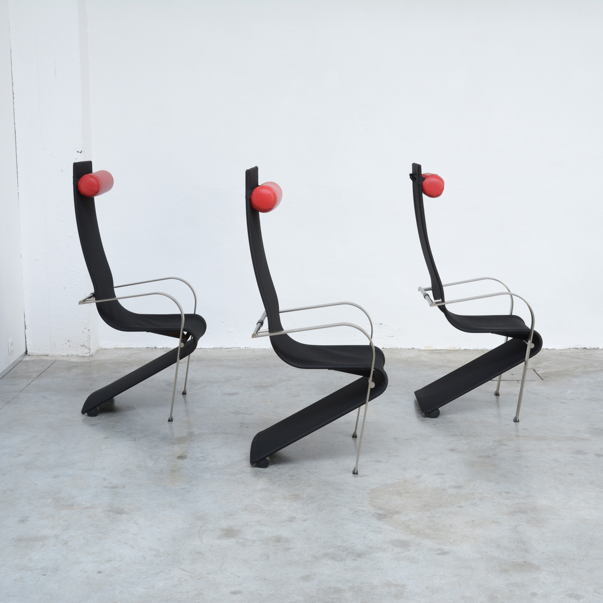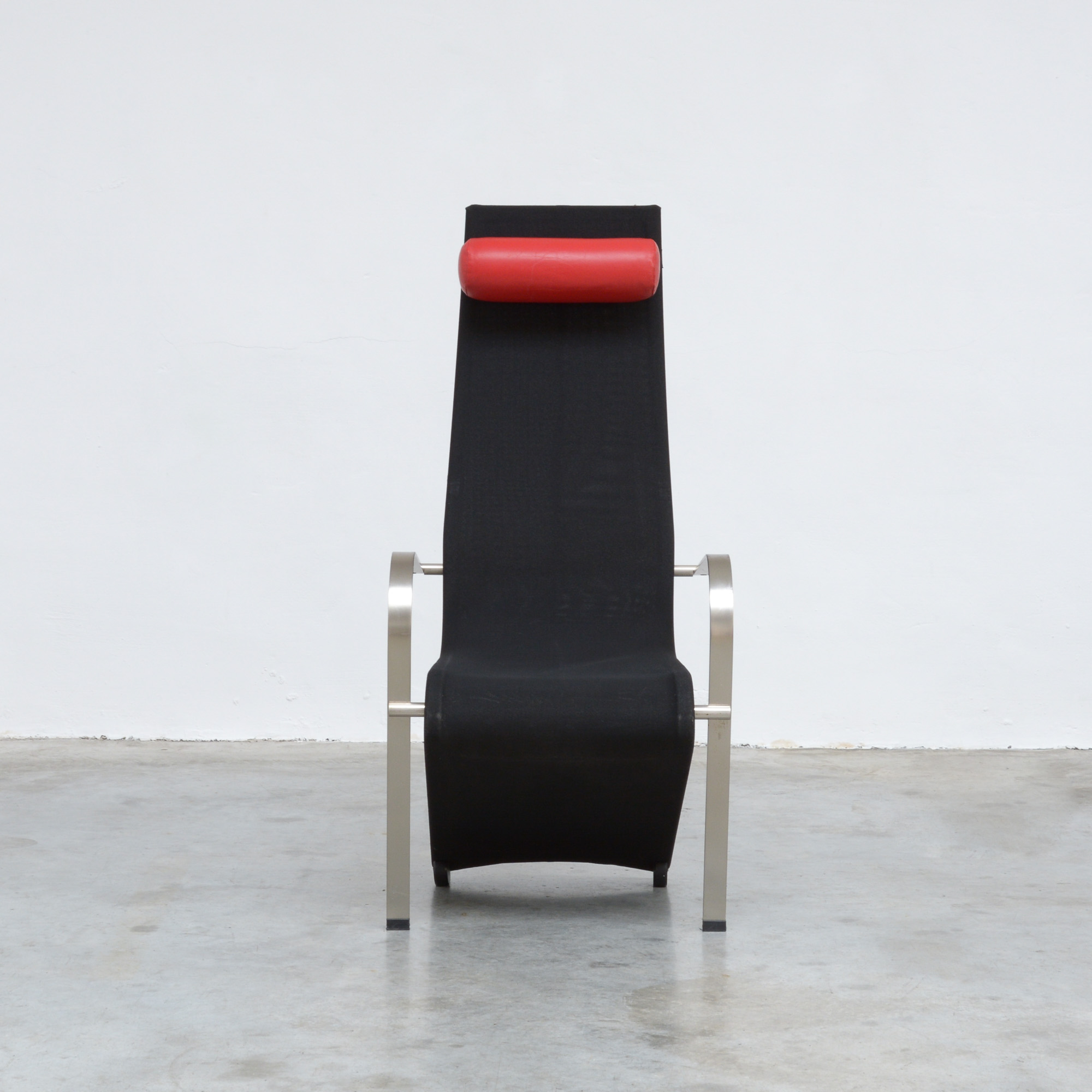 The black fabric is pulled over a metal frame. The red leather headrest makes the chair comfortable.