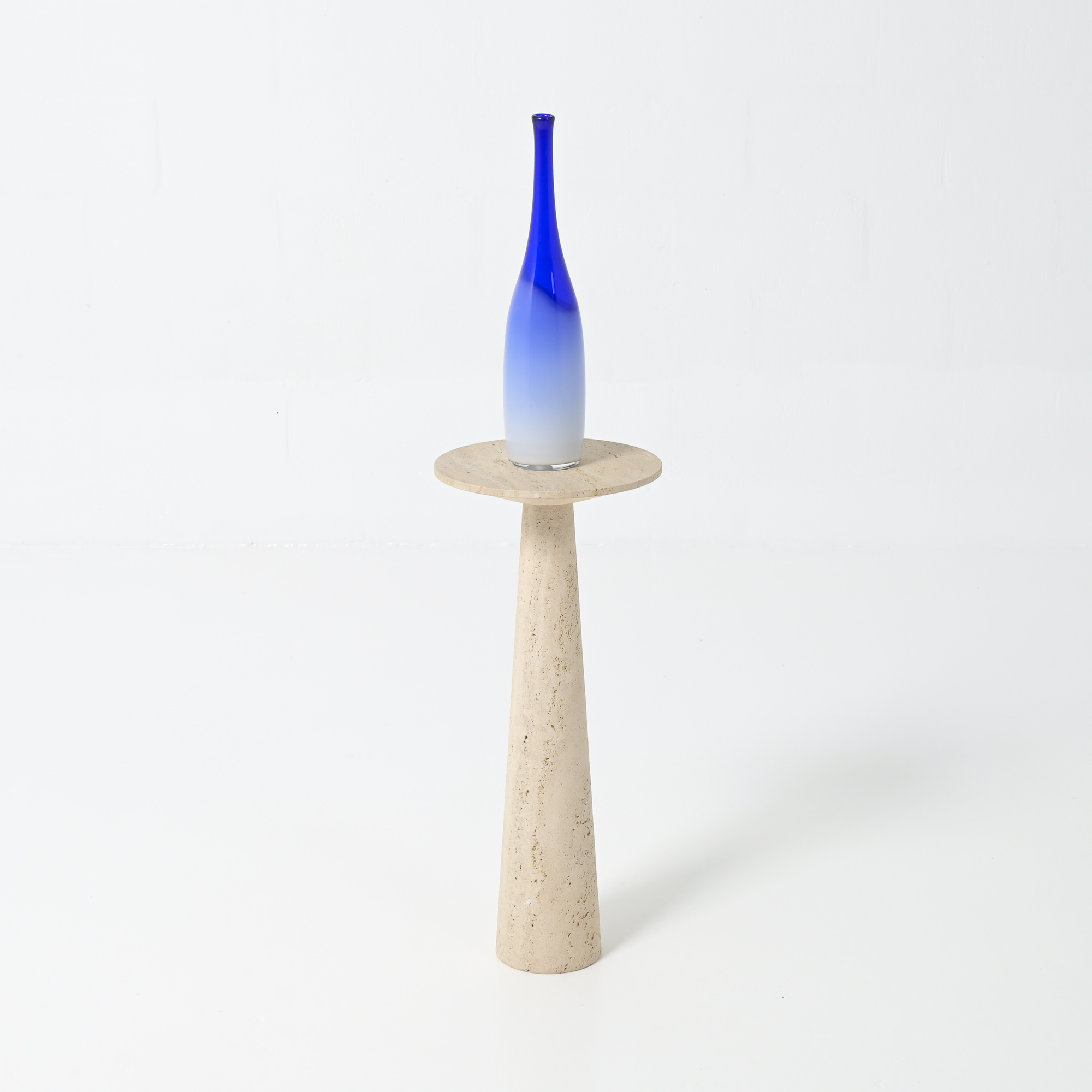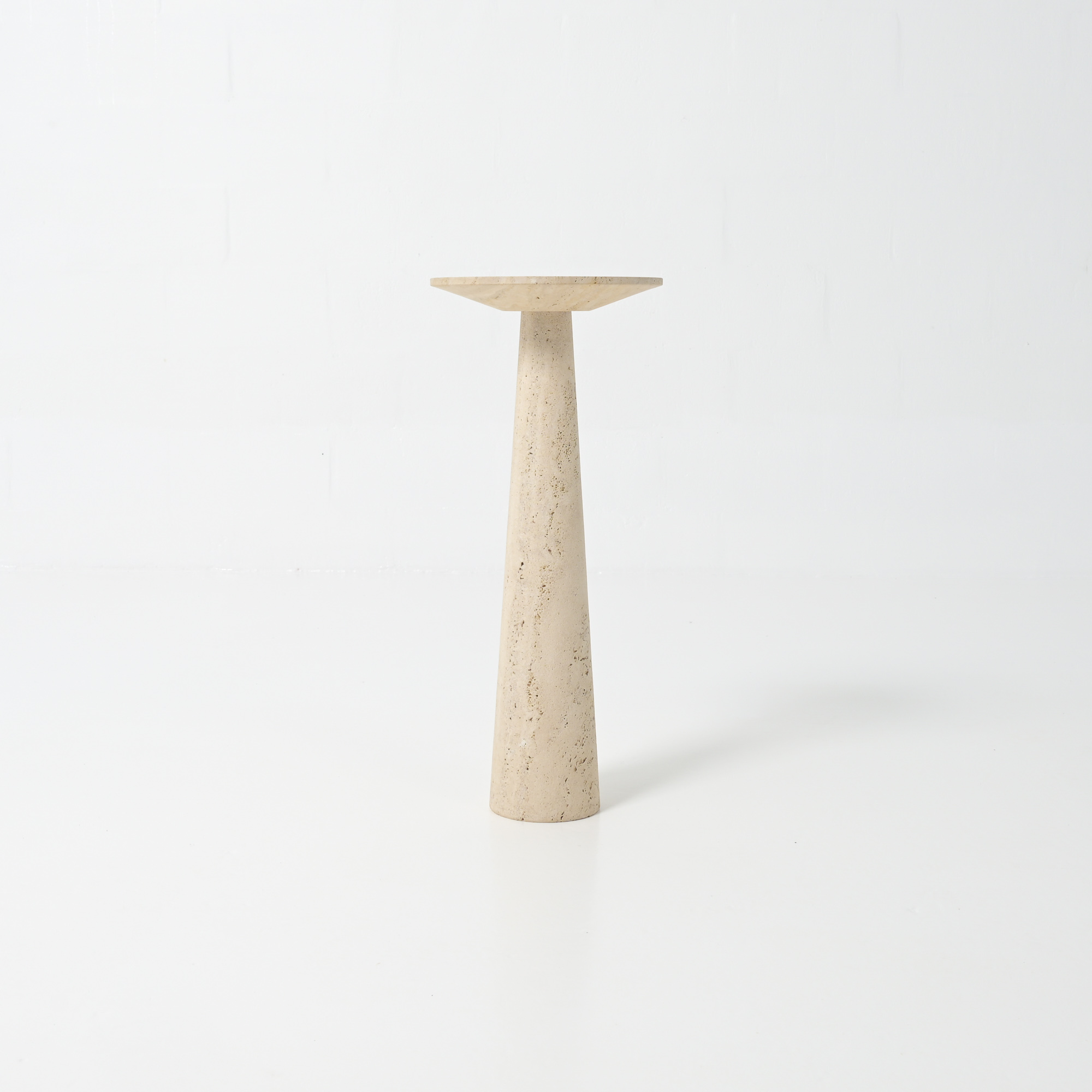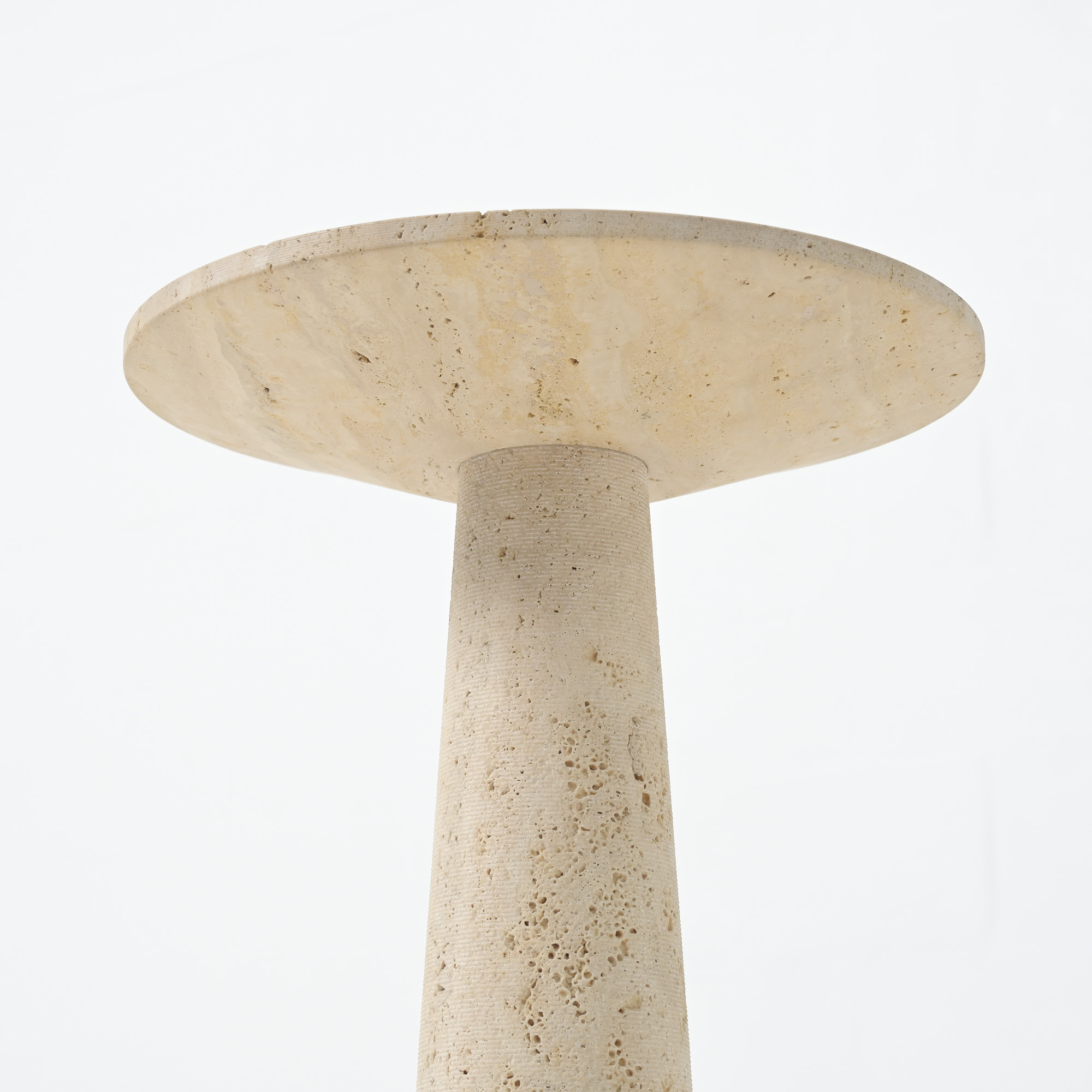 It is a refined piece with a white travertine conical base and a round top, a fine example of craftsmanship.