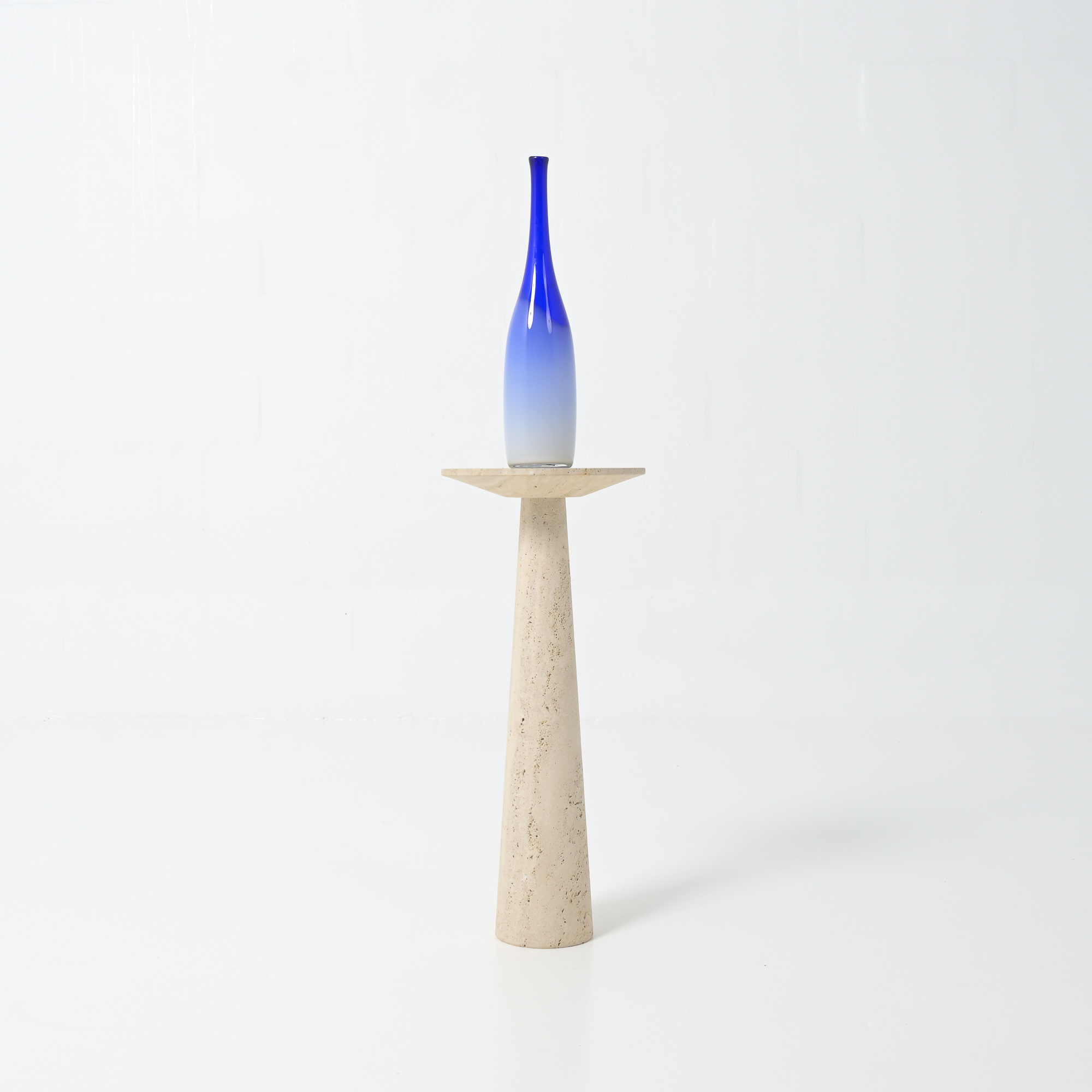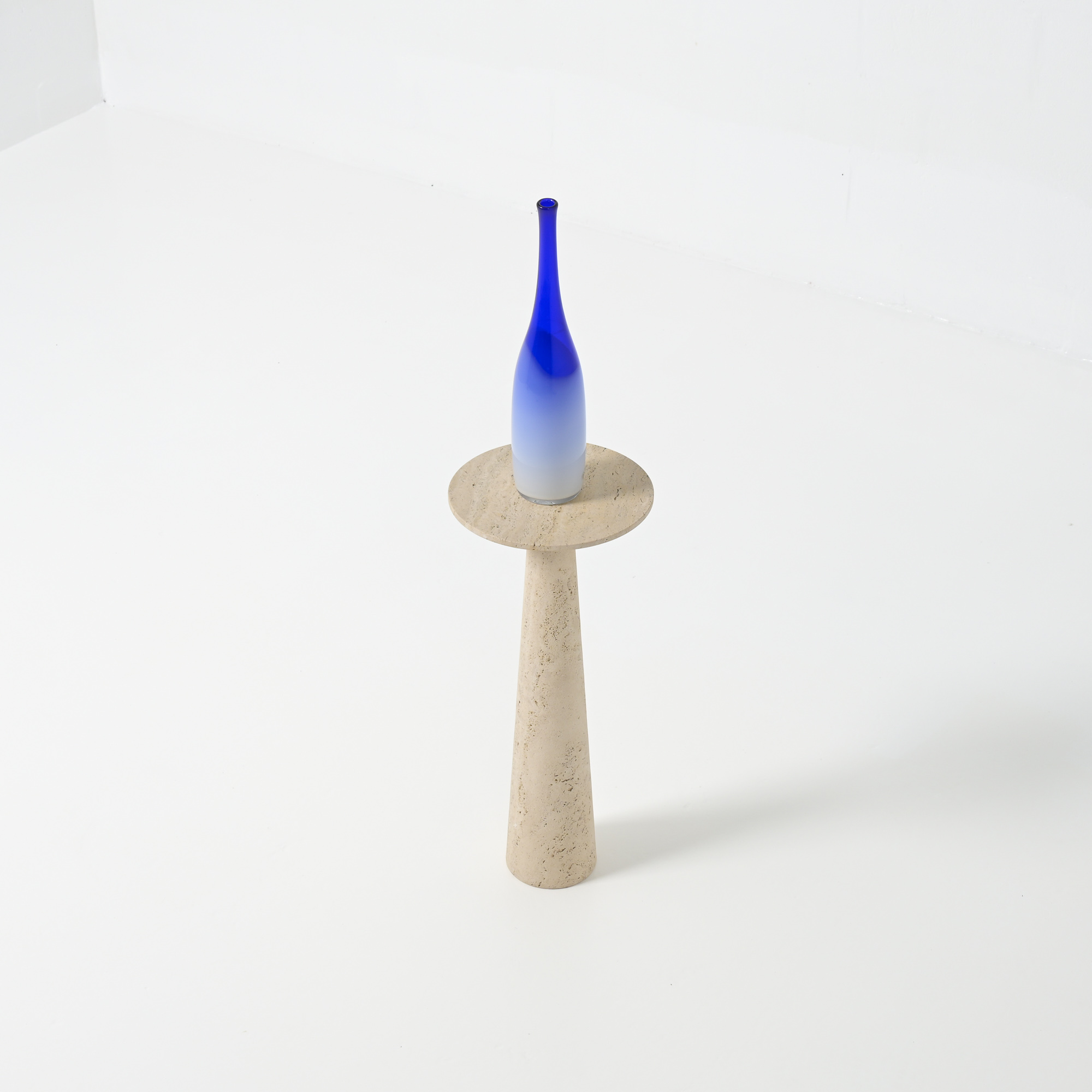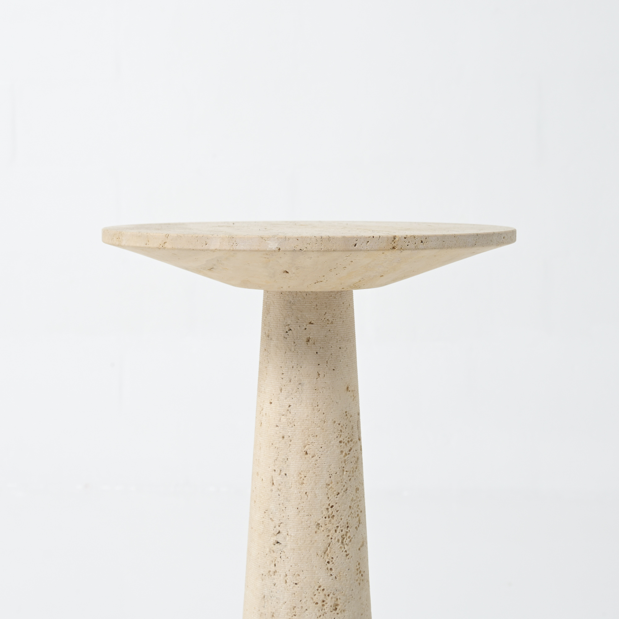 It is a refined piece with a white travertine conical base and a round top, a fine example of craftsmanship.