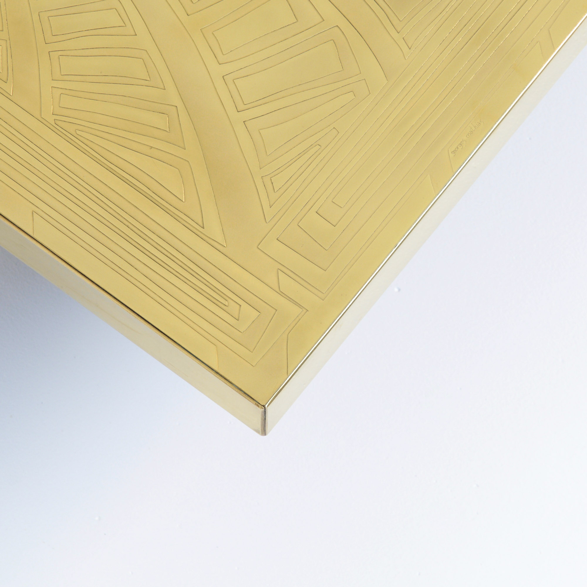 This unique coffee table was created by Georges Mathias in the 1970s. The table is made of etched brass with a laminated black base.