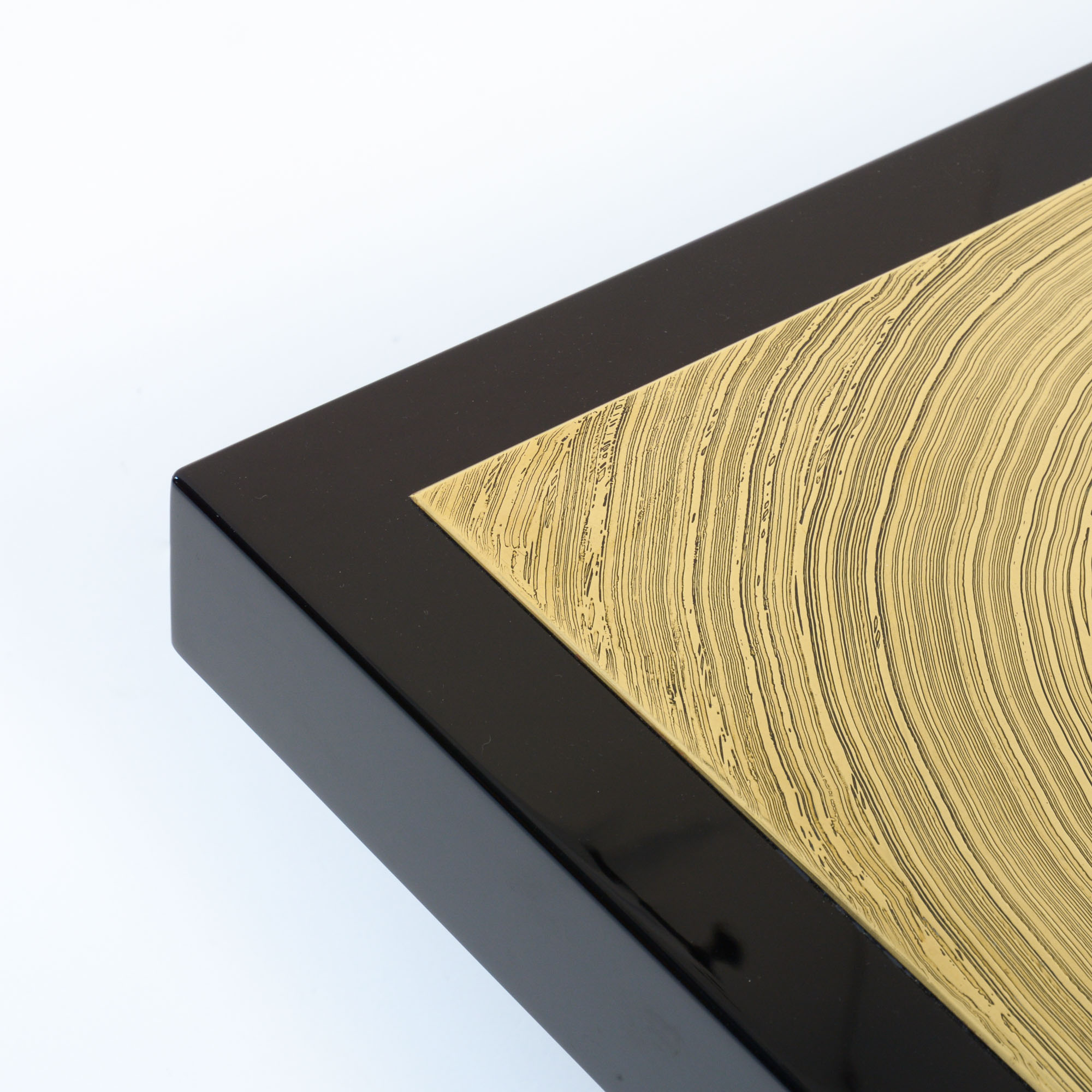 The table is made of glossy black lacquered resin with a brass inlay. The artist created an amazing design with brass and mineral agate stones. Typical for the work of Dresse is the swirling line art. The table is in perfect condition.