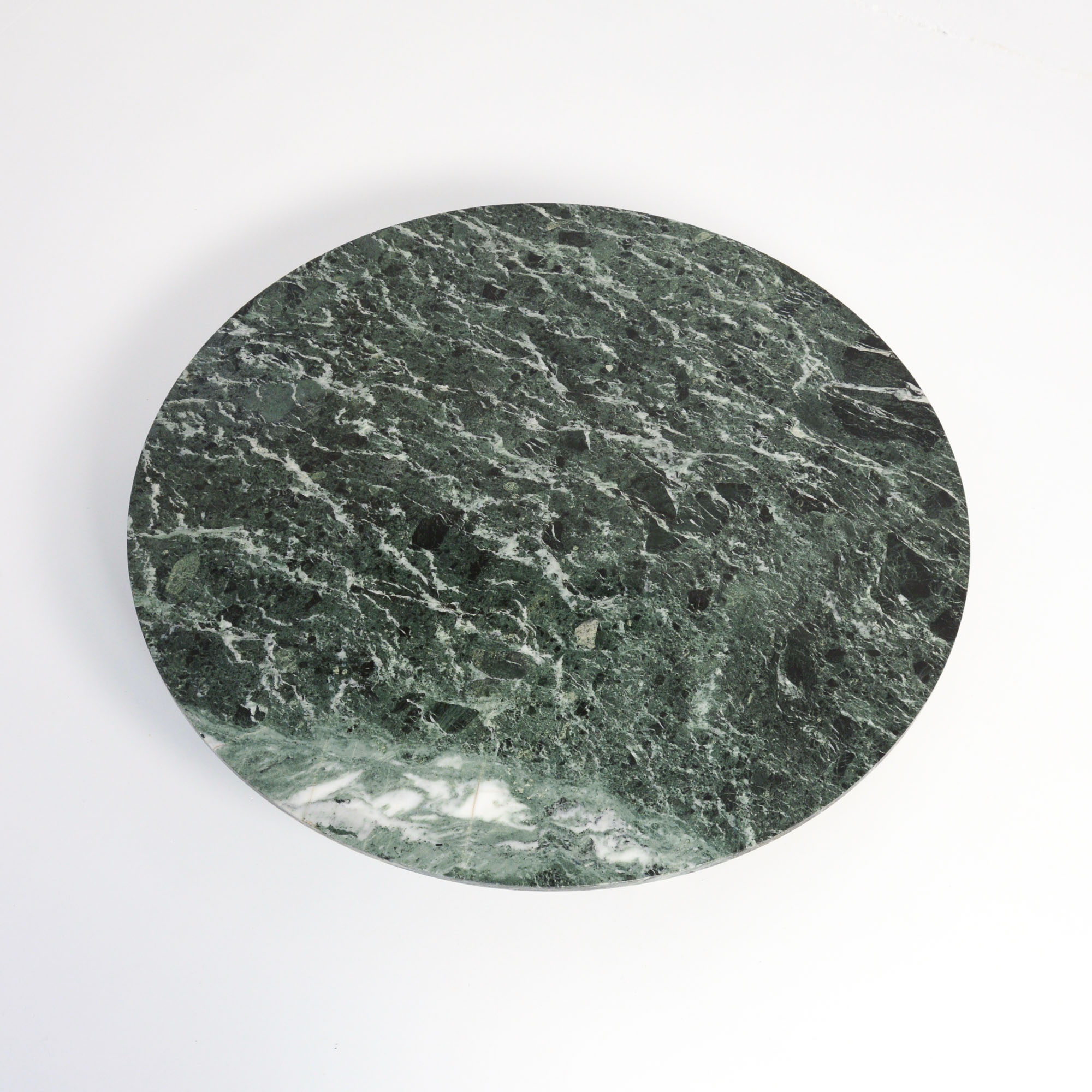 This exclusive round green marble coffee table can be dated in the 1970s.