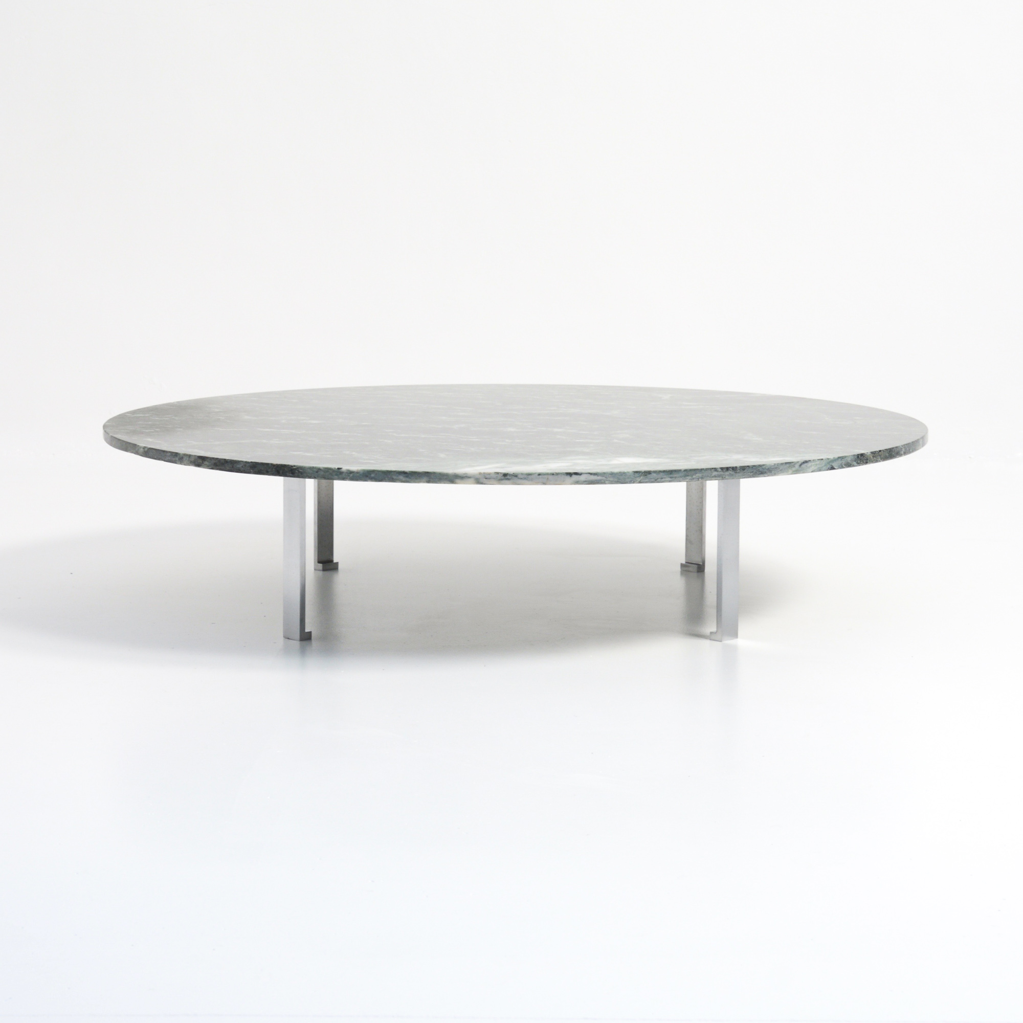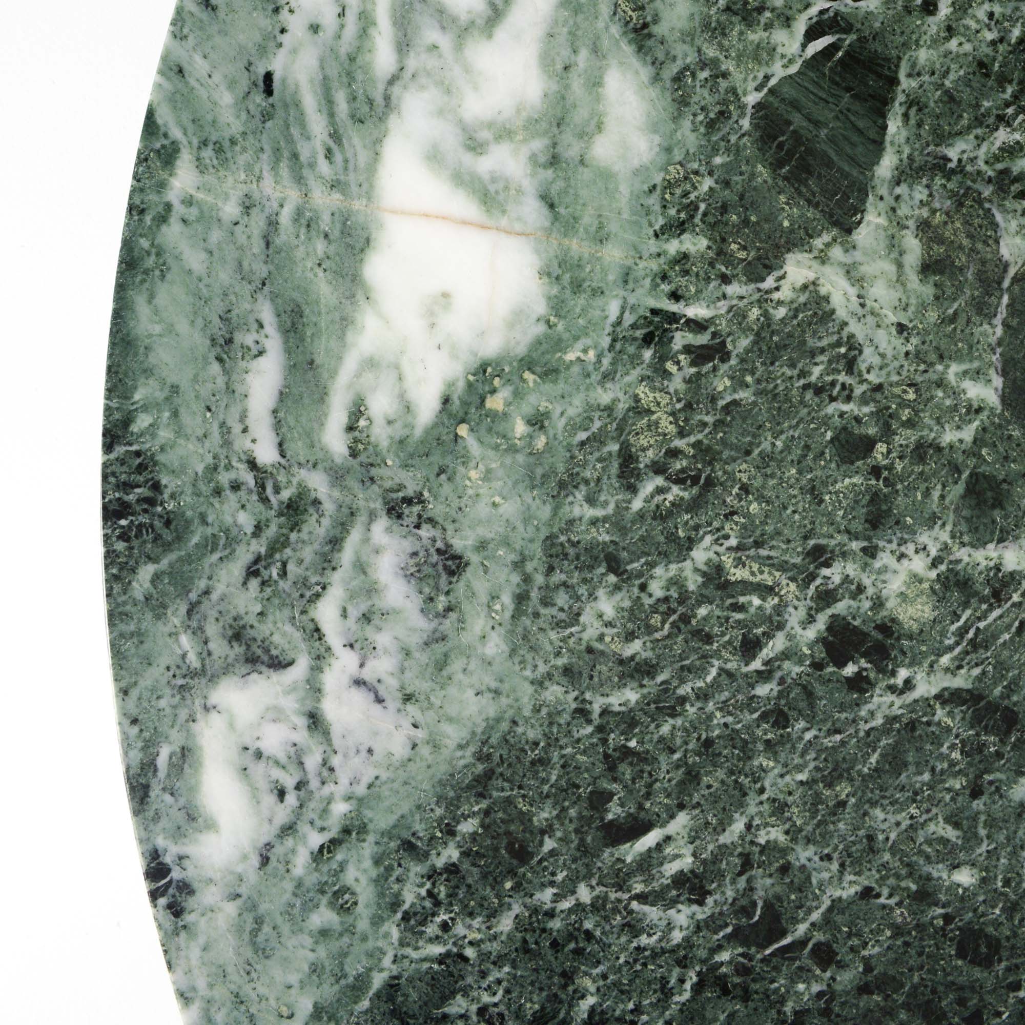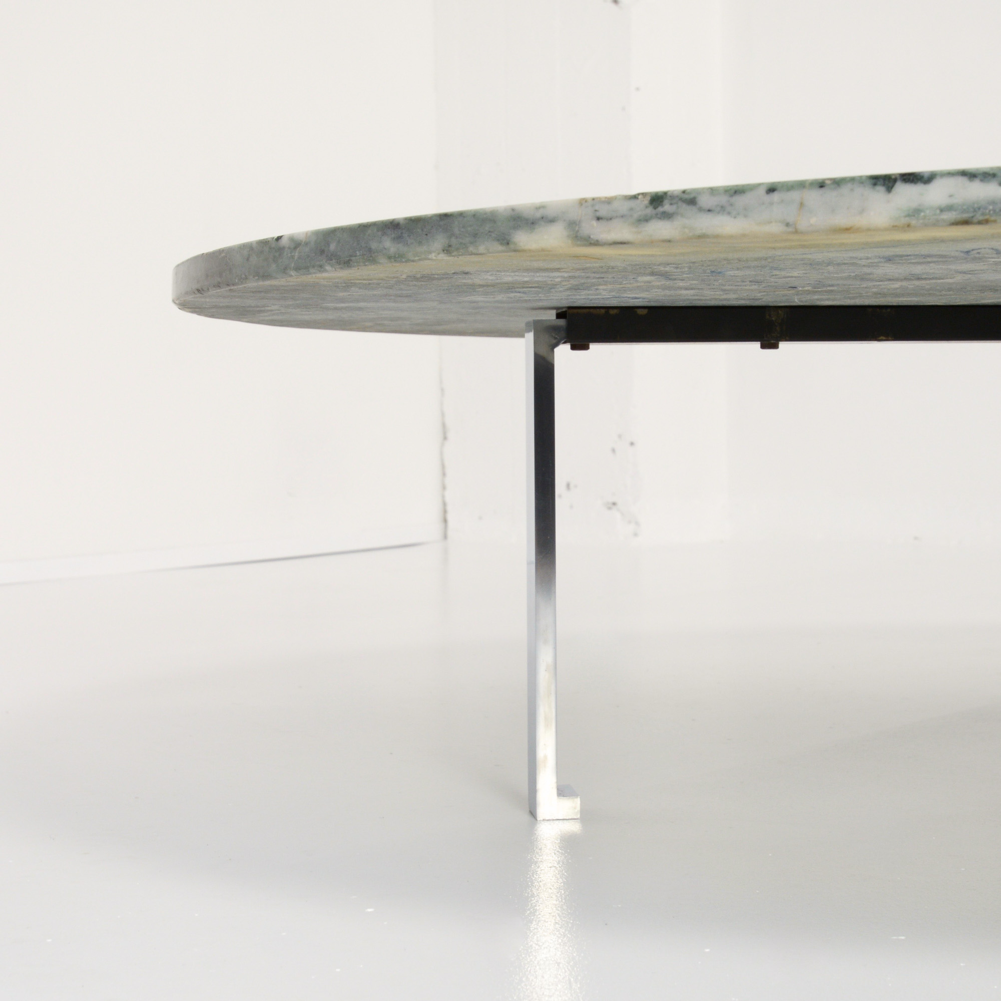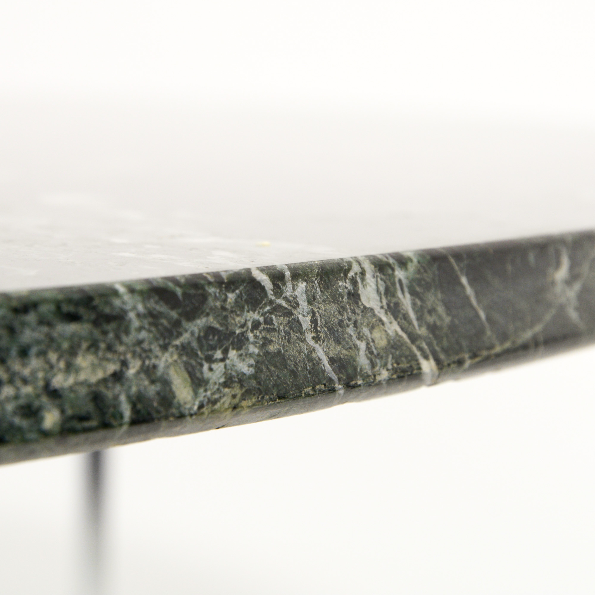 Nevertheless this minimalist coffee table is a high quality piece with a chromed metal base and nice detailed feet. The Italian green marble top has an intense green color with white veins.