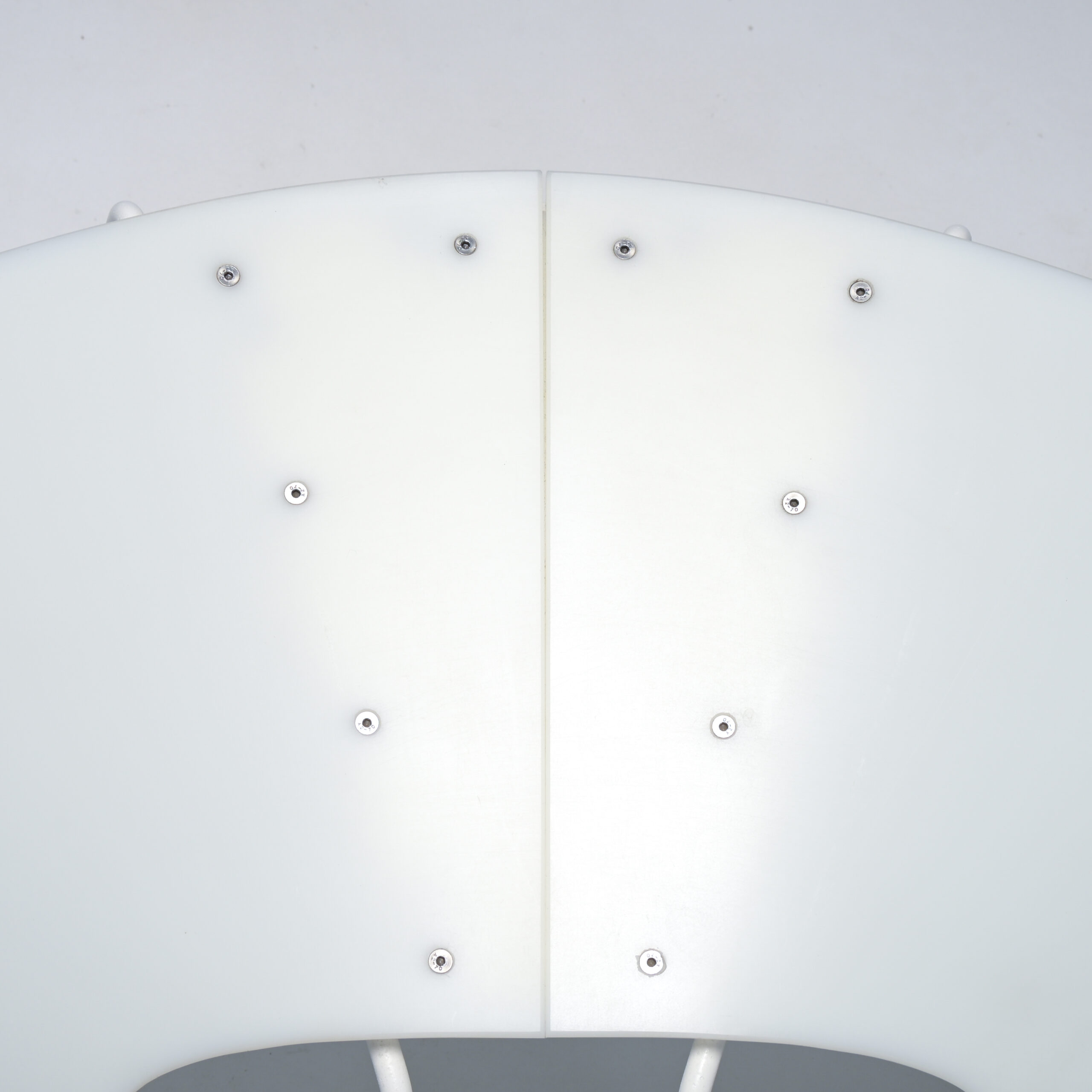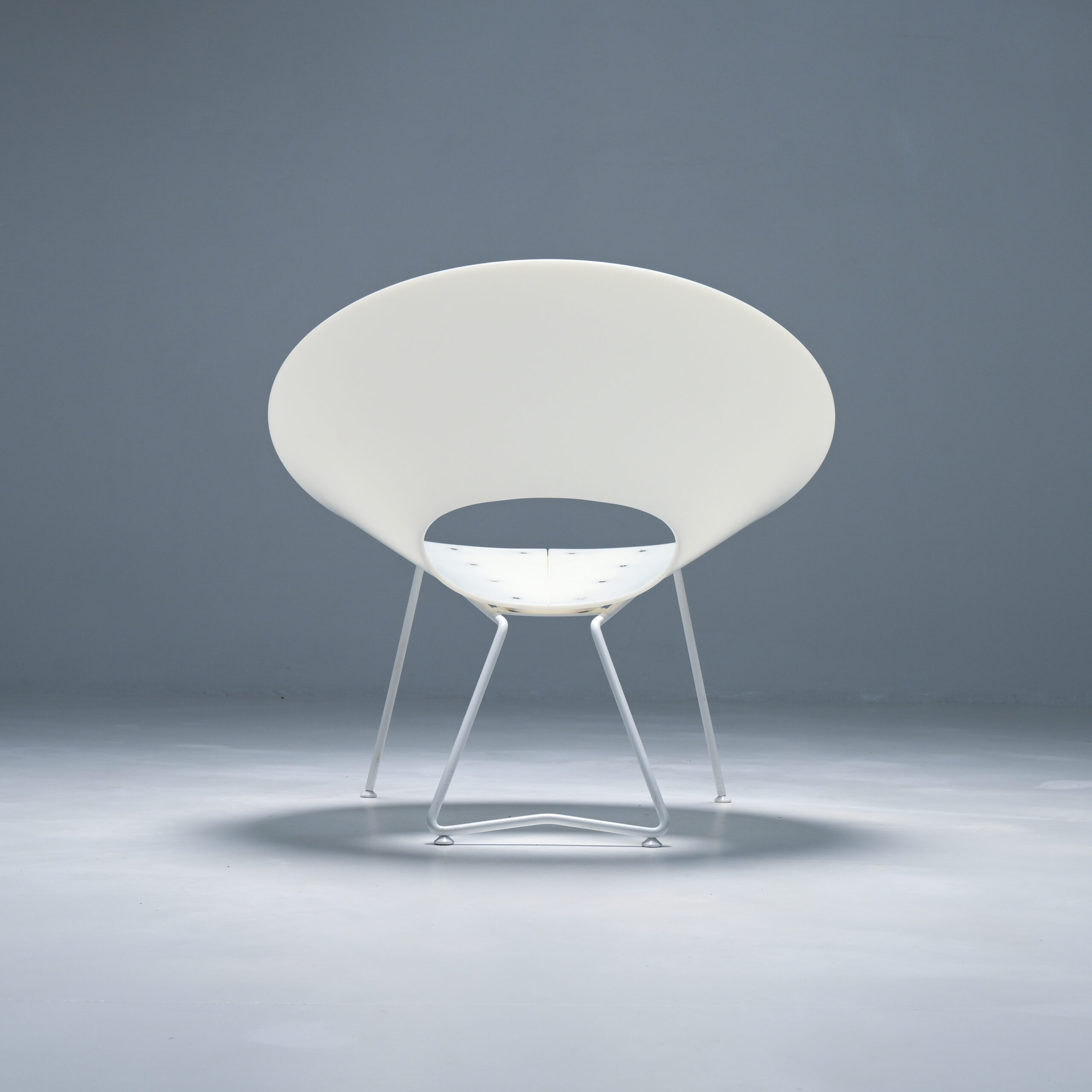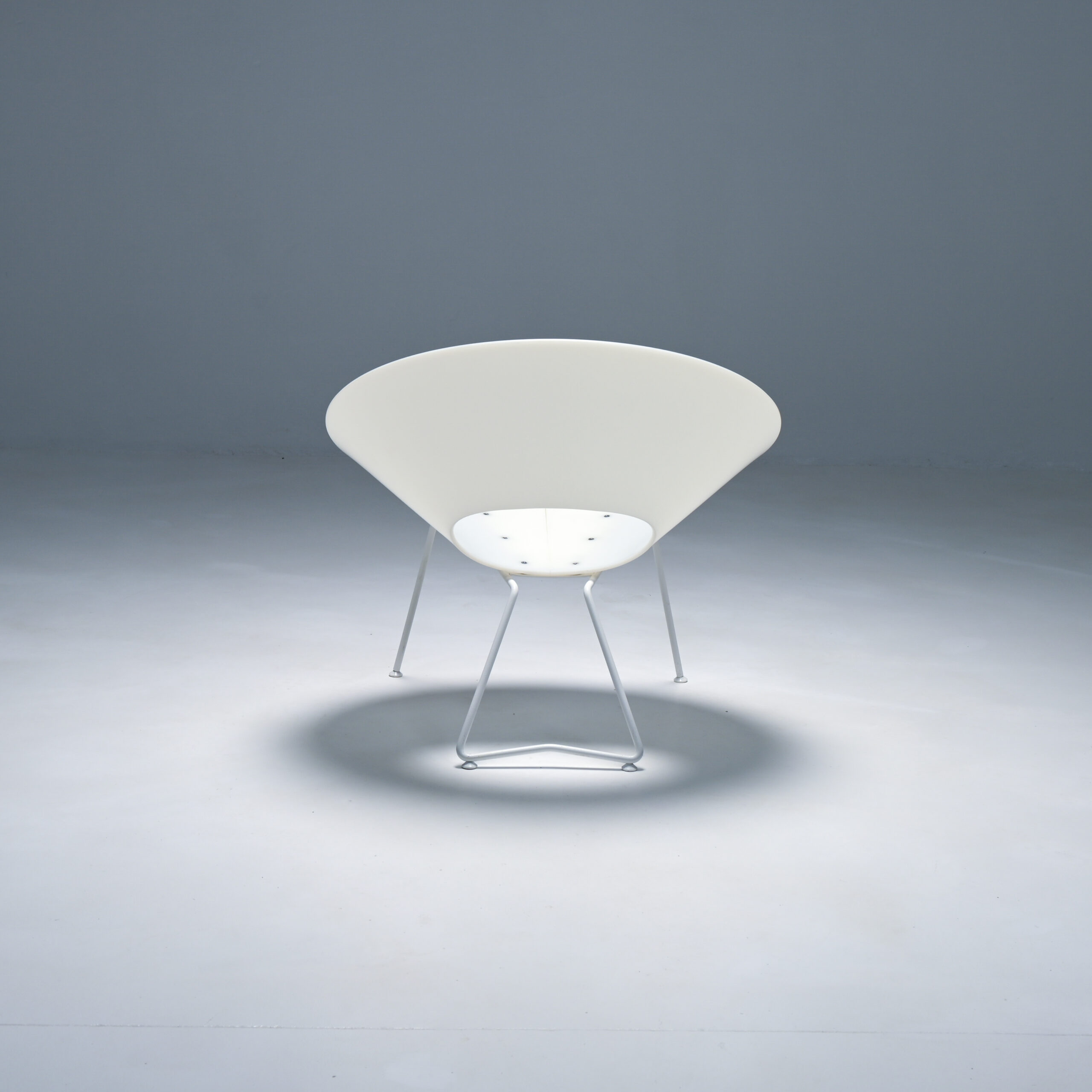 FAB from fabulous refers to the stylish design, typical for the modern times since the beginning of the 20th century. This characteristic round shell-shape inspires designers to make chairs. Thonet and Pierre Paulin made classics with this form and Max Bill created the endless movement. Fabiaan Van Severen designed his variation on this universal idea. White polyethylen in sheet form gets tightened into a shell-shape, kept in form through a minimum white lacquered iron frame. This method creates the correct elasticity for a perfect comfort. Maximum result for a minimum of material and energy (polyethylene is the least polluting synthetic, asks only a little bit of energy for production and is perfectly recyclable).