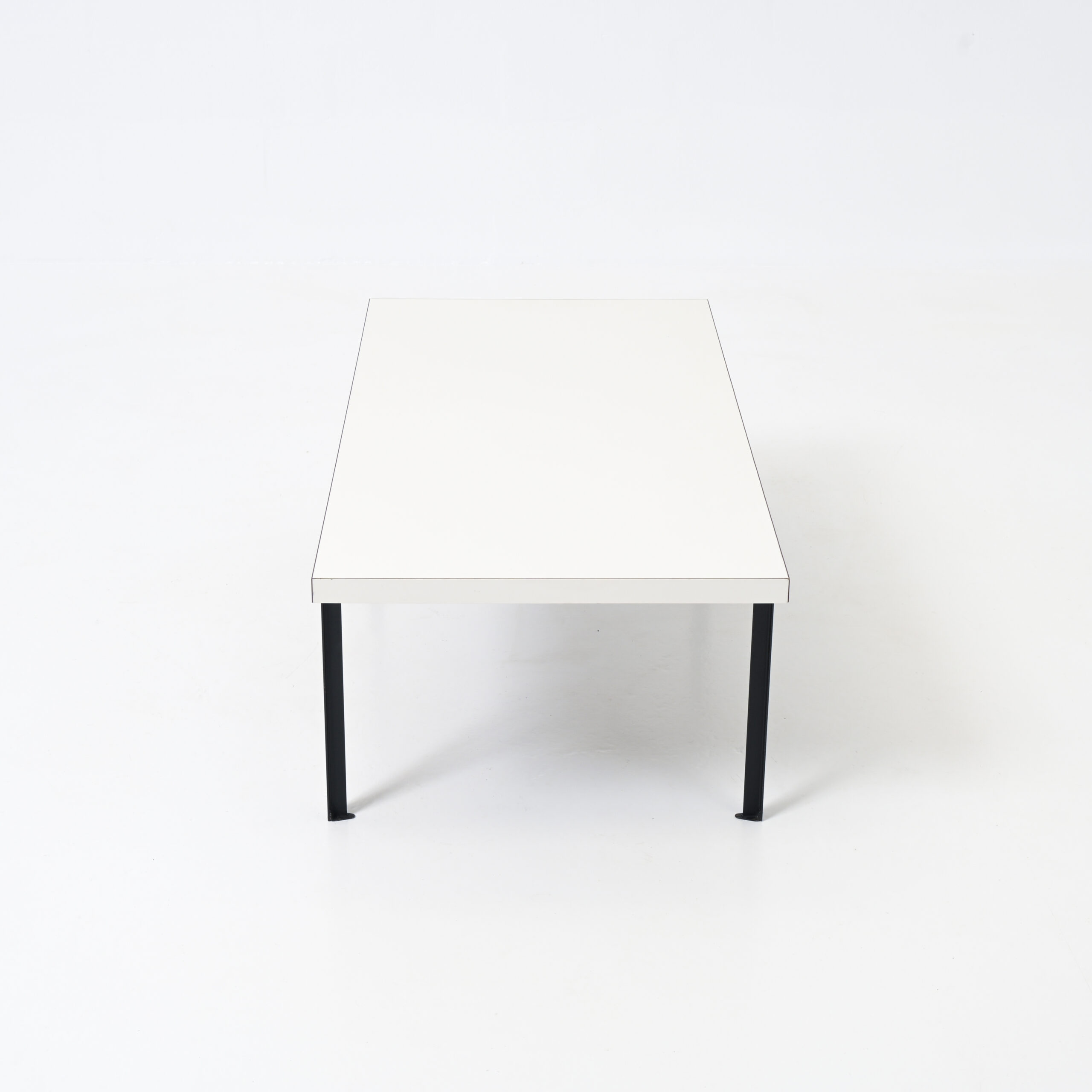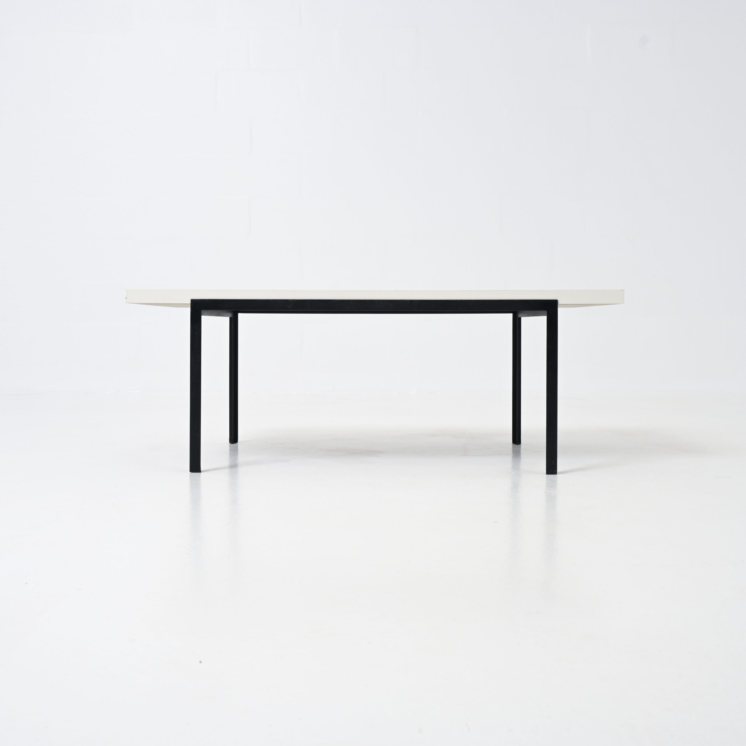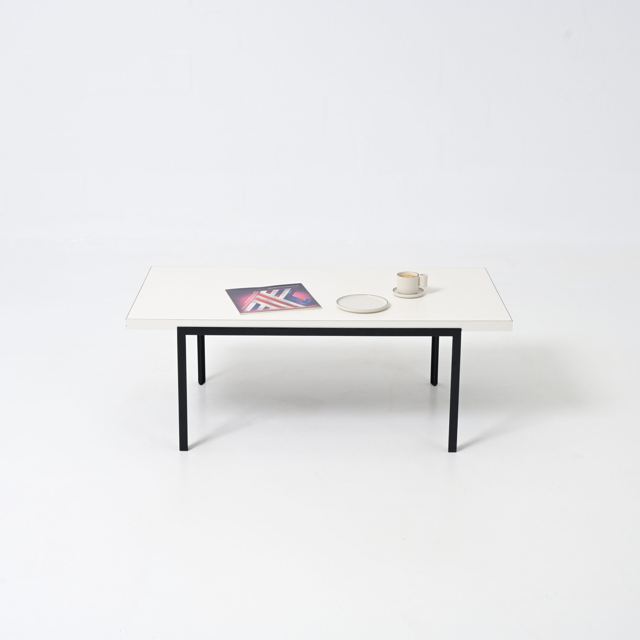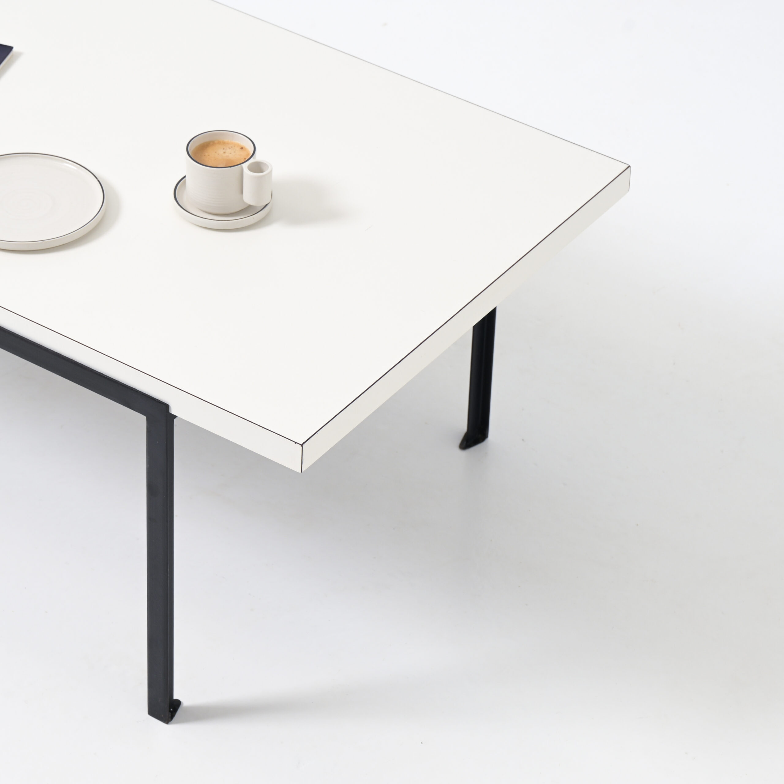 The distinctive “T-angle” metal base, a hallmark of Florence Knoll’s design philosophy, evokes an aura of minimalist elegance and understated luxury. The tabletop consists of white laminate that overhangs each end, casting a crisp and dramatic shadow which adds to the table’s striking architectural appeal.