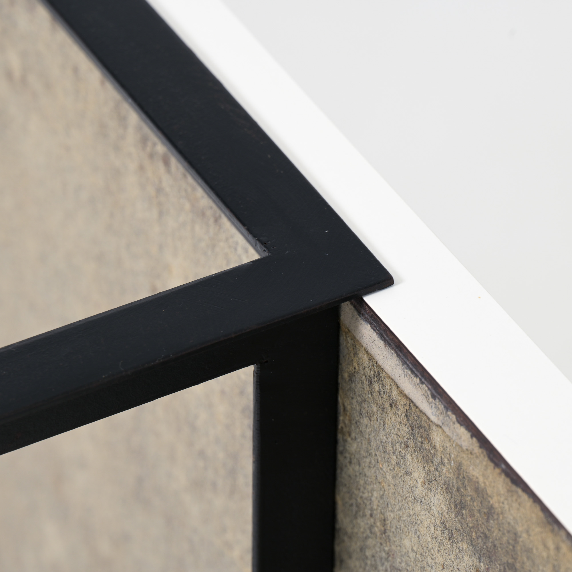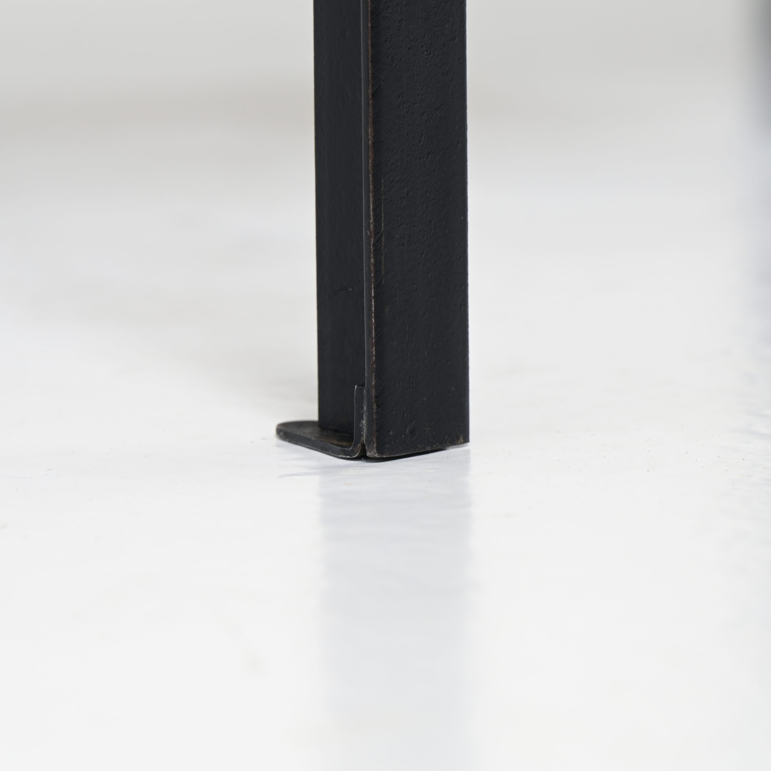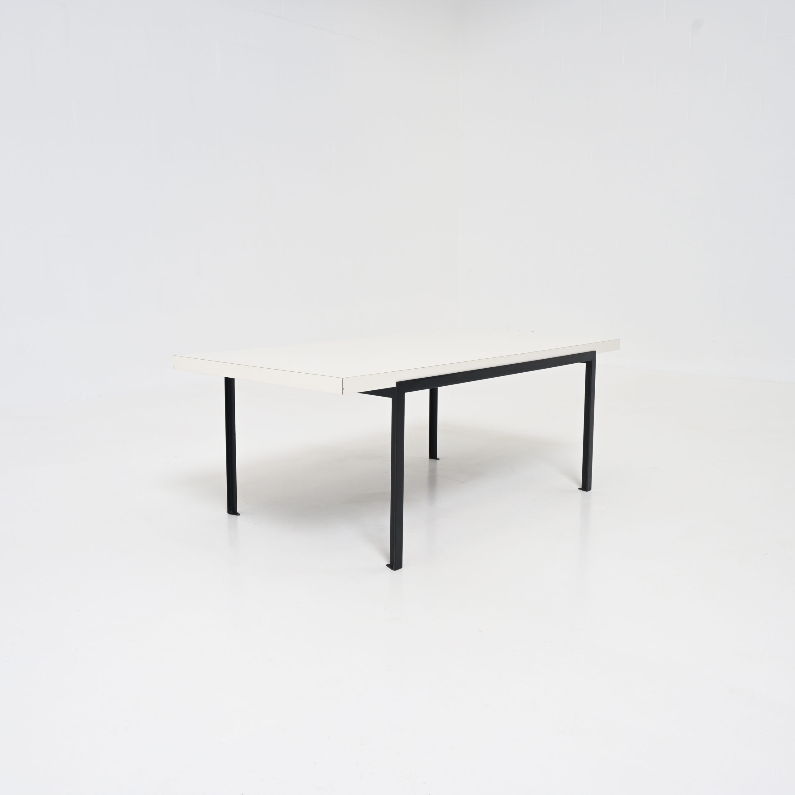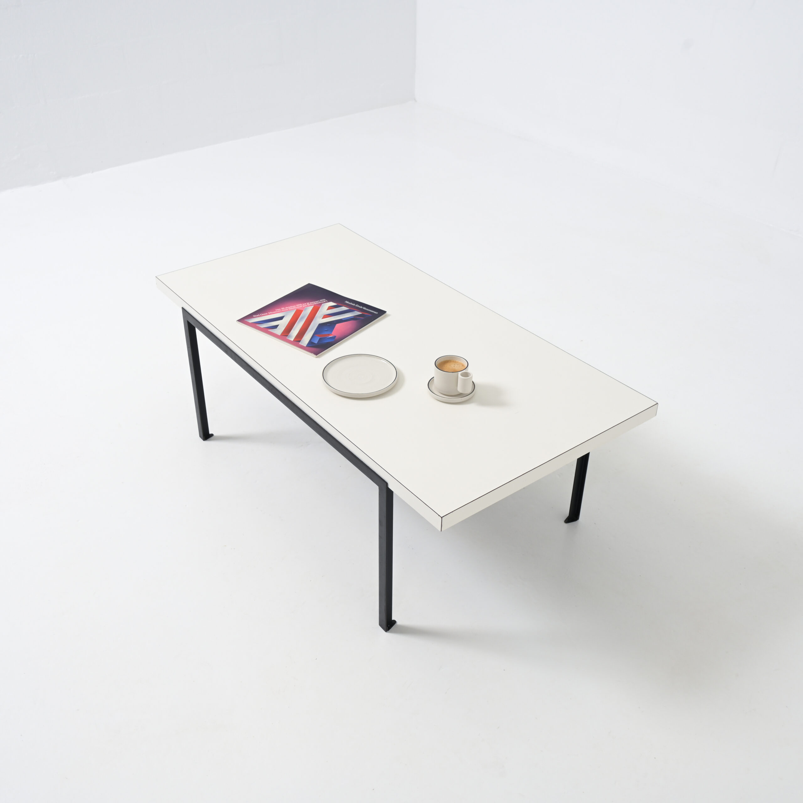 The distinctive “T-angle” metal base, a hallmark of Florence Knoll’s design philosophy, evokes an aura of minimalist elegance and understated luxury. The tabletop consists of white laminate that overhangs each end, casting a crisp and dramatic shadow which adds to the table’s striking architectural appeal.