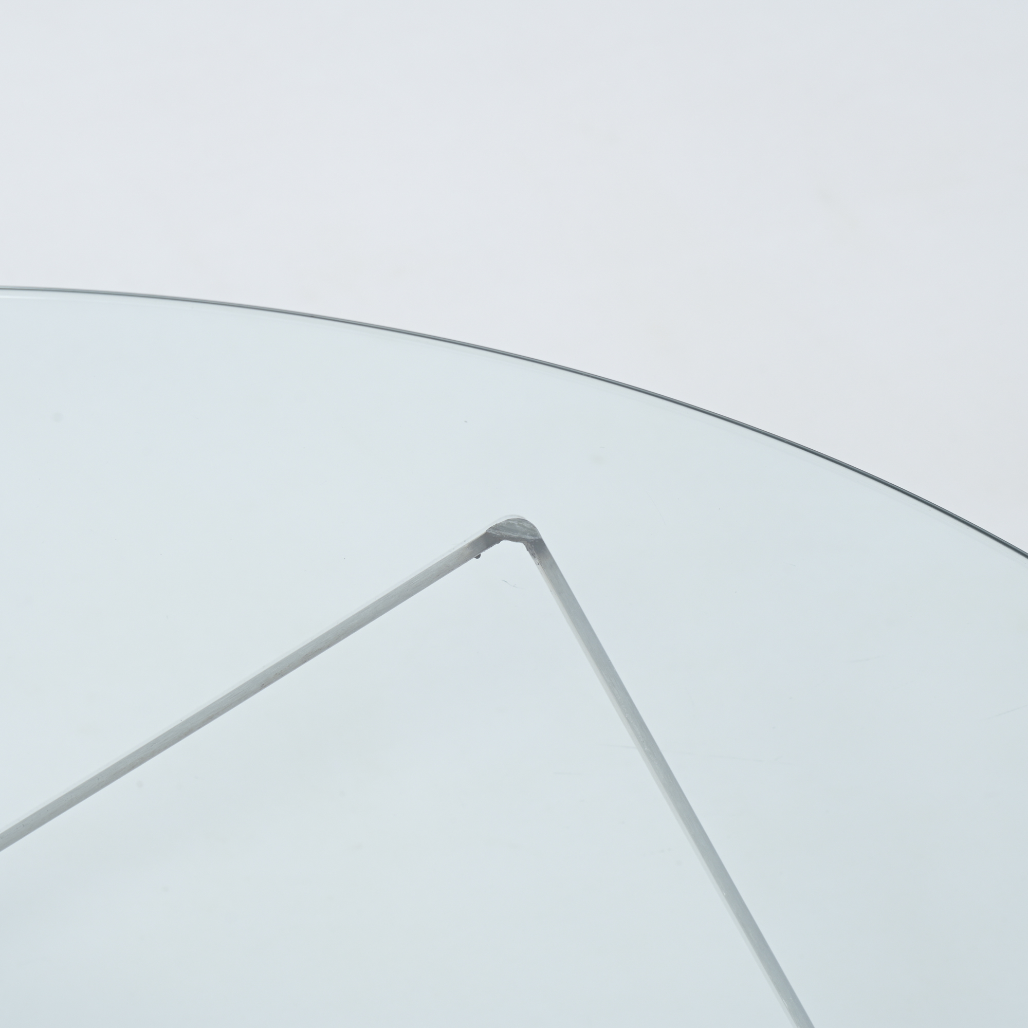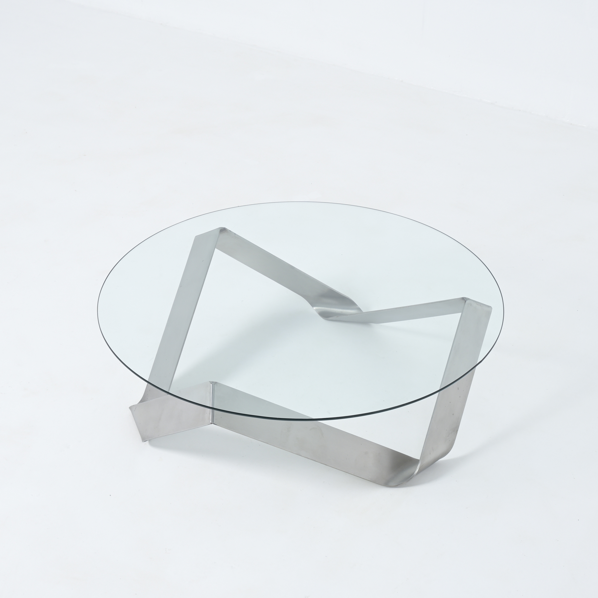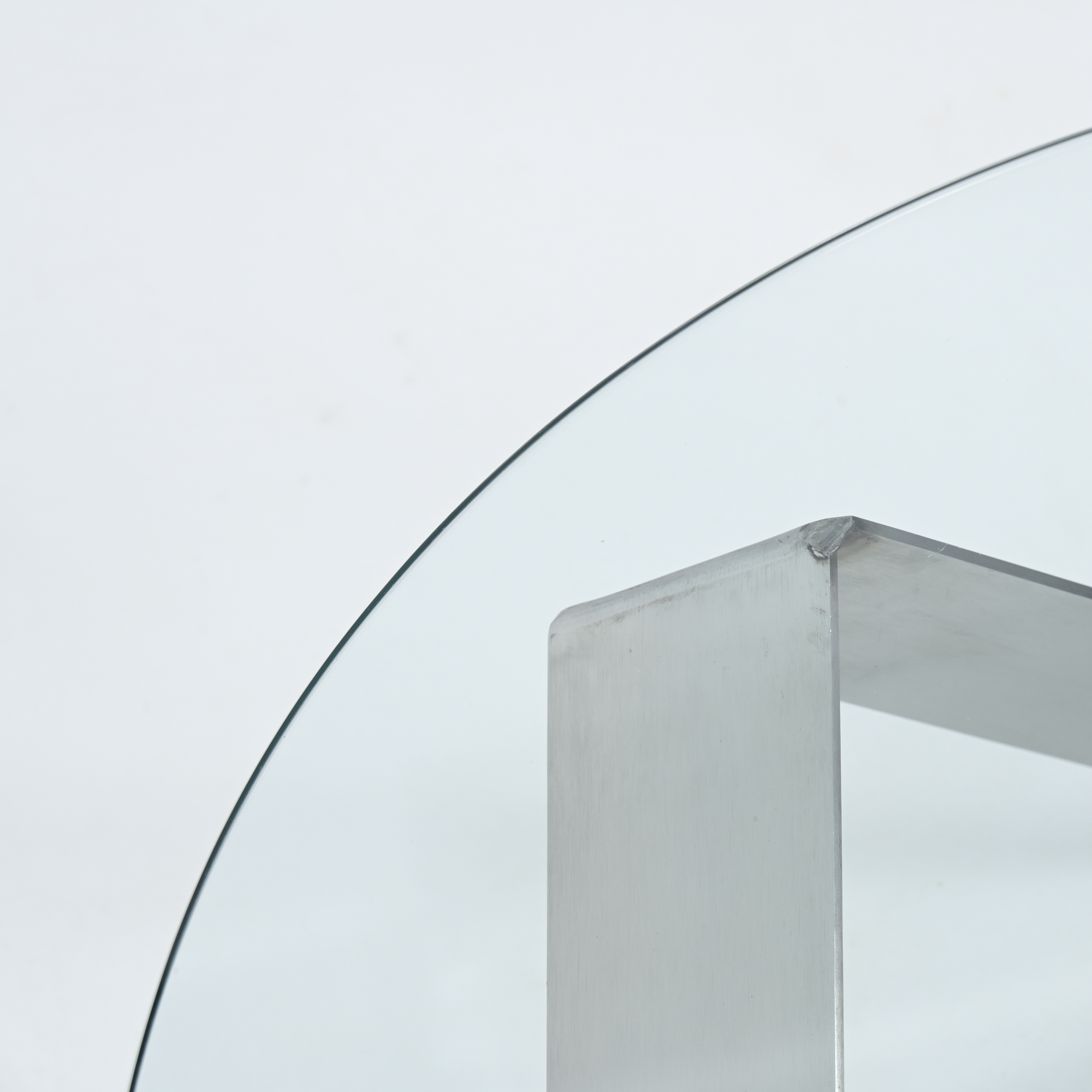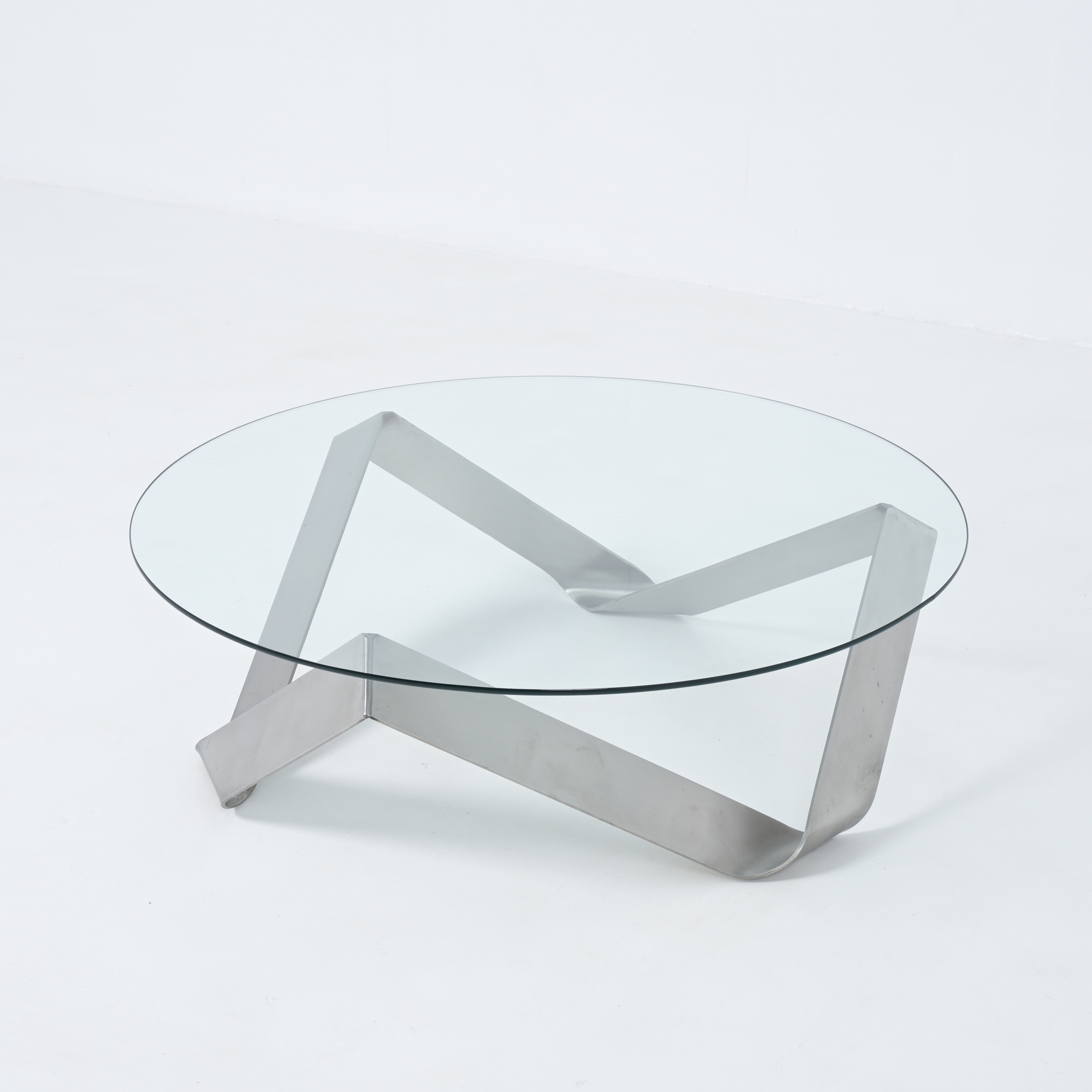 This coffee table has a glass tabletop which is supported by a coherent geometric frame.
